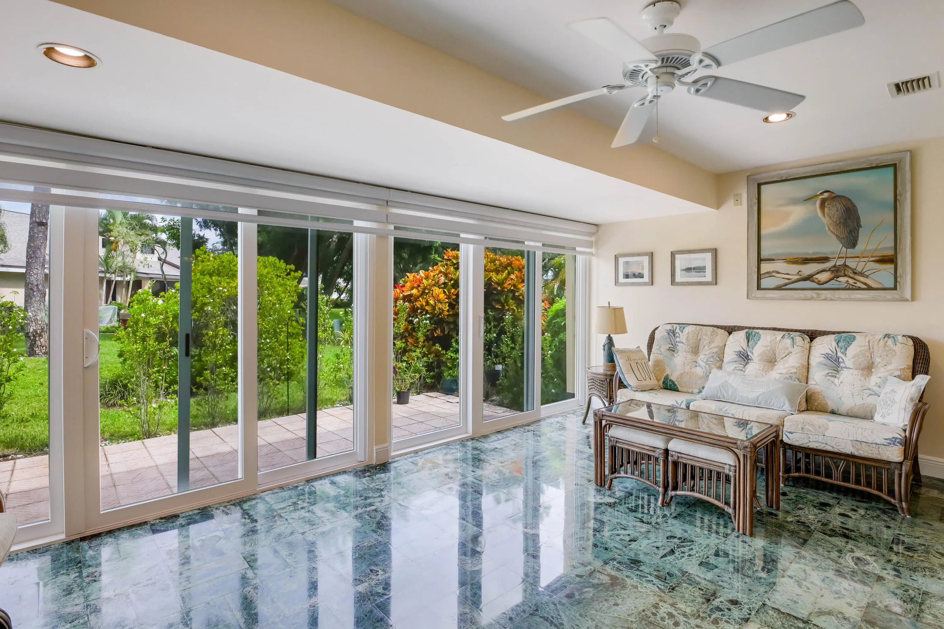 Your search ends here. This exquisite 3-bedroom, 2.5-bath villa perfectly combines comfort, style, and sophistication. The light-filled open-concept design creates an inviting atmosphere, enhanced by impact glass windows, a 2020 roof, and a collection of tasteful upgrades throughout. Enjoy the serenity of private garden views from the enclosed Florida Room, a peaceful retreat designed for quiet moments or effortless entertaining. The community pool nearby offers a refined, resort-like ambiance. Located in a 55+ community with optional membership opportunities, this residence is ideally situated close to shopping, dining, and everyday conveniences. A truly exceptional villa, the perfect place to call home. (The taupe sofa and matching chair will remain with the property)