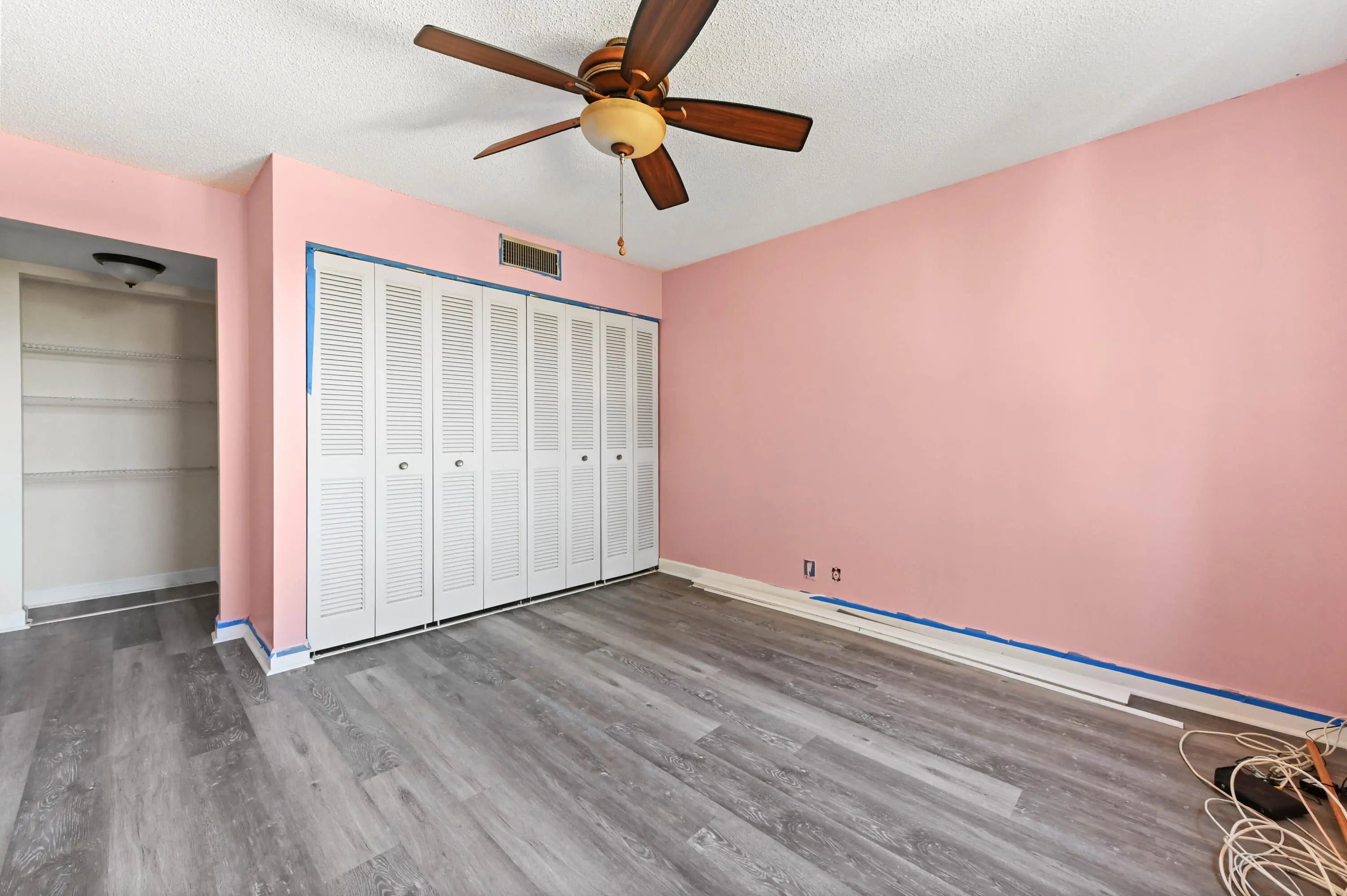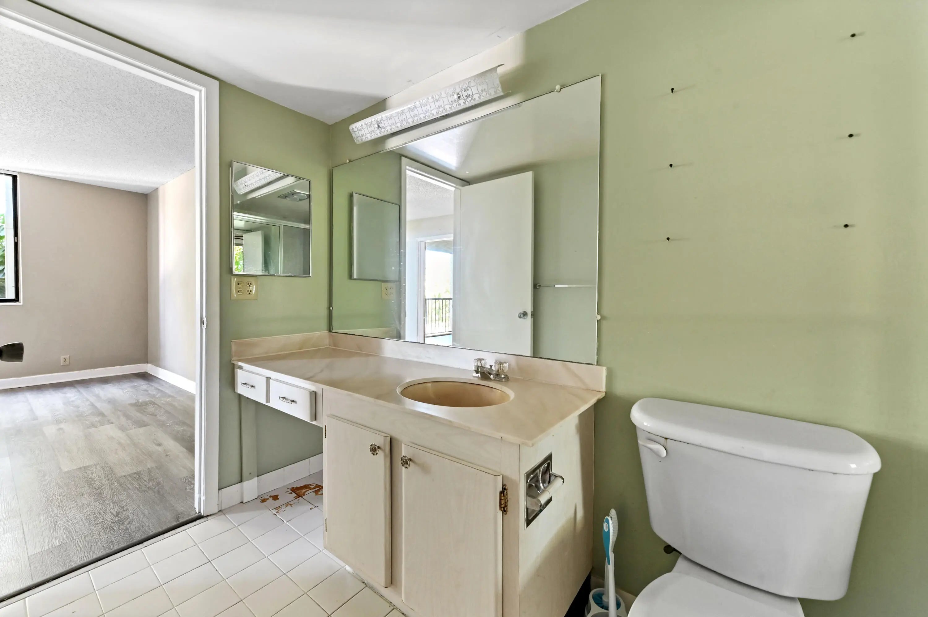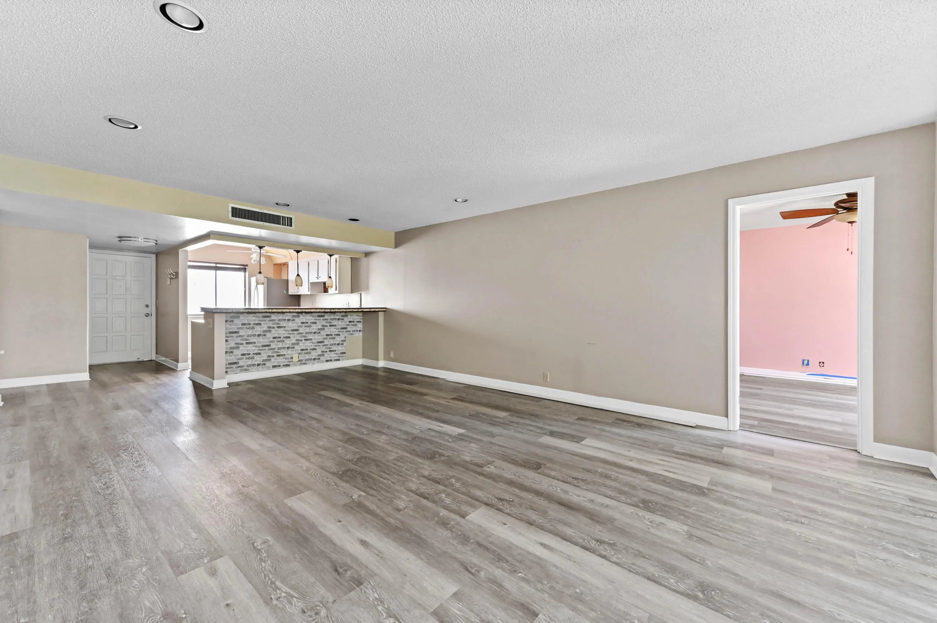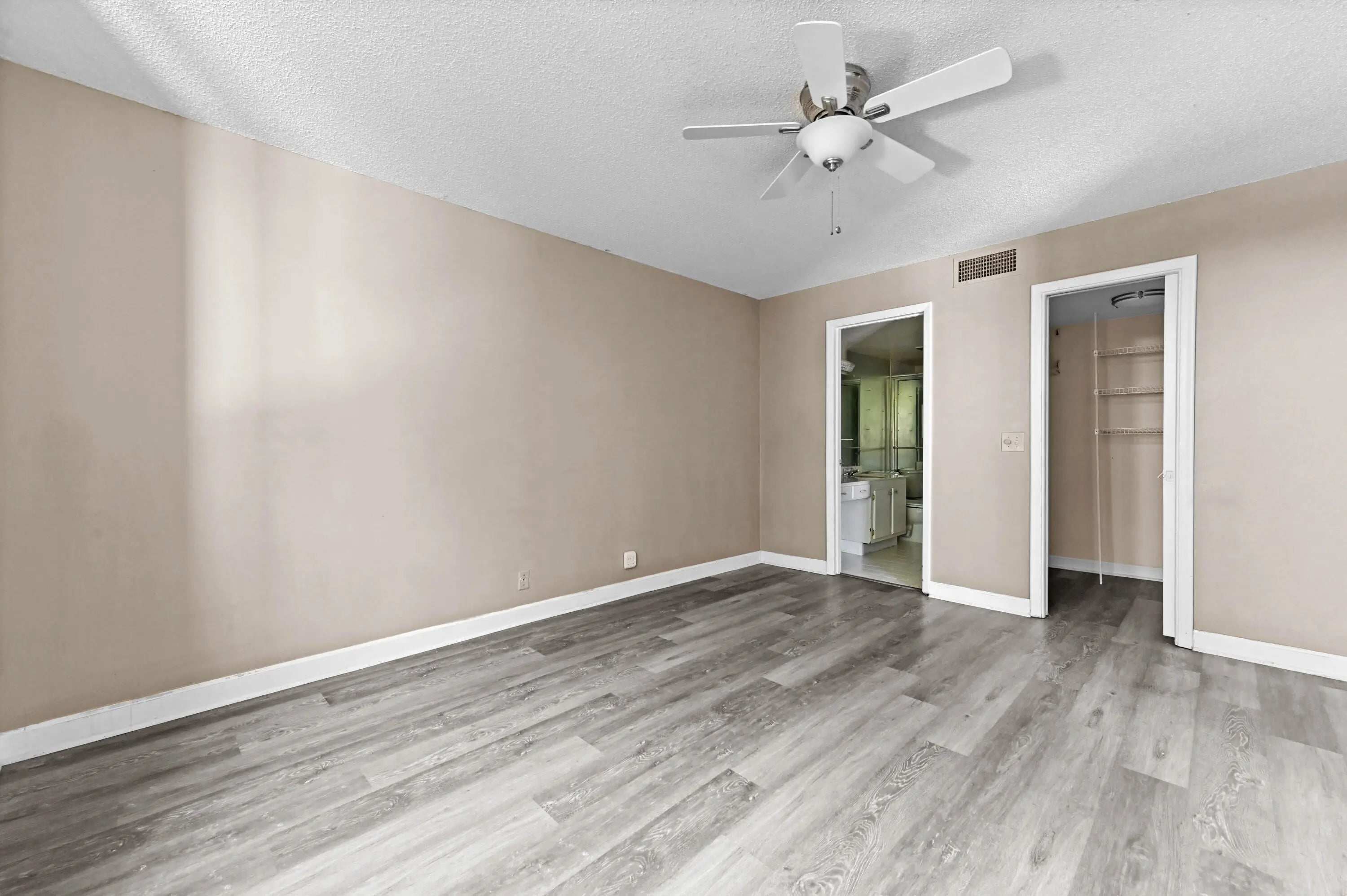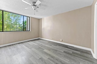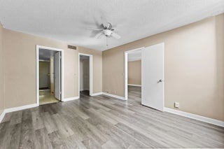 This beautiful condo presents an incredible opportunity for a buyer seeking a stylish, move-in-ready space with significant potential for personalization. The entire residence is modernized by a wide-plank gray wood-look laminate flooring that flows seamlessly throughout, giving the condo a chic, cohesive feel. The bedrooms are spacious and bright, offering a clean canvas for décor. The master bedroom provides direct access to the main bathroom, which offers a large vanity and a glass-enclosed shower/tub combo. The secondary bathroom, painted a soft sage green, features a long vanity with plenty of counter space and an adjacent walk-in closet with wire shelving. With its flooring, bright spaces, and highly functional layout, this condo is a fantastic find, blending modern updates with a prime location and a ready-to-customize aesthetic. The Fountains is a non-mandatory country club w/ both social and tennis membership available