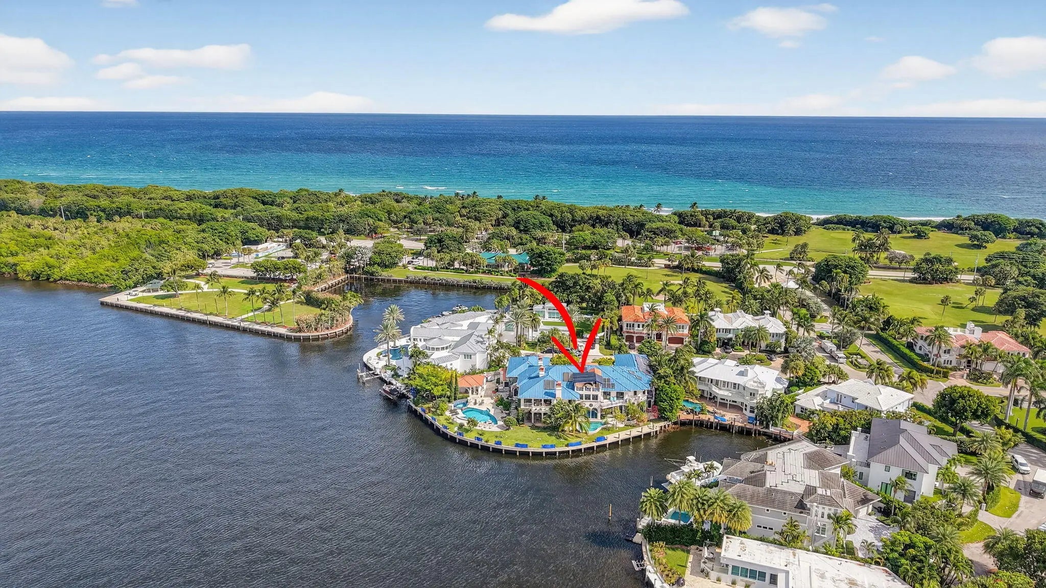 PRIME LOCATION! Exceptional crown jewel, one of a kind waterfront estate nestled on a Barrier Island, quiet Cul-De-Sac surrounded by other trophy properties. X-tra Large, 256 FT., POINT LOT with unobstructed panoramic views of the intracoastal for the most discerning buyer. Timeless architecture and immersive design with artistic vision encompasses 12 bedrooms, 10+bathrooms, 6 fireplaces, 3 resort style private, heated pools, summer kitchen and bar, plus a detached guest suite, all surrounded by lush vegetation, adds to the charm and value of this home, capturing the energy, making it an absolute standout. Spectacular French inspired kitchen, walk-in refrigerator and freezer along with an exquisite dining area, allowing you to entertain at ease... A large European influenced master suite with sauna, jacuzzi, a crystal bed and radiant floors, includes spacious balconies with unparalleled, picturesque views. A truly unique and fun property. DEEP WATER frontage, unlimited dockage in a No Wake Zone, makes this is a BOATER'S DREAM! Only a short walk to play Golf and the Beaches...An INVESTMENT opportunity, this property offers an extraordinary world-class lifestyle! ........*Land Value alone is worth it! Commercial grade, whole house electric generator with direct access to street natural gas, is a BONUS..........**Professional Design services available with showings.