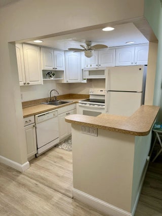 Attractive 1 BED condo, 1st floor, Over 55 gated community. Enjoy views of the intracoastal from your. patio. Updated unit includes NEW flooring and baseboard 2024, A/C under 2 years, NEW water heater. NEW hurricane sliding door, updated electric panel 2022, appliances replaced, new fans, NEW bathroom vanity, mirror, lights, shower head and tub reglazed. Community just updated a new club house with gym, library, party room, auditorium, pickle ball courts, bocce ball. Has pool & 3 laundromats. Beautiful walkway along intracoastal, covered gazebo with grills, putting green, WALK to beach, restaurants, grocery, boat docks. All state and local inspections met. Sold furnished or unfurnished. Lowest HOA fee in community.