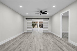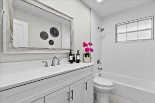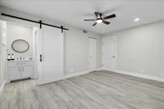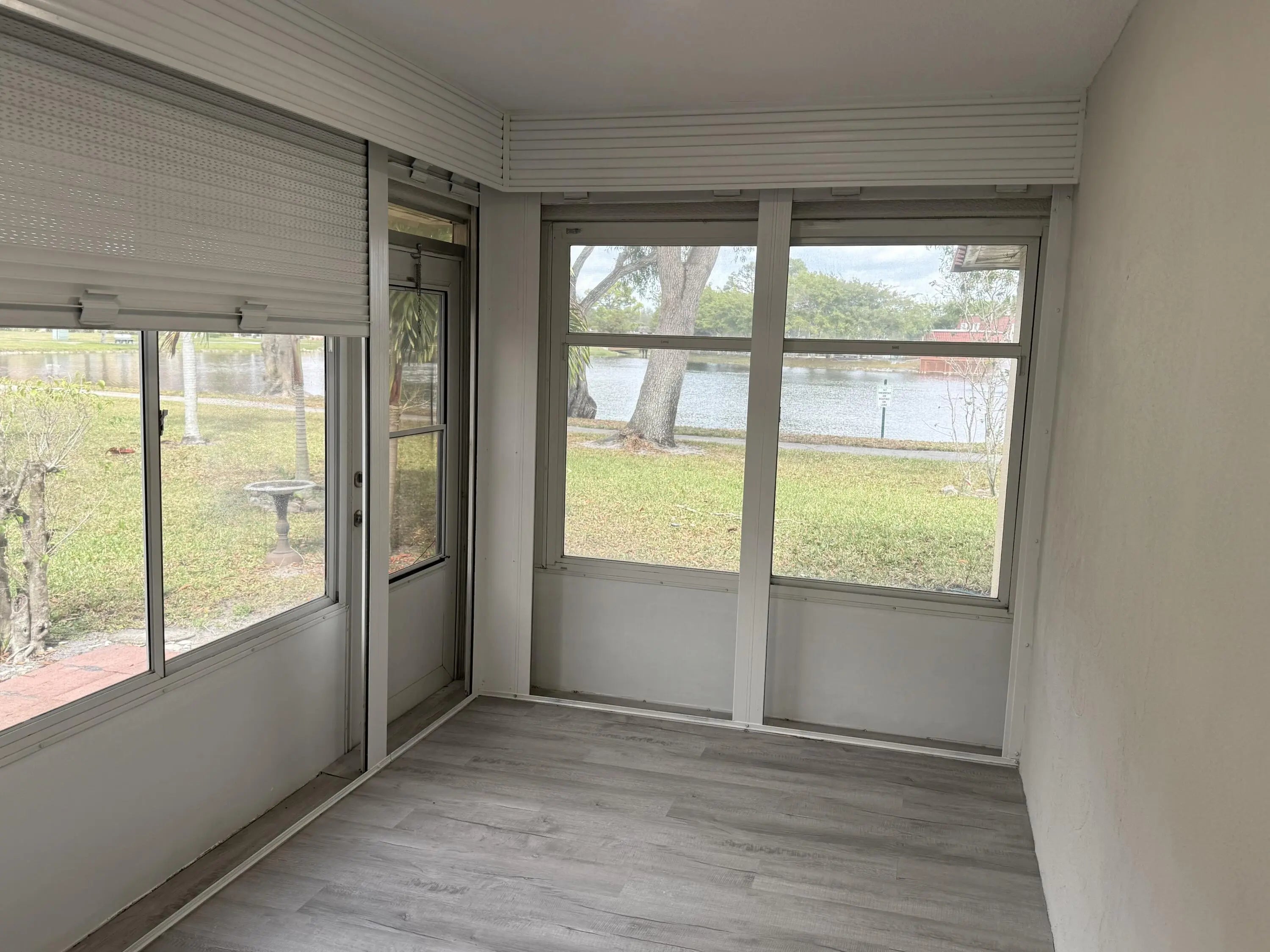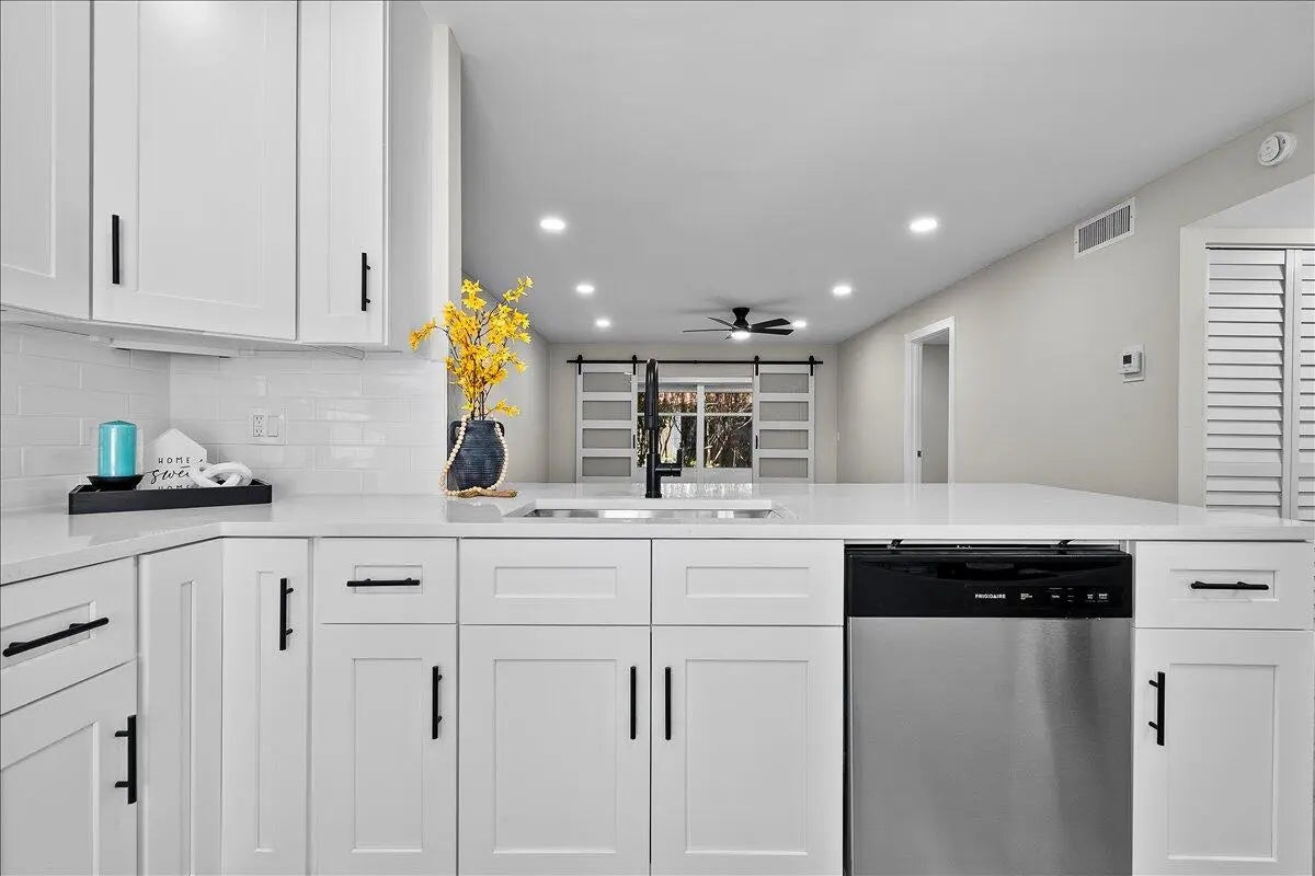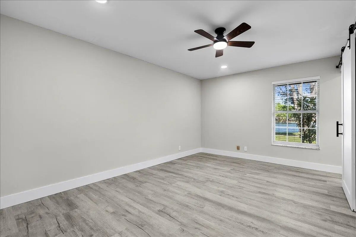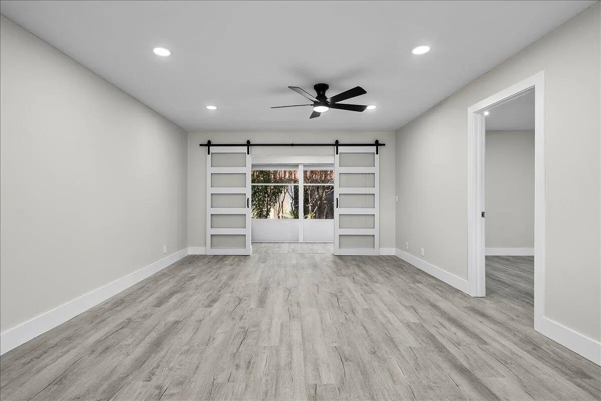 Stunning Fully Renovated 2-Bedroom, 2-Bath Villa in Covered Bridge - Pet-Friendly & Move-In Ready. Welcome to your ideal home in the heart of Covered Bridge, a highly sought-after 55+ community in Lake Worth! This beautifully updated 2-bedroom, 2-bathroom corner villa with lake views offers modern elegance and comfort, ensuring a hassle-free living experience. Upon entry, you'll be greeted by an open-concept design featuring brand-new luxury vinyl flooring, stylish barn doors, and designer finishes throughout. The custom gourmet kitchen is a chef's dream, showcasing new quartz countertops, high-end shaker cabinetry, and premium stainless steel appliances - perfect for both casual dining and entertaining. Both bedrooms are generously sized and filled with natural light, each offering ample closet space.The bathrooms have been transformed into luxurious, spa-like retreats with new quartz vanities and contemporary fixtures. Thoughtful details include energy-efficient LED recessed lighting, ensuring both style and sustainability, new interior doors, updated electrical panel, and fresh new paint through-out. For added peace of mind, the villa features a brand-new roof (2023) and has no current or upcoming assessments. The expansive enclosed living area, with its charming barn doors, provides flexible space for a home office, sunroom, or a comfortable guest retreat. Located in a prime corner position, this villa enjoys tranquil water views and serene vistas of lush greenery. The pet-friendly community offers an active lifestyle, complete with walking and biking trails, a clubhouse, heated pools, and more. Your condo fees cover Wi-Fi, cable, water, exterior insurance, and full access to all amenities, allowing you to focus on enjoying life to the fullest. This meticulously upgraded villa is truly move-in ready and waiting for you to call it home. Photos may include virtual staging to showcase design possibilities.Best of all, the community is NOT subject to Florida Statute 553.899, meaning no milestone inspections are required. Don't miss out on this exceptional opportunity to own a piece of paradise in Covered Bridge - schedule your private showing today!