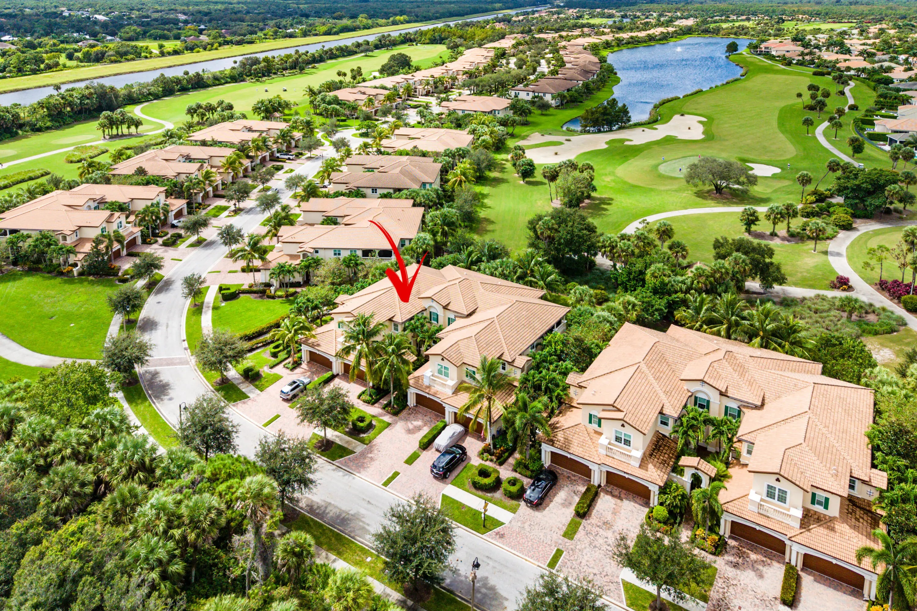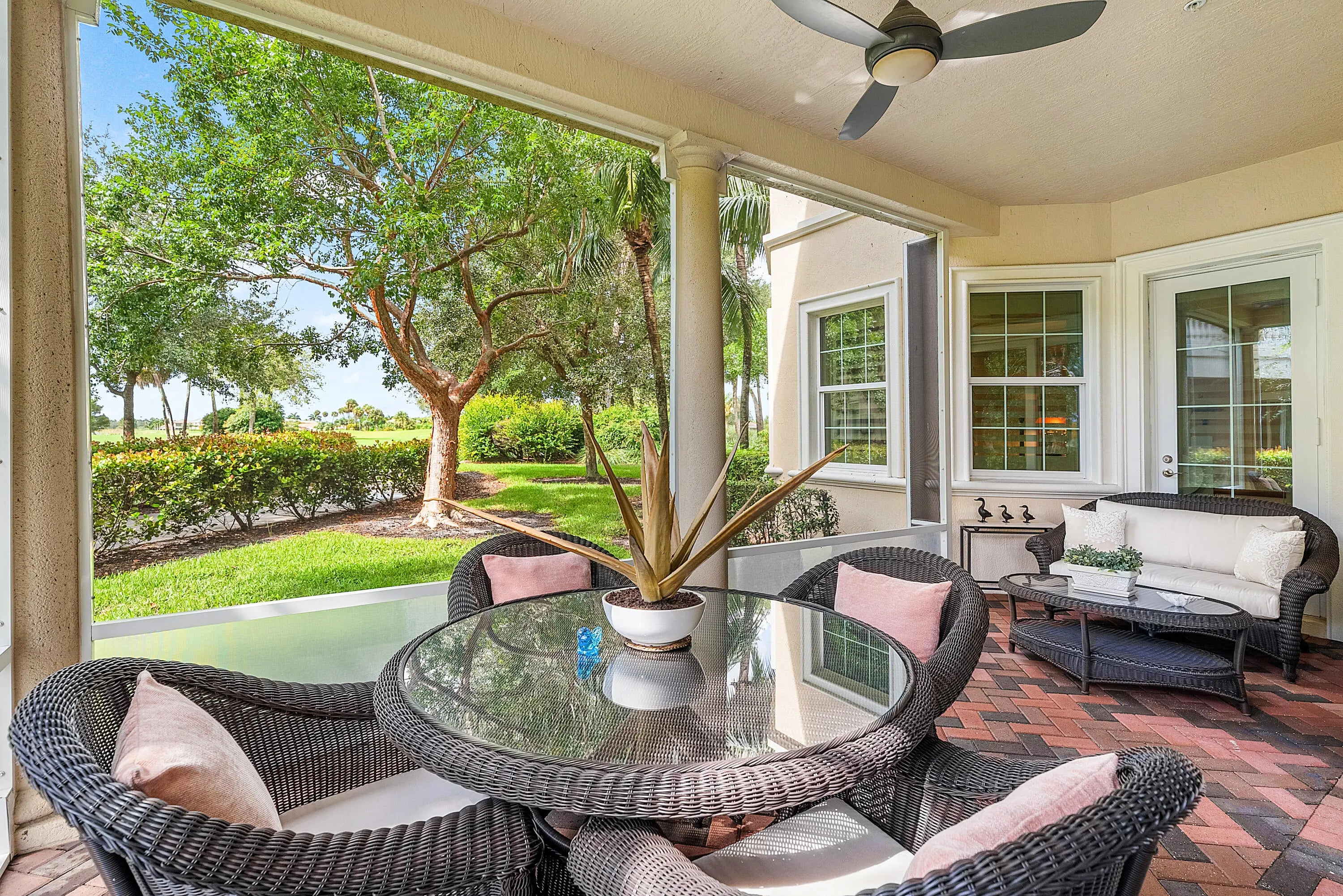 Resort living at its finest in this stunning ground level home, featuring 2 bedrooms/2 bathrooms/spacious den/private 2 car garage! Enjoy stunning sunset views overlooking the fairways of Jupiter Country Club, on the screened lanai! The open concept kitchen is a chefs dream with spacious Silestone countertops, and a built-in desk workstation. Newer engineered wood floors through-out, floated over ceramic plank tile flooring, choose which you prefer! The primary suite offers a peaceful retreat, featuring a spacious bedroom and a luxurious spa-inspired bathroom with premium finishes. Beautiful plantation shutters on all windows except the sliding doors. Jupiter Country Club is an exclusive guard gated golf, tennis and pickleball community, with restaurants, fitness and spa facitlities. As a resident of Jupiter Country Club you will enjoy access to world-class amenities, including golf, two pools, a state-of-the-art fitness center, fitness classes, and a luxurious spa. Indulge in delicious meals and drinks at the full-service restaurant and bar, all within the comfort of your own community. Social membership is immediately available, or the option to join the waitlist for other memberships. Minutes to the best beaches, airport, Gardens Mall, and fine dining.