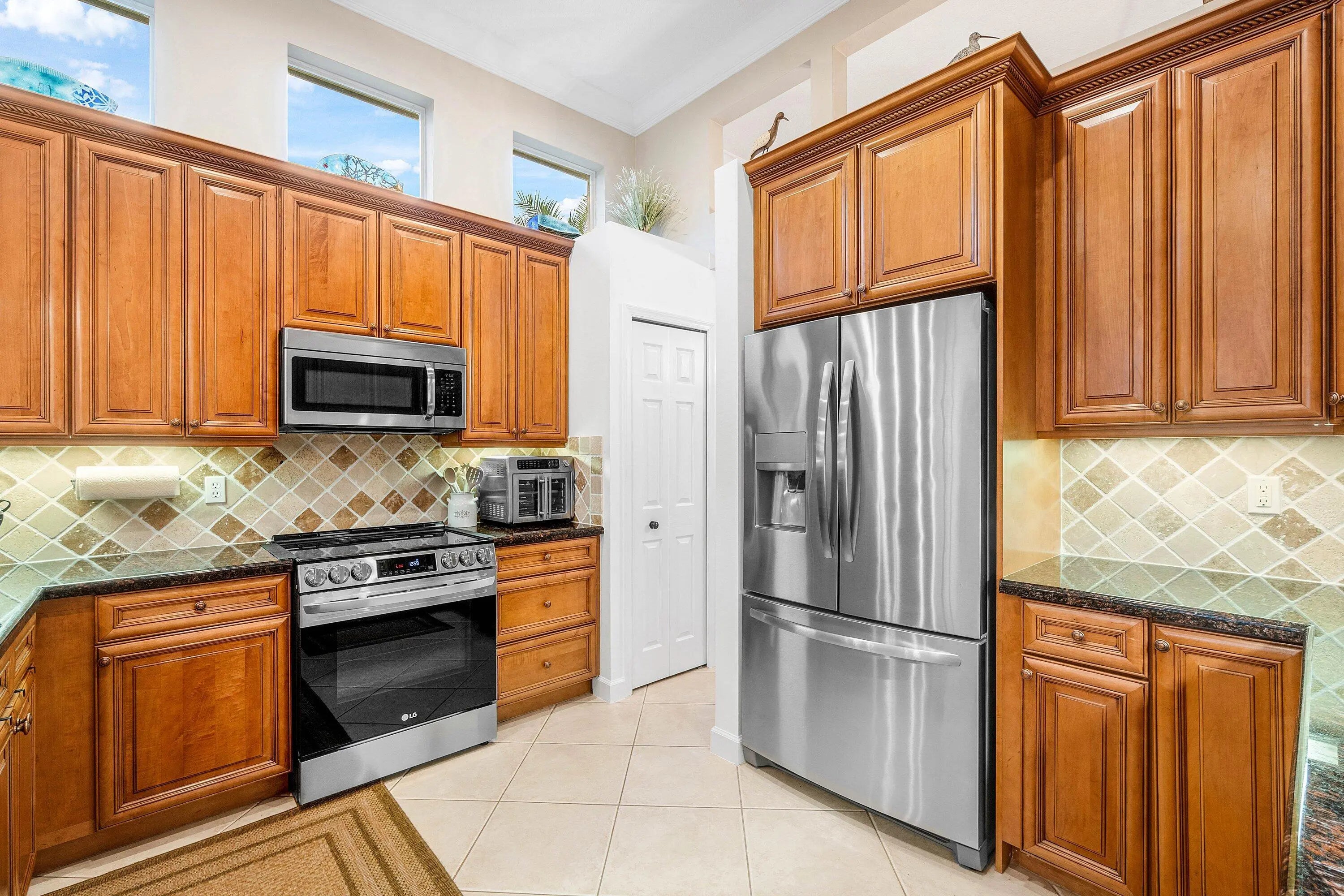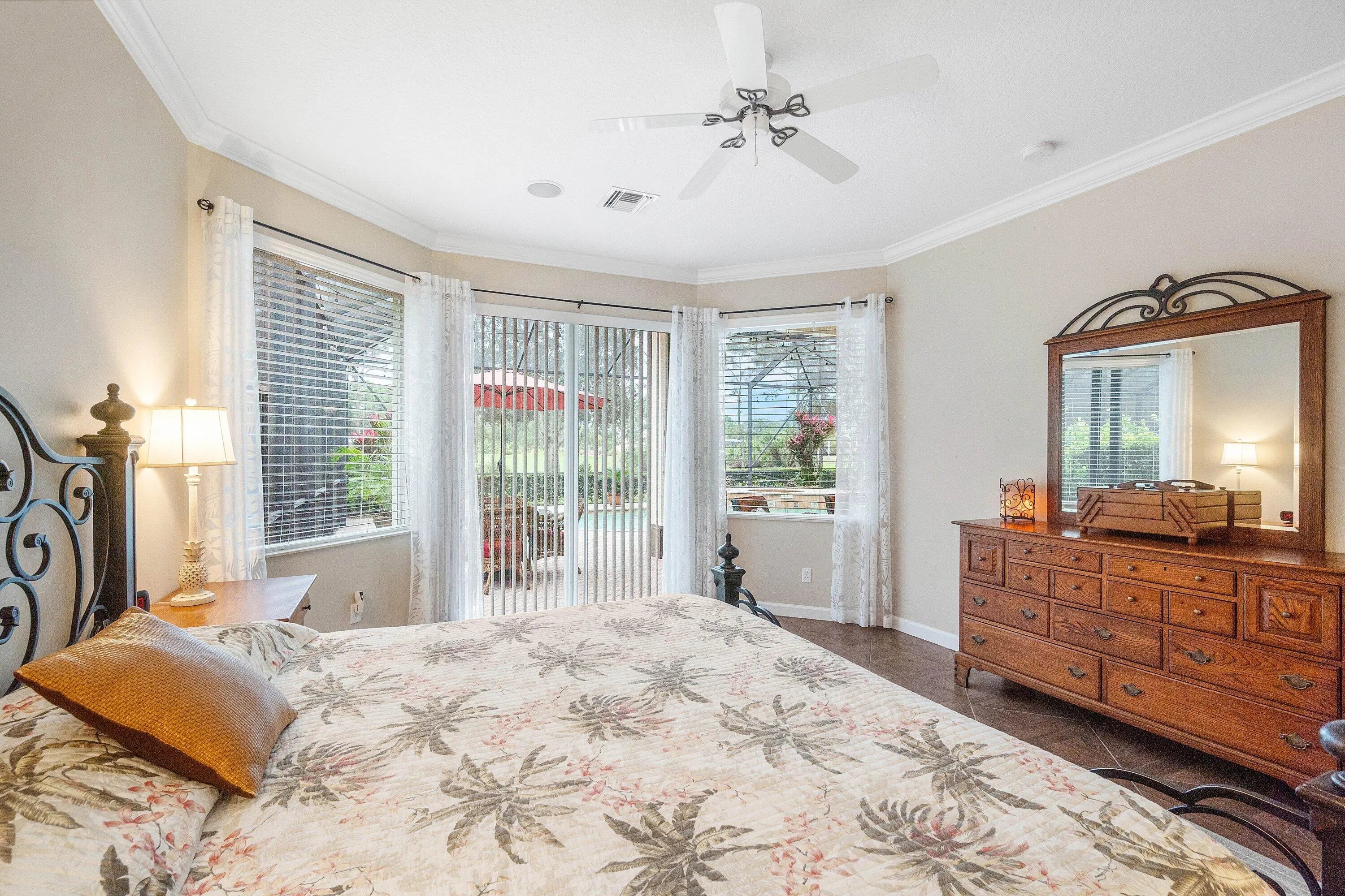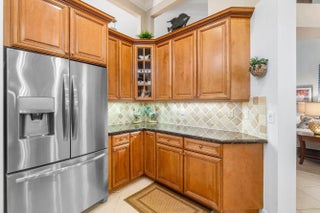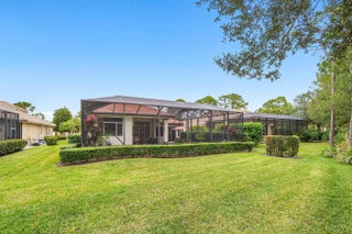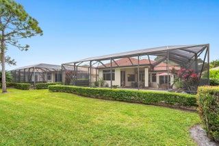 Located in the vibrant golf community of PGA Village, this newly listed three-bedroom, two-bathroom home offers a blend of elegant design and functional features. From the moment you enter through the dual-glazed 8-foot entry doors, you'll notice soaring 12-foot ceilings, crown molding, and an abundance of natural light that creates a welcoming atmosphere throughout. The open-concept kitchen is thoughtfully designed for both entertaining and everyday living, featuring granite countertops, 42-inch upper cabinets, stainless steel appliances, hi-hat lighting, an eat-in bar top, and a cozy dinette area. A formal dining room with a built-in mini bar makes hosting guests a seamless experience. The primary bedroom offers a pair of spacious walk-in closets and a luxurious ensuite bath with a soaker tub, separate vanities, and a standalone shower ideal for unwinding after a long day. Tile flooring spans the common areas, and additional conveniences such as a full indoor laundry room with sink and cabinetry provide functional comfort. Step outside to enjoy Florida living at its finest on the expansive screened patio and covered lanai. Overlooking the 5th hole of the Dye Course, the pool and deck area invite tranquil mornings and celebratory evenings. The oversized garage boasts epoxy flooring. The New $45,000.00 Roof with 8 year transferable warranty, 2022 HVAC system and full set of panel shutters offers both style and storm-ready protection. As an added bonus there is a direct path at the end of Briarcliff Trace that leads to the private Legacy Golf & Tennis Club,only a 5 minute walk or a golf cart ride away. The neighborhood itself boasts plentiful amenities and is surrounded by four distinct golf courses totaling 72 holes. Just minutes away is Clover Park, the beloved home of the Mets'spring training camp perfect for sports enthusiasts. Education and shopping are within easy reach, with Sunlight Christian Academy and a Publix Super Market nearby. The HOA fee includes manned guaurd gates at entrances,cable,internet and full yard maitenance. The HOA fee also covers full use of PGA Village Island Club, which includes the clubhouse,gym,pool,library,tennis,pickleball and event areas. Whether you're simplifying or seeking space, this home strikes the right balance between refined features and warm functionality.