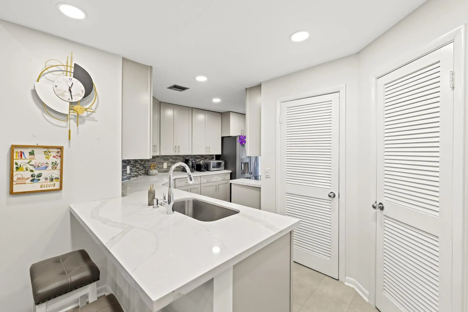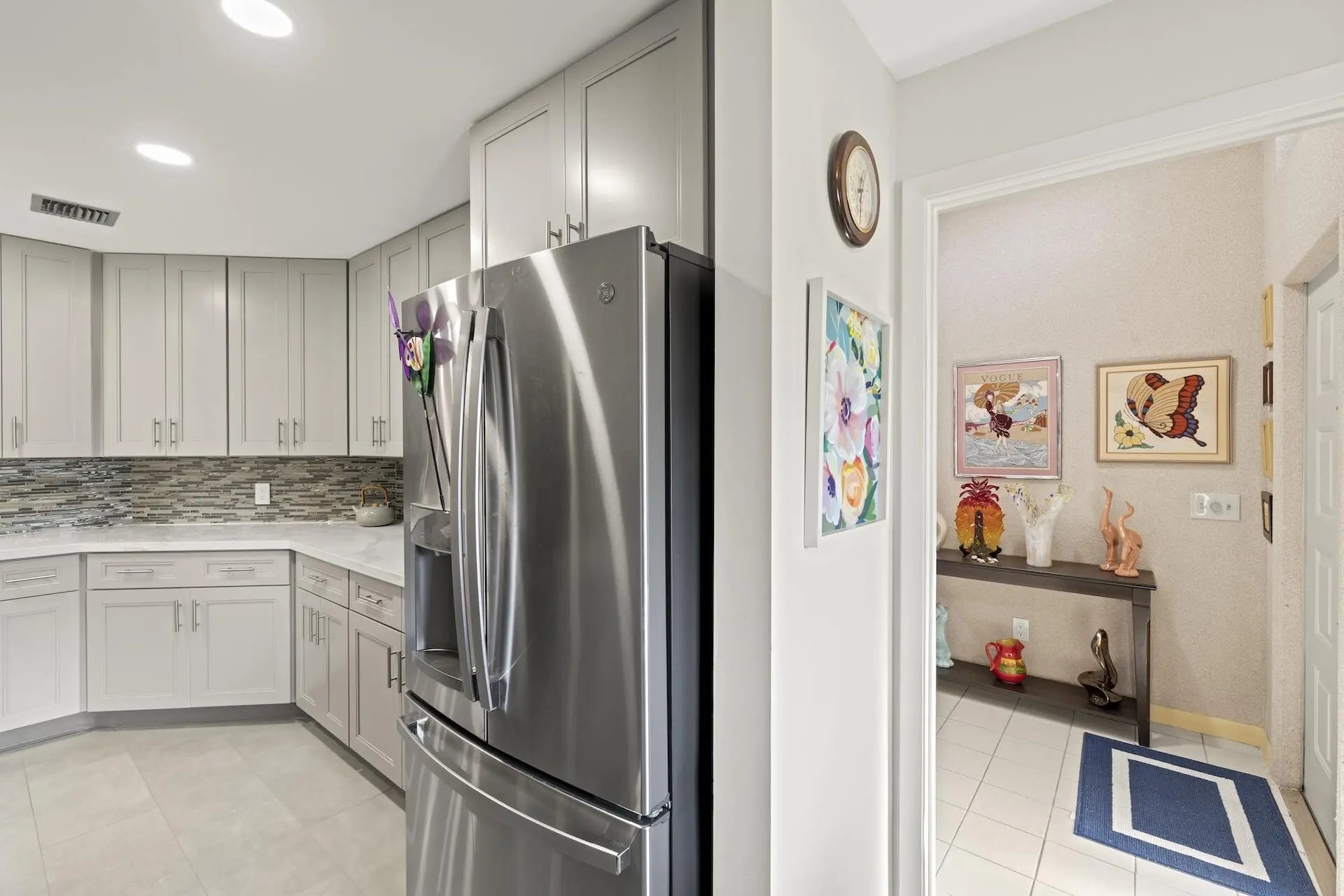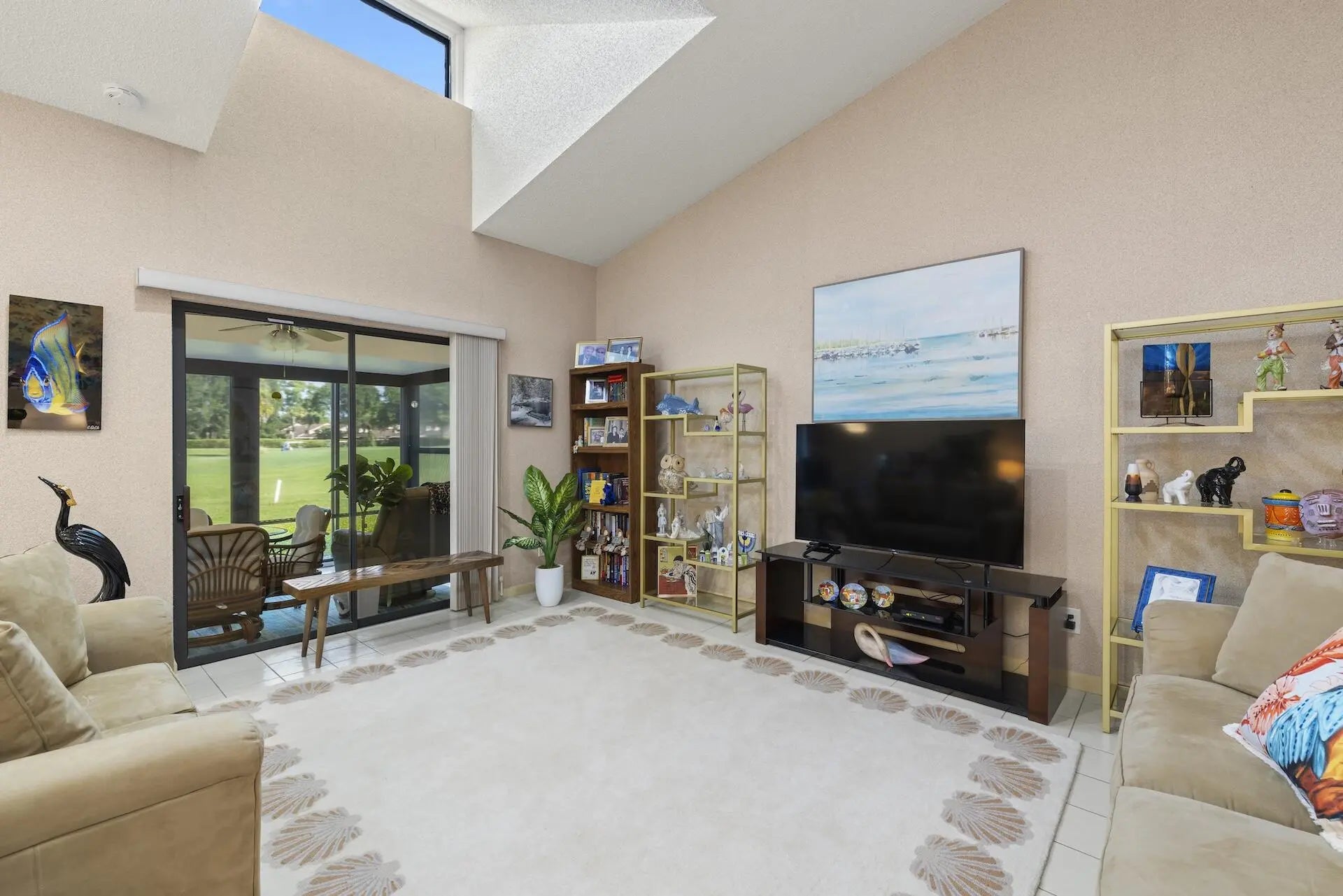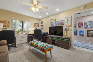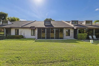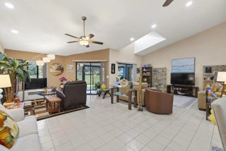 This beautiful, spacious villa offers tranquil views of the golf course & gardens. Exterior walls, garage & front door will be painted Spring 2026. The home is bright & airy, featuring skylights & soaring ceilings that enhance the open feel. The recently remodeled kitchen boasts quartz countertops, premium cabinets, & top-tier appliances. Inside laundry room w/extra storage, plus 2 pantries & eat-in kitchen. Large primary suite provides access to huge covered patio.Primary bathroom has walk-in shower & soaking tub. 2nd bedroom has en-suite bathroom. Upgrades include newer AC, fridge, disposal, washer/dryer, plus impact-resistant windows. The den could easily be converted to a 3rd bedroom.Located in a desirable, all-ages community, the villa is situated close to turnpike, shopping, beaches.