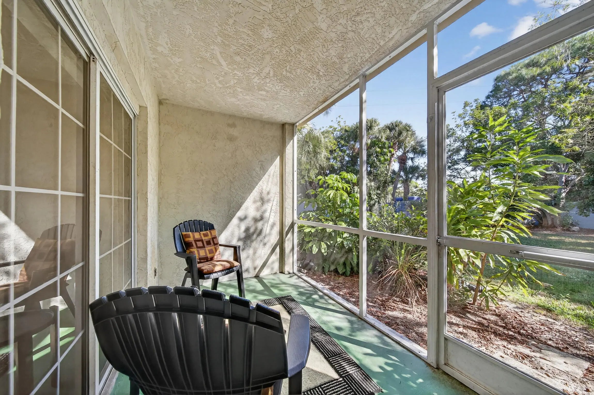 Welcome to this inviting 2-bedroom, 2-bathroom first-floor condo located in the desirable Evergreen community of Port St. Lucie. This well-maintained unit offers a rare combination of privacy and convenience making it an ideal full-time residence or seasonal retreat. Step inside to find updated kitchen cabinetry and bathrooms. The home has tile and vinyl flooring throughout for easy living and a clean, modern feel. The layout flows seamlessly to a screened lanai and a secluded backyard area. A private patio off the guest bedroom offers more outdoor enjoyment. Residents enjoy access to community amenities, including two swimming pools just a short two-minute walk away. Perfectly situated off US-1, this home is only 20 minutes from the beach, 5 minutes from Rotary Park, and... 10 minutes from the Florida Turnpike. Move-in ready and ideally located, this charming condo offers comfort, convenience, and value.