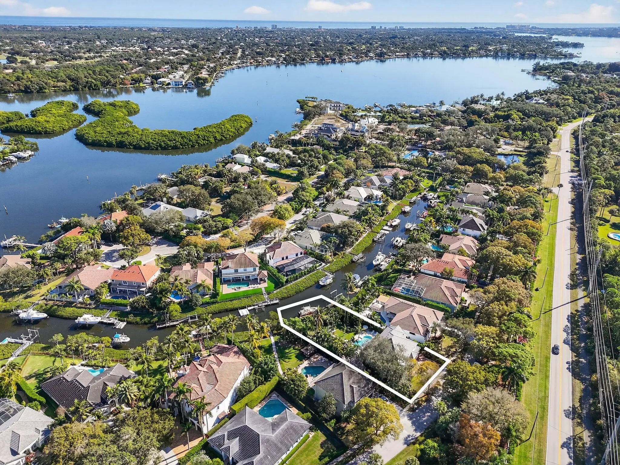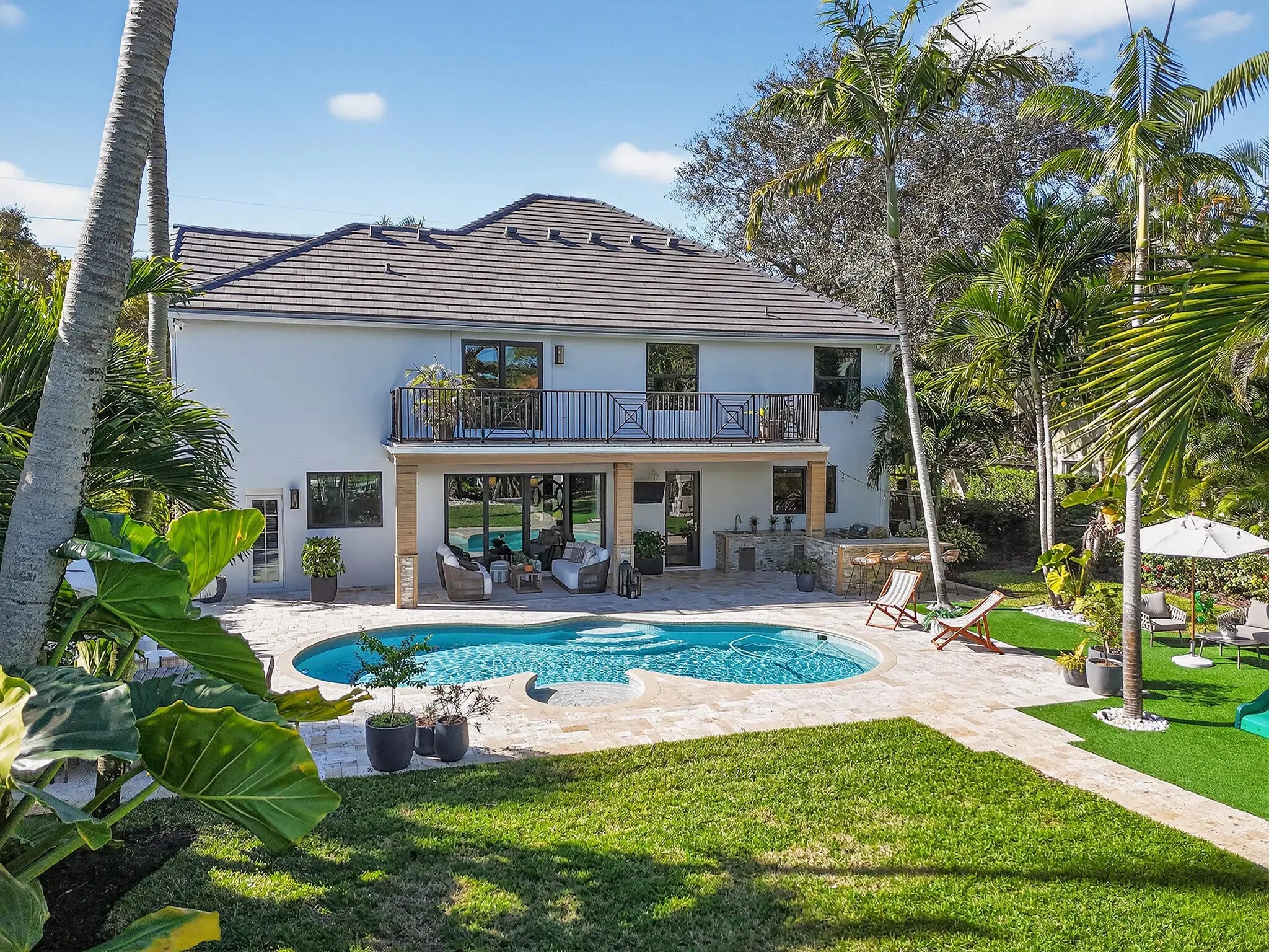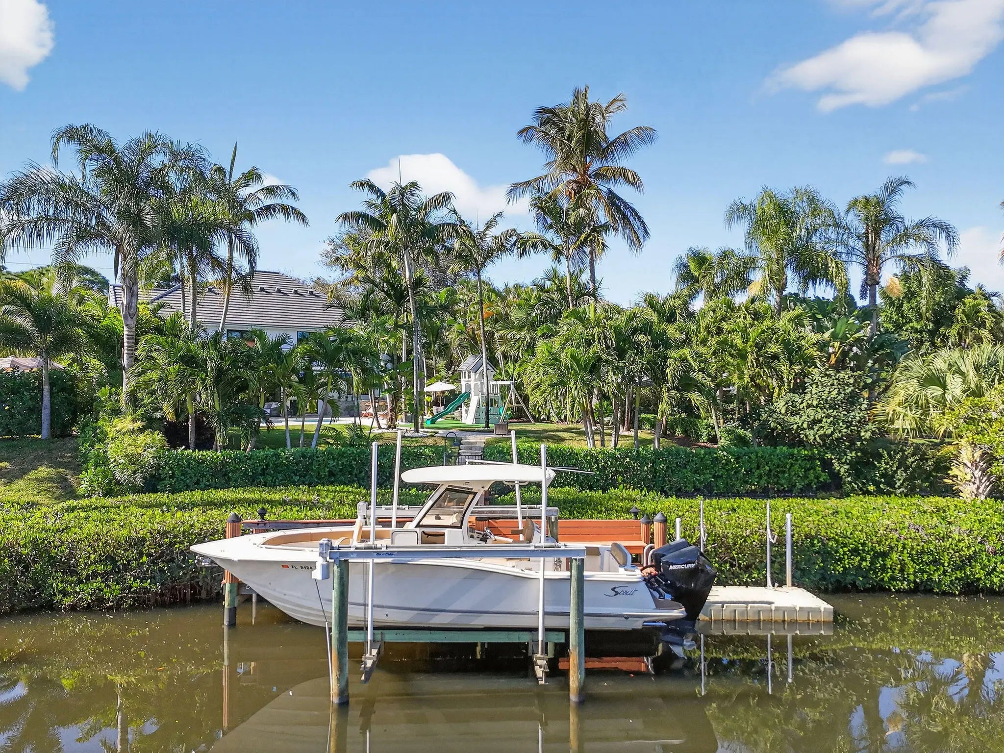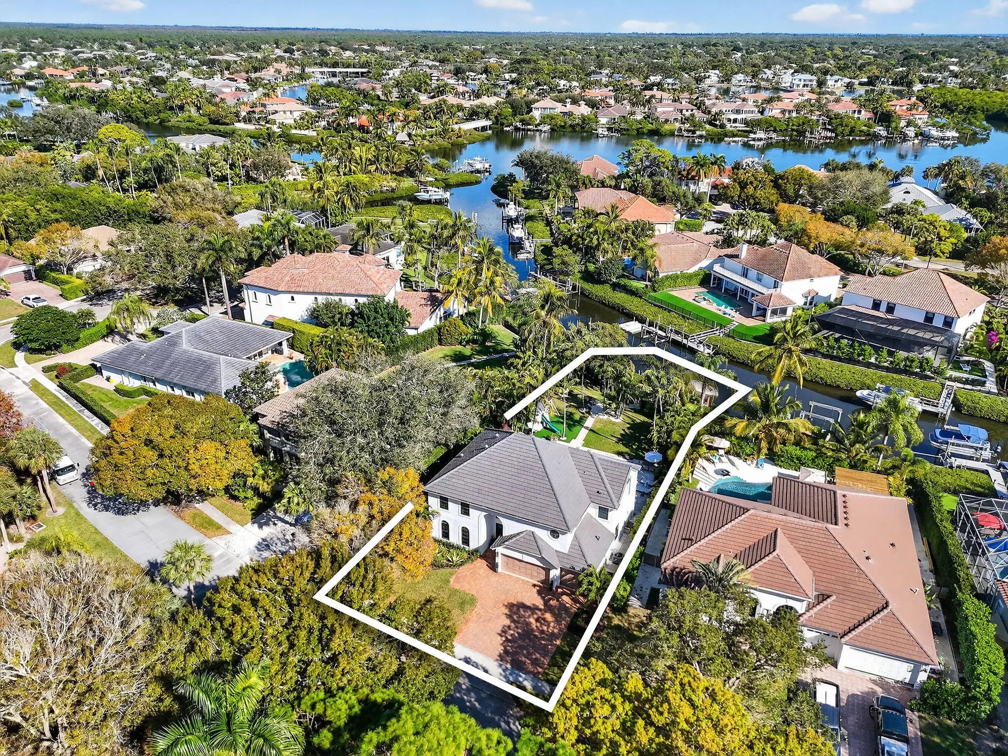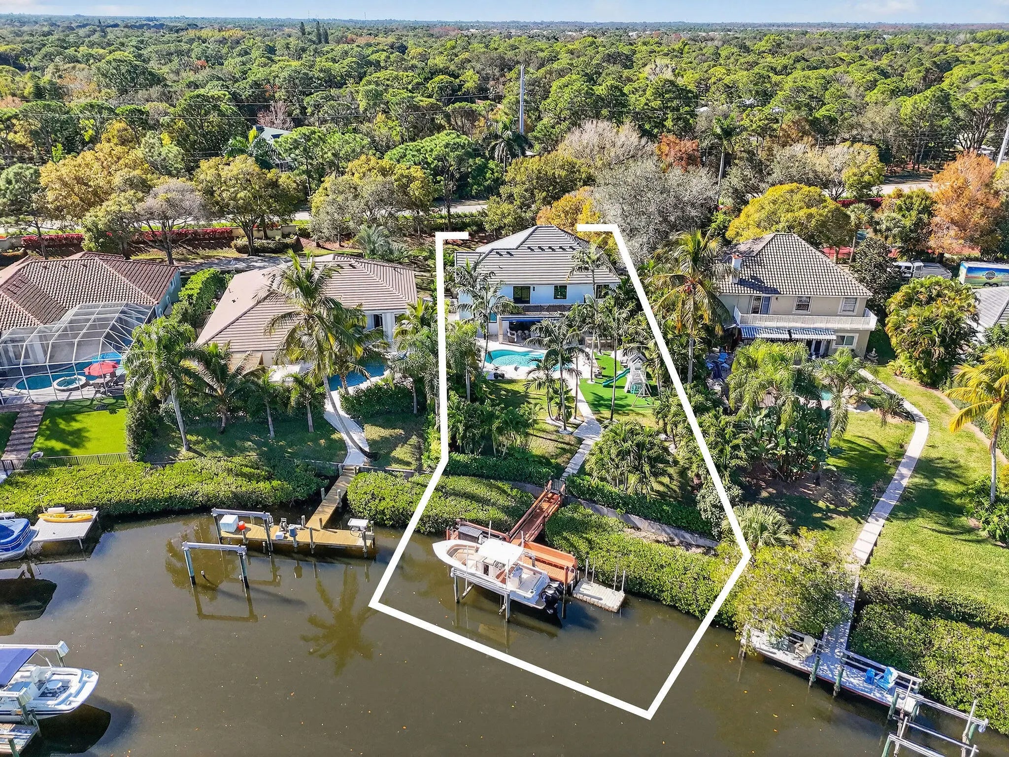 Tucked within the quaint and coveted boating enclave of Loxahatchee Pointe, this beautifully appointed waterfront residence at 19954 Loxahatchee Pointe Drive captures the essence of Jupiter's active, coastal lifestyle. Lush tropical landscaping frames this five-bedroom, four-bath home, where indoor and outdoor living blend effortlessly for both everyday comfort and exceptional entertaining. The backyard is a true private retreat, highlighted by a sprawling travertine deck, elegant resort-style pool with sun shelf, outdoor kitchen, and a pavered walkway leading to your own private dock. Boating enthusiasts will appreciate the 12,000-pound boat lift, additional floating docks ideal for kayaks, paddleboards, or jet skis, and the rare advantage of no fixed bridges—offering direct access to the Intracoastal and open ocean. Inside, the home has been fully renovated with an elegant, light-filled kitchen featuring new appliances, a generous center island, and abundant custom storage. The main living area opens seamlessly to the pool and patio, enhanced by retractable awnings that provide shade and comfort throughout the day. The upper level offers a tranquil sun deck overlooking the pool, a serene primary suite with a fully renovated bath, four additional bedrooms, and a spacious, loft. Additional highlights include a whole-house generator and advanced air filtration system, ensuring peace of mind and year-round comfort. This is relaxed luxury living, designed for those who love the water, the outdoors, and an active coastal lifestyle.