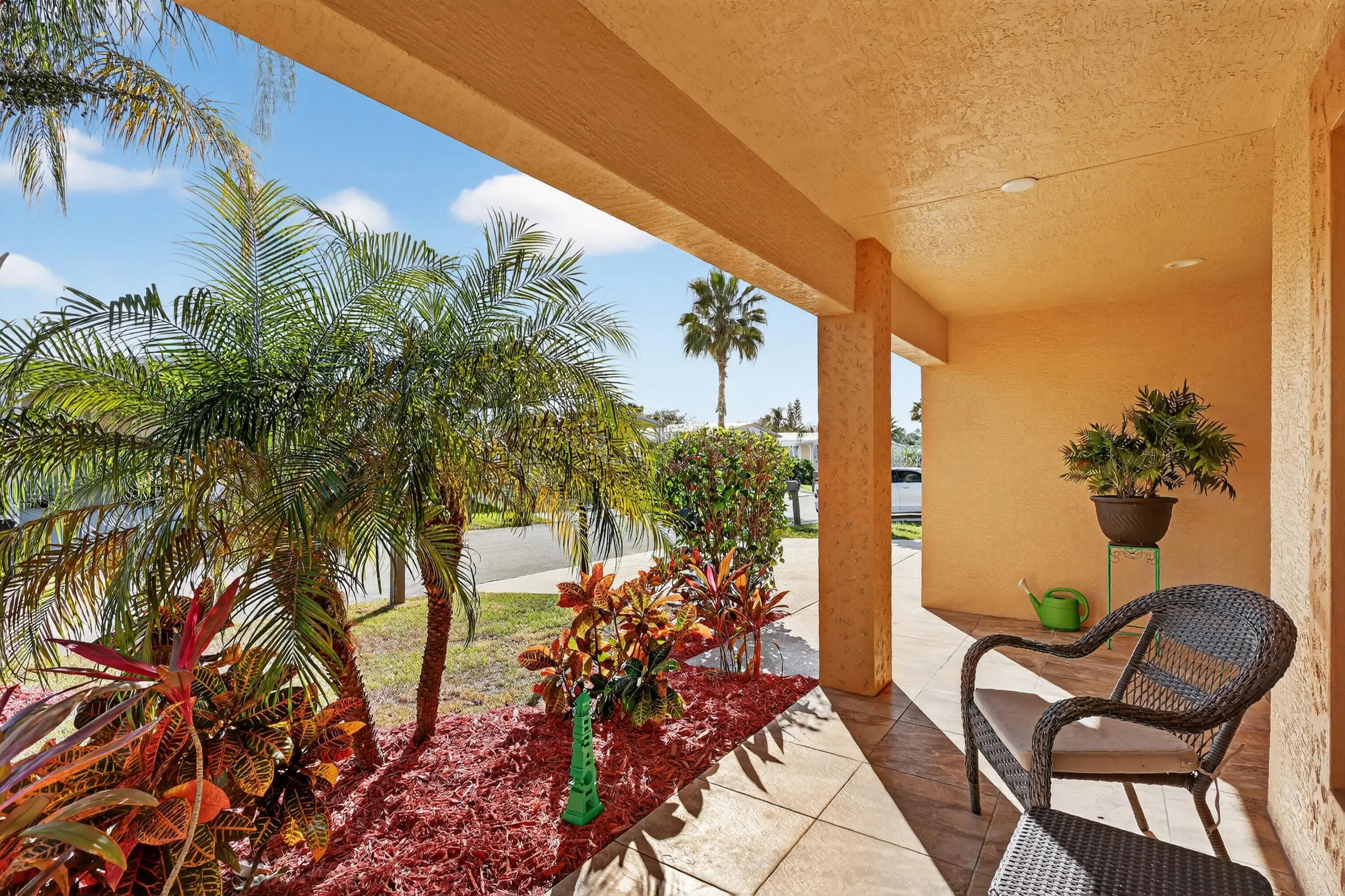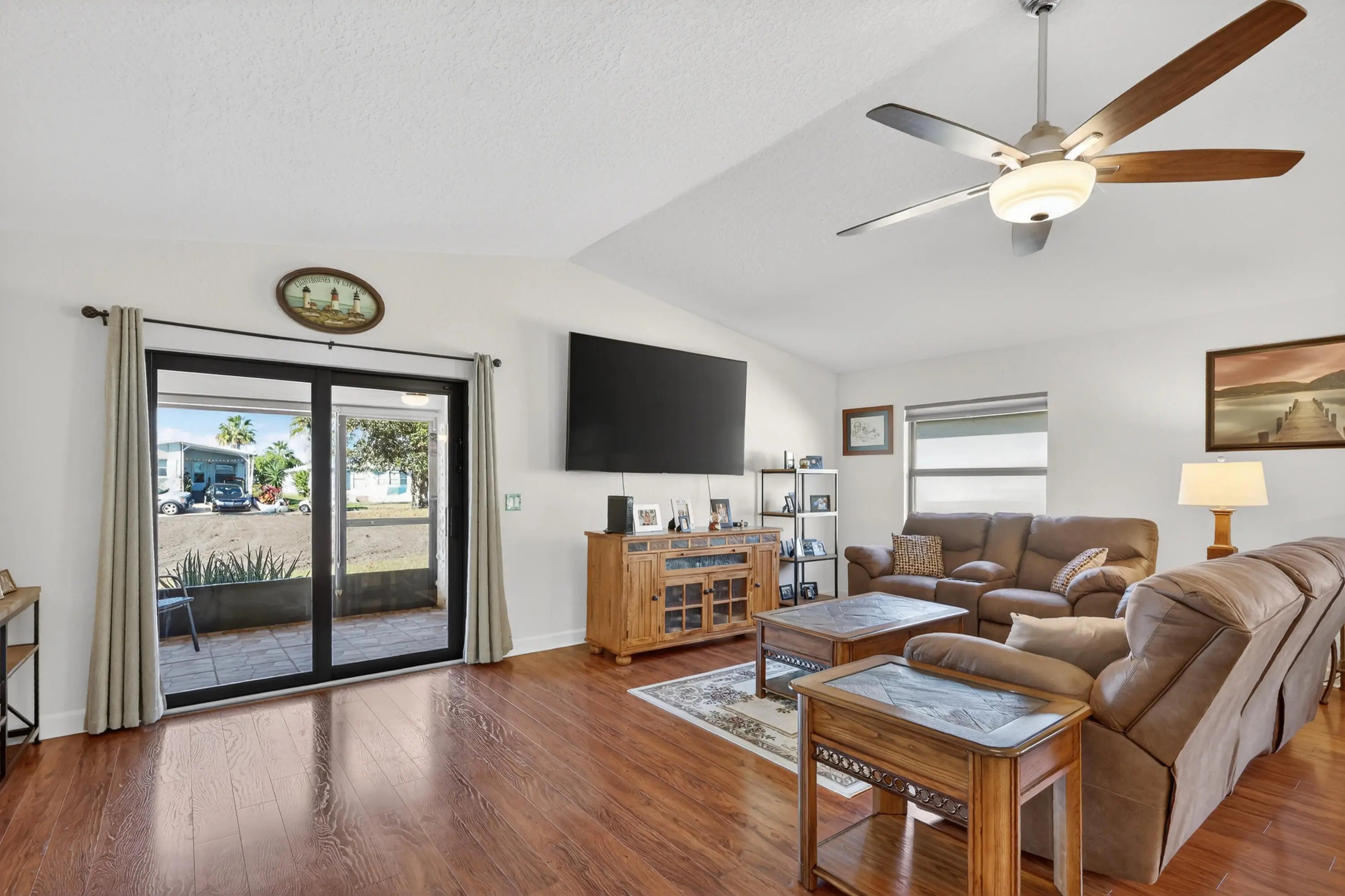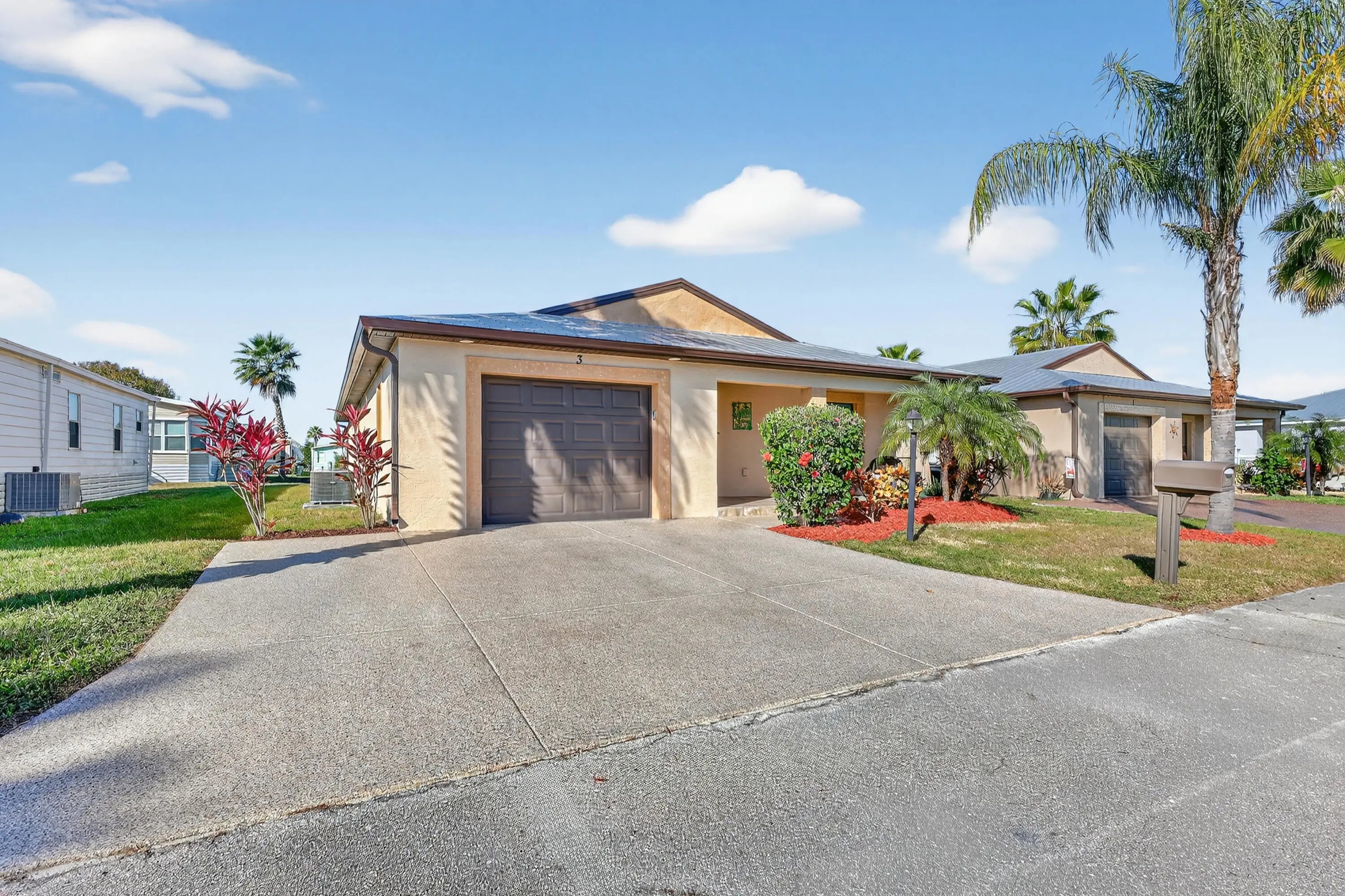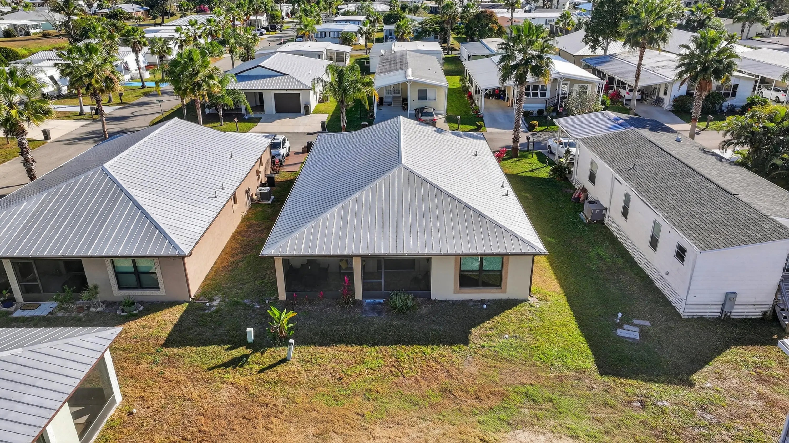 ELEGANT, DURABLE, SAFE & AFFORDABLE this 2018 2bed/2bath home w/ Only 1 owner is BUILT to LAST w/ Concrete Block Construction, IMPACT WINDOWS & a Metal Roof built over 5/8'' Plywood for maxstrength. KeyPadEntry, OpenConcept, Vaulted Ceilings,H20 Purify System throughout,LED Recessed Lights,Ceiling Fans,GRANITE Counters,Custom Window Treatmnts, StainlessSteel, Appl, 2024 Wash/Dryer, Master w/ walk-in closet & en-suite.Tiled & Shaded Front Porch & Lrg Screened, Tiled Lanai w/ Privacy Shades. Driveway coated w/ 24hour floor. PRIME LOCATION; beach, shopping,mall,grocery, bank,hospital,postal & more! Lot lease 646.36 includes trash, lawn care, Clubhouse w/Activities, Private FREE Golf,Heated Pool,Spa,Fitness,Pickleball,Tennis, Shuffleboard,Bocce,Library, Bingo,Parades, MahJong,Workshop & more!