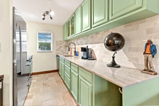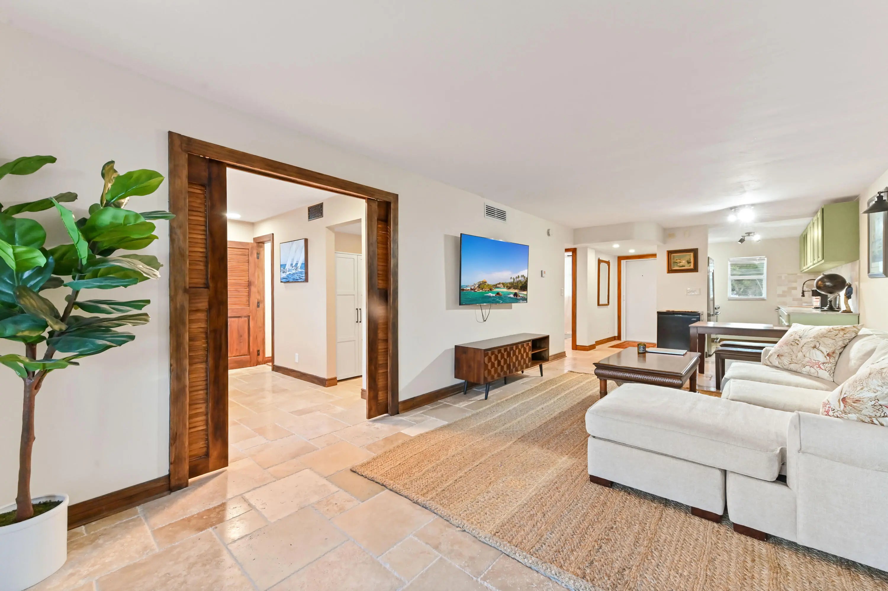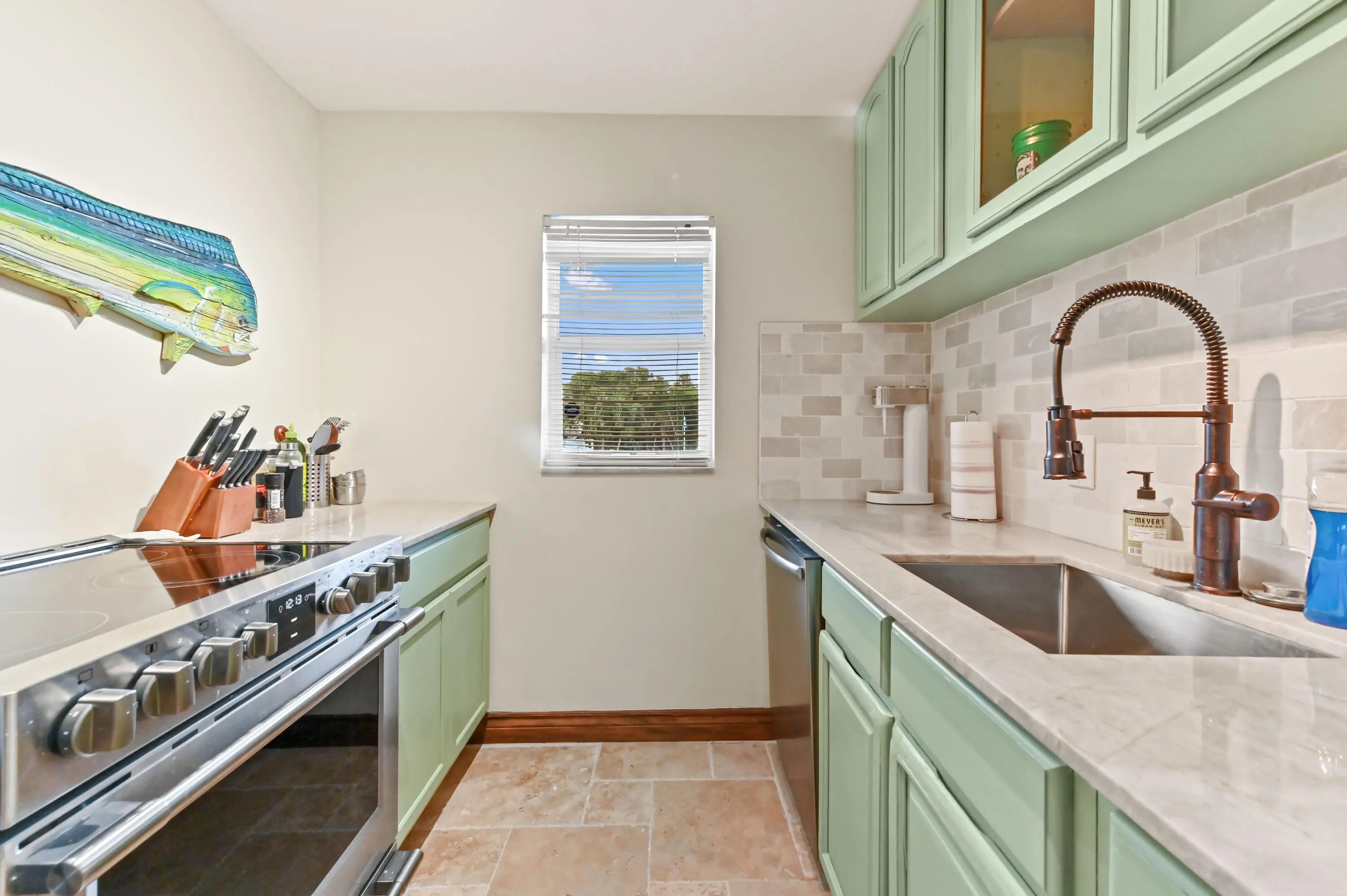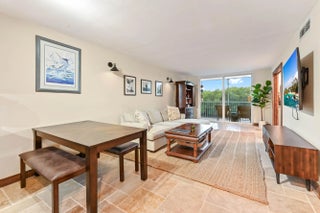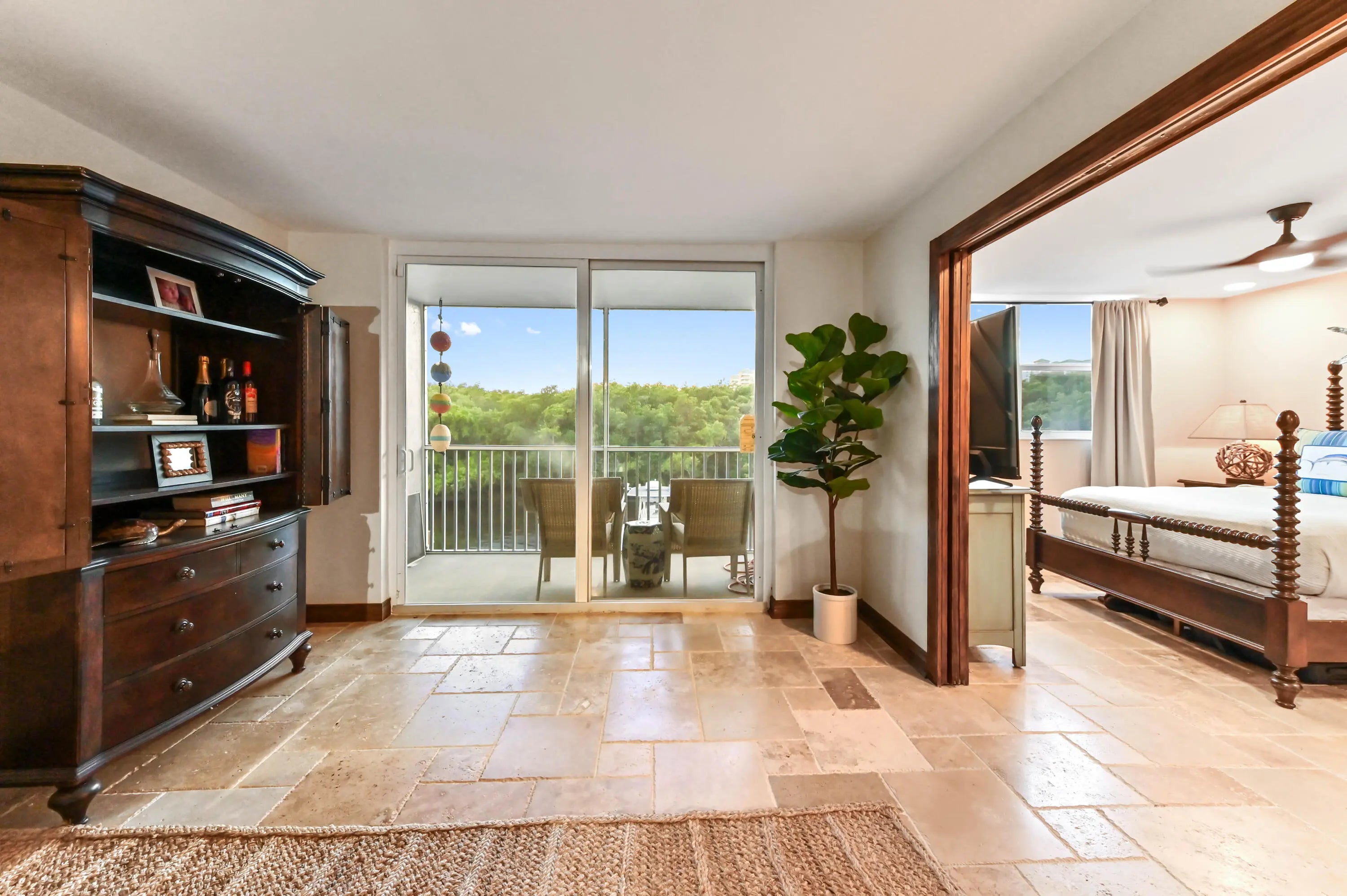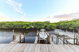 Step into a residence where coastal charm meets high-end design, defined by stunning travertine-style stone flooring that spans the entire unit for a seamless, sand-free lifestyle with impact windows and doors throughout. The heart of the home is the kitchen, featuring unique sage green cabinetry, a statement bronze farmhouse faucet, and stainless steel appliances set against a crisp subway tile backsplash. This space opens effortlessly into the dining area and a spacious living room, where large sliding impact glass doors lead to a screened balcony offering serene views of the canal and boat docks nestled among the mangroves—the perfect backdrop for your morning coffee. The attention to detail continues in the private quarters, accessed through rich wood-trimmed louvered doorways that add a warm, tropical West Indies feel to the home. The primary bedroom is a generous sanctuary, easily accommodating a large four-poster bed, while the second room serves perfectly as a home office or guest space. A standout feature rarely seen at this price point is the upgraded laundry center, complete with a modern laundry appliances and flanked by custom floor-to-ceiling white cabinetry for exceptional storage. This great home is located just minutes from fine shopping, dining and much more!
