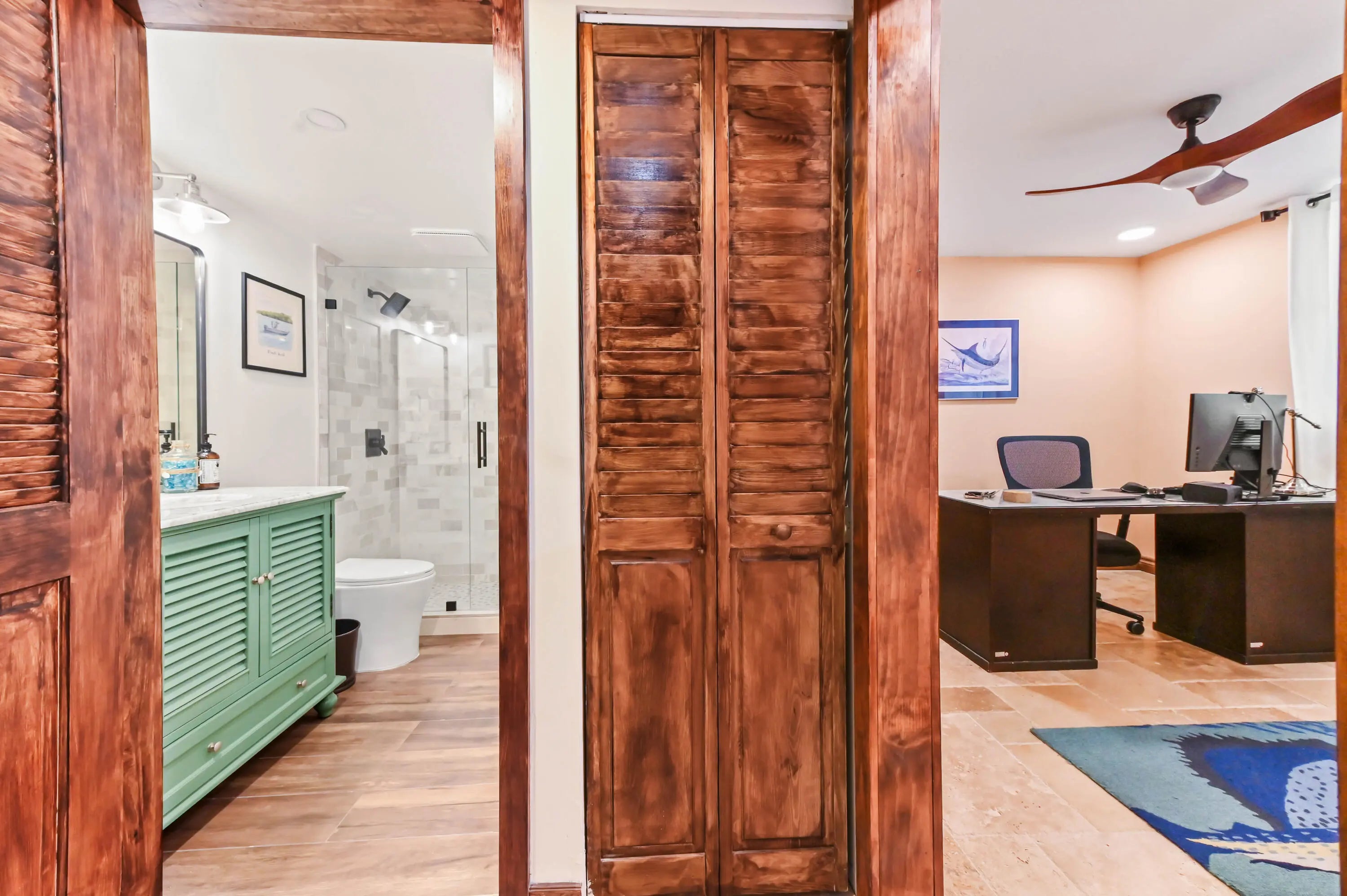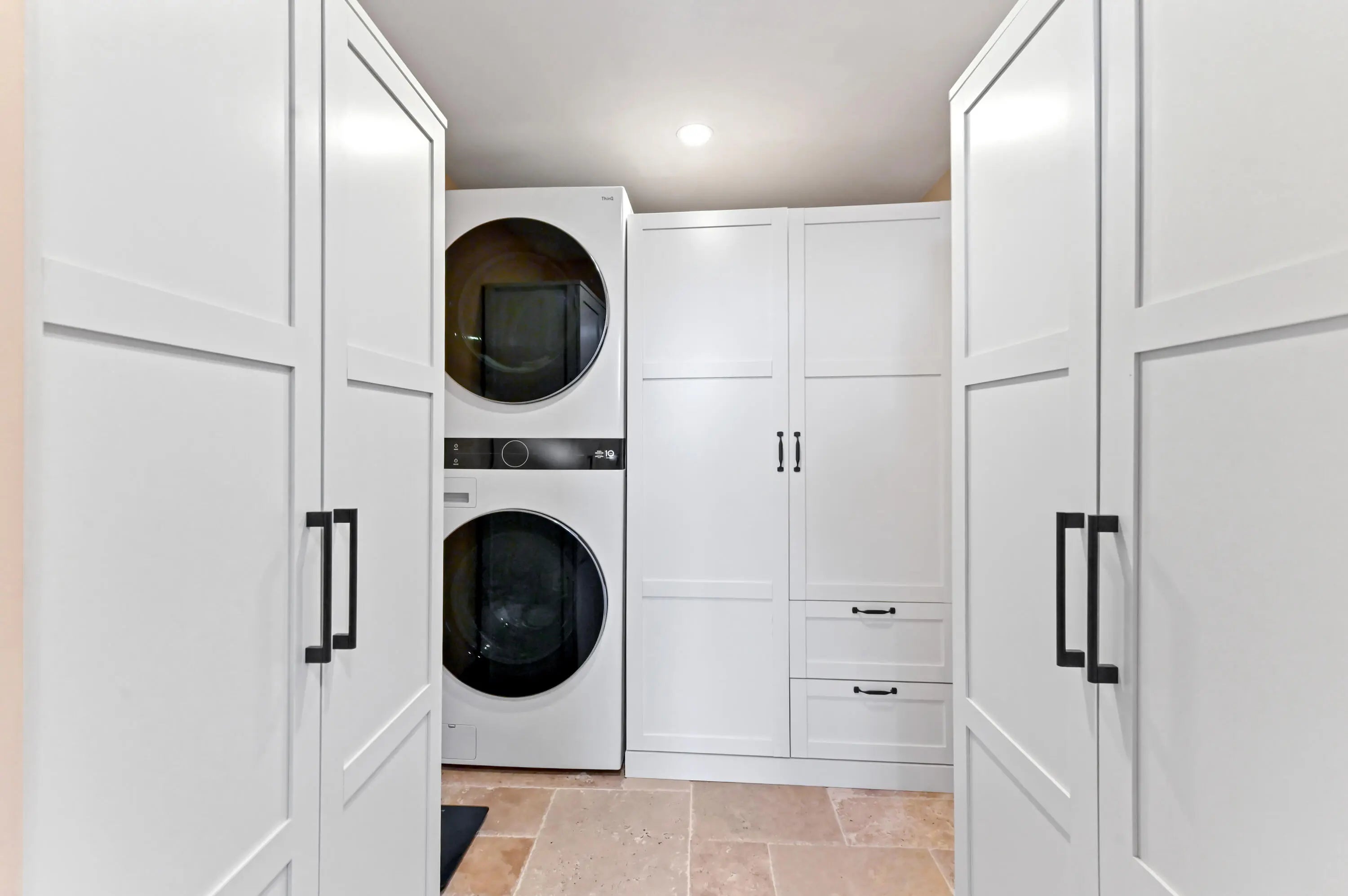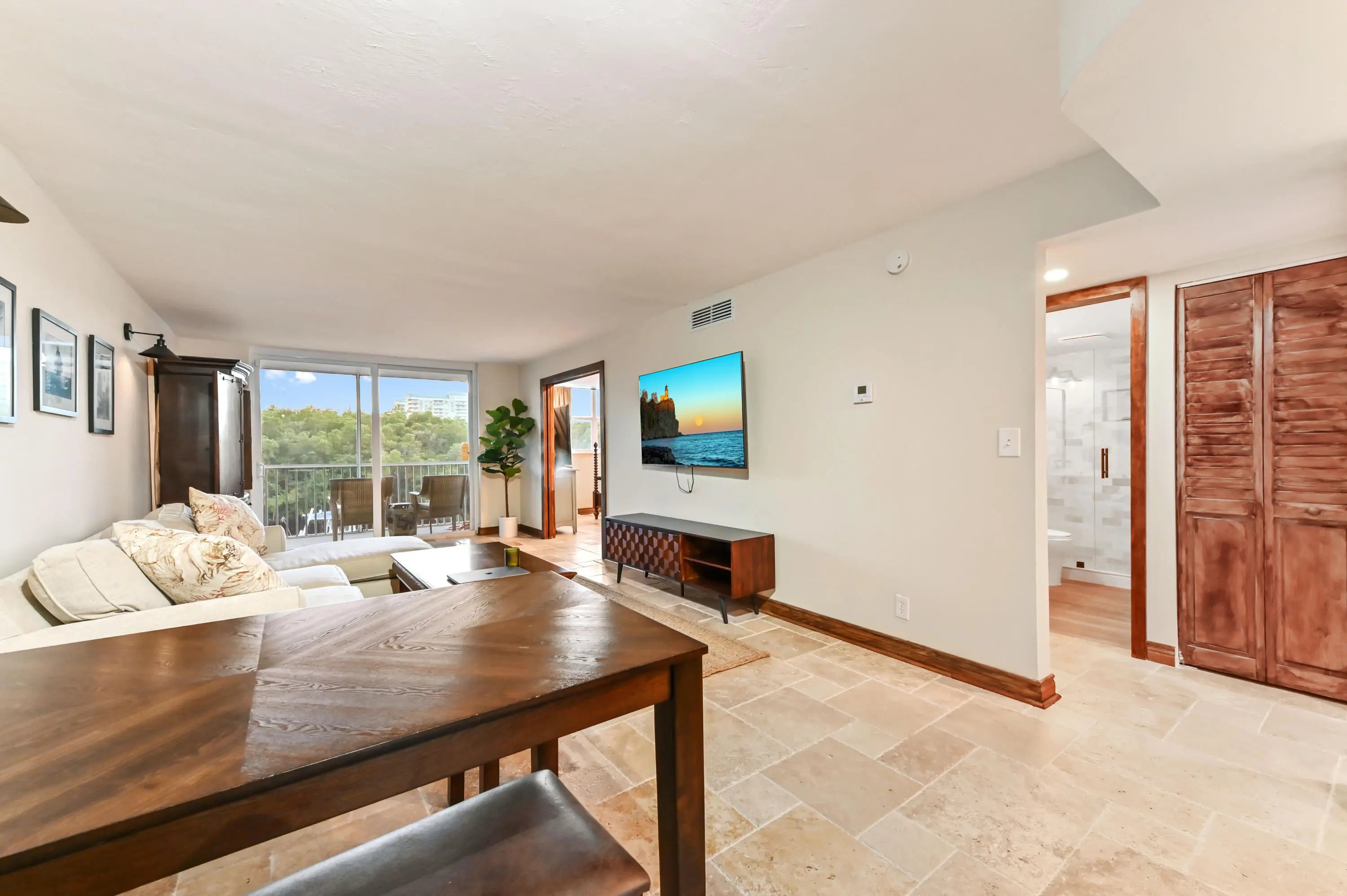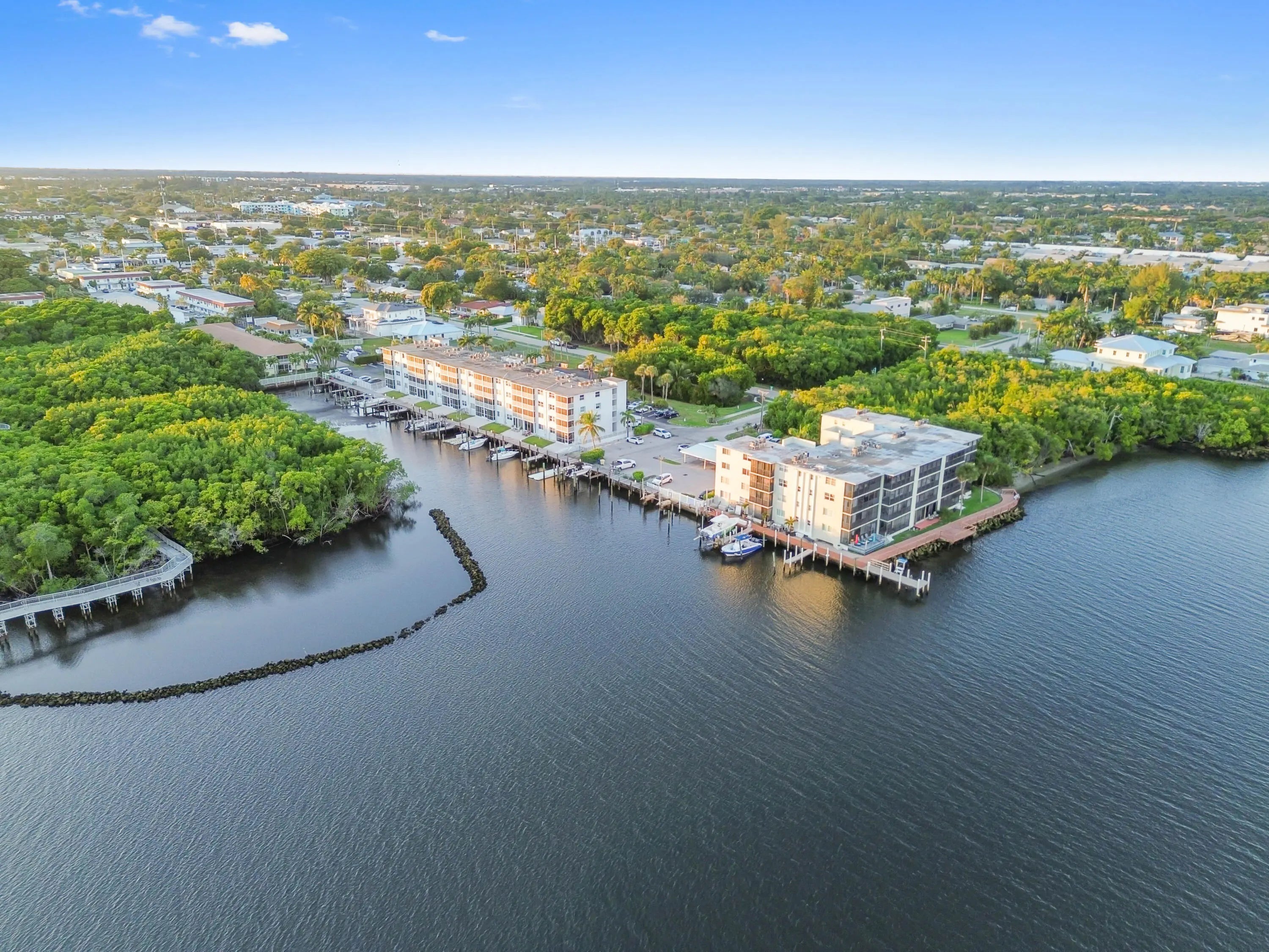 Step into a residence where coastal charm meets high-end design, defined by stunning travertine-style stone flooring that spans the entire unit for a seamless, sand-free lifestyle with impact windows and doors throughout. The heart of the home is the kitchen, featuring unique sage green cabinetry, a statement bronze farmhouse faucet, and stainless steel appliances set against a crisp subway tile backsplash. This space opens effortlessly into the dining area and a spacious living room, where large sliding impact glass doors lead to a screened balcony offering serene views of the canal and boat docks nestled among the mangroves—the perfect backdrop for your morning coffee. The attention to detail continues in the private quarters, accessed through rich wood-trimmed louvered doorways that add a warm, tropical West Indies feel to the home. The primary bedroom is a generous sanctuary, easily accommodating a large four-poster bed, while the second room serves perfectly as a home office or guest space. A standout feature rarely seen at this price point is the upgraded laundry center, complete with a modern laundry appliances and flanked by custom floor-to-ceiling white cabinetry for exceptional storage. This great home is located just minutes from fine shopping, dining and much more!