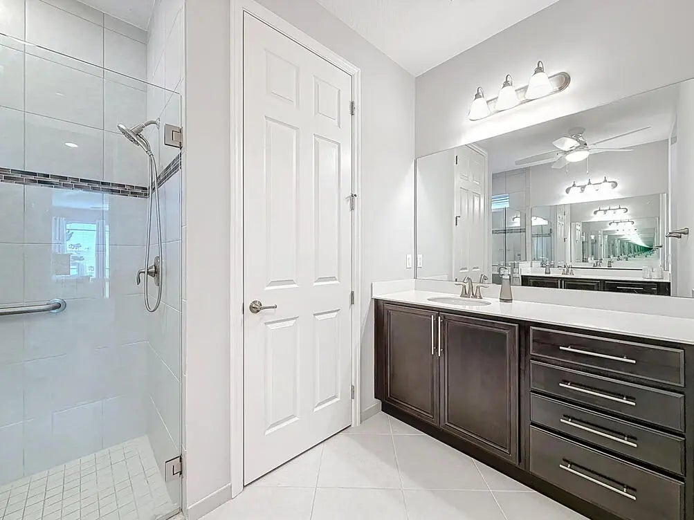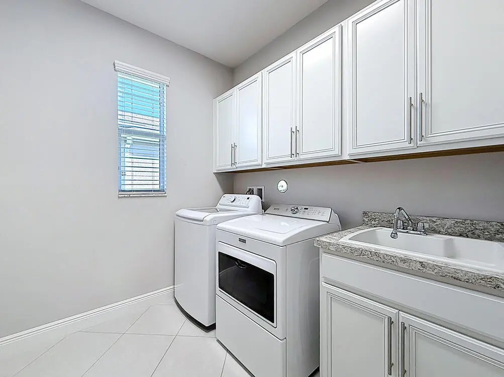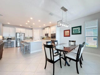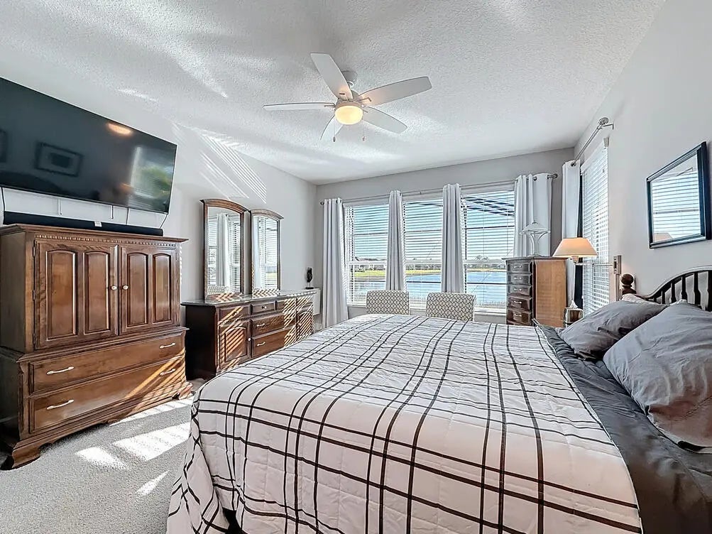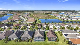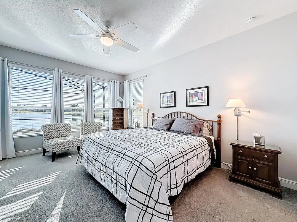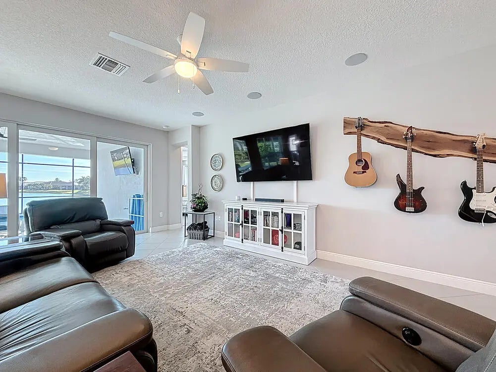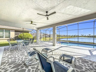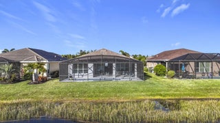 Welcome to your Vitalia dream home! This bright and open home offers breathtaking long-water lake views visible from the entrance foyer and extending into the dining area, great room and primary bedroom. This popular 2-bedroom, 2-bath Jensen model with a versatile den offers over 2000 square feet of luxurious living space. The expansive outdoor living area includes a screened lanai where you can enjoy sunrises, moonrises, rocket launches and tropical breezes whether relaxing in your heated spa, floating in your gorgeous saltwater pool or watching the big screen TV. Nestled in a prime location, this home is the perfect waterfront retreat for relaxation and entertaining family and friends. As you step inside, you'll be captivated by the tile flooring that flows seamlessly throughout the main living area, enhancing its modern elegance. The large open-concept great room creates a welcoming atmosphere and includes 5 ceiling mounted Bose speakers for surround sound. The stunning kitchen features 42-inch cabinets, a classic tile backsplash, rollout bottom shelves in lower cabinets, electric stove top, double ovens, microwave, under-cabinet lighting and a spacious quartz countertop and island layout that is perfect for cooking and entertaining. The oversized primary suite is a private sanctuary, complete with a large walk-in closet, a cozy sitting area, and an en-suite bath featuring his and her sinks and a spacious tile shower. The guest bedroom and bath are thoughtfully positioned at the front of the home, offering easy comfort for visitors. The adjoining den provides endless possibilities, ideal for a home office, media room, or additional guest space. Flexible sliding barn door configurations ensure visitor privacy is available for both rooms. The oversized garage is an excellent bonus, being 4 feet longer than a standard garage. Features include a finished epoxy floor and overhead, wall-rail and attic storage spaces to meet all your storage needs. As added bonuses, the pool/spa had new state-of-the-art equipment including pump, heater, chlorinator, control panels and remote access via smartphone installed in September 2024 with a 3-year warranty. Also, the home exterior was just painted in February 2025 and the pool deck was refinished at the same time. Additional features include a widened paver driveway, impact glass windows and doors for superior storm protection, and high-end finishes throughout. Vitalia is a vibrant and active adult community that offers a 24,000 SF clubhouse with a ballroom, aerobics studio, fitness center, demo kitchen, library, and card & game rooms. Residents can enjoy a variety of outdoor amenities, including tennis, pickleball, bocce, horseshoes, basketball, two heated pools, and a large putting green. With its spectacular waterfront views, luxurious upgrades and open-concept design, this home is the perfect blend of comfort and elegance. Don't miss the opportunity to make it yours!