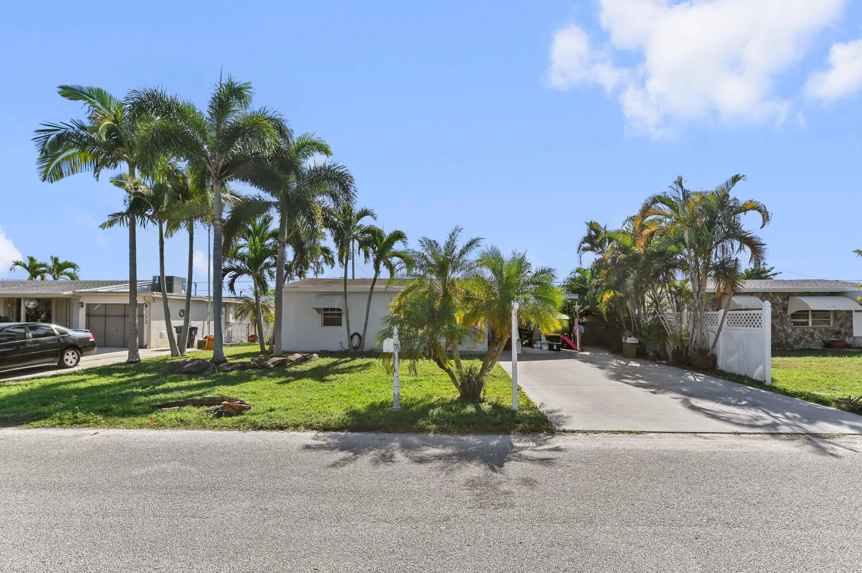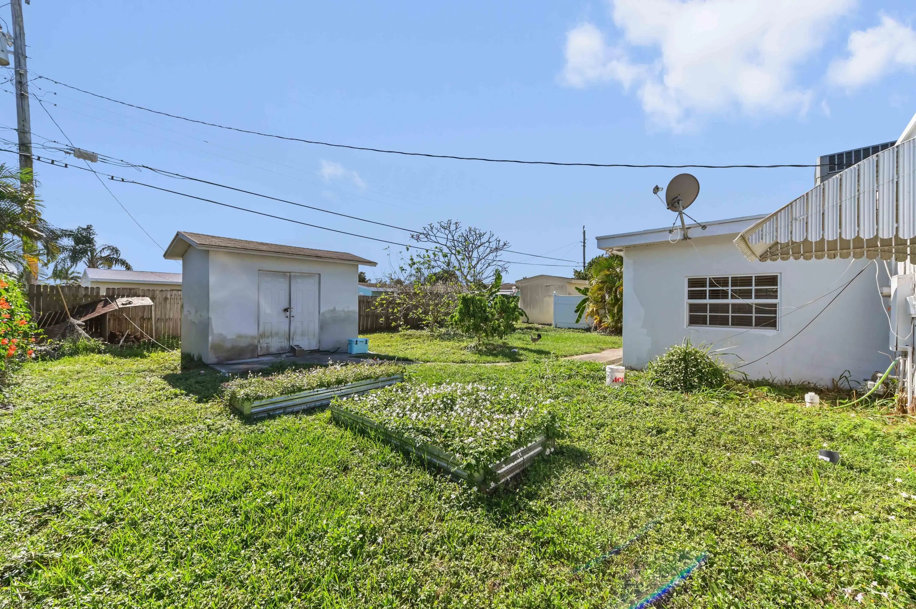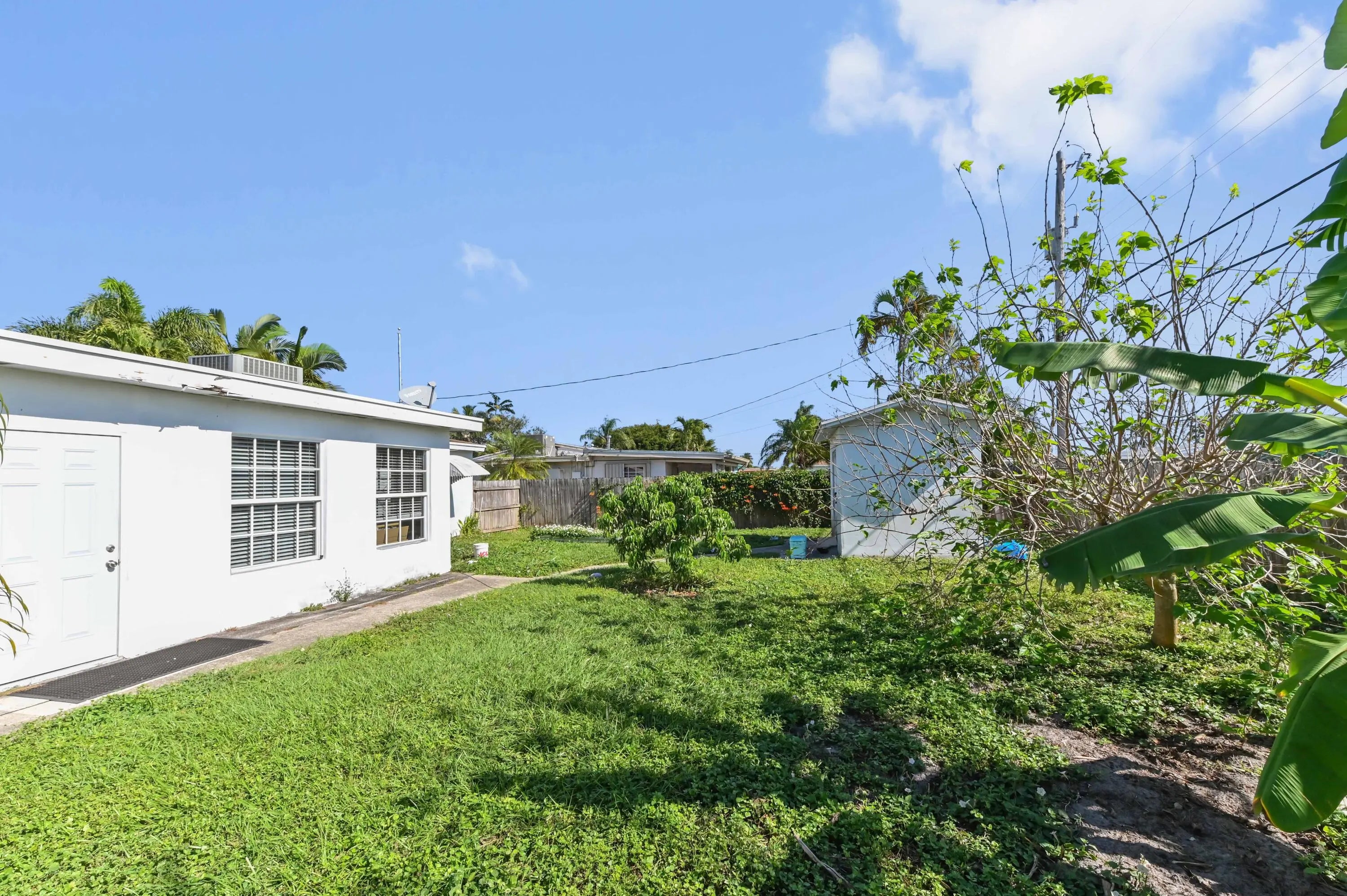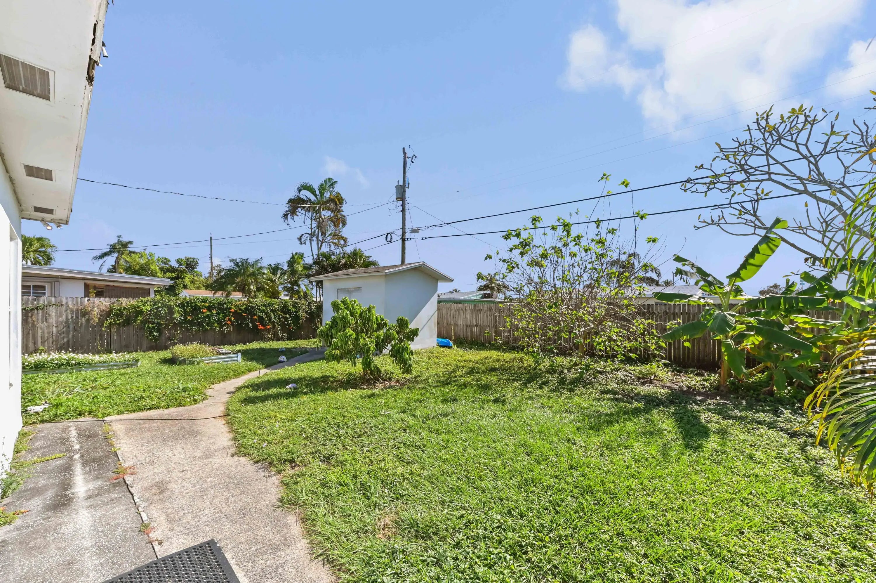 Discover the essence of relaxed Florida living in this charming single-family home, nestled amidst a lush landscape of swaying palm trees in Lake Worth. A welcoming white front door opens into a bright living space, where warm wood-look flooring and abundant natural light create an inviting atmosphere for relaxation. The versatile floor plan flows effortlessly from the cozy living room into a dedicated dining area, perfect for intimate meals or family gatherings. The heart of the home is the kitchen, featuring crisp white cabinetry and stainless steel appliances. This home offers comfortable accommodations with spacious bedrooms that serve as peaceful retreats. The primary bedroom is bathed in sunlight, while the additional rooms provide flexibility for a guest room, home office, or nursery, complete with ample closet space and ceiling fans for year-round comfort. The bathrooms are tastefully appointed, including a tub/shower combination. Step outside to your private backyard sanctuary, a fully fenced green space that promises endless outdoor enjoyment. The lawn offers a serene backdrop for gardening, play, or simply soaking up the sun. A storage shed/utility room provides extra space for tools and beach gear, while the paved driveway ensures ample parking. Ideally located in a quiet neighborhood with no HOA, this delightful property is just moments away from local shops, dining, and the beautiful Lake Worth beaches.