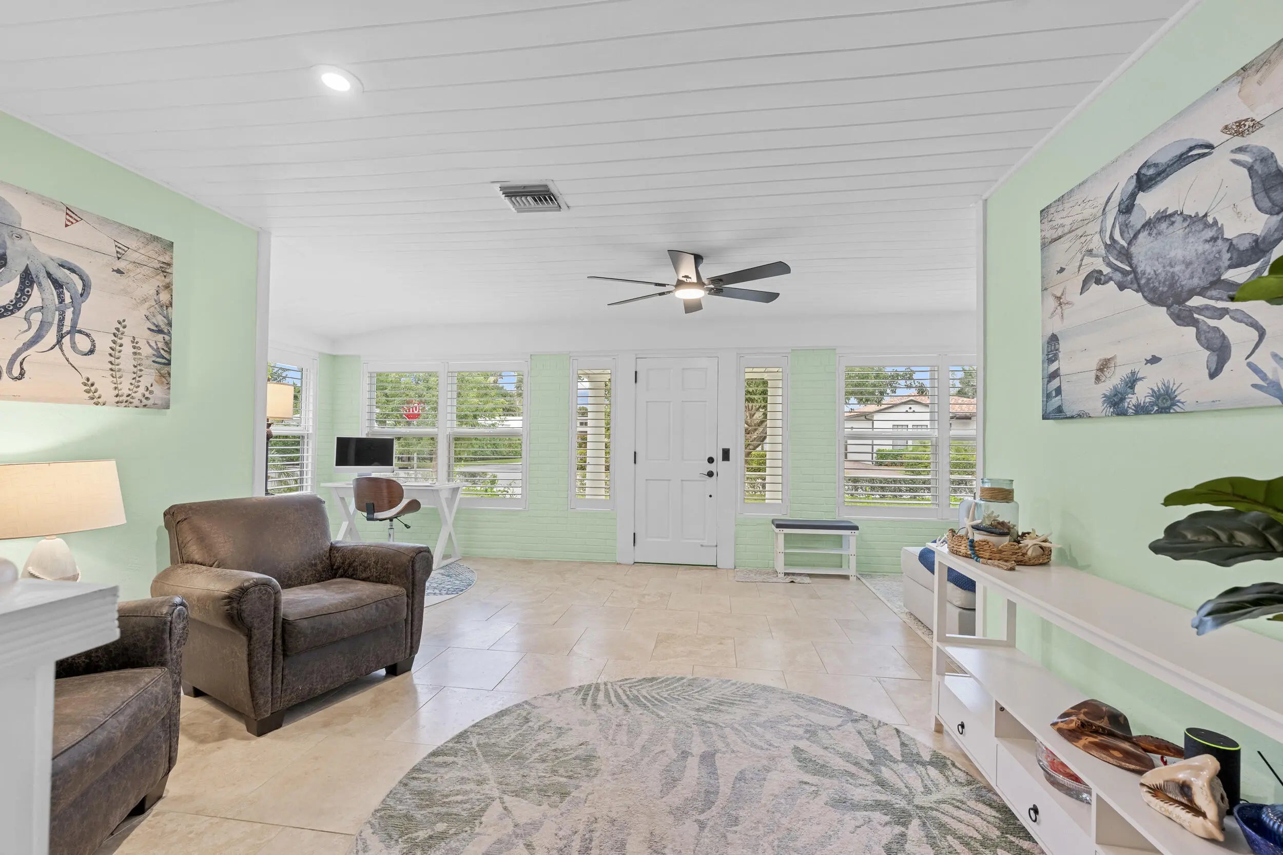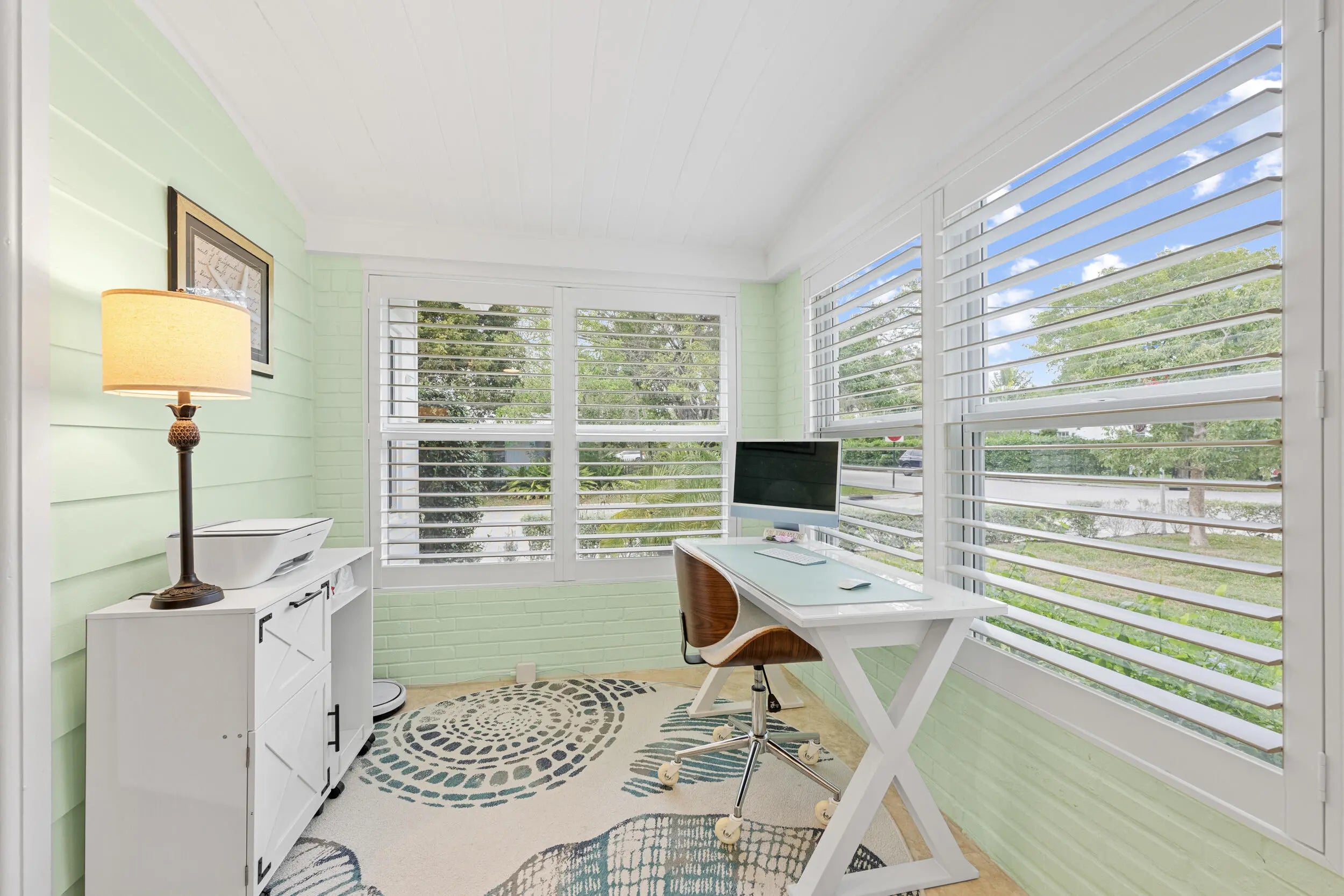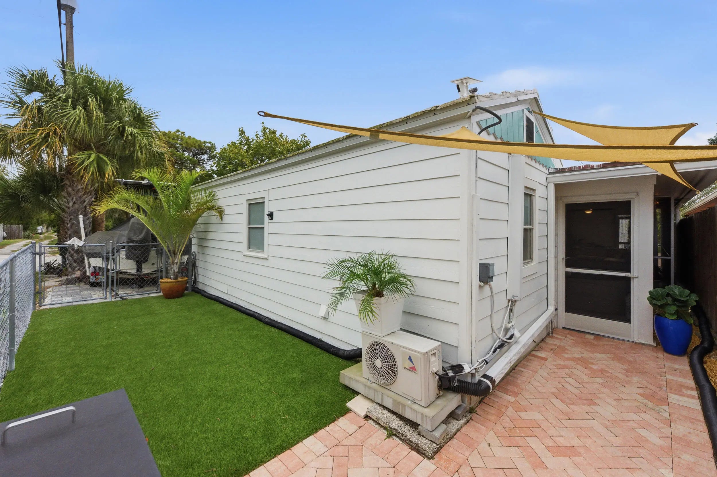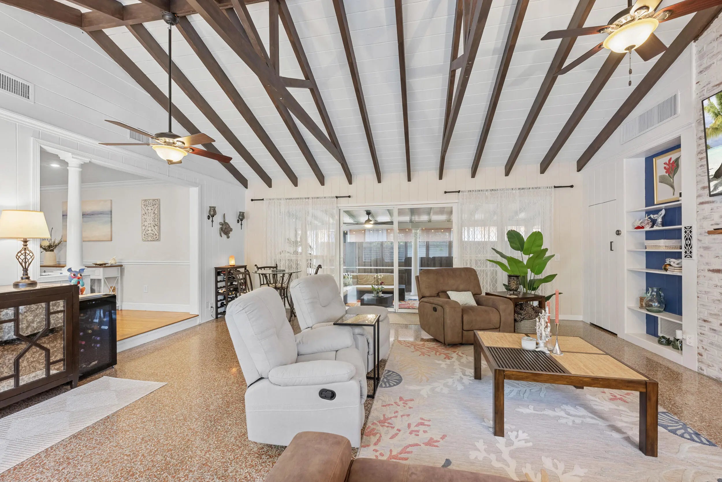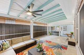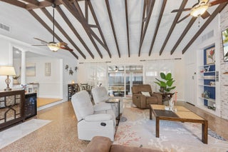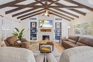 Welcome to this beautifully updated slice of Florida charm, perfectly positioned on a corner lot in the highly sought-after Parrot Cove neighborhood of East Lake Worth. This three-bedroom, two-bathroom home with a detached one-car garage offers the ideal blend of timeless character and modern upgrades. Parrot Cove is celebrated for its strong sense of community, with residents enjoying block parties, New Year's celebrations, pool parties, and an annual home and garden tour, all just steps from the Intracoastal. This property truly offers the best of charm, thoughtful improvements, and neighborhood living in one of the area's most desirable communities. Throughout the home, thoughtful attention to detail is evident in the many quality upgrades, including updated flooring, elegant plantation shutters, a renovated kitchen and bathrooms with modern finishes, impact-resistant windows and sliding doors, a tankless water heater, a roof installed in 2016, and enhanced outdoor living spaces designed for both relaxation and entertaining. Curb appeal is immediate, with a Somay sealed tile roof and brick pavers guiding you to an inviting entryway framed by classic pillars and brick garden beds. Inside, the oversized foyer provides flexible space that can easily function as a home office or sitting area and features decorative wood ceilings, wood accent walls, brick details, and beautifully laid tile flooring. The remodeled kitchen serves as the heart of the home, offering generous space and stylish finishes. It features hardwood floors, solid wood shaker cabinetry, granite countertops, and a large peninsula with bar-top seating highlighted by LED pendant lighting. Additional features include an oversized dual sink with disposal, updated hardware, a dedicated tankless water heater for the sink, and abundant natural light pouring in through impact glass windows. The primary suite provides a peaceful retreat, complete with solid wood flooring, updated trim and fixtures, and a spacious walk-in closet with custom built-ins. The primary bathroom has been tastefully updated with rustic wood-look tile flooring, a solid wood vanity with granite countertop, updated hardware and fixtures, and an impressive floor-to-ceiling tiled walk-in shower with elegant tile inlay, niche shelving, and frameless glass doors. Both secondary bedrooms feature solid wood flooring, updated fixtures, plantation shutters, impact windows, generous closet space, and ample natural light. The secondary bathroom is also updated and includes designer tile flooring, a solid wood vanity with porcelain sink, modern hardware and fixtures, and an oversized shower-tub combination finished with floor-to-ceiling subway tile, niche shelving, and updated hardware. The living room is spacious and full of personality, featuring terrazzo flooring, vaulted cathedral ceilings, updated fixtures, exposed solid wood beams, built-in shelving, and a striking brick accent wall. Large impact sliders open to the private covered and screened patio, creating an effortless indoor-outdoor flow. The screened and covered patio feels expansive and inviting, designed with decorative wood beams and pillars, whitewashed brick walls, and plenty of room to relax or entertain guests. The location is equally impressive, just minutes from Lake Worth Beach, Lake Worth Beach Golf Club, Bryant Park, the boat ramp, and the vibrant dining, shopping, and entertainment of Downtown Lake Worth. Centrally located near PBI Airport, Tri-Rail, Brightline, Downtown West Palm Beach, and I-95, this home offers outstanding convenience and lifestyle