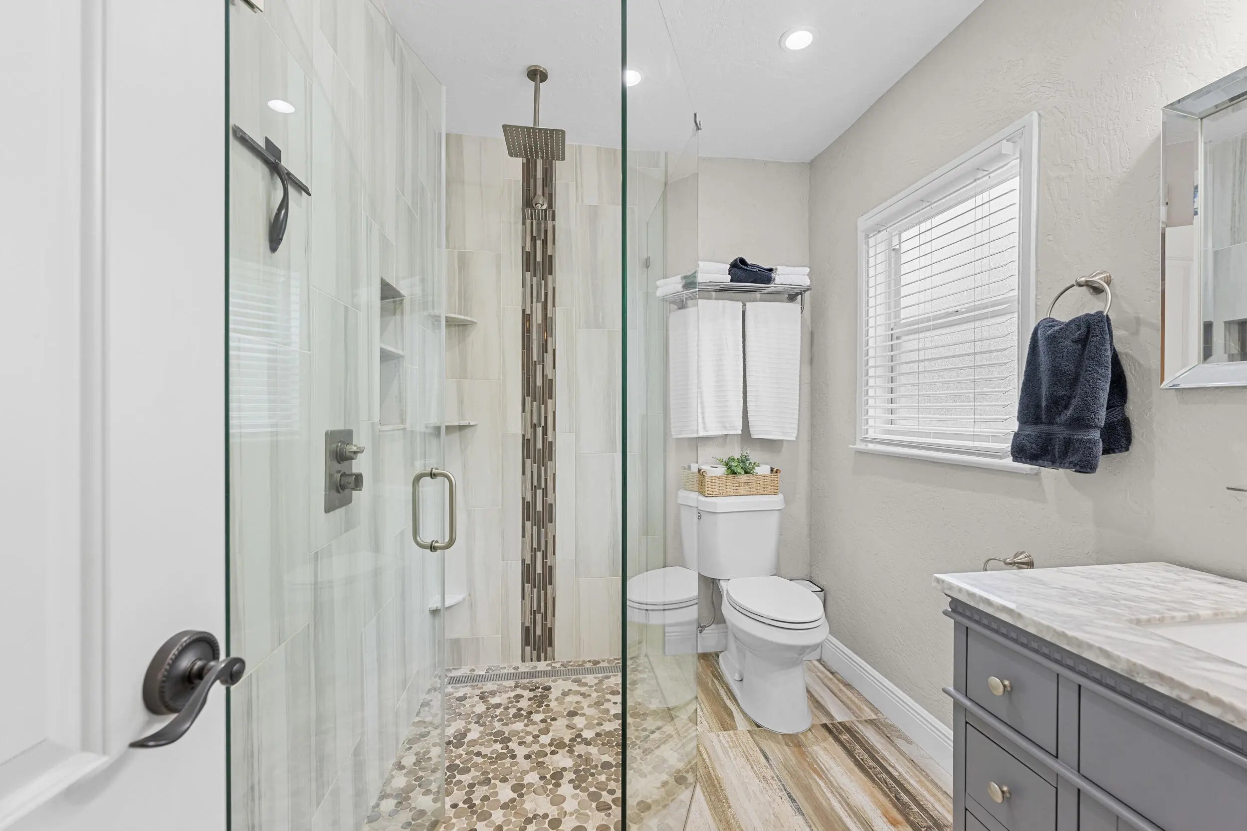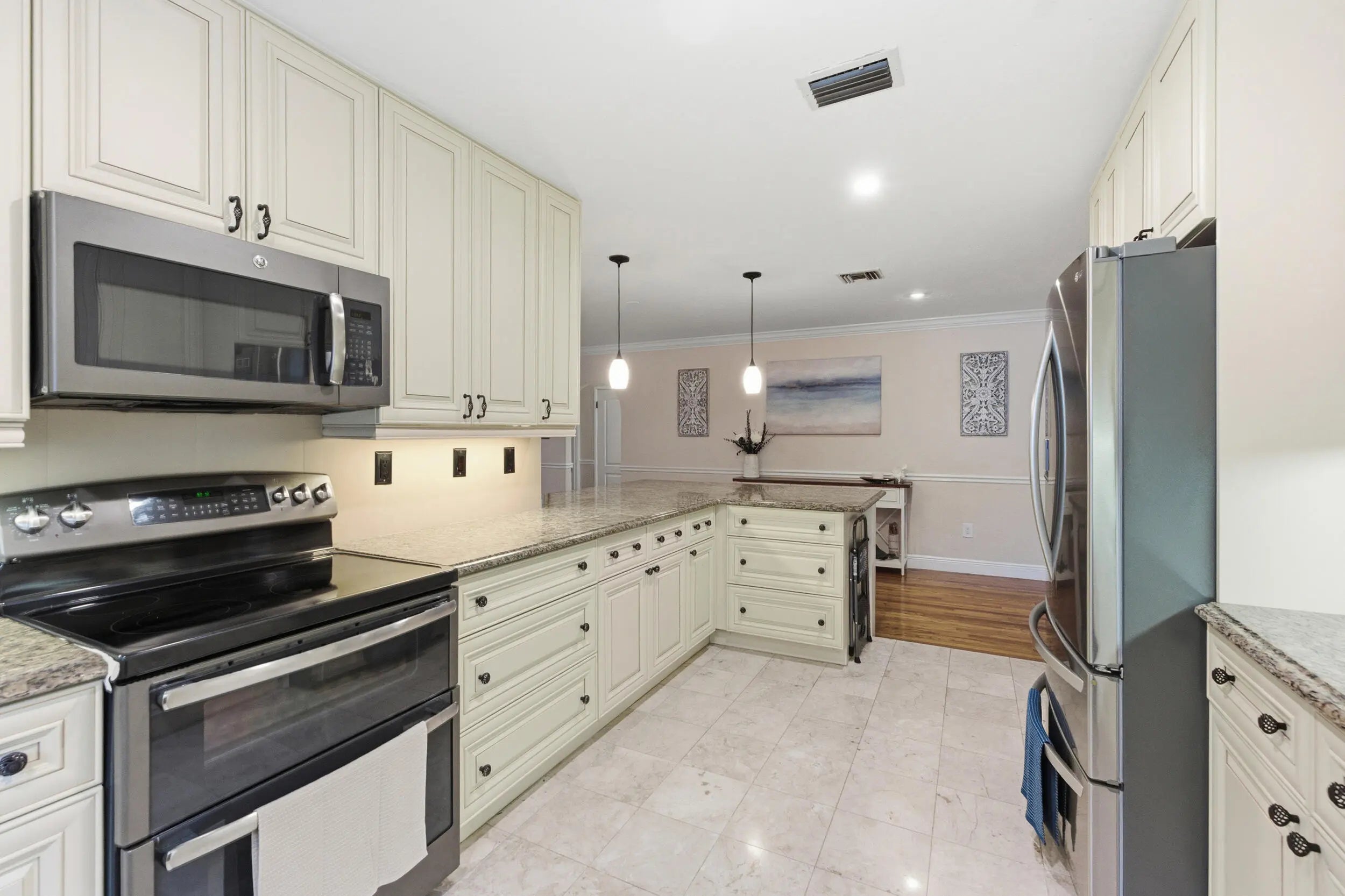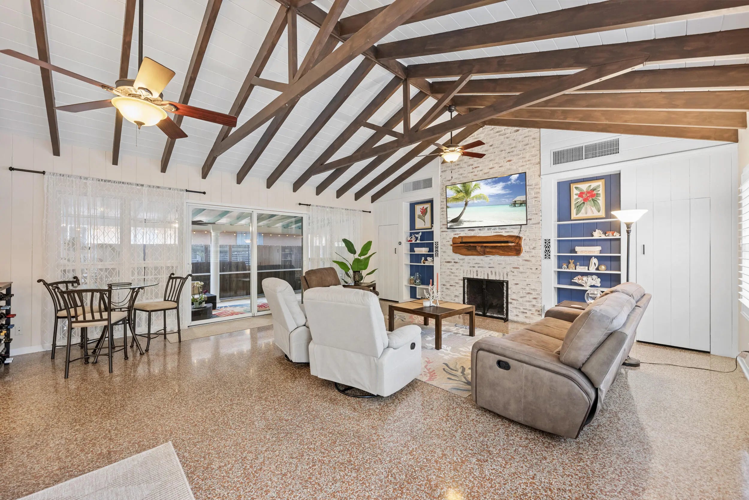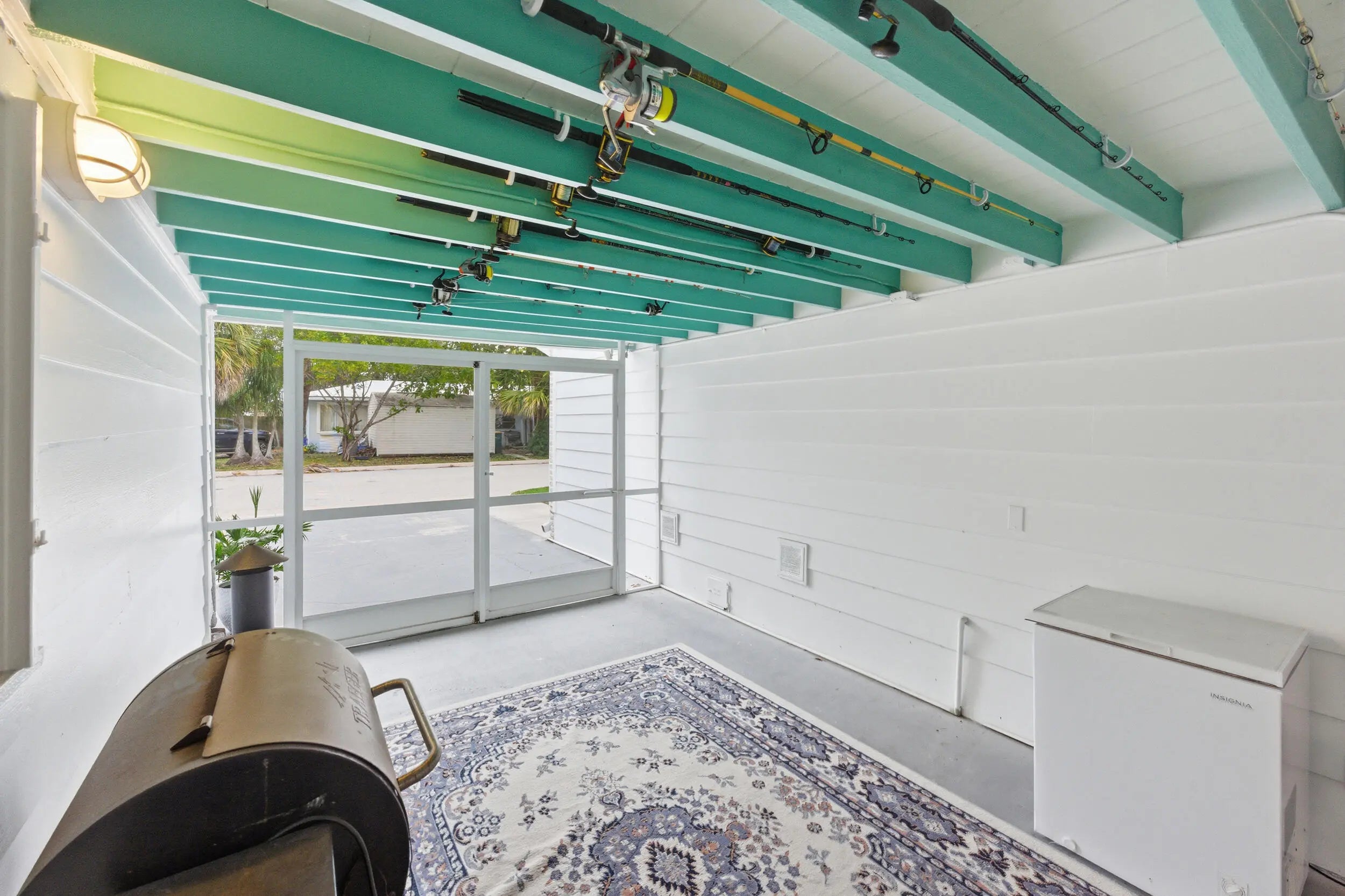 Welcome to this beautifully updated slice of Florida charm, perfectly positioned on a corner lot in the highly sought-after Parrot Cove neighborhood of East Lake Worth. This three-bedroom, two-bathroom home with a detached one-car garage offers the ideal blend of timeless character and modern upgrades. Parrot Cove is celebrated for its strong sense of community, with residents enjoying block parties, New Year's celebrations, pool parties, and an annual home and garden tour, all just steps from the Intracoastal. This property truly offers the best of charm, thoughtful improvements, and neighborhood living in one of the area's most desirable communities. Throughout the home, thoughtful attention to detail is evident in the many quality upgrades, including updated flooring, elegant plantation shutters, a renovated kitchen and bathrooms with modern finishes, impact-resistant windows and sliding doors, a tankless water heater, a roof installed in 2016, and enhanced outdoor living spaces designed for both relaxation and entertaining. Curb appeal is immediate, with a Somay sealed tile roof and brick pavers guiding you to an inviting entryway framed by classic pillars and brick garden beds. Inside, the oversized foyer provides flexible space that can easily function as a home office or sitting area and features decorative wood ceilings, wood accent walls, brick details, and beautifully laid tile flooring. The remodeled kitchen serves as the heart of the home, offering generous space and stylish finishes. It features hardwood floors, solid wood shaker cabinetry, granite countertops, and a large peninsula with bar-top seating highlighted by LED pendant lighting. Additional features include an oversized dual sink with disposal, updated hardware, a dedicated tankless water heater for the sink, and abundant natural light pouring in through impact glass windows. The primary suite provides a peaceful retreat, complete with solid wood flooring, updated trim and fixtures, and a spacious walk-in closet with custom built-ins. The primary bathroom has been tastefully updated with rustic wood-look tile flooring, a solid wood vanity with granite countertop, updated hardware and fixtures, and an impressive floor-to-ceiling tiled walk-in shower with elegant tile inlay, niche shelving, and frameless glass doors. Both secondary bedrooms feature solid wood flooring, updated fixtures, plantation shutters, impact windows, generous closet space, and ample natural light. The secondary bathroom is also updated and includes designer tile flooring, a solid wood vanity with porcelain sink, modern hardware and fixtures, and an oversized shower-tub combination finished with floor-to-ceiling subway tile, niche shelving, and updated hardware. The living room is spacious and full of personality, featuring terrazzo flooring, vaulted cathedral ceilings, updated fixtures, exposed solid wood beams, built-in shelving, and a striking brick accent wall. Large impact sliders open to the private covered and screened patio, creating an effortless indoor-outdoor flow. The screened and covered patio feels expansive and inviting, designed with decorative wood beams and pillars, whitewashed brick walls, and plenty of room to relax or entertain guests. The location is equally impressive, just minutes from Lake Worth Beach, Lake Worth Beach Golf Club, Bryant Park, the boat ramp, and the vibrant dining, shopping, and entertainment of Downtown Lake Worth. Centrally located near PBI Airport, Tri-Rail, Brightline, Downtown West Palm Beach, and I-95, this home offers outstanding convenience and lifestyle