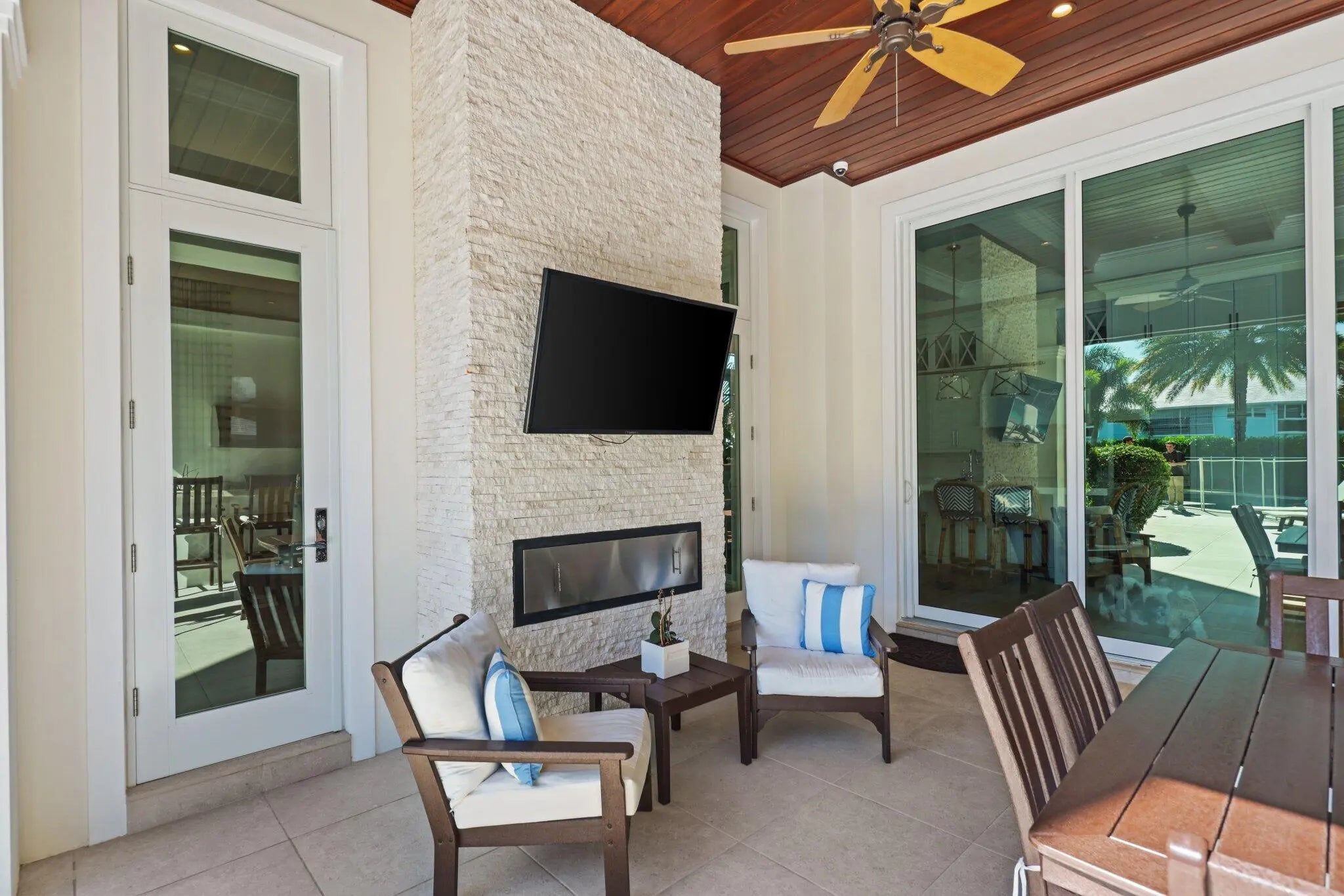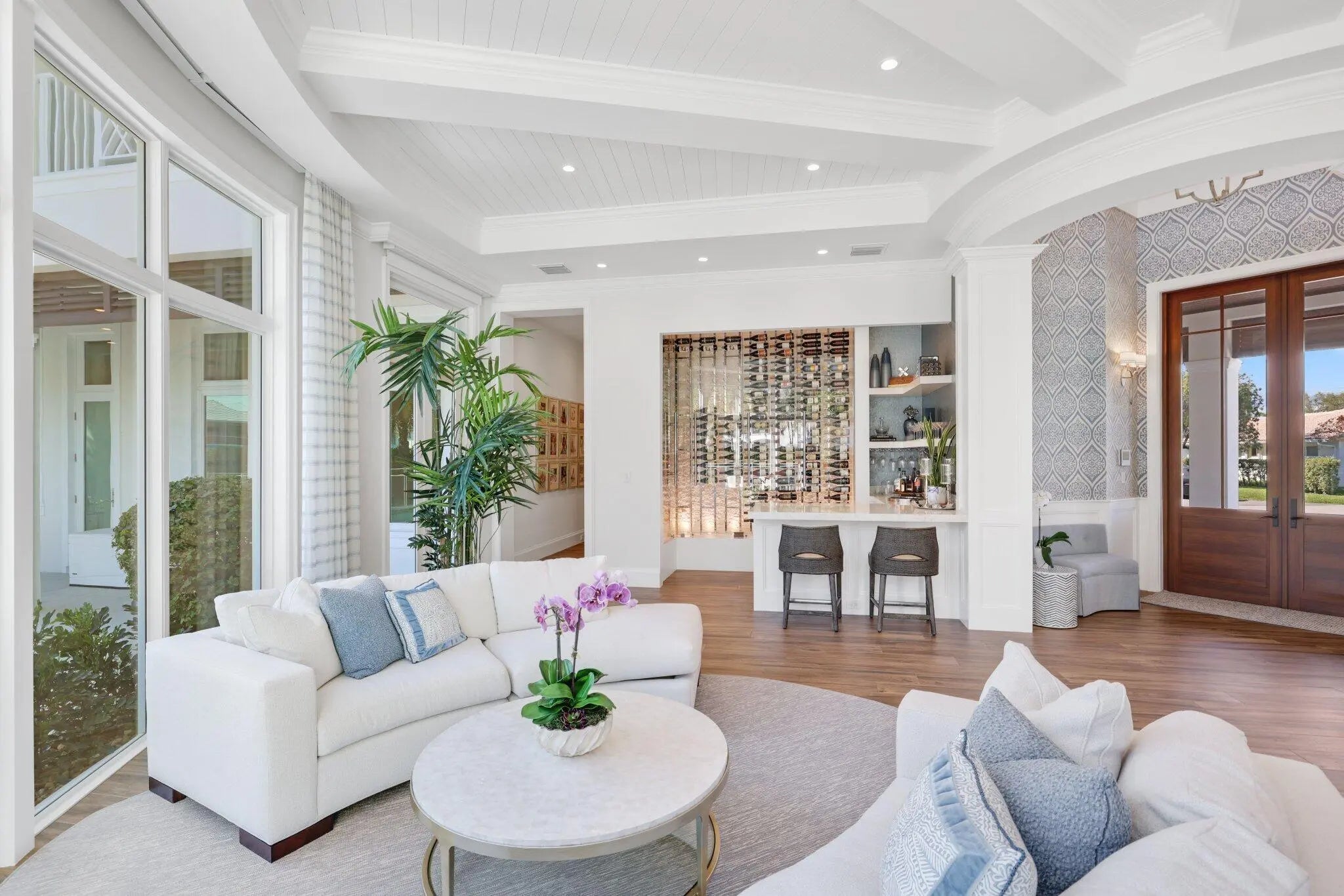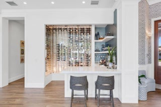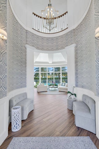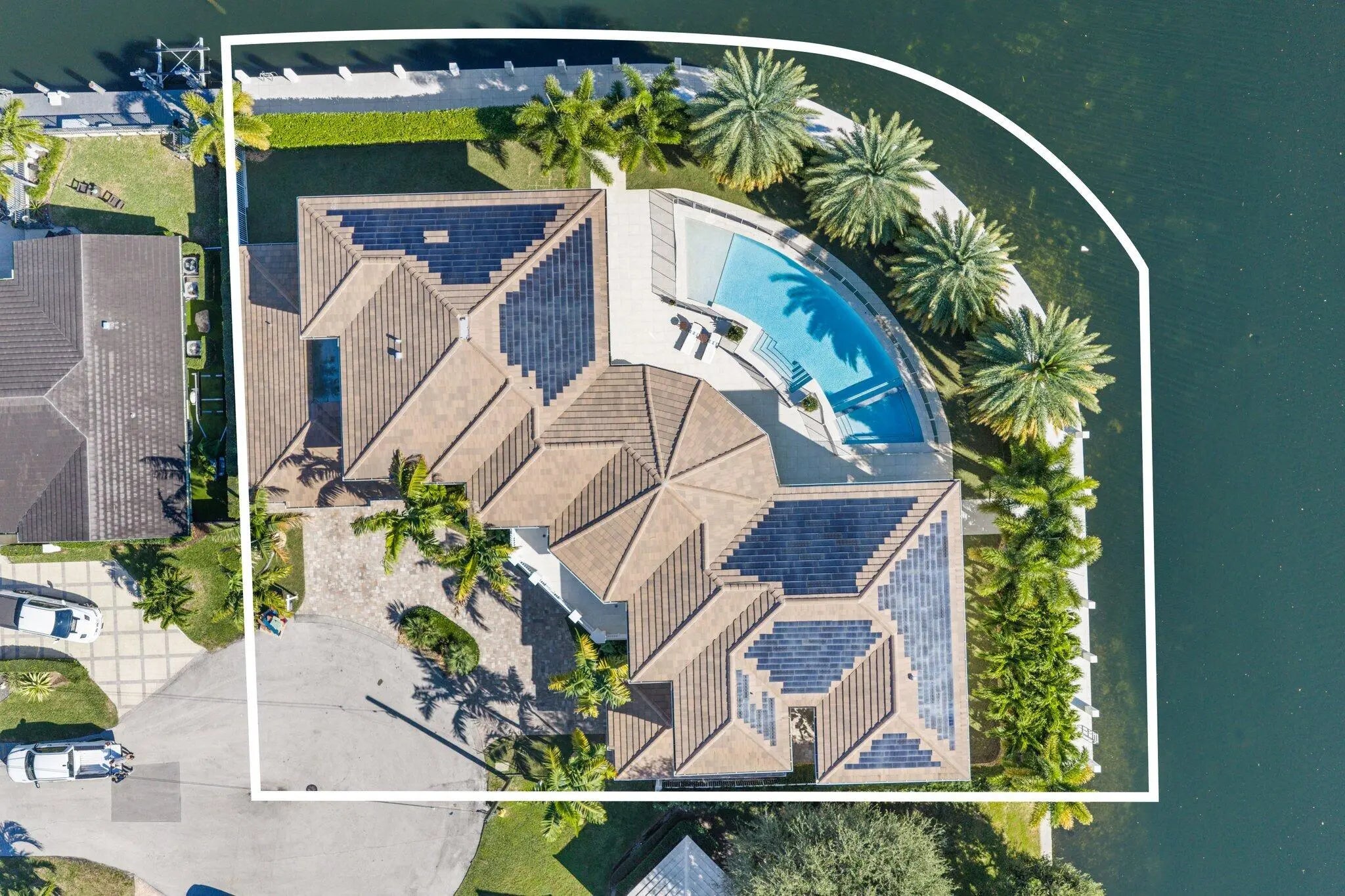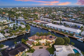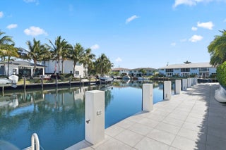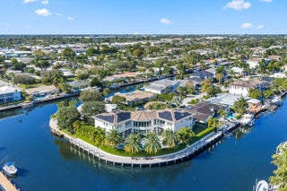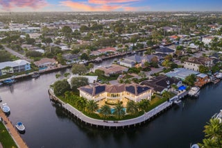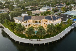Located on a 240-foot southeast-facing waterfront point lot on the South Grand Canal, this Hamptons-inspired estate offers timeless design, modern technology, and exceptional indoor-outdoor living. Built in 2020 by Zahn Builders of Lighthouse Point, the home features refined millwork, coffered ceilings, soaring ceiling heights, and expansive windows that fill the interiors with natural light. The grand foyer opens to formal living and dining spaces with a 500+ bottle refrigerated wine bar, ideal for entertaining. Walls of glass lead to a resort-style outdoor kitchen, private pool framed by lush hedging, orchid sanctuary, courtyard, and fenced areas perfect for pets and children. The thoughtfully designed layout includes a first-floor secondary primary suite, private office, and two powder rooms. Upstairs are five en-suite bedrooms with walk-in closets, including a luxurious primary suite, plus an upstairs club room with bar, expansive loggia, oversized pantry, and three-car garage. A fully integrated smart-home system features Lutron lighting and shades, enterprise-grade whole-home Wi-Fi, security cameras, smart locks, thermostats, and Apple HomeKit with Siri control. An architecturally integrated solar tile roof with a 22.5 kW system and three Tesla Powerwalls provides whole-home backup, off-grid capability, and netmetering for reduced utility costs. A rare opportunity to own a technologically advanced waterfront estate on one of the largest single-family lots in Lighthouse Point.