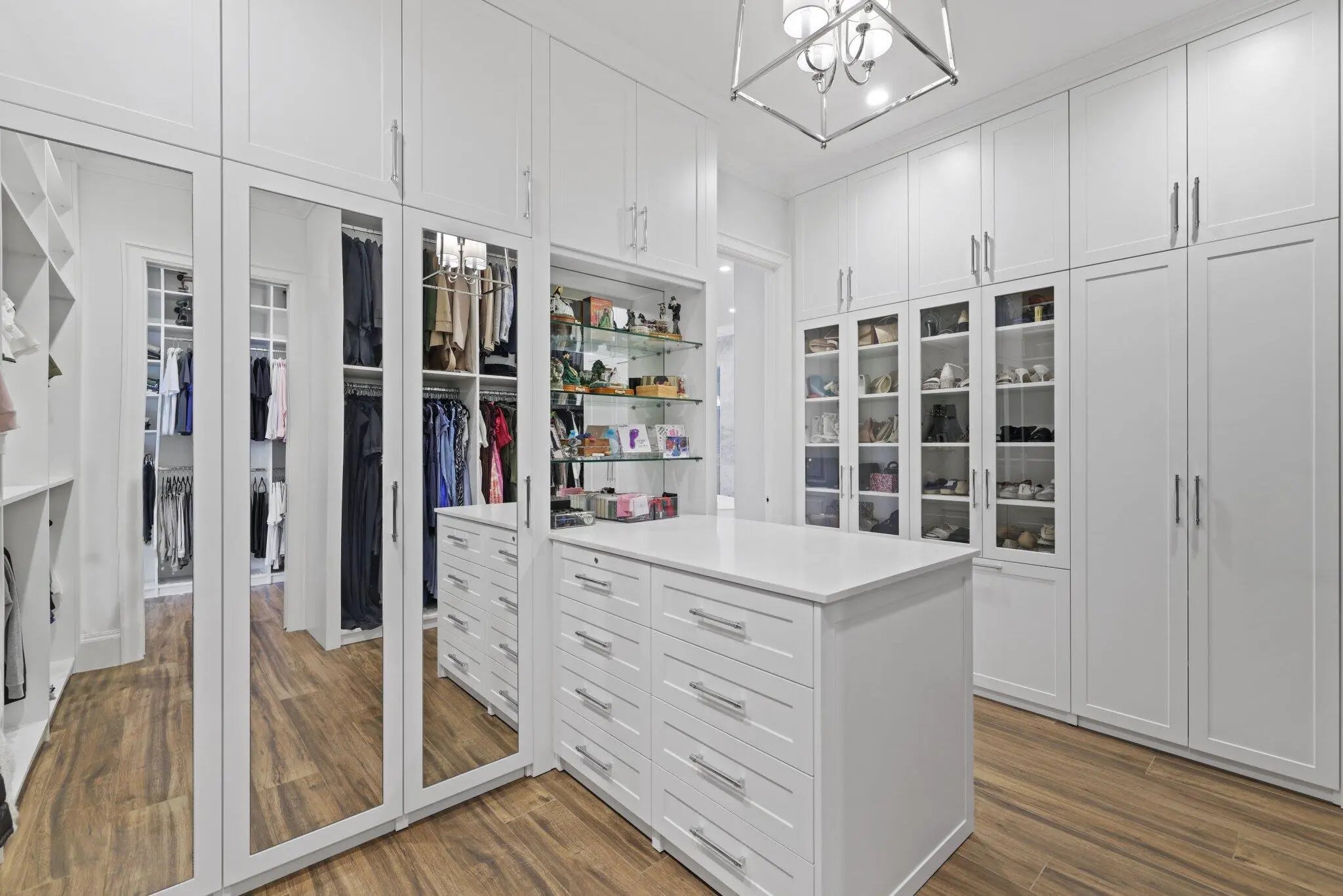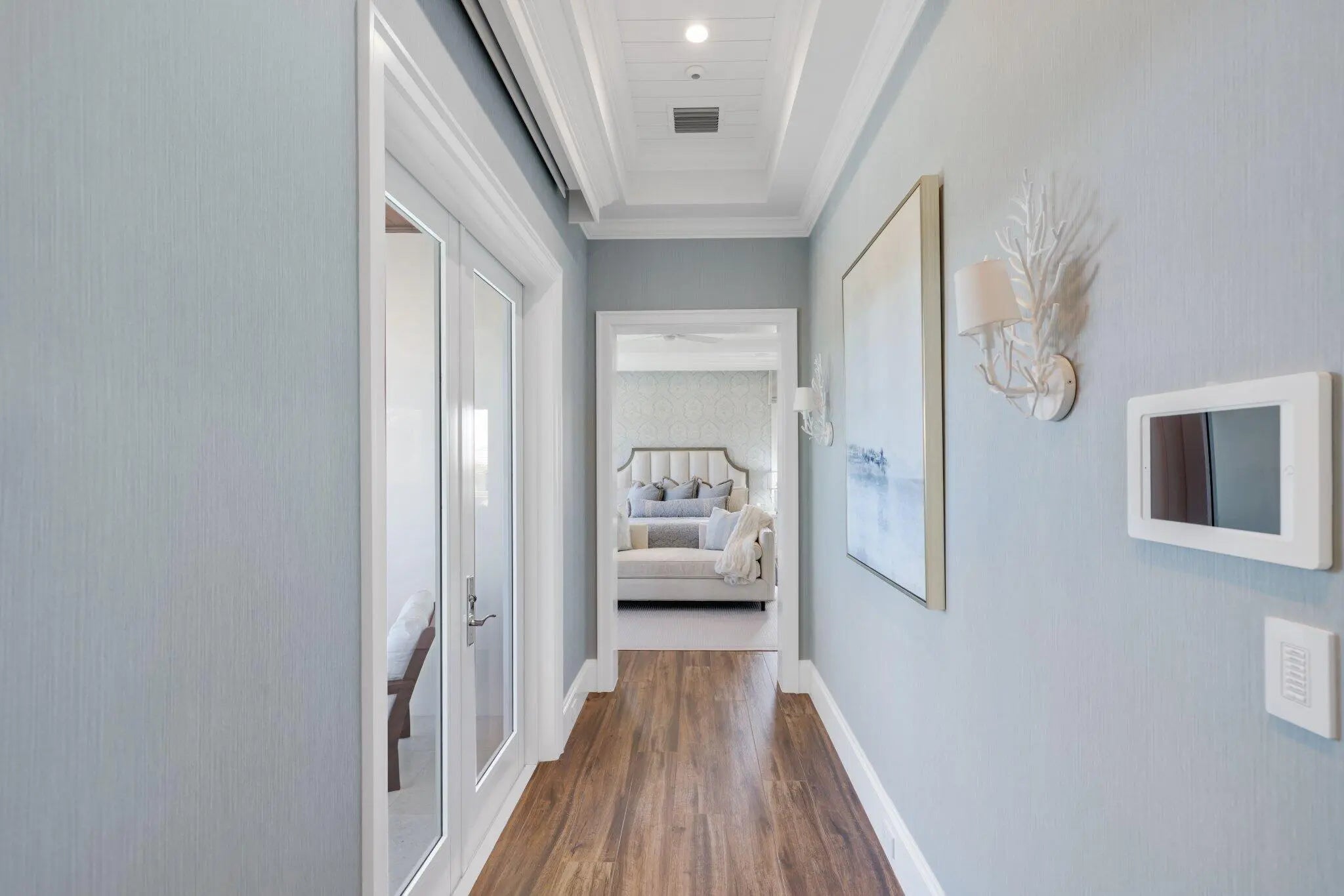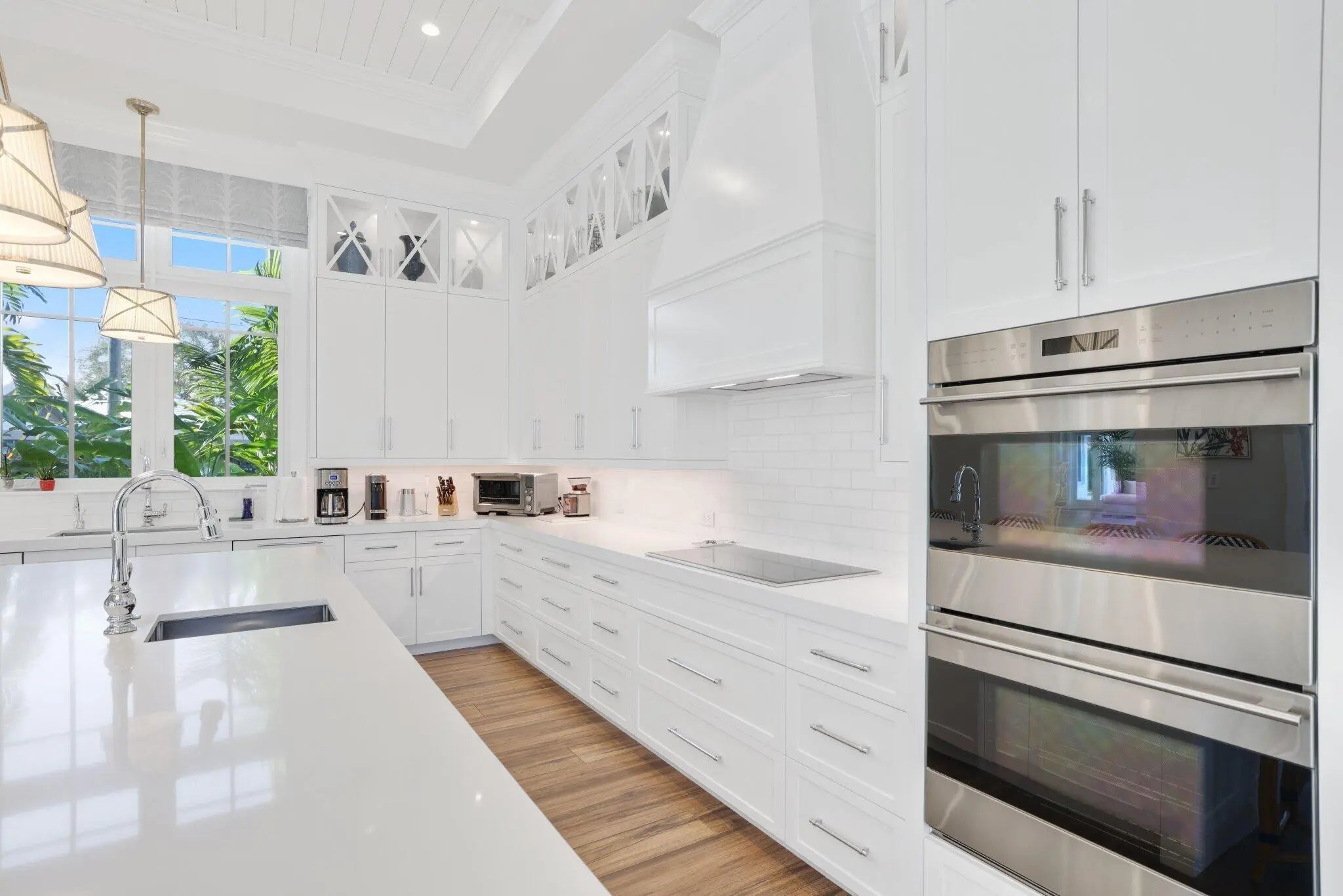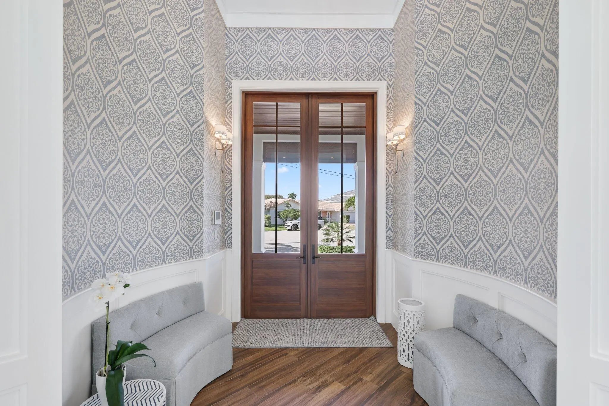 Located on a 240-foot southeast-facing waterfront point lot on the South Grand Canal, this Hamptons-inspired estate offers timeless design, modern technology, and exceptional indoor-outdoor living. Built in 2020 by Zahn Builders of Lighthouse Point, the home features refined millwork, coffered ceilings, soaring ceiling heights, and expansive windows that fill the interiors with natural light. The grand foyer opens to formal living and dining spaces with a 500+ bottle refrigerated wine bar, ideal for entertaining. Walls of glass lead to a resort-style outdoor kitchen, private pool framed by lush hedging, orchid sanctuary, courtyard, and fenced areas perfect for pets and children. The thoughtfully designed layout includes a first-floor secondary primary suite, private office, and two powder rooms. Upstairs are five en-suite bedrooms with walk-in closets, including a luxurious primary suite, plus an upstairs club room with bar, expansive loggia, oversized pantry, and three-car garage. A fully integrated smart-home system features Lutron lighting and shades, enterprise-grade whole-home Wi-Fi, security cameras, smart locks, thermostats, and Apple HomeKit with Siri control. An architecturally integrated solar tile roof with a 22.5 kW system and three Tesla Powerwalls provides whole-home backup, off-grid capability, and netmetering for reduced utility costs. A rare opportunity to own a technologically advanced waterfront estate on one of the largest single-family lots in Lighthouse Point.