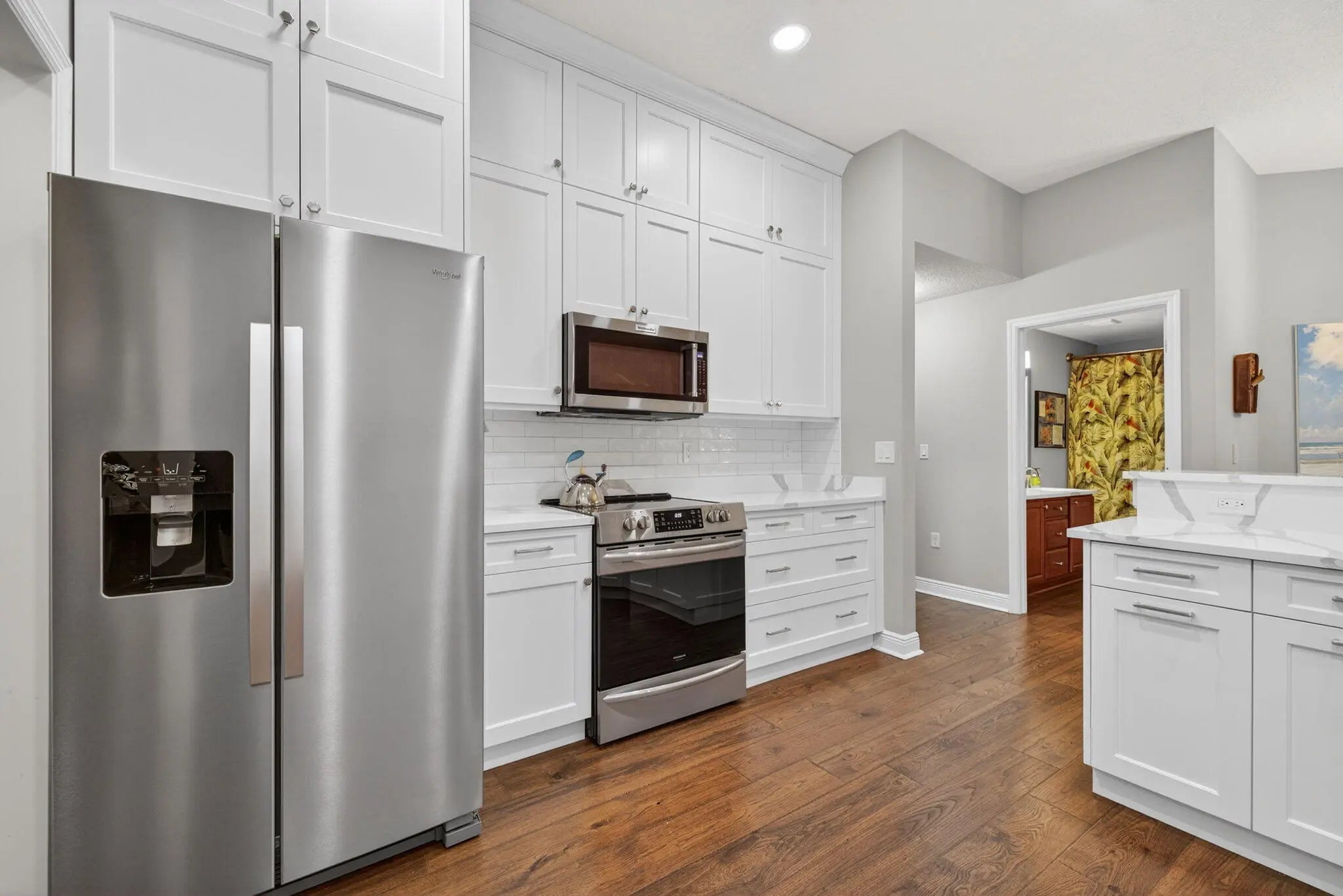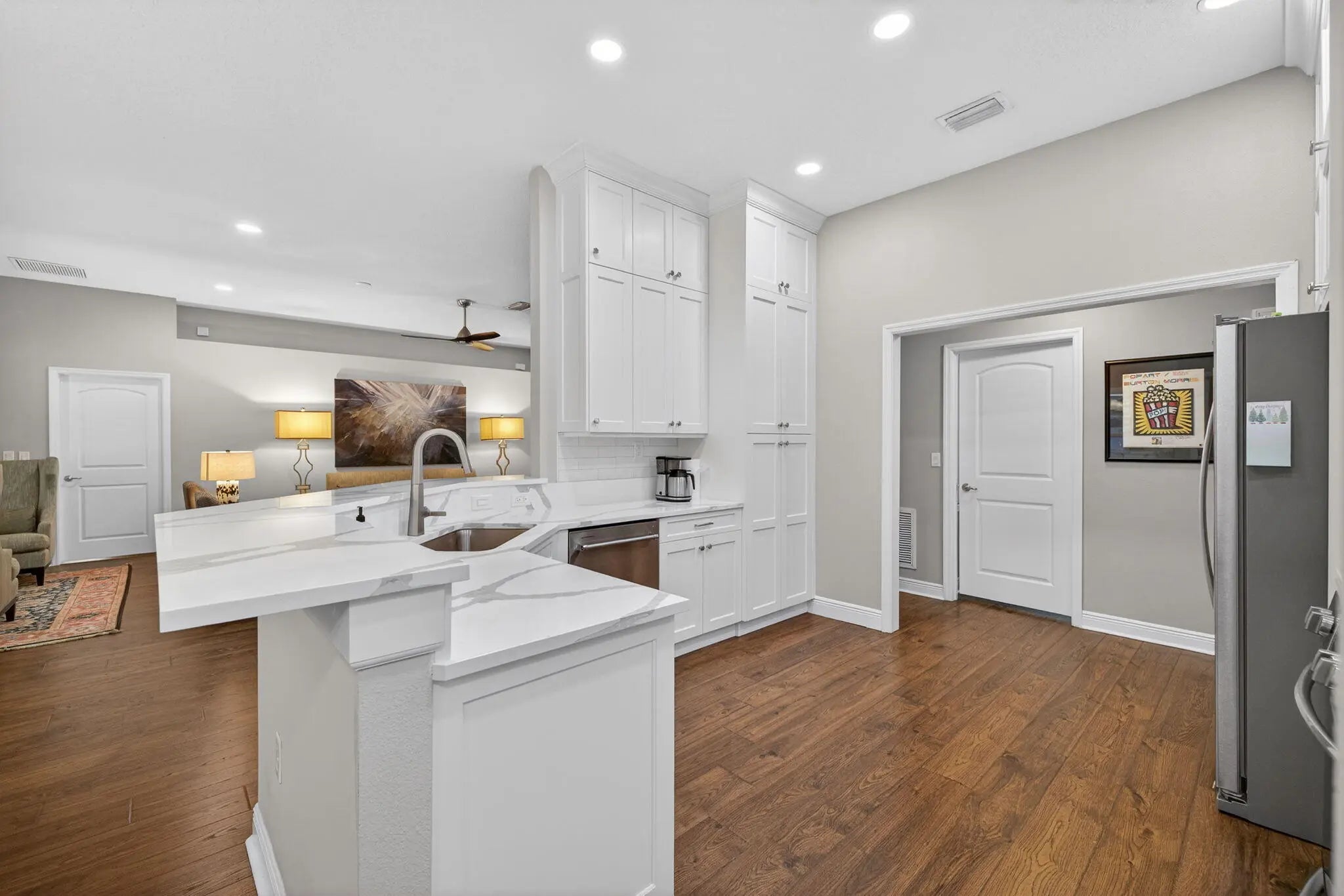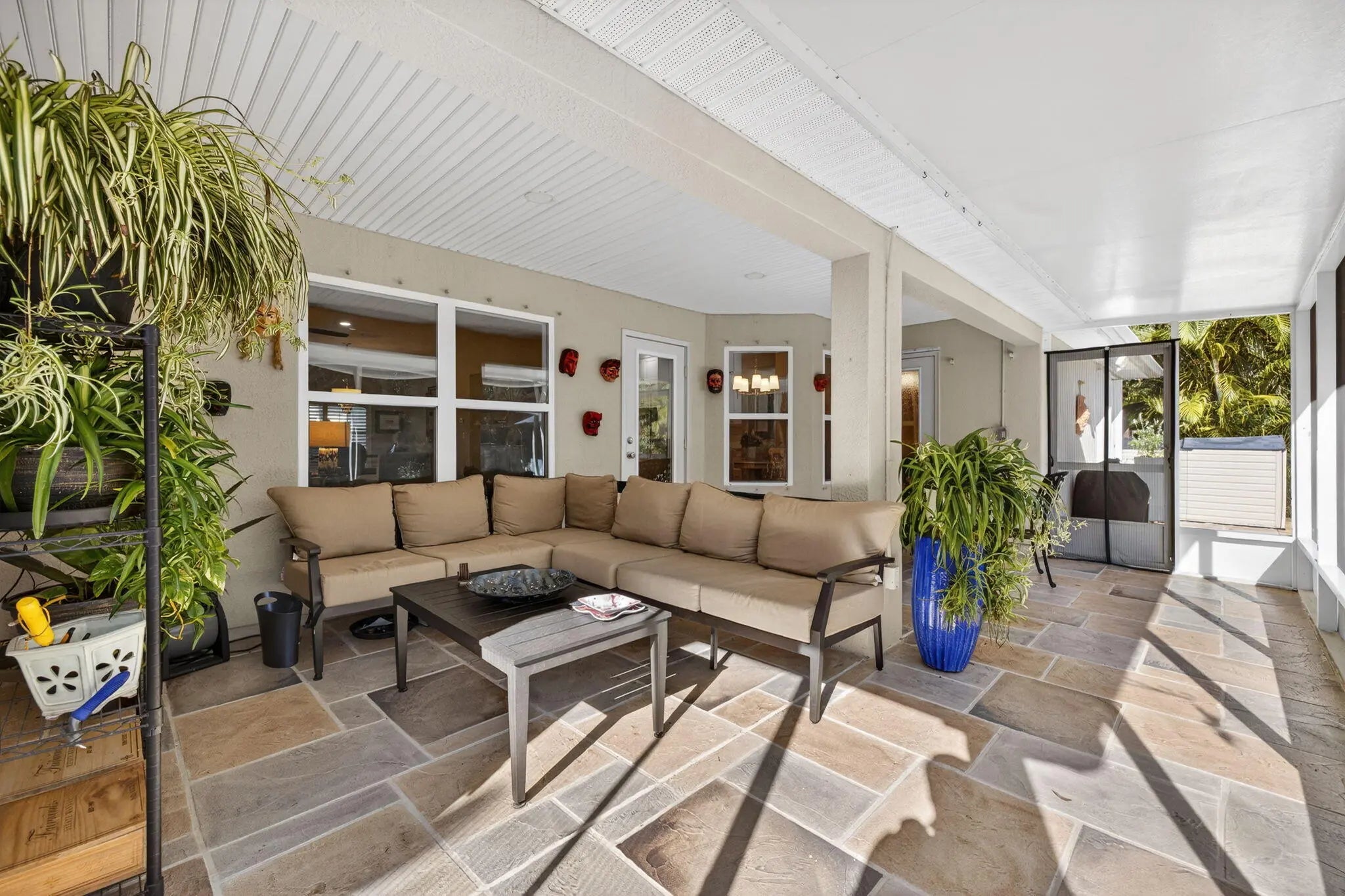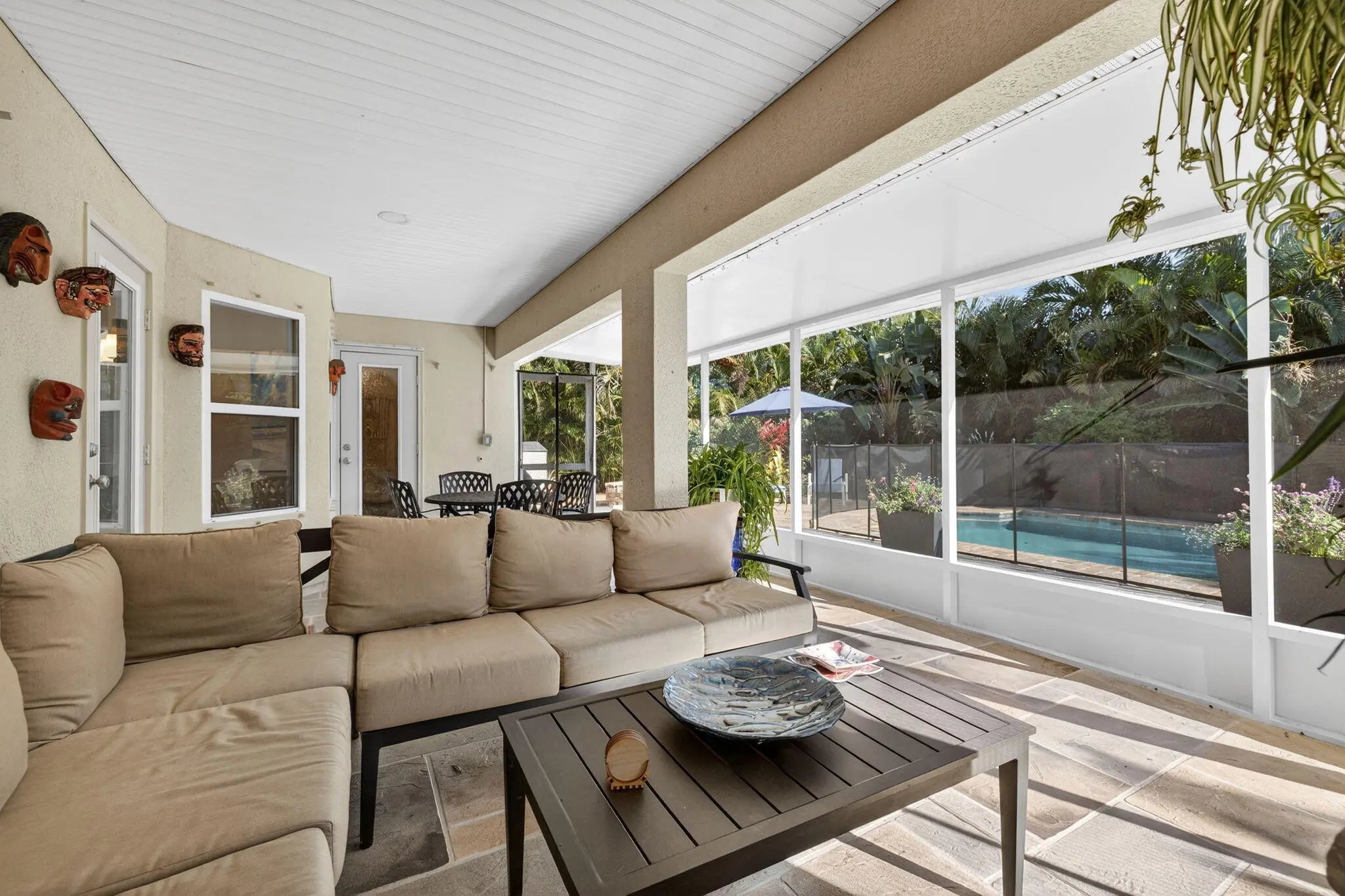 Tastefully updated 4-bedroom plus den, 3-bath, 3-car garage pool home located just minutes from Tradition and I-95. This spacious, open floor plan features new luxury high-end laminate flooring throughout. The beautifully remodeled eat-in kitchen offers quartz countertops, breakfast bar, pantry, and newer appliances. The primary suite includes two walk-in closets and a fully remodeled bath with oversized shower, dual vanities, and bidet. Guest bathrooms, including the cabana bath, have also been remodeled. Sliding glass doors from the living room open to a private tropical oasis featuring a pool, extended paver patio, fire pit, fencing, and lush landscaping for maximum privacy. Recent upgrades include a new A/C system and water heater (2025). Conveniently located near shopping, dining, 95
