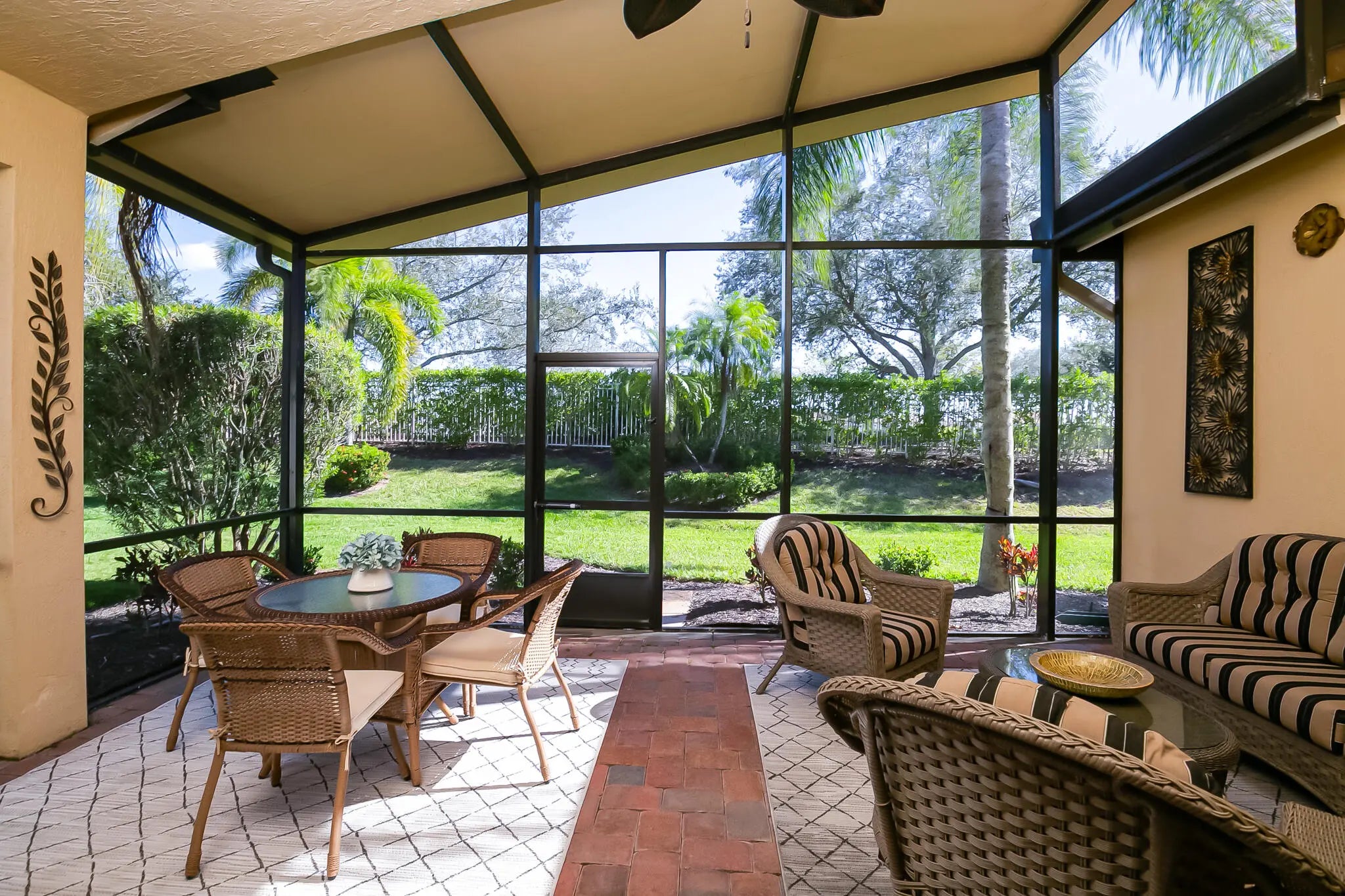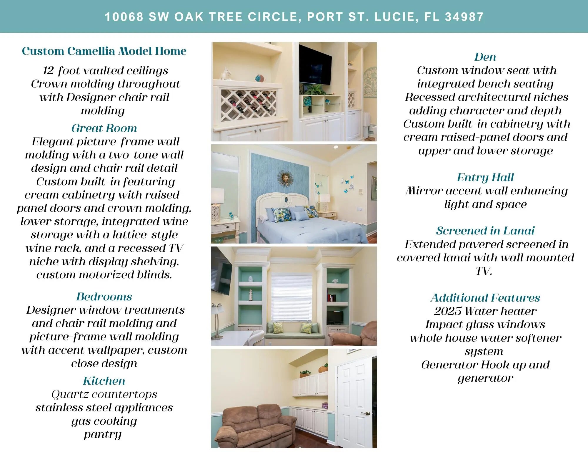 CABANA POOL JUST ACROSS THE STREET. This exceptional 2-bedroom plus den, 2-bath former builder model Camellia lives LIKE YOU HAVE YOUR OWN PRIVATE POOL WITHOUT THE COST. Located in the desirable 55+ active community of Vitalia at Tradition, where refined design meets resort-style living in one of Tradition's most sought-after neighborhoods, this home offers the rare feeling of having a private pool just across the street, perfect for enjoying a quiet swim or relaxing poolside without the upkeep. Inside, the home showcases 12-foot vaulted ceilings, crown molding throughout, and elegant picture-frame wall molding, hallmarks of a true model. The kitchen is thoughtfully designed with quartz countertops, stainless steel appliances, gas cooking, a pantry, and a breakfast nook, ideal for both daily living and entertaining. The great room features a custom built-in entertainment system and overlooks the spacious screened patio, creating a comfortable and inviting gathering space. The owner's suite provides a private retreat with two walk-in closets with custom built-ins and a spacious double vanity bath. A versatile den includes a charming window bench, shelving, and additional built-in storage, making it ideal for a home office or creative space. Impact glass and tasteful window treatments throughout add comfort, security, and style. Enjoy Florida living year-round with a welcoming screened front porch and an extended screened, pavered, covered lanai with TV, offering the perfect space to relax or host guests in any season. Additional features include a 2-car garage, generator hookup, whole-home water filtration system, new water heater (2025), and fresh exterior paint (2025). Vitalia delivers a true resort lifestyle with a 24,000 sq. ft. clubhouse, resort-style pool and spa, state-of-the-art fitness center, aerobics studio, tennis, pickleball, and bocce courts, plus a vibrant calendar of clubs and social events. Residents enjoy maintenance-free living with lawn care, BlueStream cable and internet, a manned gate, and access to all resort amenities included in the monthly HOA fee. Ideally located in Tradition near shopping, dining, medical facilities, and I-95, this home offers luxury, convenience, and the elevated 55+ lifestyle Florida is known for.