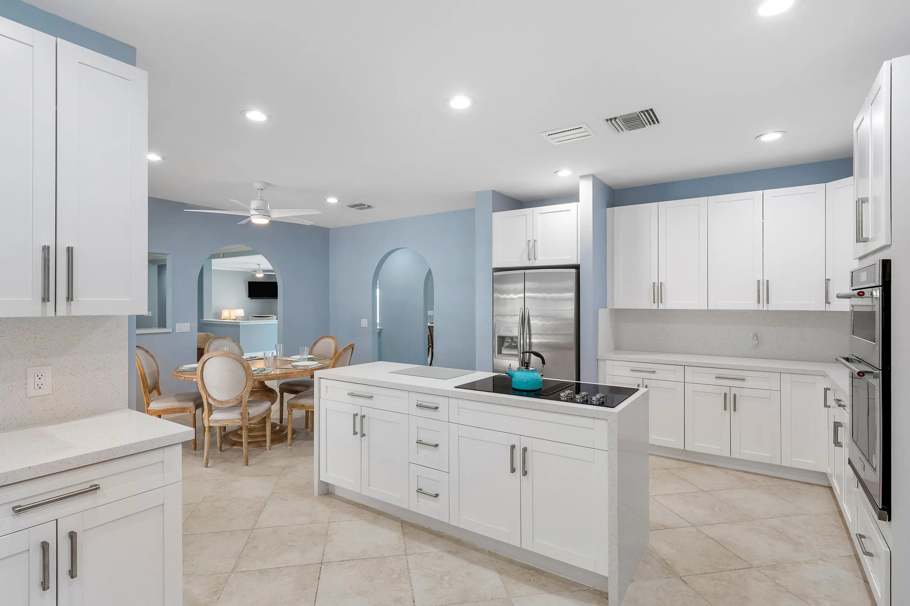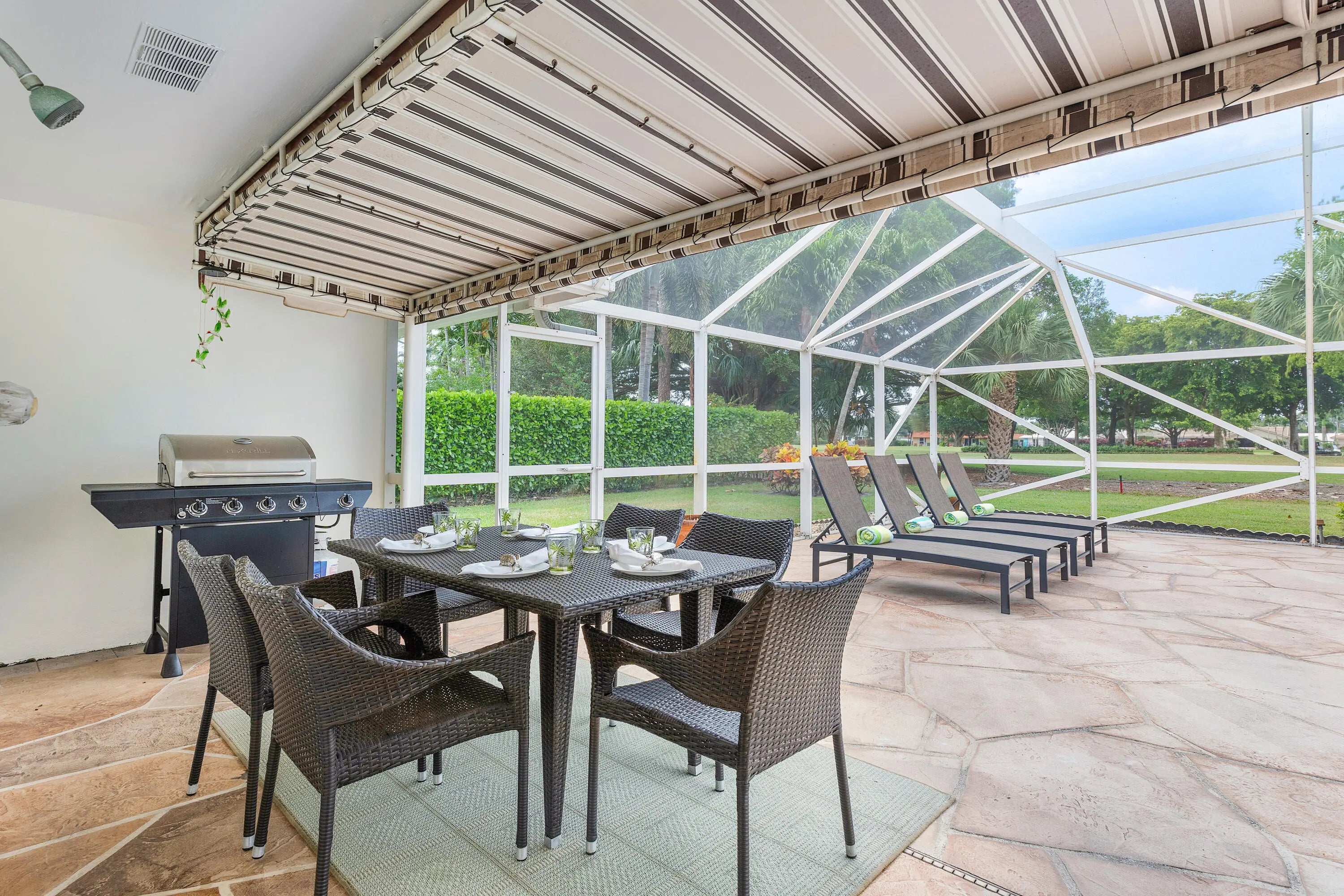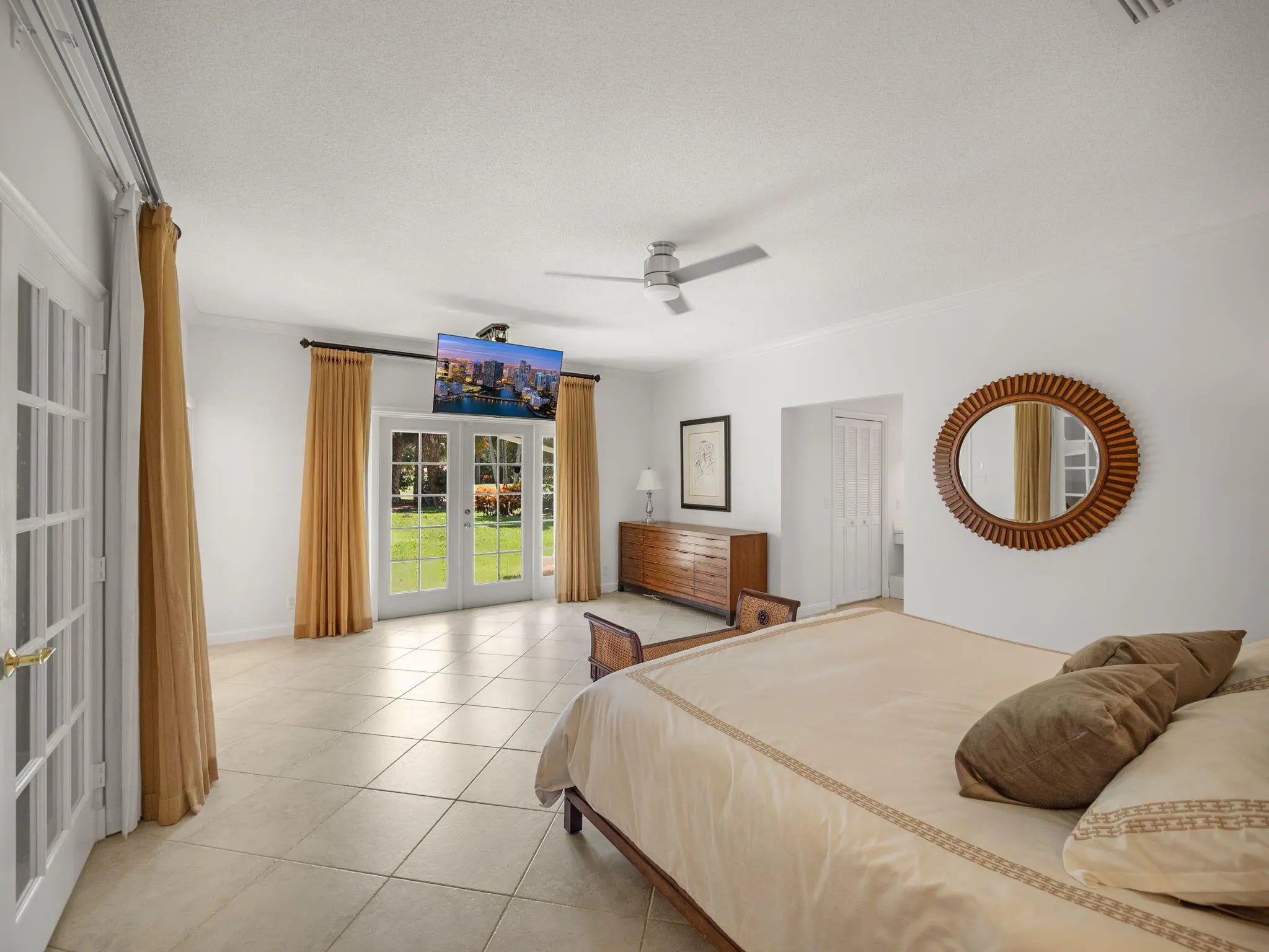 Discover comfortable luxury in this expansive single-story residence, ideally positioned on one of Atlantis' premier golf-front streets. Set on an impressive ±0.45-acre lot overlooking the Atlantis Country Club, this thoughtfully designed home offers 4 bedrooms plus a dedicated office or flex space, and 4.5 bathrooms. A desirable split-bedroom floor plan awaits providing privacy and functionality, with each bedroom featuring its own ensuite bath. The primary suite is a true retreat, offering a private sitting room ideal for an office, gym, or lounge, along with French doors that frame tranquil pool and golf course views. The suite is complete with a spacious walk-in closet and a well-appointed primary bath featuring a soaking tub, glass-enclosed shower, dual vanities, and bidet. Designed for both everyday living and entertaining, the home features separate living, family, and dining rooms. The living room showcases volume ceilings in the main living room, while the family room offers a warm and inviting ambiance anchored by a gas fireplace. The island kitchen has been updated with crisp white cabinetry and granite countertops, and enjoys picturesque golf course views. Tile flooring runs throughout the home for easy maintenance and a cohesive aesthetic. Outdoors, a generous patio overlooks the fairway, creating an ideal setting for entertaining or relaxing. The screened-in pool and spa provide a private South Florida oasis. Additional highlights include a utility room and an oversized 2.5-car garage with dedicated golf cart entry. Impact windows are installed throughout the home (excluding French doors). A large circular driveway offers ample parking and the roof was replaced in 2010. The home is equipped with dual HVAC systems, and features natural gas is available on the street that is piped into the home. A rare opportunity to own a golf-front estate offering space, privacy, and timeless appeal in the City of Atlantis.