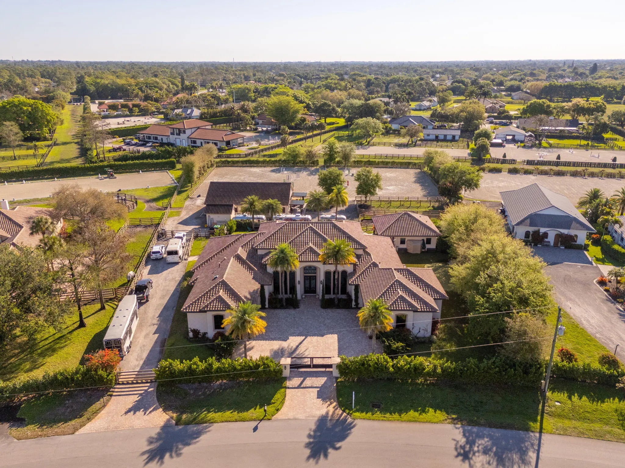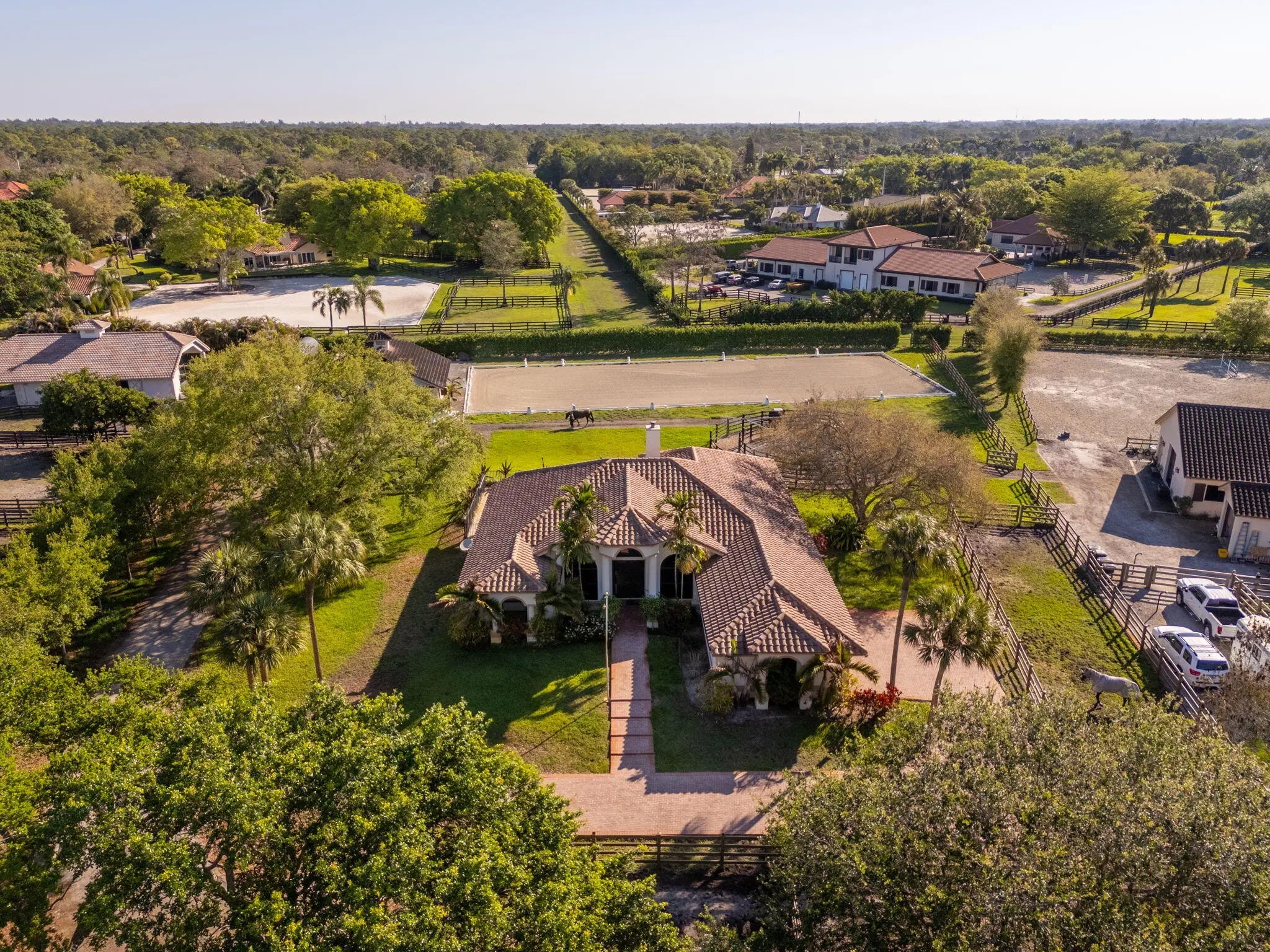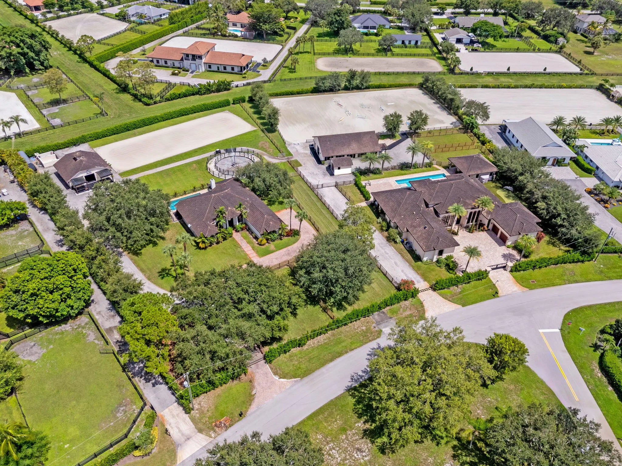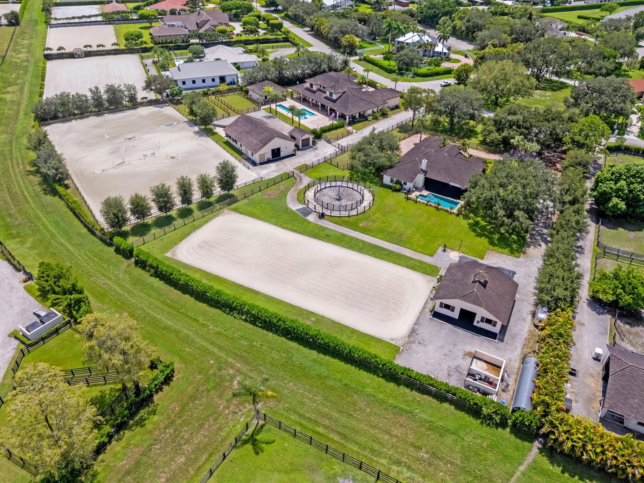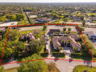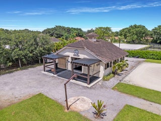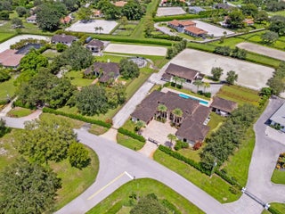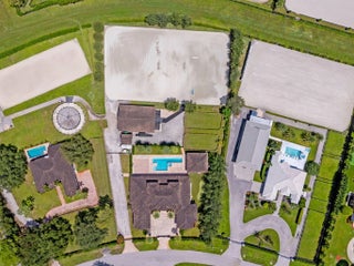 An equestrian dream opportunity: two adjoining properties totaling 3.75 acres with world-class equestrian facilities, including a fully equipped 7-stall barn with tack, feed, laundry, and full bath; a 5-stall barn with tack and feed rooms; multiple wash stalls; two all weather arenas; a hot walker; and five paddocks. Three gated driveways and mature landscaping provide privacy and ease of access, just minutes from the Wellington International, Global Dressage venues, and Wellington's dining and shopping—perfectly timed for show season. The main residence is a modern entertainer's dream with bright, wide-open spaces, soaring ceilings, and nearly floor-to-ceiling windows. The entry leads into a striking, one-of-a-kind wine room. Italian marble and wood flooring flow throughout, complemented by a custom office, formal dining, a gorgeous loft, and a spectacular kitchen with a huge center island, custom cabinetry, and a double pantry. An elegant indoor bar provides a separate space for entertaining. The main-level primary suite is a luxurious retreat with dual spa-inspired bathrooms, a freestanding soaking tub, double vanities, a huge walk-in shower, a sitting area, an oversized closet, and a cabana-style bath. Living areas open to a resort-style pool with summer kitchen, putting green, and cabana bath. A 4-car garage, coffee bar, and state-of-the-art laundry with automated lighting complete the residence. A separate 1-bedroom apartment with a full kitchen and laundry provides private guest or staff accommodations. The second residence offers 3 bedrooms, 2 baths, an office, formal dining, partial hurricane-impact windows, its own pool, a detached studio efficiency, and a 3-car garage. This rare Wellington property blends luxury living with exceptional equestrian amenities, offering an unparalleled lifestyle for entertaining, leisure, and equestrian pursuits.