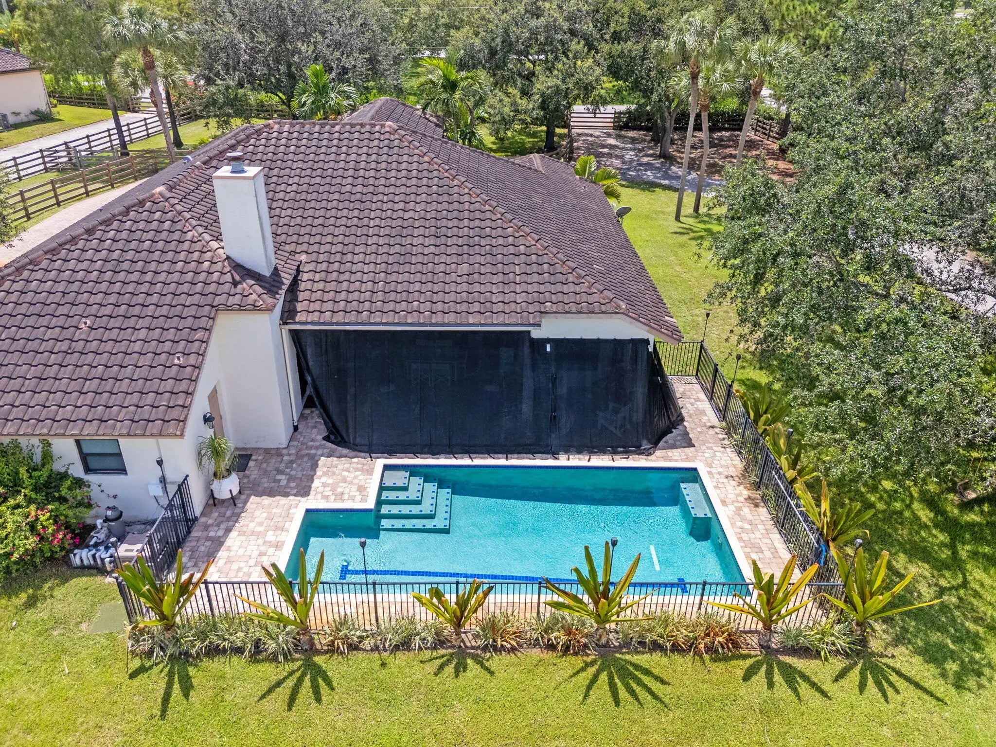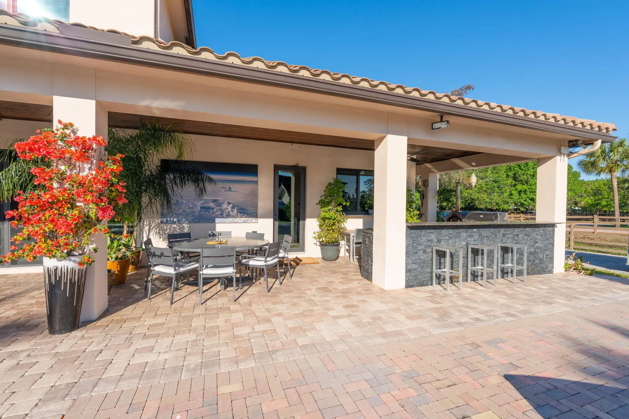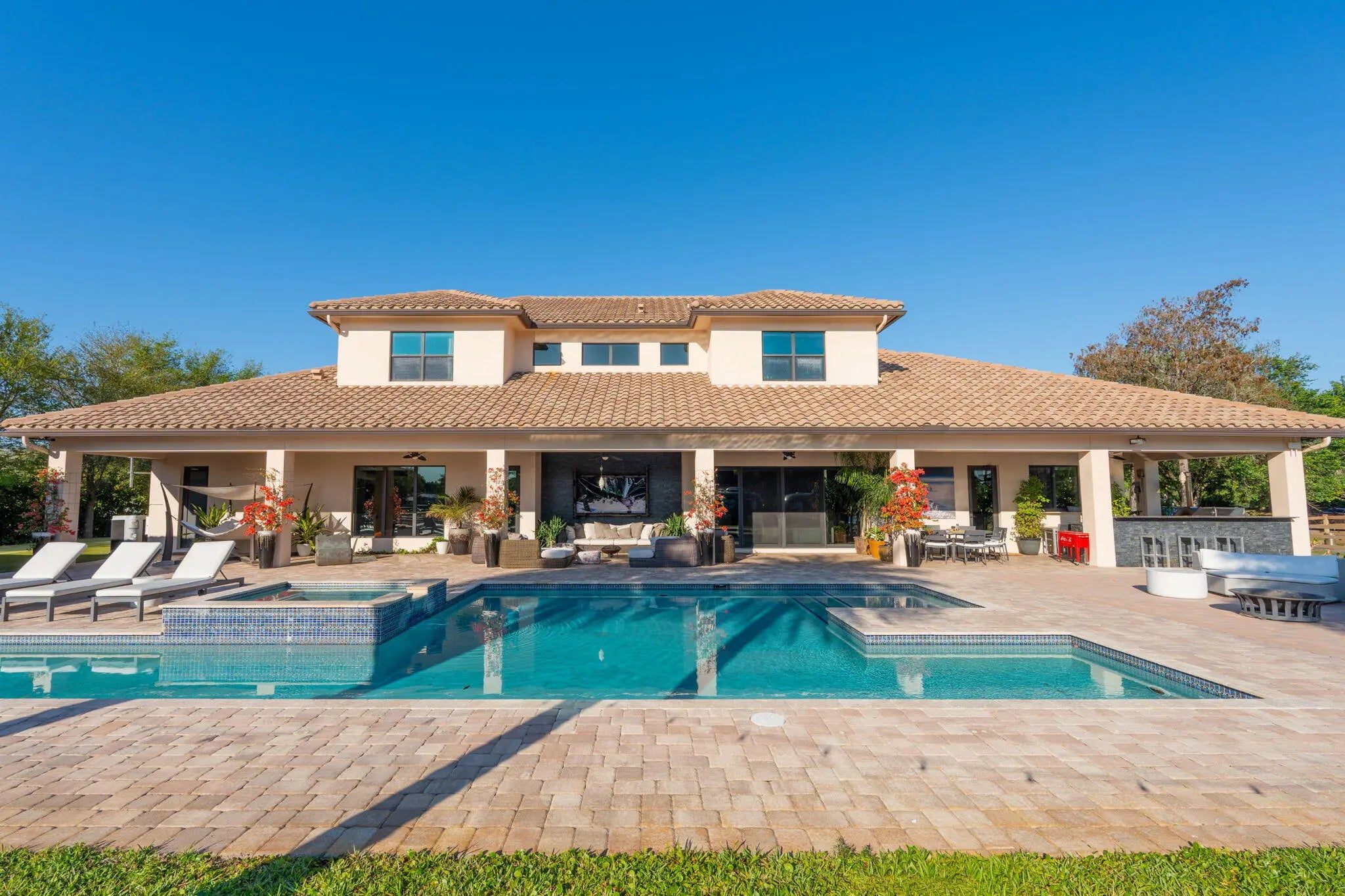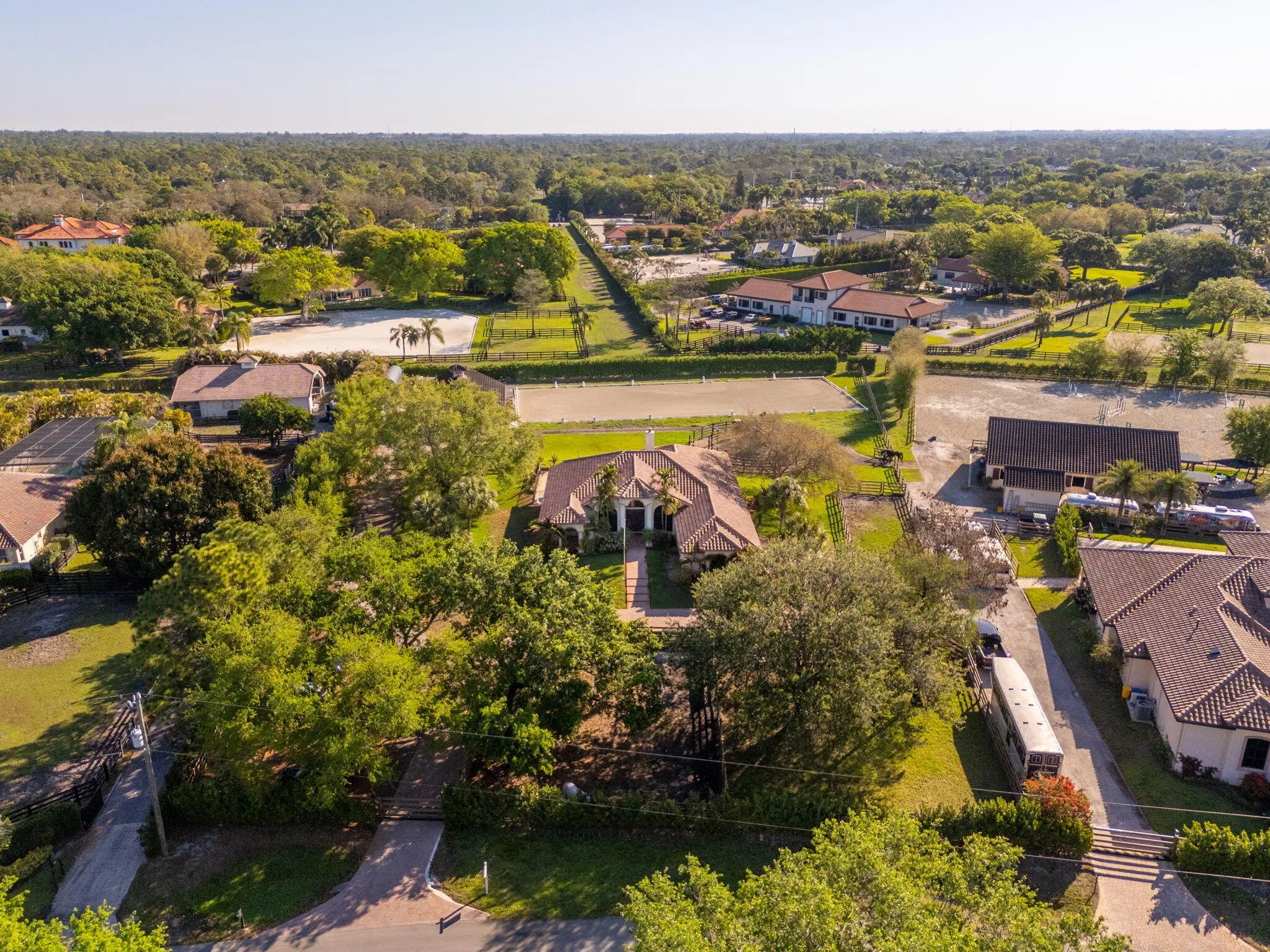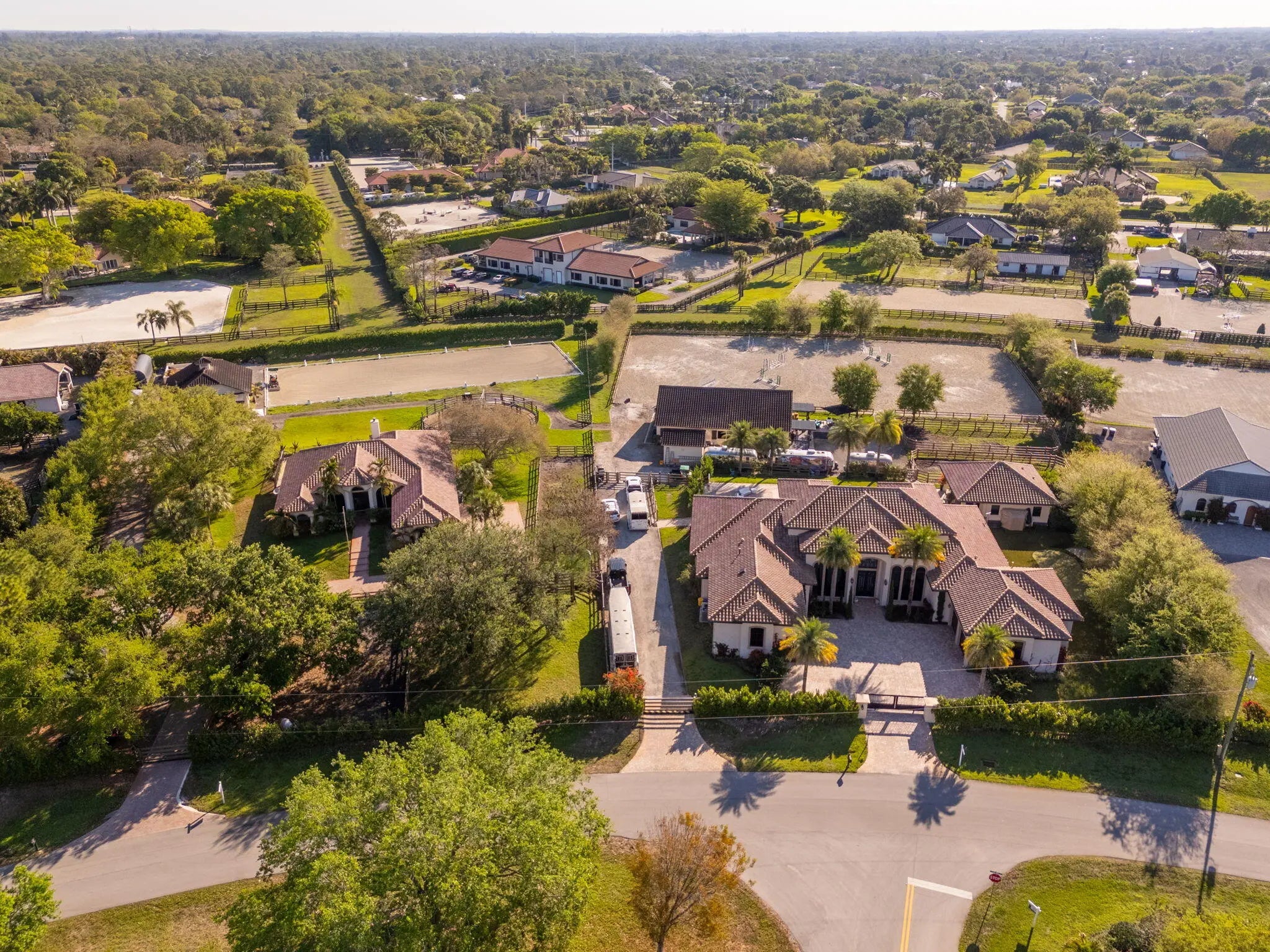 An equestrian dream opportunity: two adjoining properties totaling 3.75 acres with world-class equestrian facilities, including a fully equipped 7-stall barn with tack, feed, laundry, and full bath; a 5-stall barn with tack and feed rooms; multiple wash stalls; two all weather arenas; a hot walker; and five paddocks. Three gated driveways and mature landscaping provide privacy and ease of access, just minutes from the Wellington International, Global Dressage venues, and Wellington's dining and shopping—perfectly timed for show season. The main residence is a modern entertainer's dream with bright, wide-open spaces, soaring ceilings, and nearly floor-to-ceiling windows. The entry leads into a striking, one-of-a-kind wine room. Italian marble and wood flooring flow throughout, complemented by a custom office, formal dining, a gorgeous loft, and a spectacular kitchen with a huge center island, custom cabinetry, and a double pantry. An elegant indoor bar provides a separate space for entertaining. The main-level primary suite is a luxurious retreat with dual spa-inspired bathrooms, a freestanding soaking tub, double vanities, a huge walk-in shower, a sitting area, an oversized closet, and a cabana-style bath. Living areas open to a resort-style pool with summer kitchen, putting green, and cabana bath. A 4-car garage, coffee bar, and state-of-the-art laundry with automated lighting complete the residence. A separate 1-bedroom apartment with a full kitchen and laundry provides private guest or staff accommodations. The second residence offers 3 bedrooms, 2 baths, an office, formal dining, partial hurricane-impact windows, its own pool, a detached studio efficiency, and a 3-car garage. This rare Wellington property blends luxury living with exceptional equestrian amenities, offering an unparalleled lifestyle for entertaining, leisure, and equestrian pursuits.