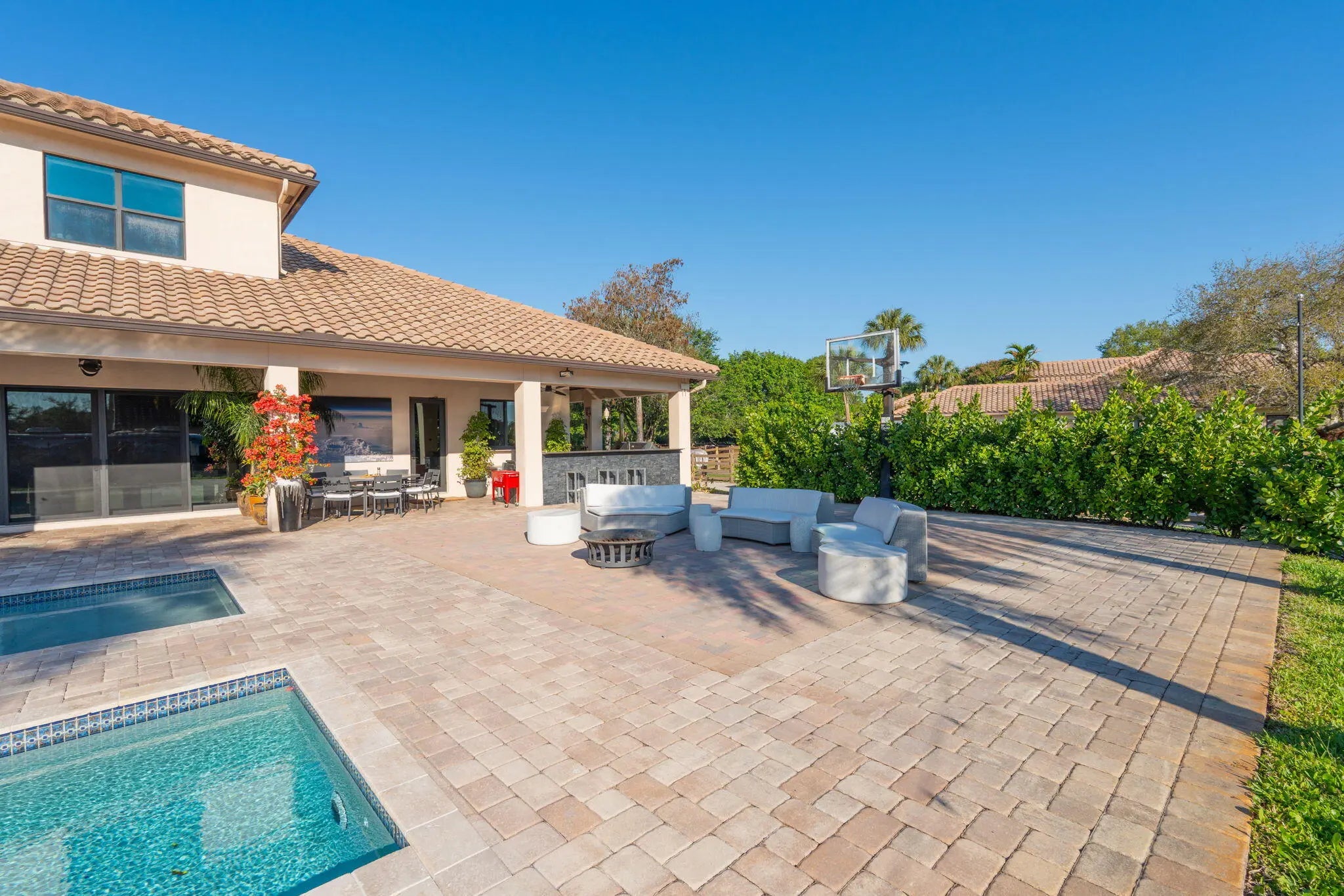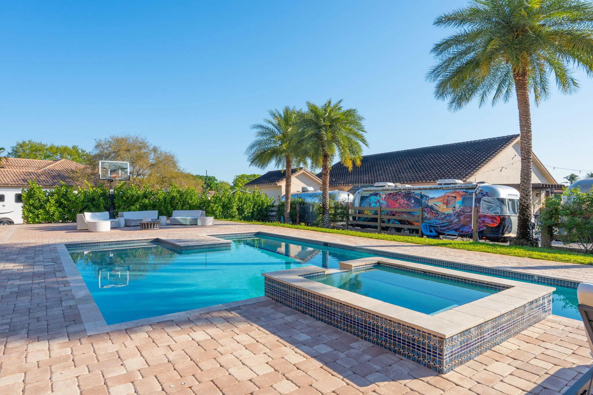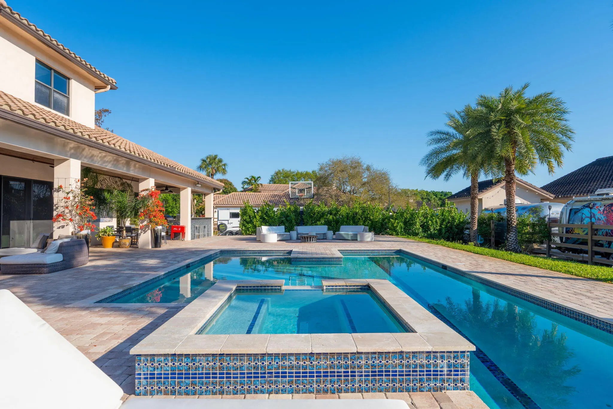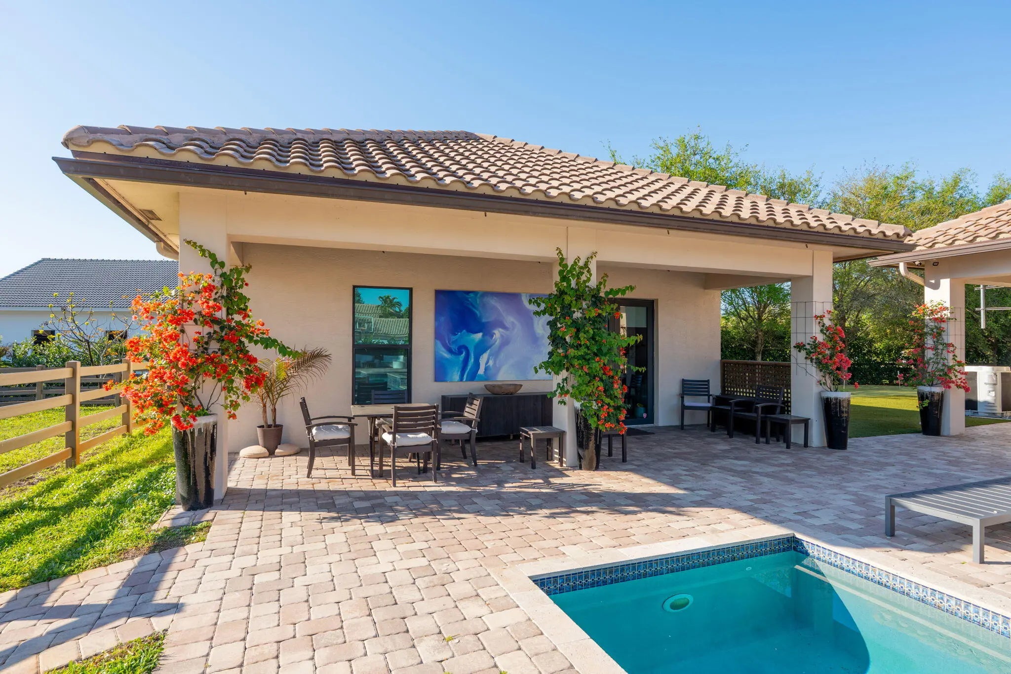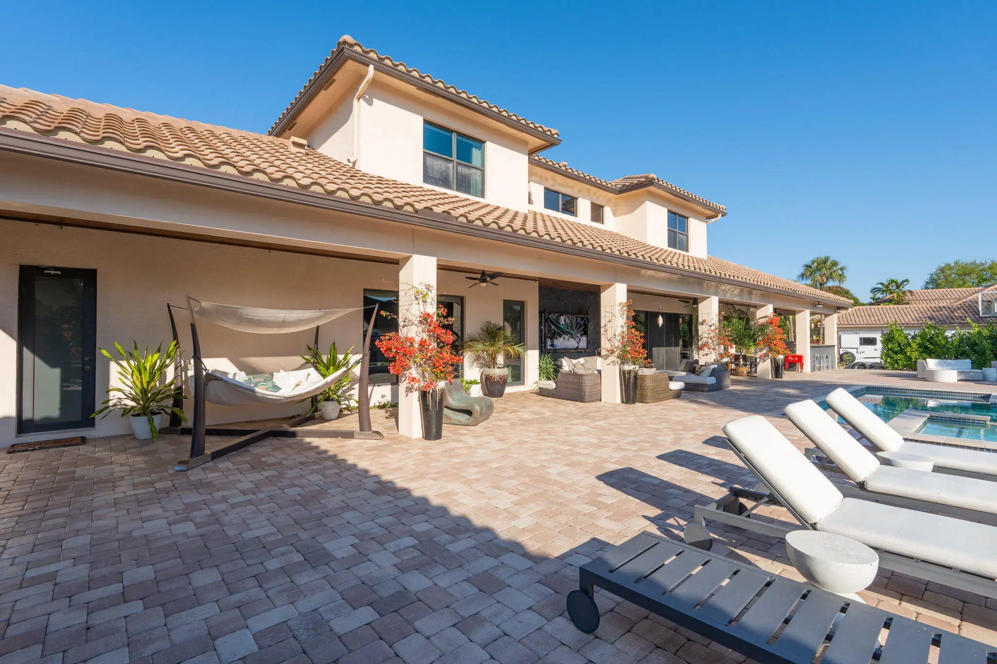 An equestrian dream opportunity: two adjoining properties totaling 3.75 acres with world-class equestrian facilities, including a fully equipped 7-stall barn with tack, feed, laundry, and full bath; a 5-stall barn with tack and feed rooms; multiple wash stalls; two all weather arenas; a hot walker; and five paddocks. Three gated driveways and mature landscaping provide privacy and ease of access, just minutes from the Wellington International, Global Dressage venues, and Wellington's dining and shopping—perfectly timed for show season. The main residence is a modern entertainer's dream with bright, wide-open spaces, soaring ceilings, and nearly floor-to-ceiling windows. The entry leads into a striking, one-of-a-kind wine room. Italian marble and wood flooring flow throughout, complemented by a custom office, formal dining, a gorgeous loft, and a spectacular kitchen with a huge center island, custom cabinetry, and a double pantry. An elegant indoor bar provides a separate space for entertaining. The main-level primary suite is a luxurious retreat with dual spa-inspired bathrooms, a freestanding soaking tub, double vanities, a huge walk-in shower, a sitting area, an oversized closet, and a cabana-style bath. Living areas open to a resort-style pool with summer kitchen, putting green, and cabana bath. A 4-car garage, coffee bar, and state-of-the-art laundry with automated lighting complete the residence. A separate 1-bedroom apartment with a full kitchen and laundry provides private guest or staff accommodations. The second residence offers 3 bedrooms, 2 baths, an office, formal dining, partial hurricane-impact windows, its own pool, a detached studio efficiency, and a 3-car garage. This rare Wellington property blends luxury living with exceptional equestrian amenities, offering an unparalleled lifestyle for entertaining, leisure, and equestrian pursuits.