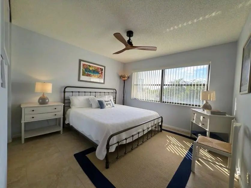 Experience the ultimate Juno Beach lifestyle in this stunning 3rd-floor end unit at Ocean Trace. This fully furnished, turn-key condo features panoramic lake views and an abundance of natural light. The interior boasts an updated kitchen with granite countertops, wood cabinetry, and stainless steel appliances, complemented by tile flooring throughout. Enjoy a smart split-bedroom floor plan for maximum privacy, upgraded granite bathrooms, and a brand-new full-size washer/dryer. Relax on the screened-in balcony overlooking the water. Includes one assigned covered parking space. Ocean Trace is a gated, resort-style community featuring two pools, jacuzzis, a fitness center, and grilling areas. Minutes from the airport, pristine beaches, world-class golf, and top-tier dining. AVAILABILITY: Apr-Jun $3,000/mo | Jul-Sep $2,500/mo | Oct-Dec $4,500/mo. Annual rate negotiable. Pet friendly. Just bring your toothbrush!