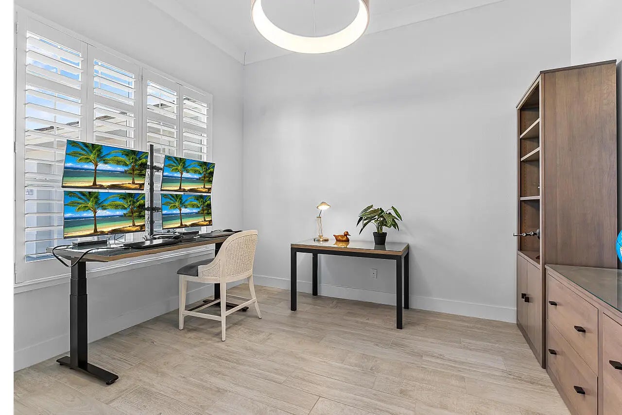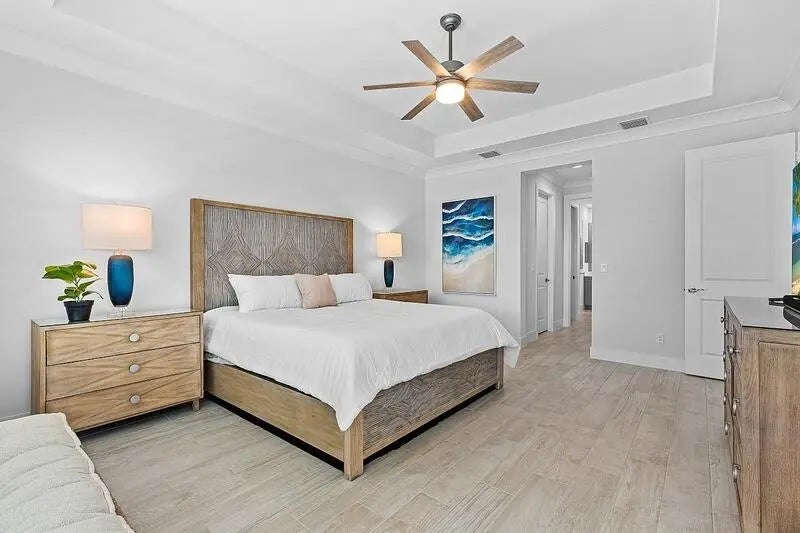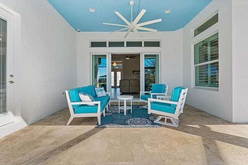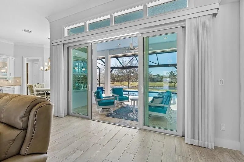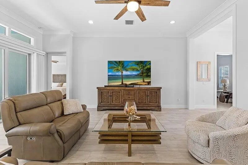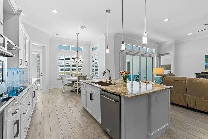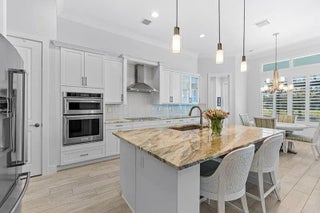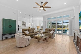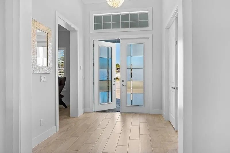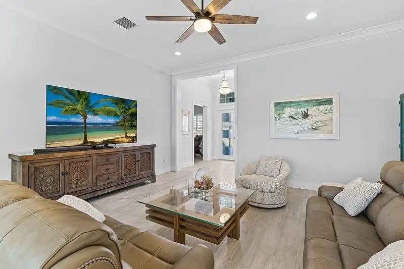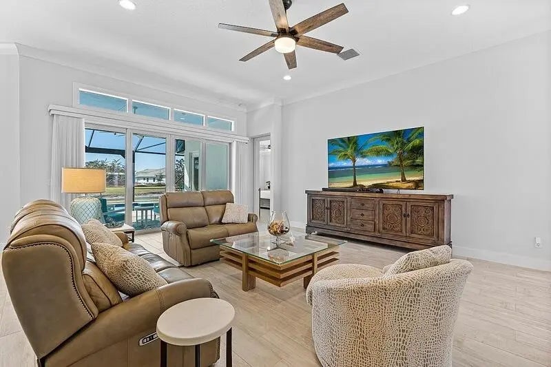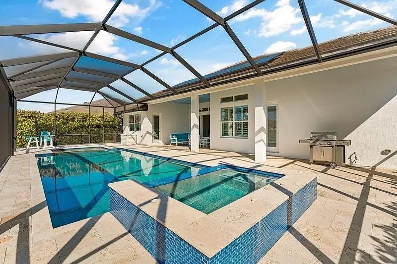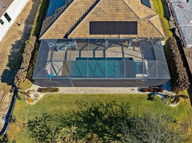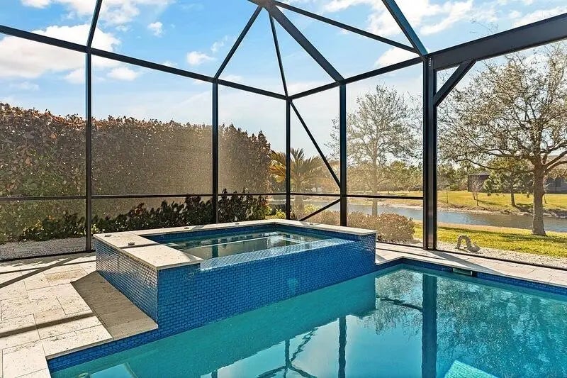 Coastal luxury meets lakefront serenity in Bent Pine, where an expansive lanai and a south-facing heated saltwater pool with waterfall spa create a true resort-style escape against a tranquil lake backdrop with Florida wildlife views. Travertine decking and a screened enclosure provide breezy, year-round outdoor living. Inside: 4 bedrooms, 3 baths, plus a den/flex room and private office. Chef's kitchen with stainless KitchenAid appliances and a walk-in pantry; 4.5'' plantation shutters and smart-home features throughout. Major upgrades include impact windows/doors, tile roof, and a 3-car side-load epoxy garage. Owned solar (30 panels) + 30 kWh Enphase battery, 4-stage filtration and RO, 60-amp EV circuit, and 10-camera security with Ring monitoring. A private, polished retreat designed for effortless Florida living. rmszappr&sub2err