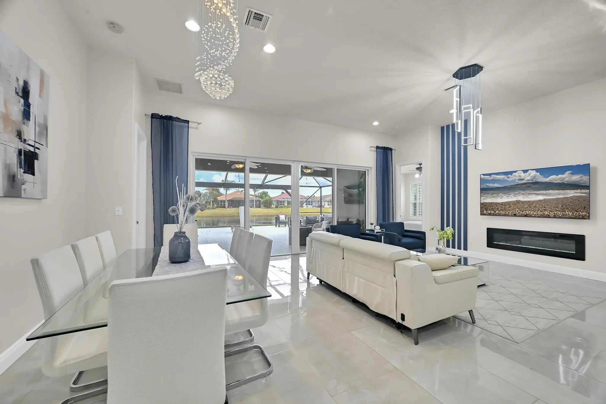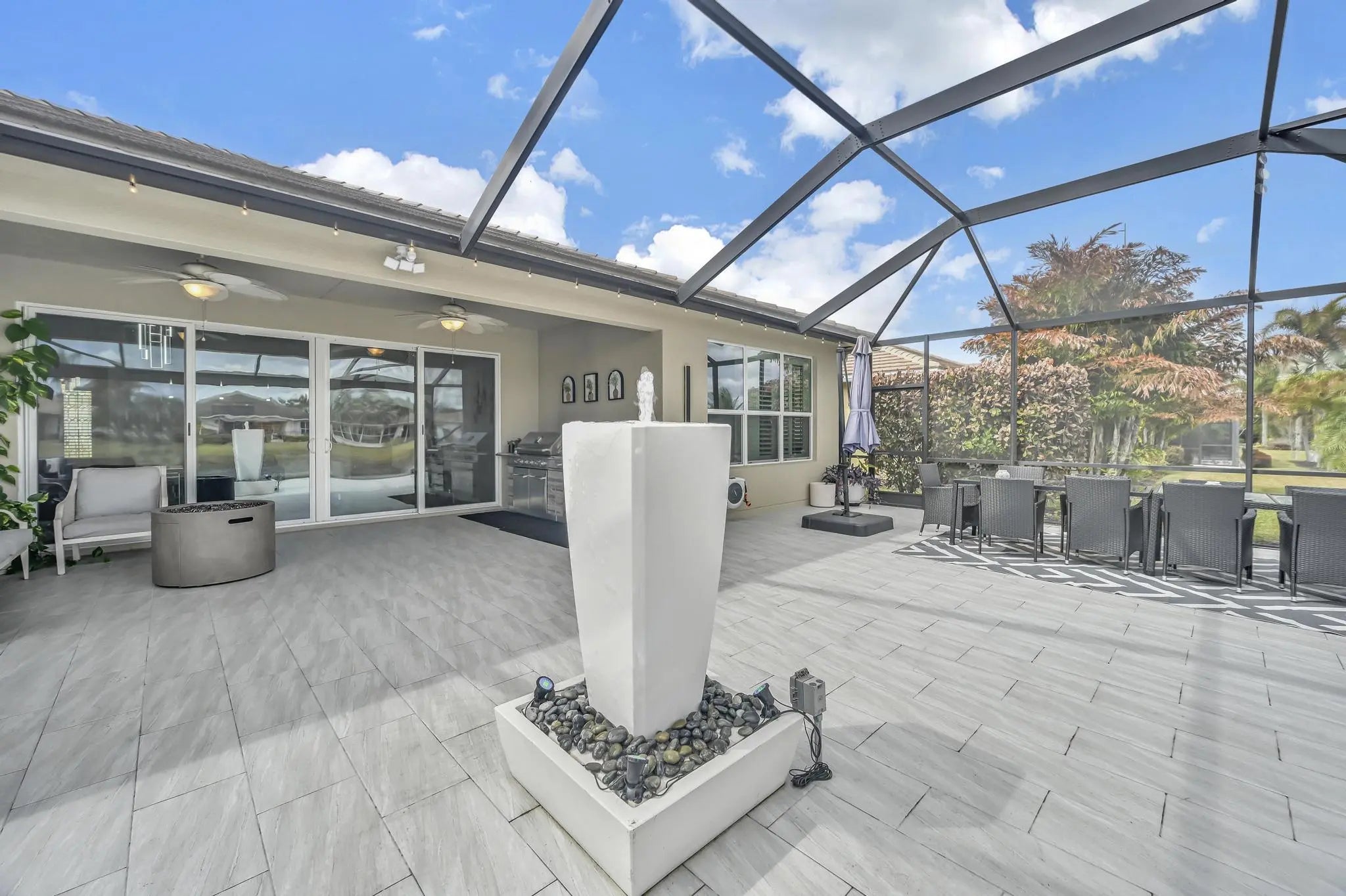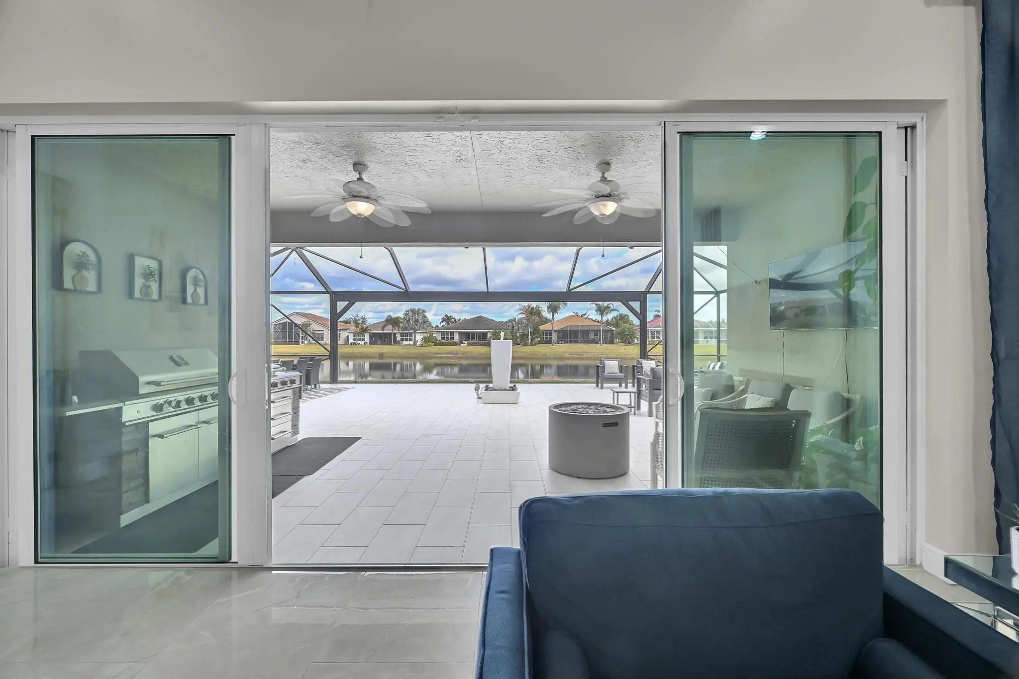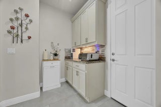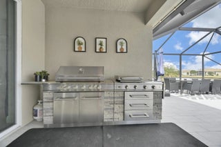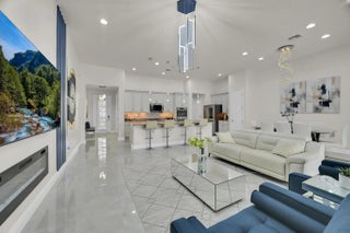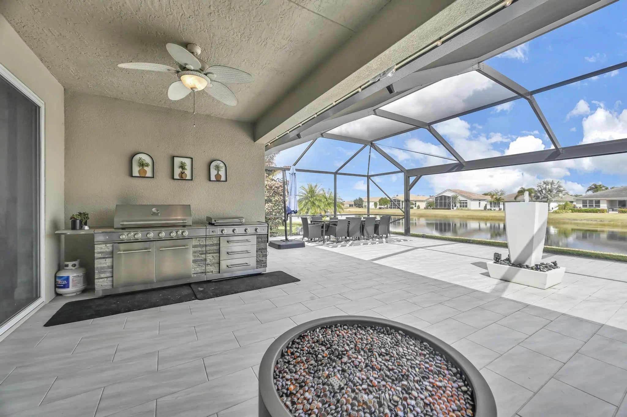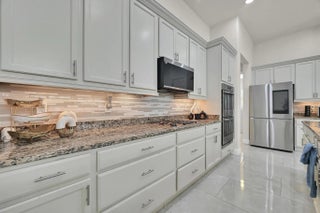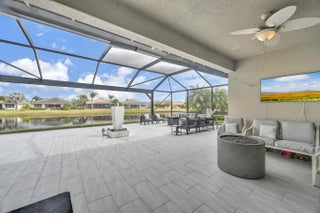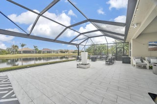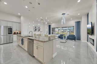 Welcome home to panoramic views and effortless living in this pristine lakefront residence located in a desirable 55+ community. This beautifully designed 3-bedroom + den, 3-bathroom home offers the perfect blend of comfort, space, and low-maintenance luxury. Whether you need room for visiting family, hobbies, or a dedicated home office, this flexible layout delivers. Featuring two spacious primary suites, each with walk-in closets and private baths with sleek glass shower doors — ideal for hosting guests with comfort and privacy. The kitchen shines shaker cabinetry, crown molding, an upgraded backsplash, touchscreen microwave, double oven and a Samsung Bespoke 4-Door Flex refrigerator — stylish and functional for everyday living or entertaining. Tile flooring flows throughout the home, complemented by sparkling chandeliers and a beautiful built-in fireplace in the family room. Step outside to your extended, tiled lanai with breathtaking, unobstructed panoramic lake views and a relaxing fountain the perfect setting for morning coffee, sunset watching, or simply enjoying the peaceful surroundings. Impact windows provide added peace of mind, and the home is wired for an electric vehicle charger for modern convenience. Resort-style living, stunning views, and a home designed for the next chapter this is more than a home, it's a lifestyle. So many ways to enjoy this open, light-filled space. This isn't just a home... it's a lifestyle.
