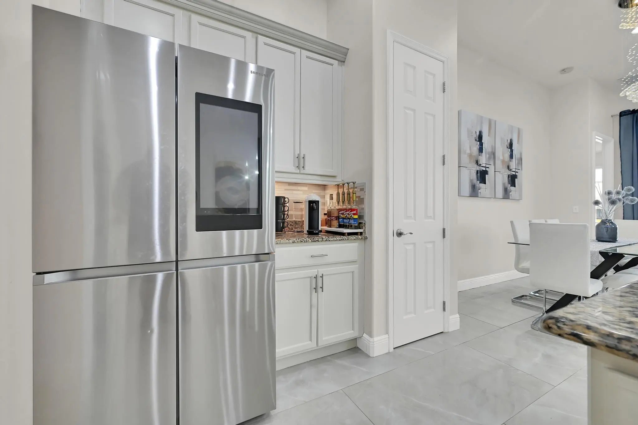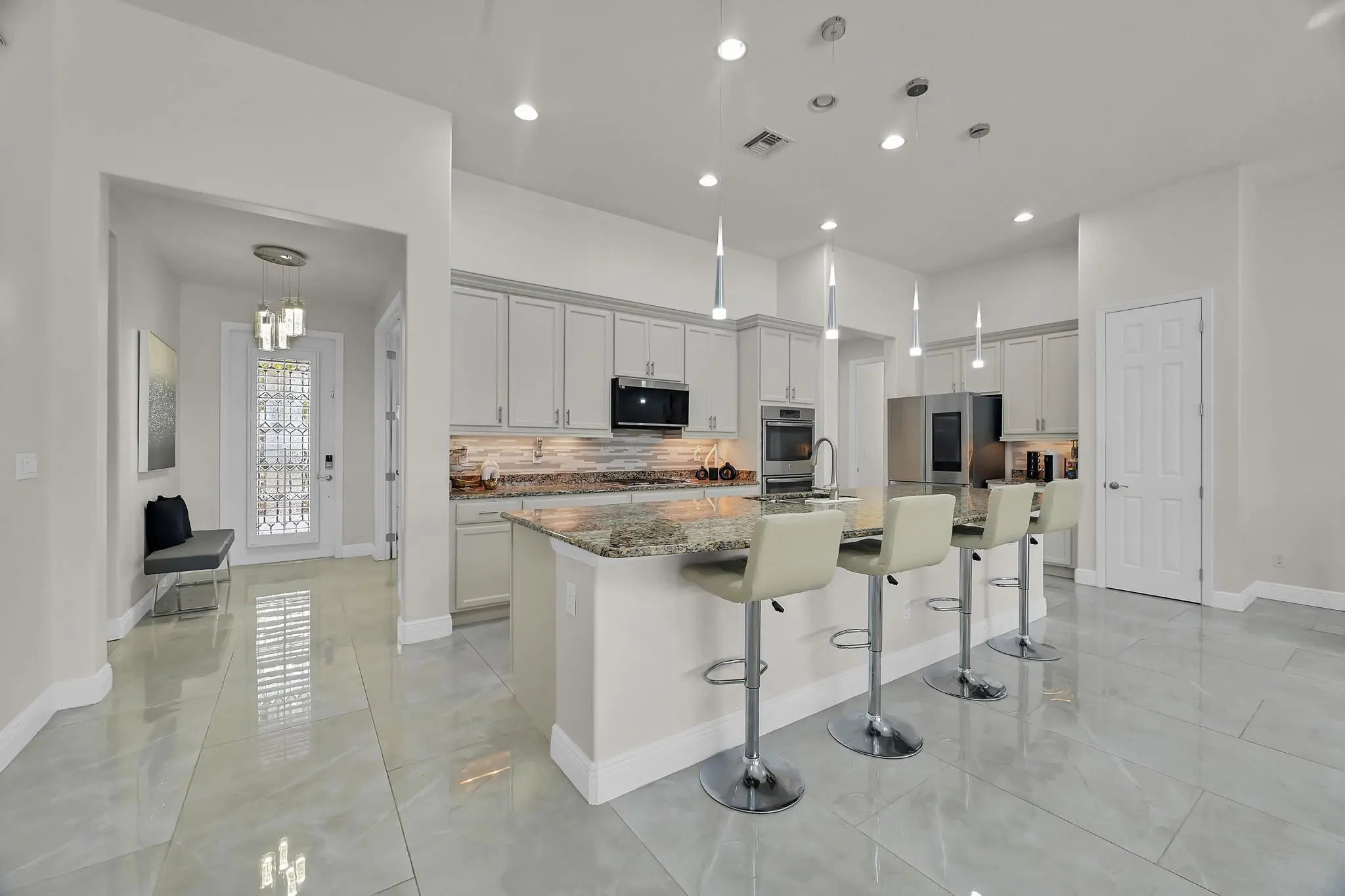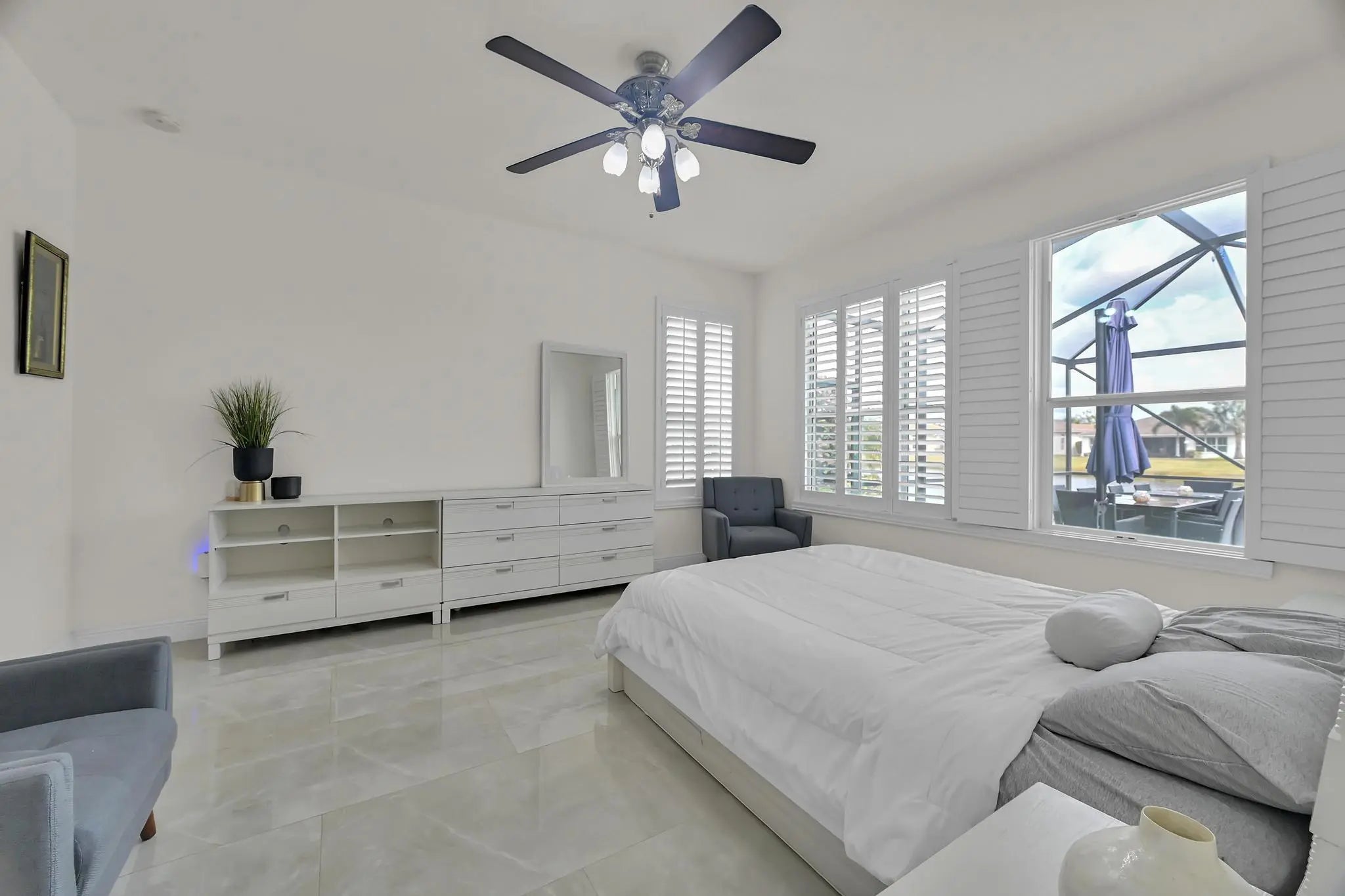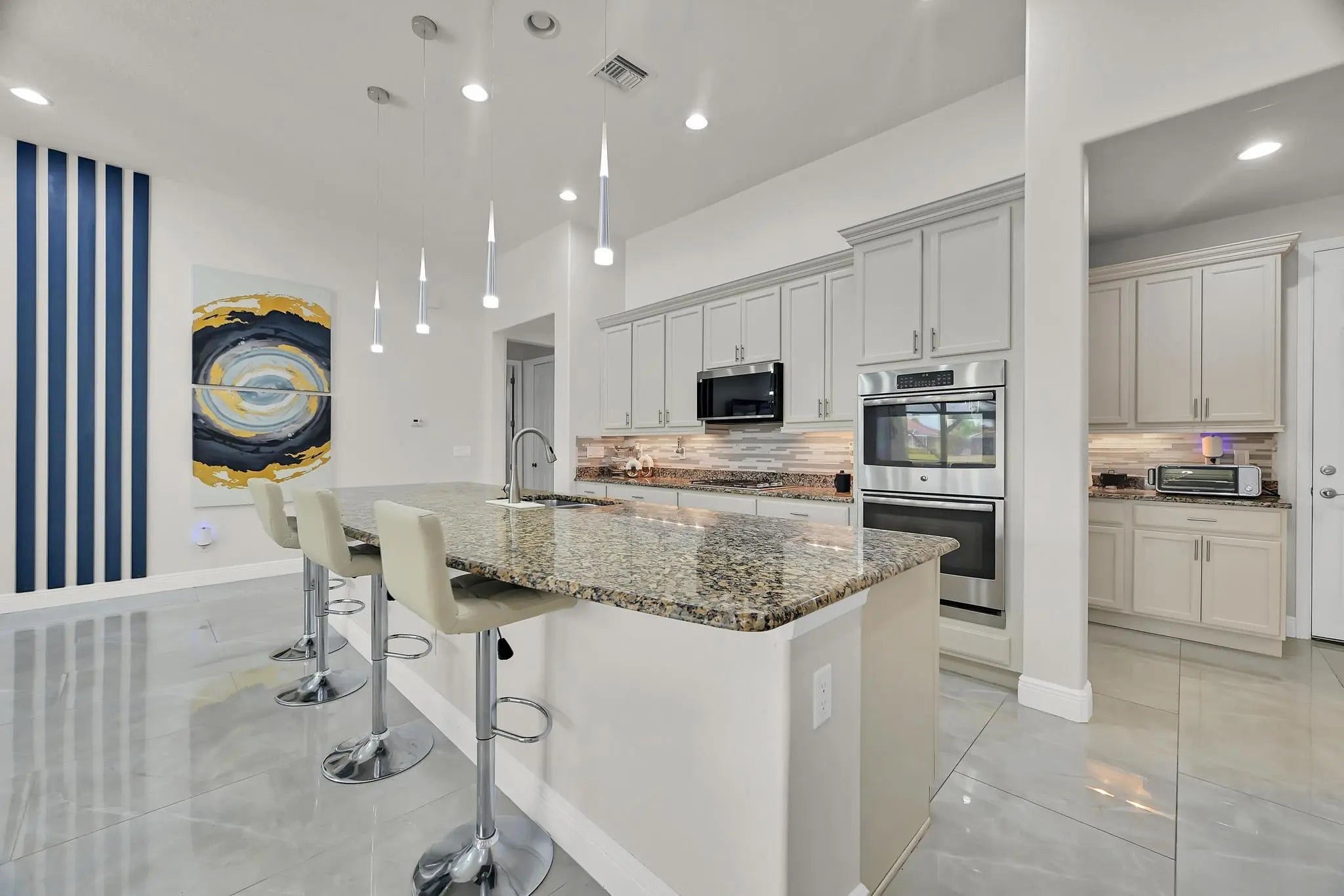 Welcome home to panoramic views and effortless living in this pristine lakefront residence located in a desirable 55+ community. This beautifully designed 3-bedroom + den, 3-bathroom home offers the perfect blend of comfort, space, and low-maintenance luxury. Whether you need room for visiting family, hobbies, or a dedicated home office, this flexible layout delivers. Featuring two spacious primary suites, each with walk-in closets and private baths with sleek glass shower doors — ideal for hosting guests with comfort and privacy. The kitchen shines shaker cabinetry, crown molding, an upgraded backsplash, touchscreen microwave, double oven and a Samsung Bespoke 4-Door Flex refrigerator — stylish and functional for everyday living or entertaining. Tile flooring flows throughout the home, complemented by sparkling chandeliers and a beautiful built-in fireplace in the family room. Step outside to your extended, tiled lanai with breathtaking, unobstructed panoramic lake views and a relaxing fountain the perfect setting for morning coffee, sunset watching, or simply enjoying the peaceful surroundings. Impact windows provide added peace of mind, and the home is wired for an electric vehicle charger for modern convenience. Resort-style living, stunning views, and a home designed for the next chapter this is more than a home, it's a lifestyle. So many ways to enjoy this open, light-filled space. This isn't just a home... it's a lifestyle.