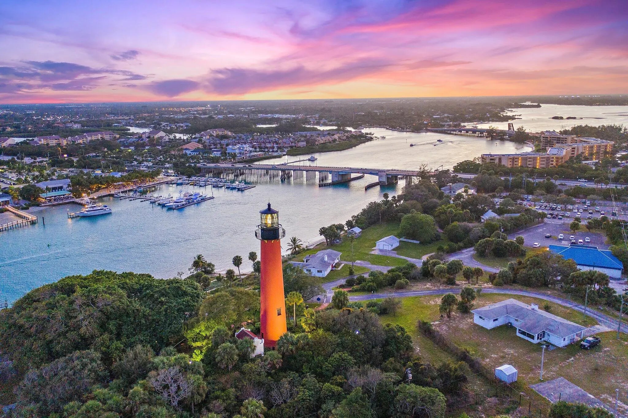 To mark the reef lying off the Jupiter Inlet, Congress in 1853 appropriated $35,000 to construct a lighthouse. At the top of the Jupiter Lighthouse, you can see the Loxahatchee River.