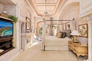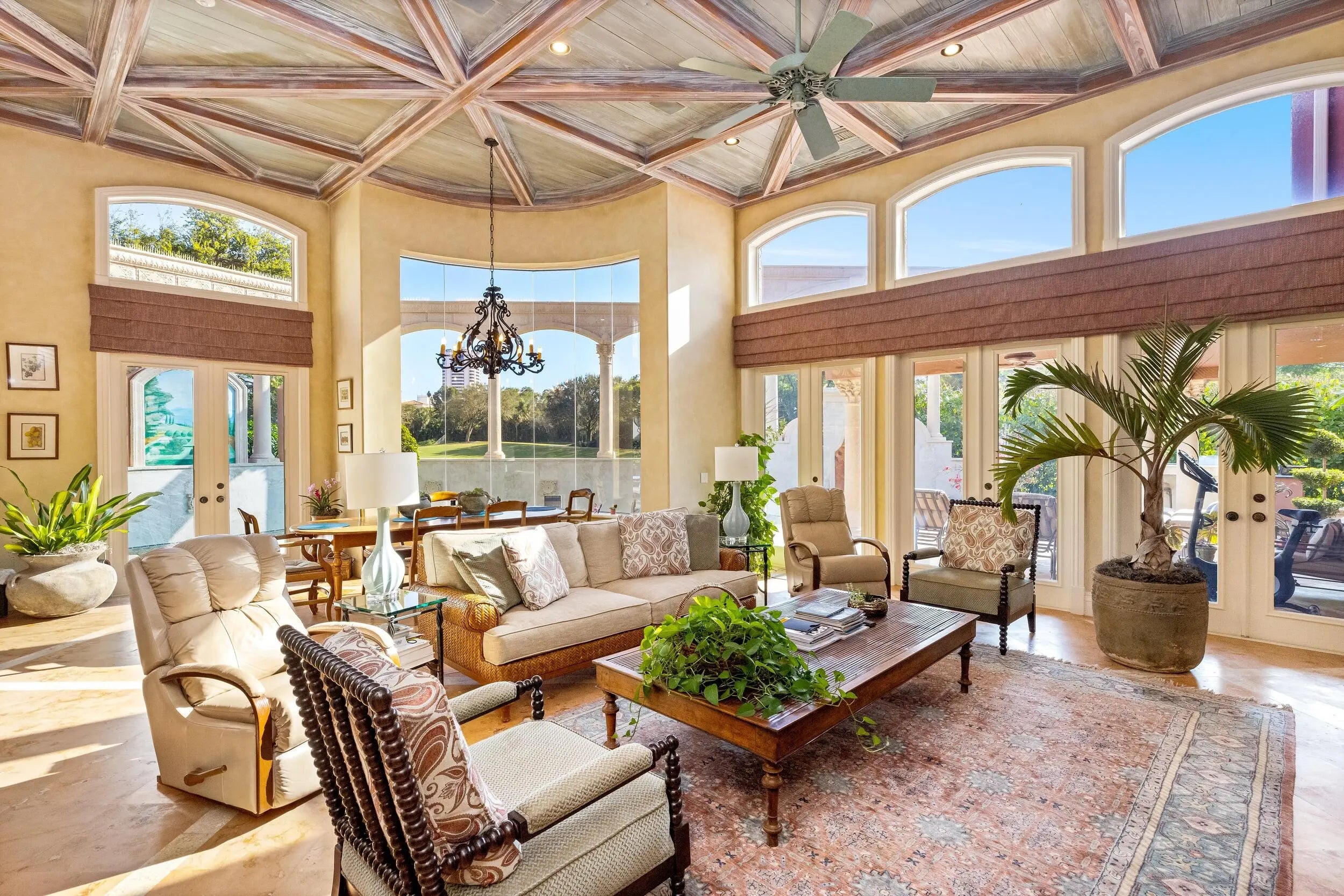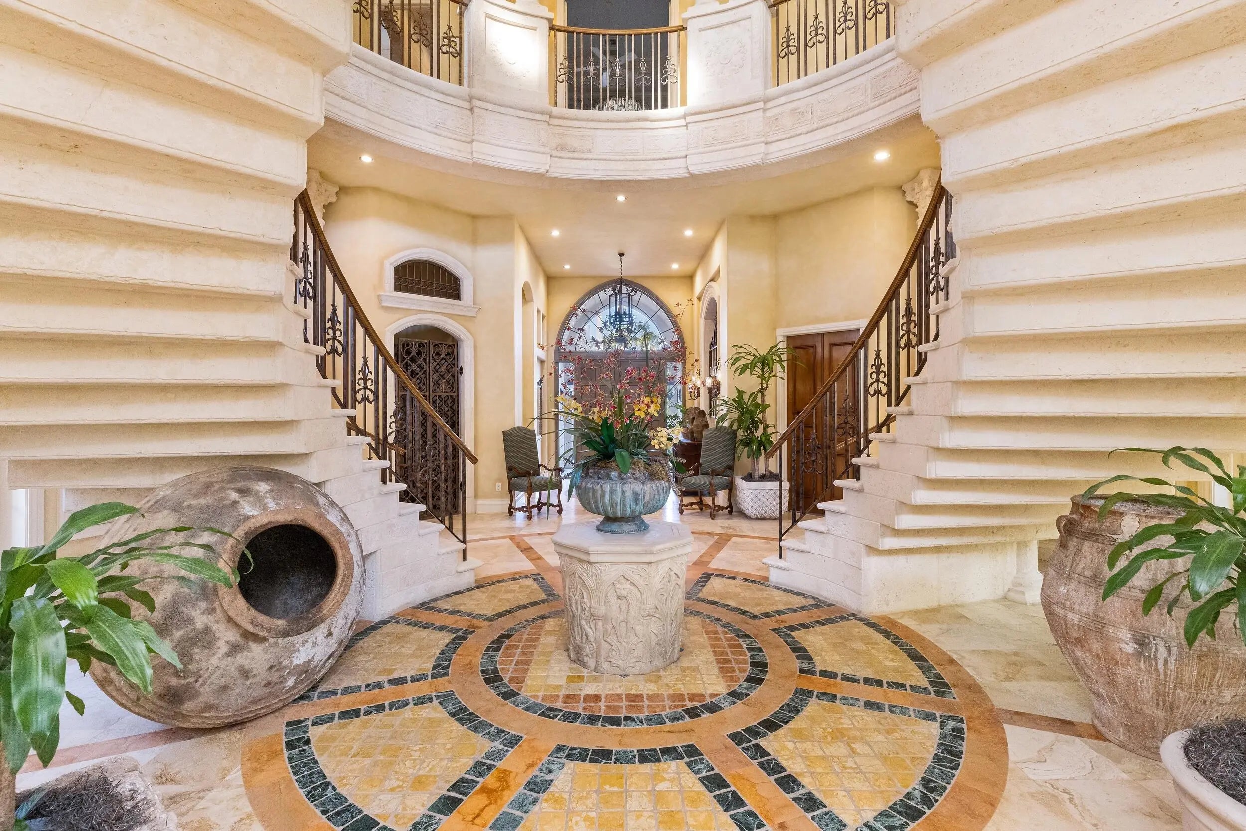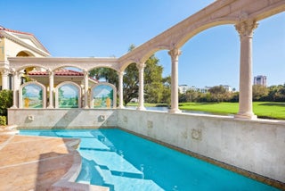 Set within the prestigious, double-gated enclave of Addison Estates, and located directly on the grounds of The Boca Raton, this architectural marvel commands sweeping golf course and tranquil lake views in one of South Florida's most exclusive settings. Encompassing 8,365 square feet of living space and 9,401 square feet in total, the residence is defined by soaring ceilings, voluminous entertaining areas, and extraordinary architectural detail throughout. A dramatic third-story rotunda crowns the estate, where stained glass at its apex casts luminous color and light, creating a breathtaking focal point that speaks to the home's artistry and grandeur. The main level unfolds with a layout designed for both elegant entertaining and everyday comfort. The primary bedroom suite is privately situated on the first floor, offering convenience and scale, alongside a guest bedroom suite ideal for visiting family or extended stays. A refined office provides a distinguished work environment. The formal dining room, complemented by a built in bar, sets the stage for elevated gatherings, while a wine cellar adds a sophisticated touch for collectors. The double height living room impresses with dramatic volume and natural light, reinforcing the residence's grand architectural presence. Upstairs, beautifully appointed guest bedrooms are all en suite, each offering privacy and comfort. Two additional living rooms provide flexible lounge spaces for media, relaxation, or family living. Second floor terraces extend outward, capturing panoramic golf course and lake views while enhancing the seamless indoor outdoor lifestyle that defines this estate. Outdoors, resort style living takes center stage. Sweeping fairway vistas frame the pool and tranquil entertaining areas, surrounded by lush landscaping that enhances privacy and serenity. The setting evokes the ambiance of a private resort within one of Boca Raton's most exclusive communities. Additional features include two laundry rooms and a two car garage, blending practicality with impressive scale. Offered as an exceptional opportunity with tremendous upside, the residence presents remarkable potential to customize and elevate to your personal vision through modern refinement or bespoke luxury finishes. Grand in every sense, this is a residence defined by architecture, setting, and possibility, an irreplaceable offering within Addison Estates and the greater Boca Raton luxury landscape.