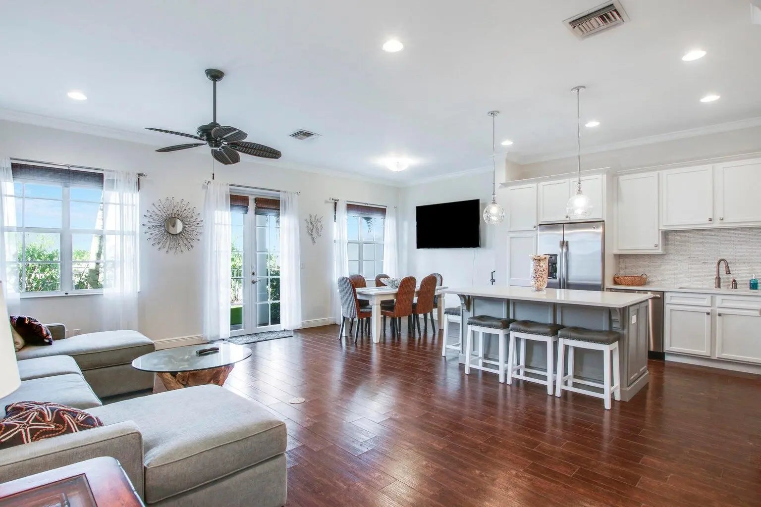 WALK TO THE BEACH! Like new Ocean Breeze townhome rental in Juno Beach. 3 bedrooms, 2.5 baths & a 2-car garage. This townhome is well-appointed with stainless steel appliances, quartz countertops, upgraded cabinets & a huge center island. Tile & wood flooring in the entire townhome, crown molding, updated lighting, living/dining & (no carpet at all), a built-in desk area & a first-floor half bath, 3 bedrooms on the second floor, plus the laundry room with full-size washer & dryer plus hurricane impact windows. The oversized owners suite includes 2 walk-in closets & a private balcony, and the master bath has a large shower enclosure and dual sinks. The secondary bathroom has a shower/tub enclosure. The exterior rear yard includes all synthetic turf. This immaculate townhome is a must see.