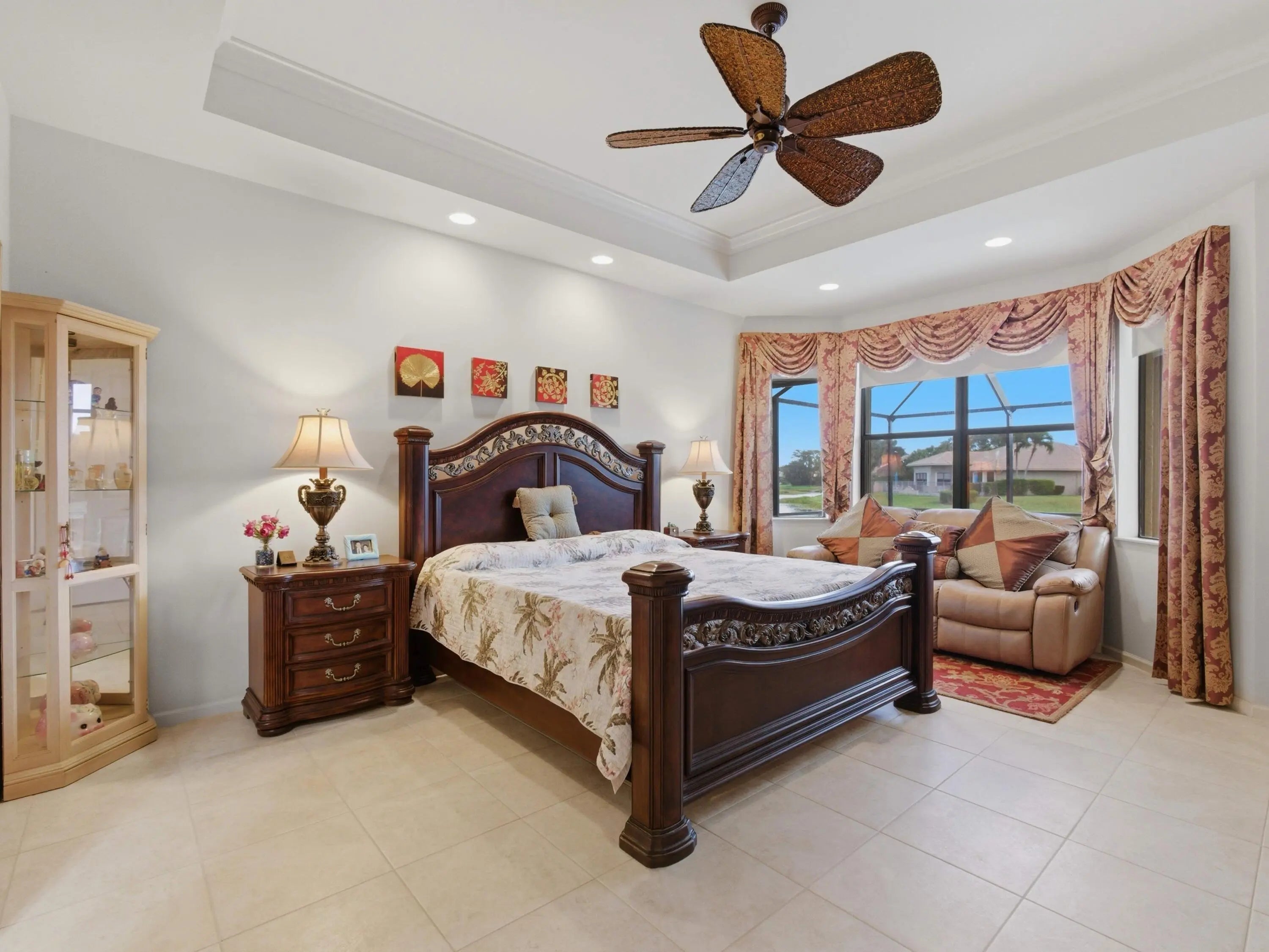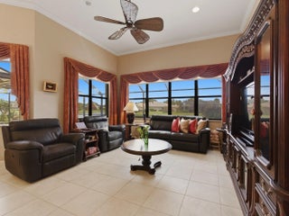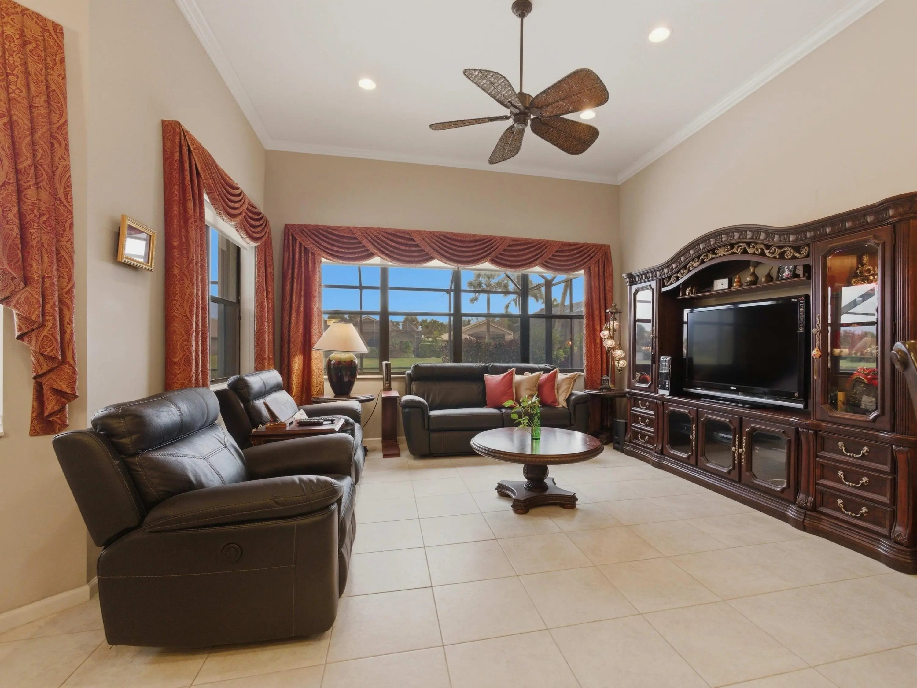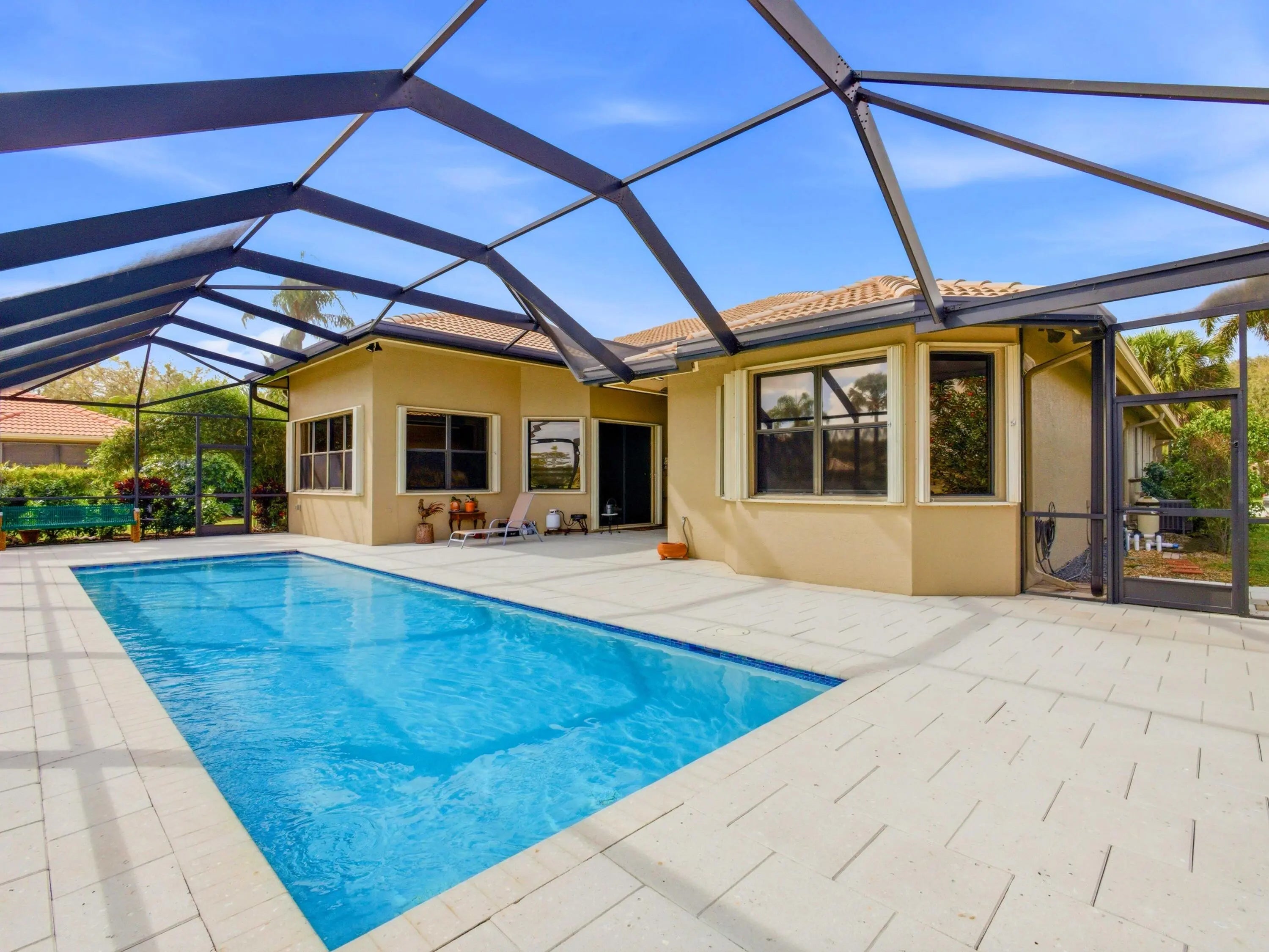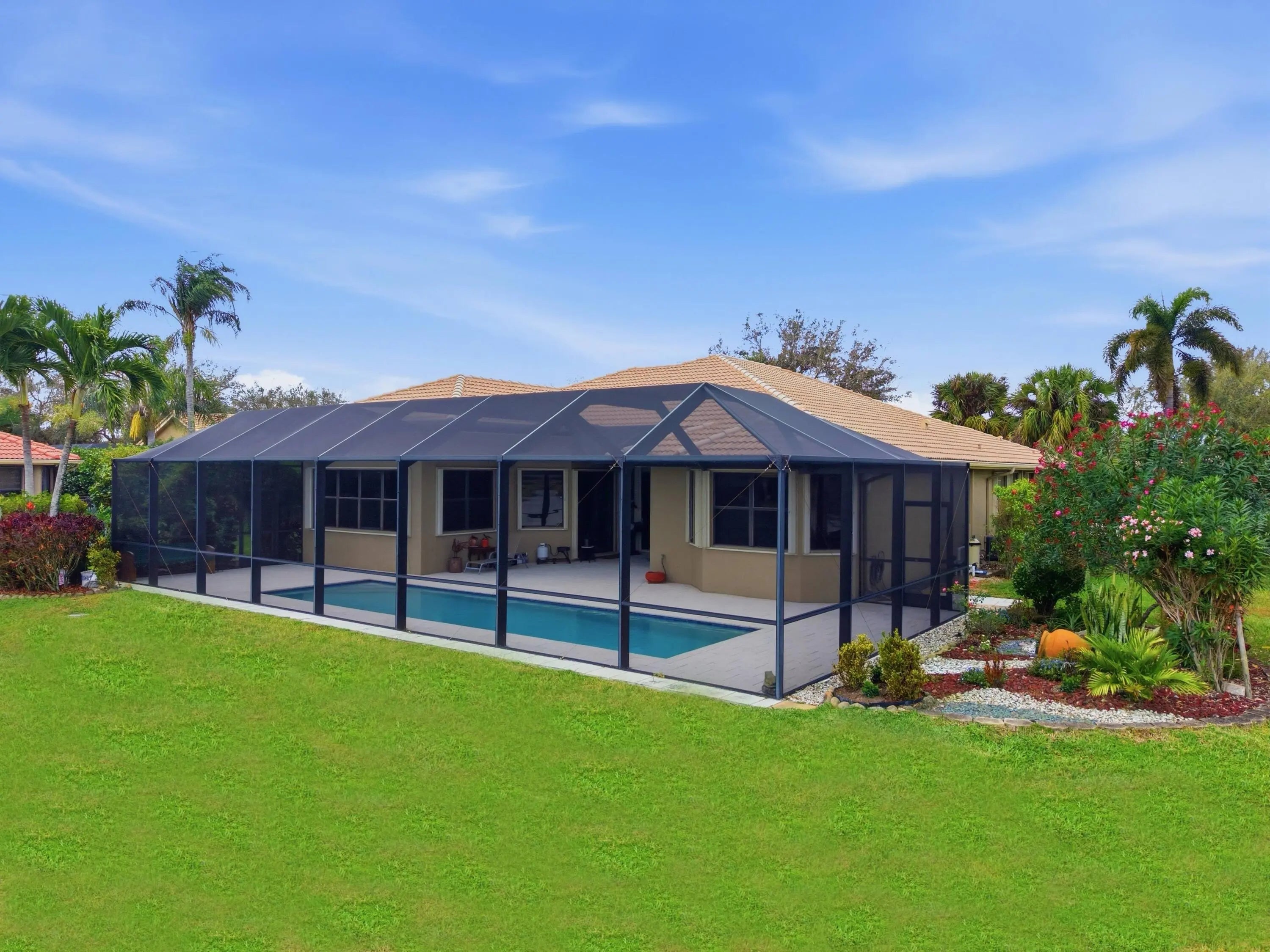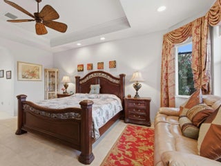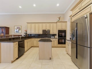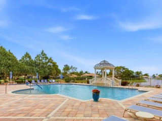 Welcome to peaceful lakeside living in this beautifully maintained home, nestled within a prestigious 55+ gated community. Perfectly positioned to capture magnificent lake views, this elegant one-story home offers both privacy and sophistication in a serene setting. The home features three spacious bedrooms, a versatile den, and three full bathrooms. Its thoughtfully designed three-way split floor plan provides exceptional privacy for both homeowners and guests. A welcoming foyer introduces the home's elegant interior, leading to a formal dining room, a refined living room, and a separate family room, all enhanced by crown molding that adds a touch of sophistication throughout the main living areas. The spacious open kitchen is thoughtfully designed for both functionality and style. It features granite counter top, stainless-steel refrigerator, microwave. Other features include a dishwasher, range, and dual wall ovens--perfect for everyday living and entertaining. Abundant cabinetry provides ample storage, while the generously sized kitchen island offers additional workspace and a natural gathering place for family and guests. The open layout allows the kitchen to flow seamlessly into the surrounding living areas, creating a bright and welcoming heart of the home. The primary suite is a true retreat, featuring two walk-in closets, a dedicated dressing table, and an en-suite bath with a separate soaking tub and walk-in shower. You will wake up to the breathtaking lake views right from your bedroom. Outdoor living is equally impressive. Step outside to your private screened patio showcasing a stunning 10' x 35' in-ground pool overlooking the tranquil lake. The pool was resurfaced and the pool deck redone in 2021. The new screen enclosure was installed at the same year. Accordion hurricane shutters provide added peace of mind, and the 2-car garage door is reinforced with hurricane-resistant beams. Additional updates include dual air-conditioning systems replaced in 2023 and 2024, ensuring year-round comfort. Beautifully designed landscaping enhances the home's curb appeal and reflects the exceptional care this property has received. The HOA fee covers lawn care and basic cable, along with exterior painting and roof cleaning every four years for added convenience. The community amenities feature a newly renovated clubhouse, resort-style pool, fitness center, card room, tennis courts, pickleball courts, and on-site management. The association requires a capital contribution equal to two quarters of HOA fees, and there is currently a special assessment of $341 per quarter for community updating. This well-maintained lakefront home offers the perfect blend of elegance and comfort living -- ready to welcome its next owner.