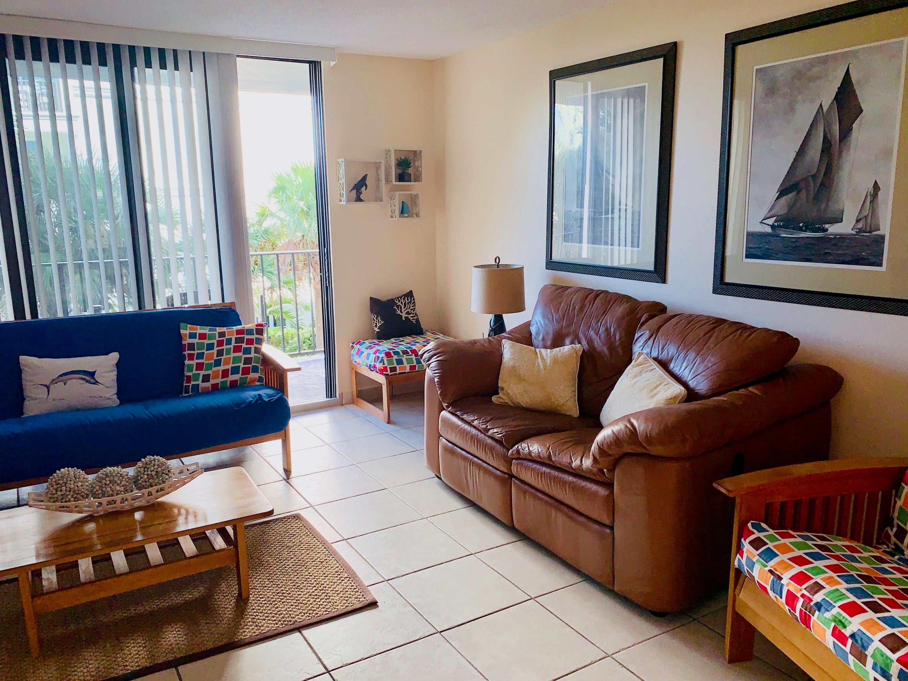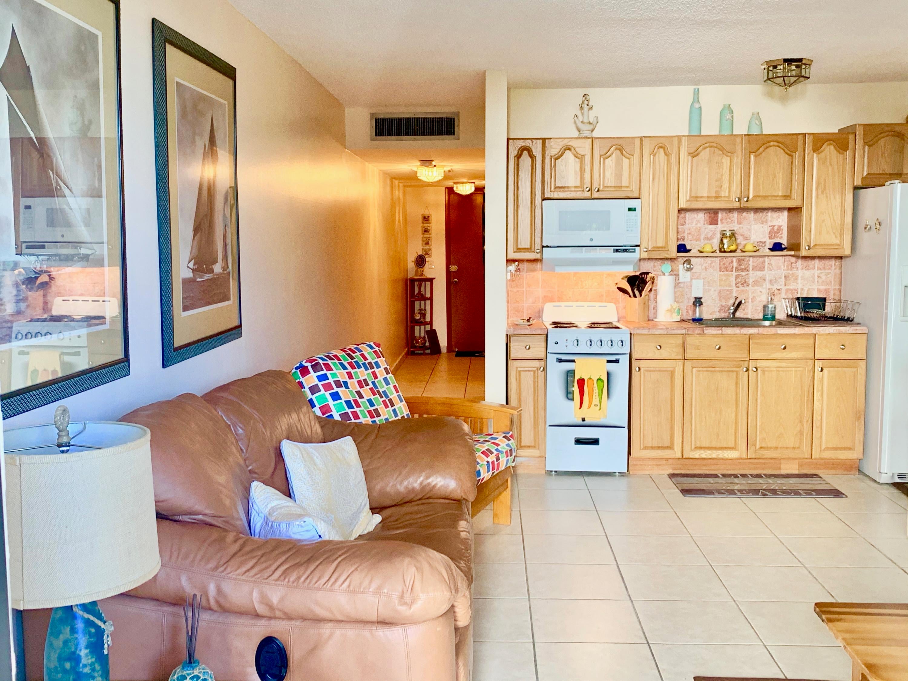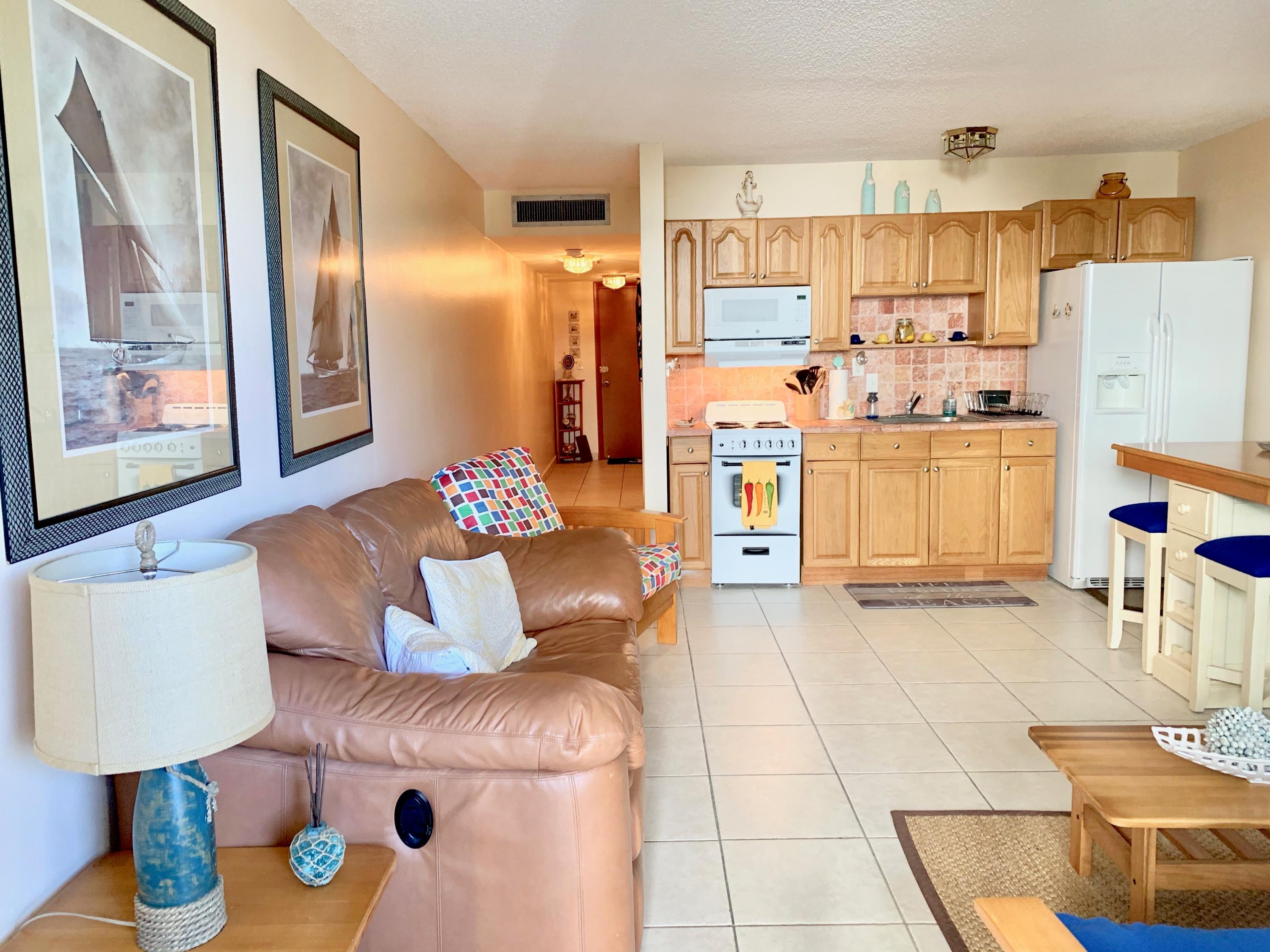 Converted updated 1 BR 1 BA from original efficiency unit with impact glass sliding doors and all tile flooring. Perfectly cozy living space has everything you need to enjoy the Atrium's oceanfront location in the town of PB Shores. Living area has leather sofa and futon bed for guests plus dining area for 4. TV's in Great Room + Bedroom. Full Size Bed in BR. Assigned Open Parking #130 North. Enjoy the large heated pool, BBQ picnic area, private beach access across arched seagrape lined pathway to wide sandy stable PB Shores beaches. Beach chair service available. Walk to PB Shores life guarded beach & town clubhouse events. This lovely walking town features marinas, waterfront dining and shopping. You will love LIFE at the Atrium in the charming beachfront community of Palm Beach Shore