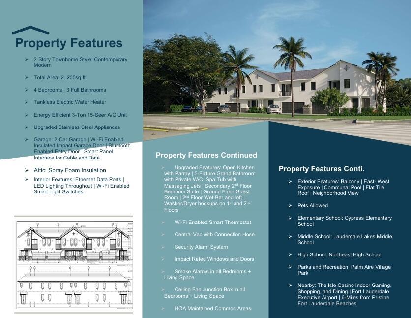 New Townhomes just broke ground! This contemporary 2-story townhouse is located in Palm Aire and has 4 bedrooms and 3 full bathrooms. This modern home comes with a loft, porch, balcony, 2-car garage, and community pool. The split bedroom floor plan features high 9'-0'' to 9'-4'' ceilings and porcelain tile floors throughout. Equipped with state of the stainless steel appliances, ring pro door bell, washer/dryer hookup, and much much more. This is a must see! Owner will accept 5% to go into contract!