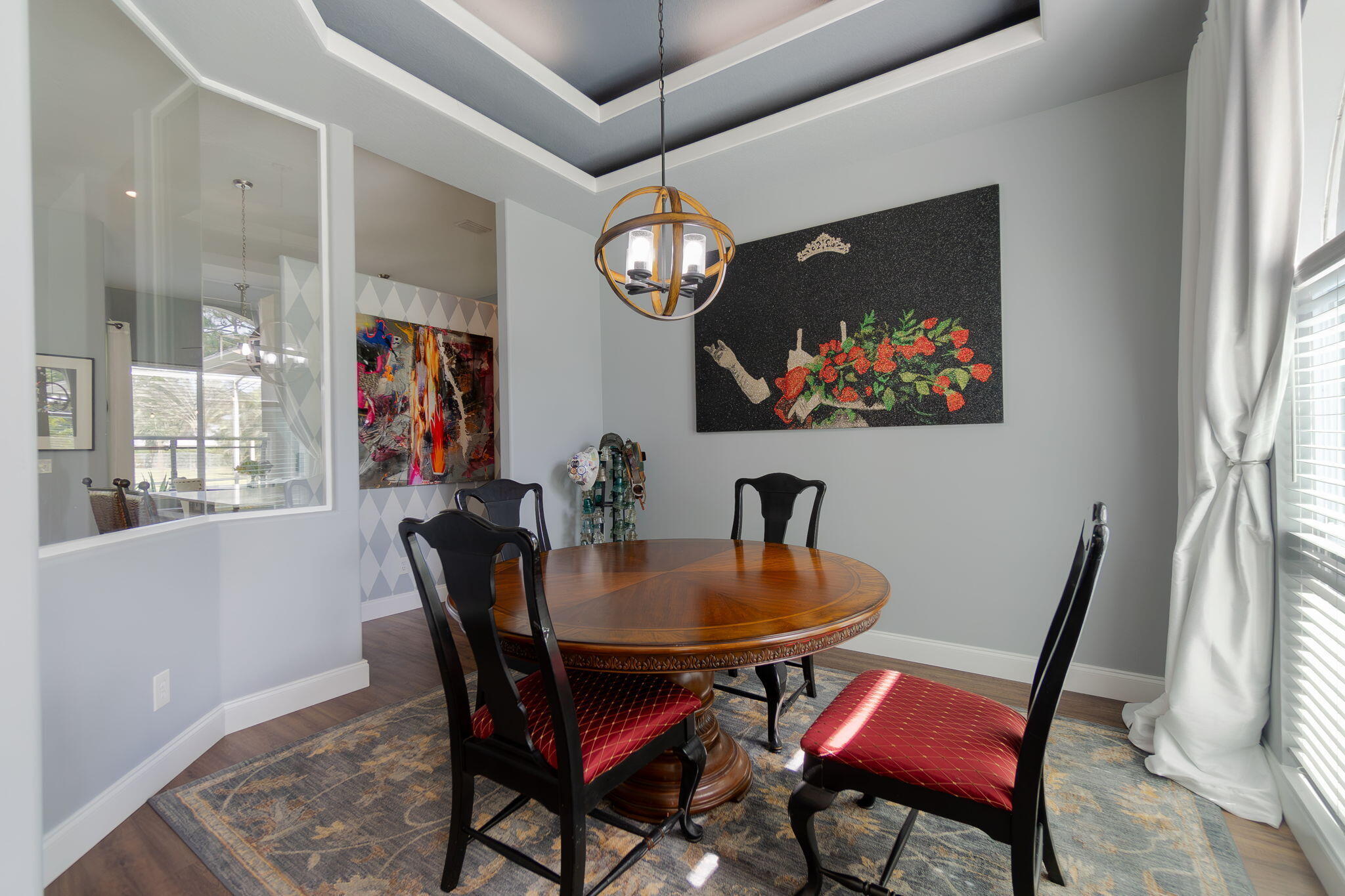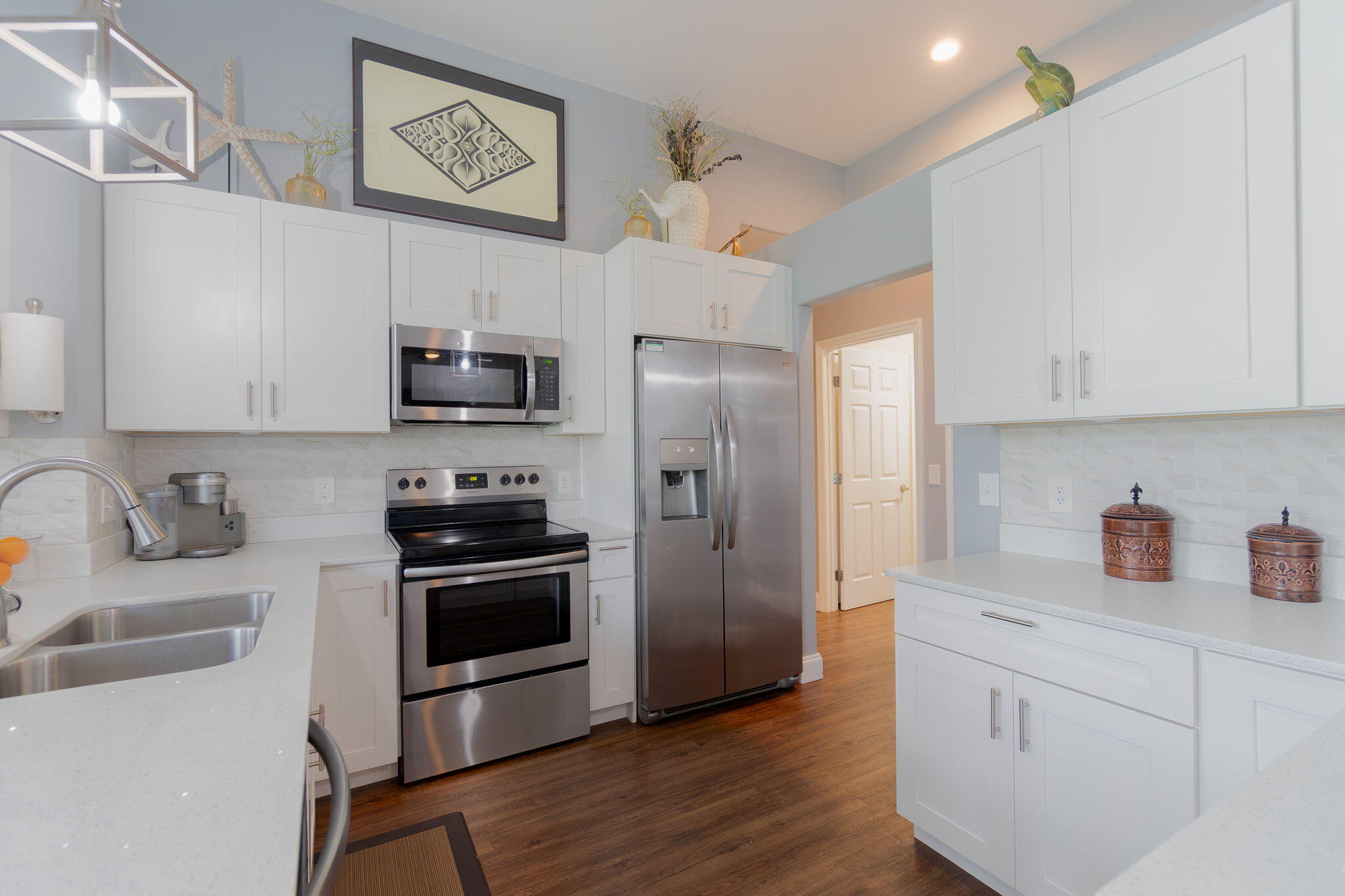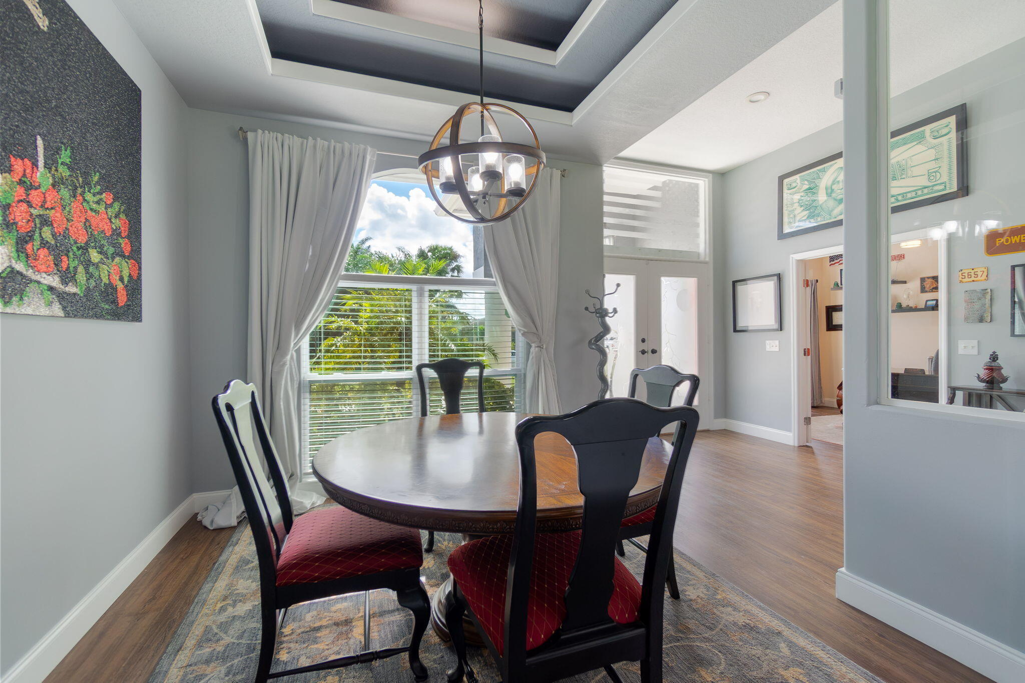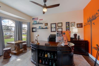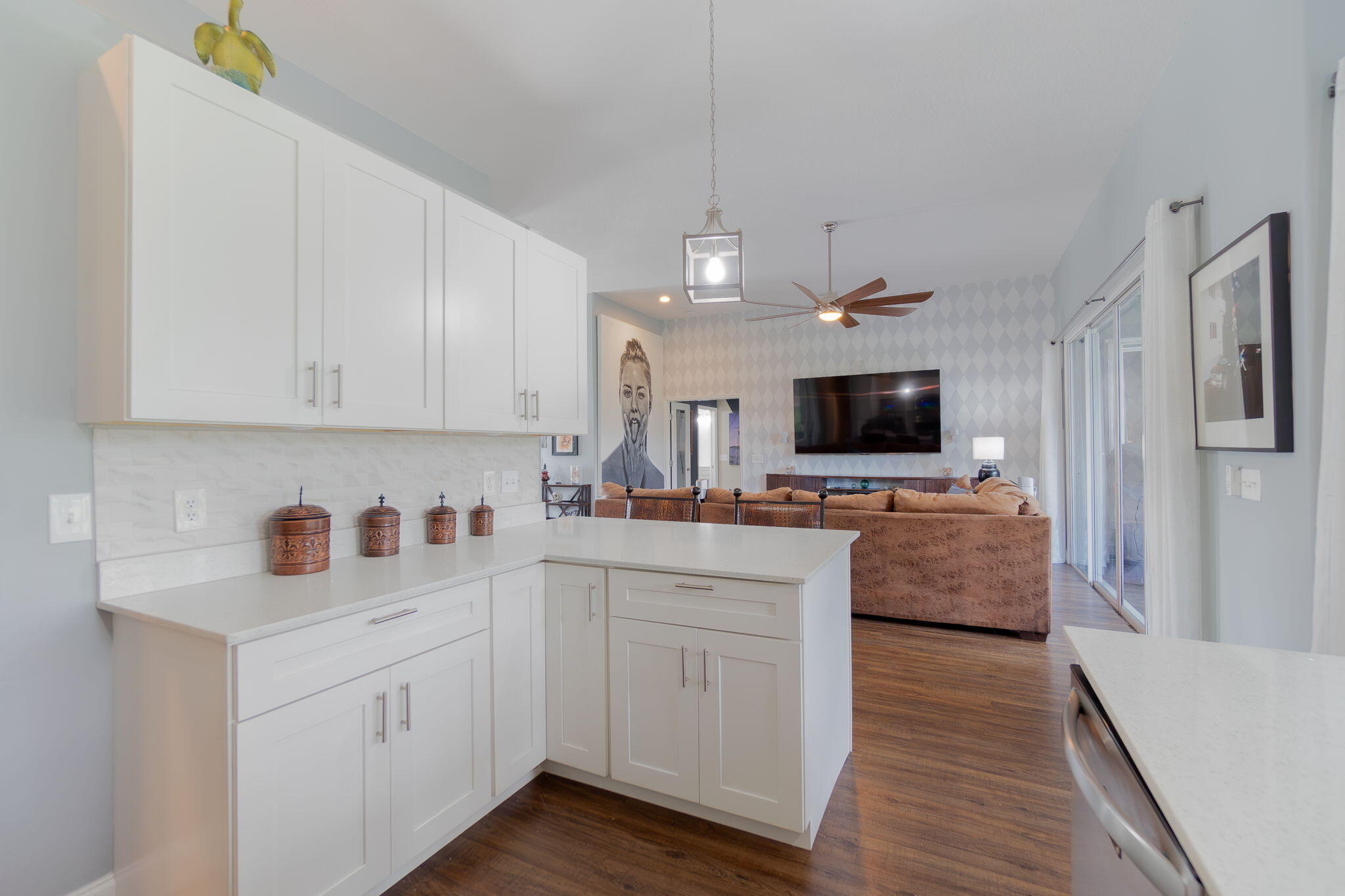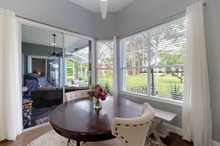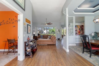 This beautifully updated home offers over 1,909 sq ft of bright and inviting living space. The cathedral ceilings and architectural windows flood the interiors with natural light. The kitchen features newer stainless steel appliances, sparkling quartz countertops, and thoughtfully designed storage options. Enjoy casual meals in the breakfast nook that overlooks a screened-in patio.The dining room is elegantly finished with glass walls perfect for entertaining. The expansive living area includes an office or den, providing versatile space for work or relaxation.The oversized master suite boasts a private bath and double closets, while two additional good-sized bedrooms on the opposite side of the house share a guest bath. Beautiful laminate floors runs throughout, enhancing the home.