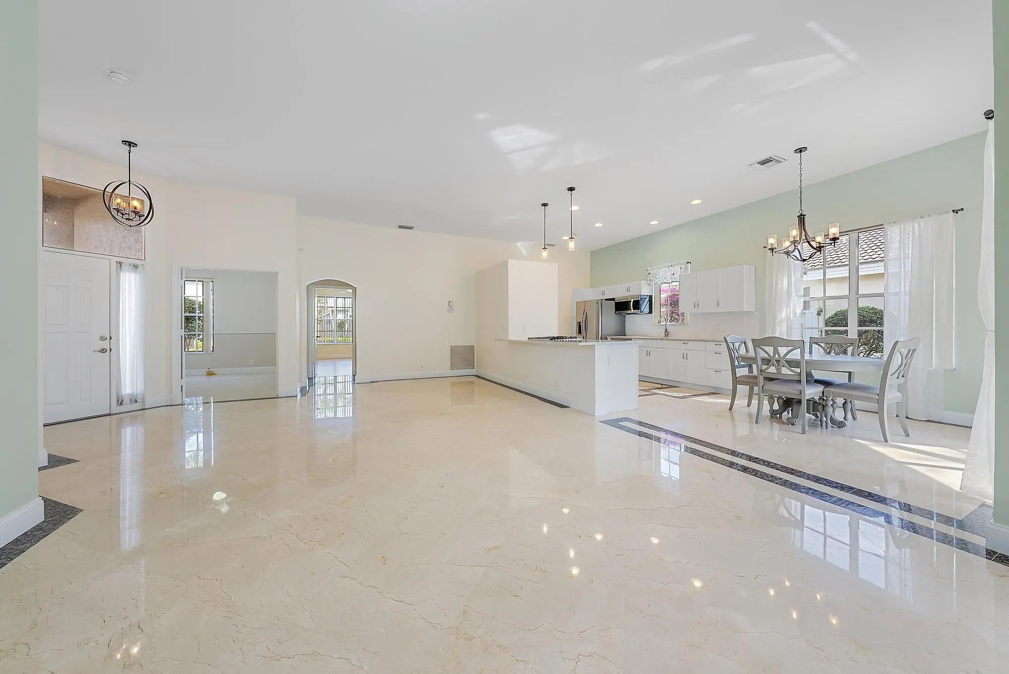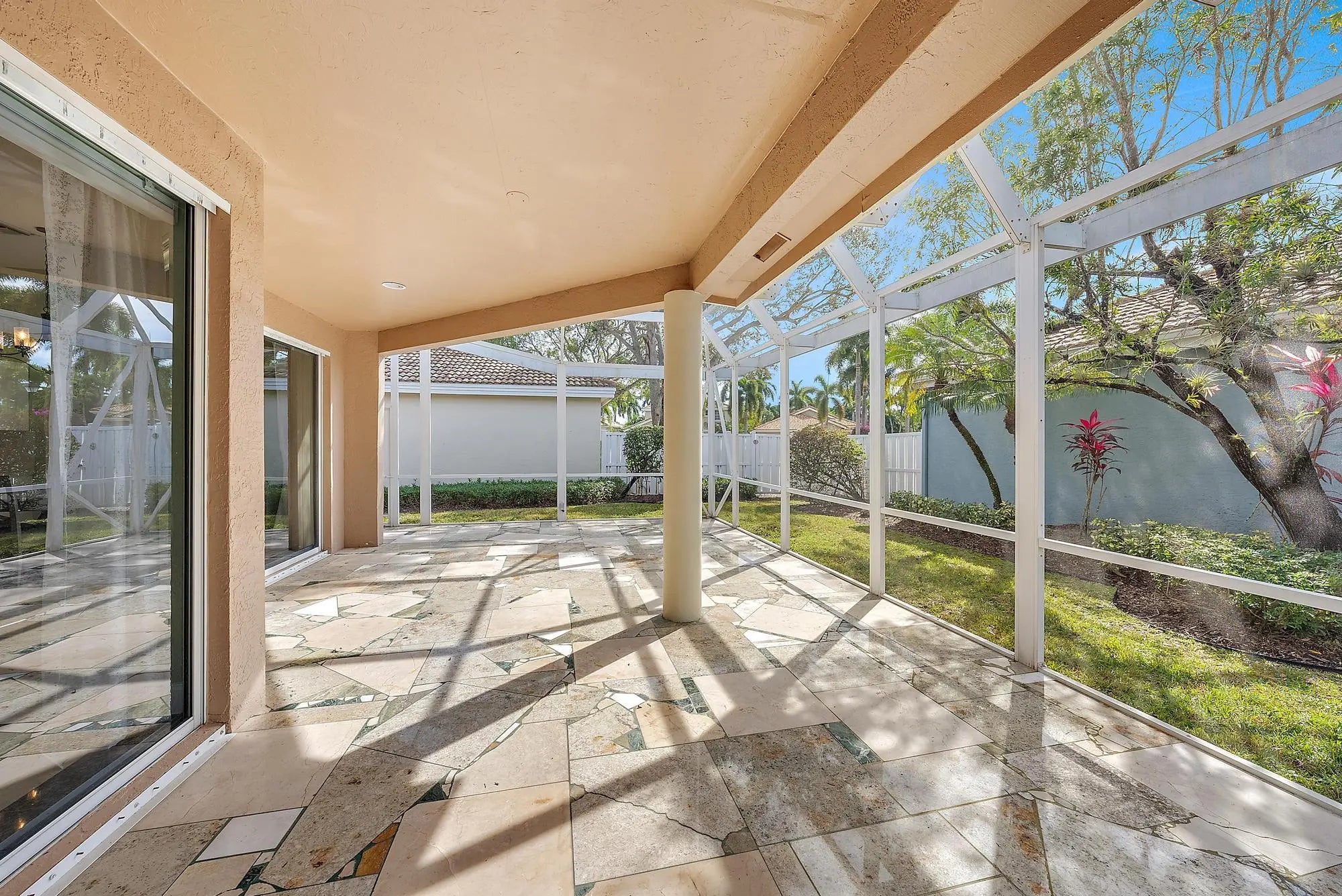 With a light and bright SOUTHERN EXPOSURE and private garden views, this renovated home boasts upscale and timeless marble flooring throughout, a NEWER ROOF (2016), NEWER A/C (2018 handler - 2024 compressor) and stunning renovations. This single-family 2BR/2BA features a spacious den or convertible bedroom. Nestled into a private and tranquil cul-de-sac lot, this home is located within walking distance or a quick golf cart ride to the Club at Ibis's world-class amenities. The kitchen has been opened up to create a fully open great room, with the living space graciously extending outdoors into the large screened patio, also adorned with marble flooring. In addition to the renovated kitchen, which boasts 2021 stainless appliances, both bathrooms have been elegantly remodeled.