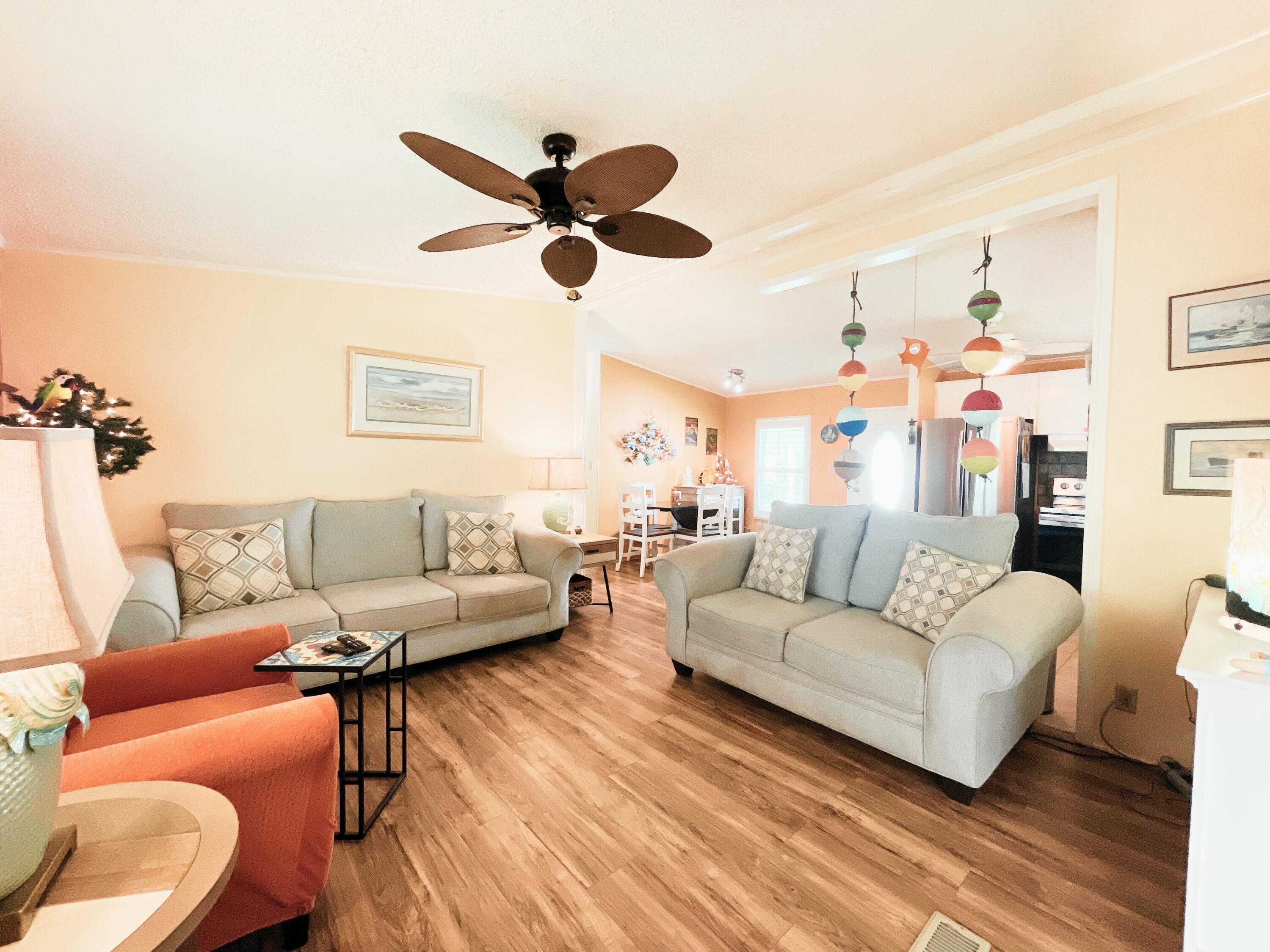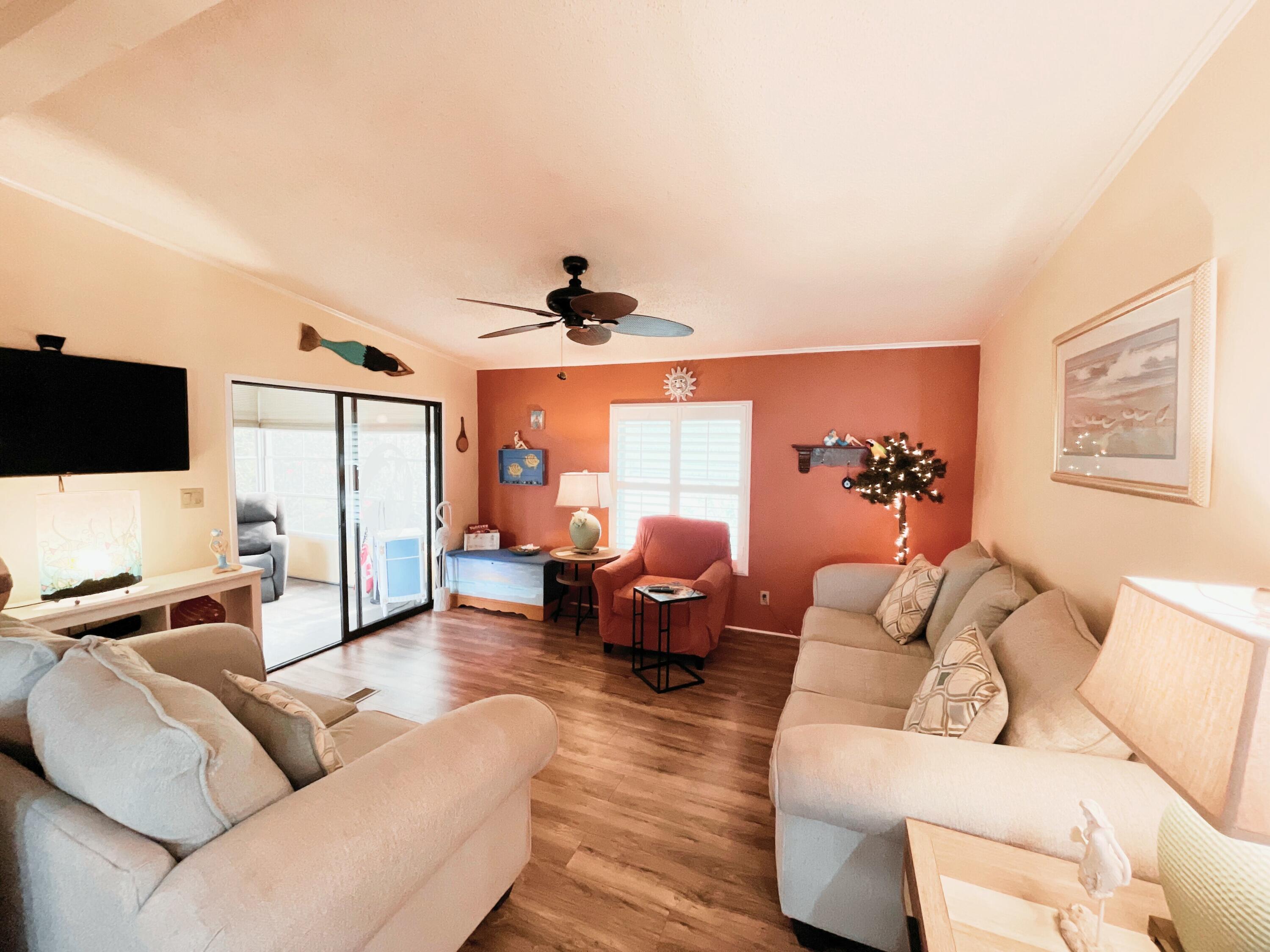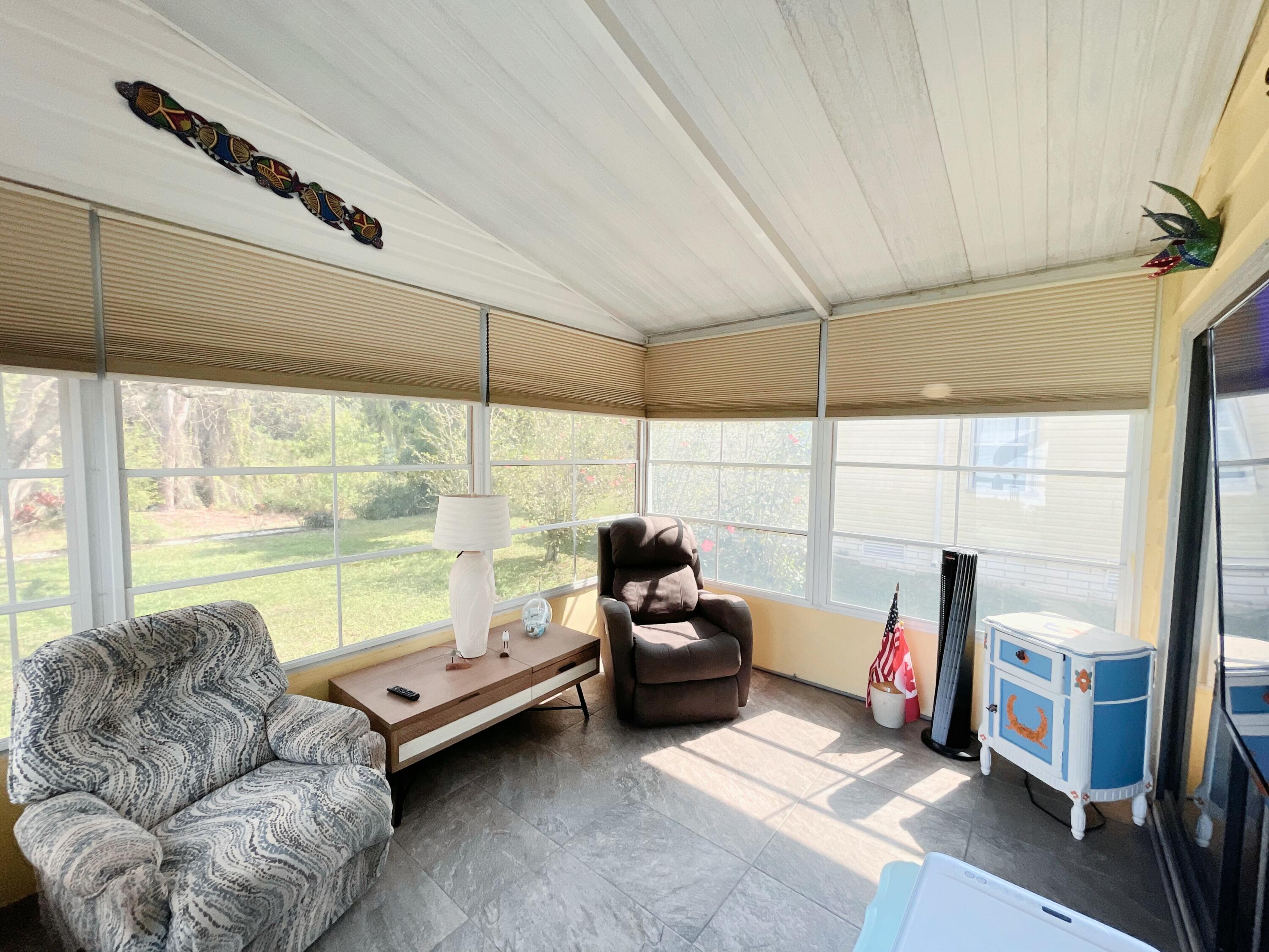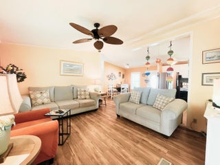 MOTIVATED SELLER! Bring your offers! Semi-private yard with tree-lined rear view. This 2-bedroom, 2-bath home in the sought-after Tropical Isles 55+ community offers comfort and modern updates. Featuring a 2021 AC, 2019 roof, and 2018 windows and doors, this home is well-maintained and ready for new owners. Both bathrooms were beautifully updated in 2018. The kitchen boasts new stainless steel appliances (no dishwasher), and the enclosed east-facing sun porch is perfect for enjoying morning coffee or peaceful afternoons. New plantation shutters add style and privacy throughout. A brand-new 2025 vapor barrier enhances durability. Outside, the double-wide driveway provides ample parking. Land lease is $608/month. Schedule your showing today.
