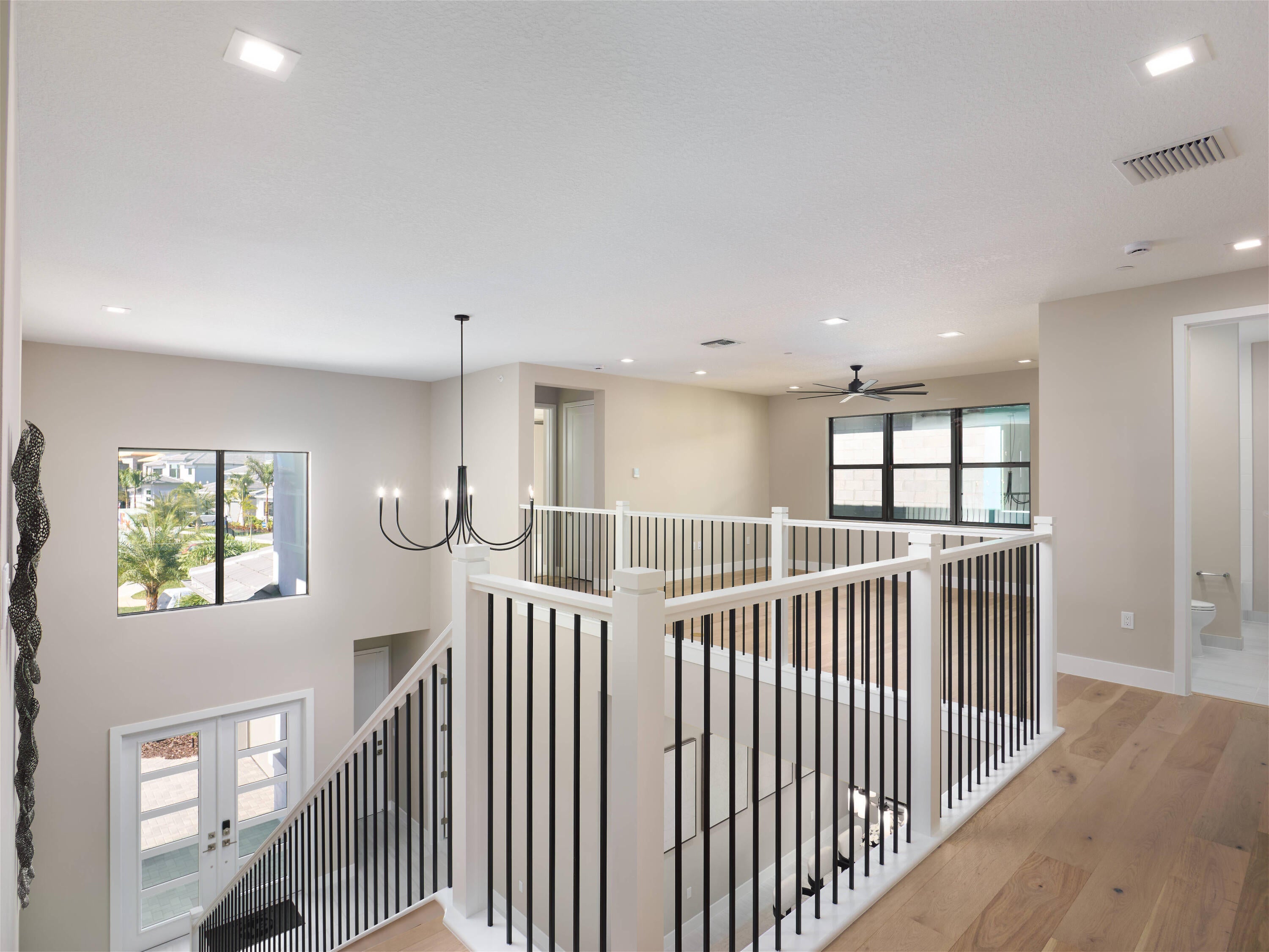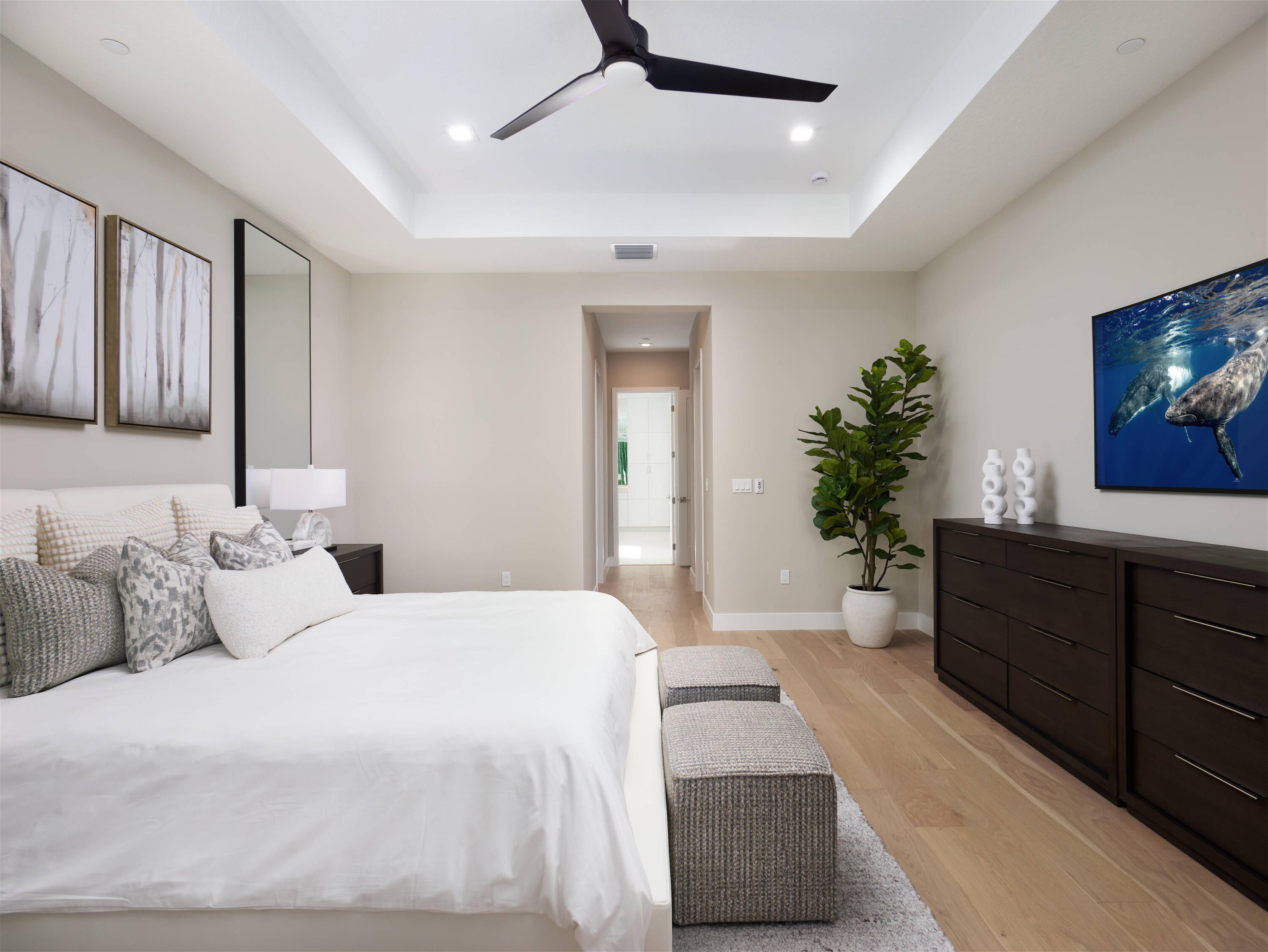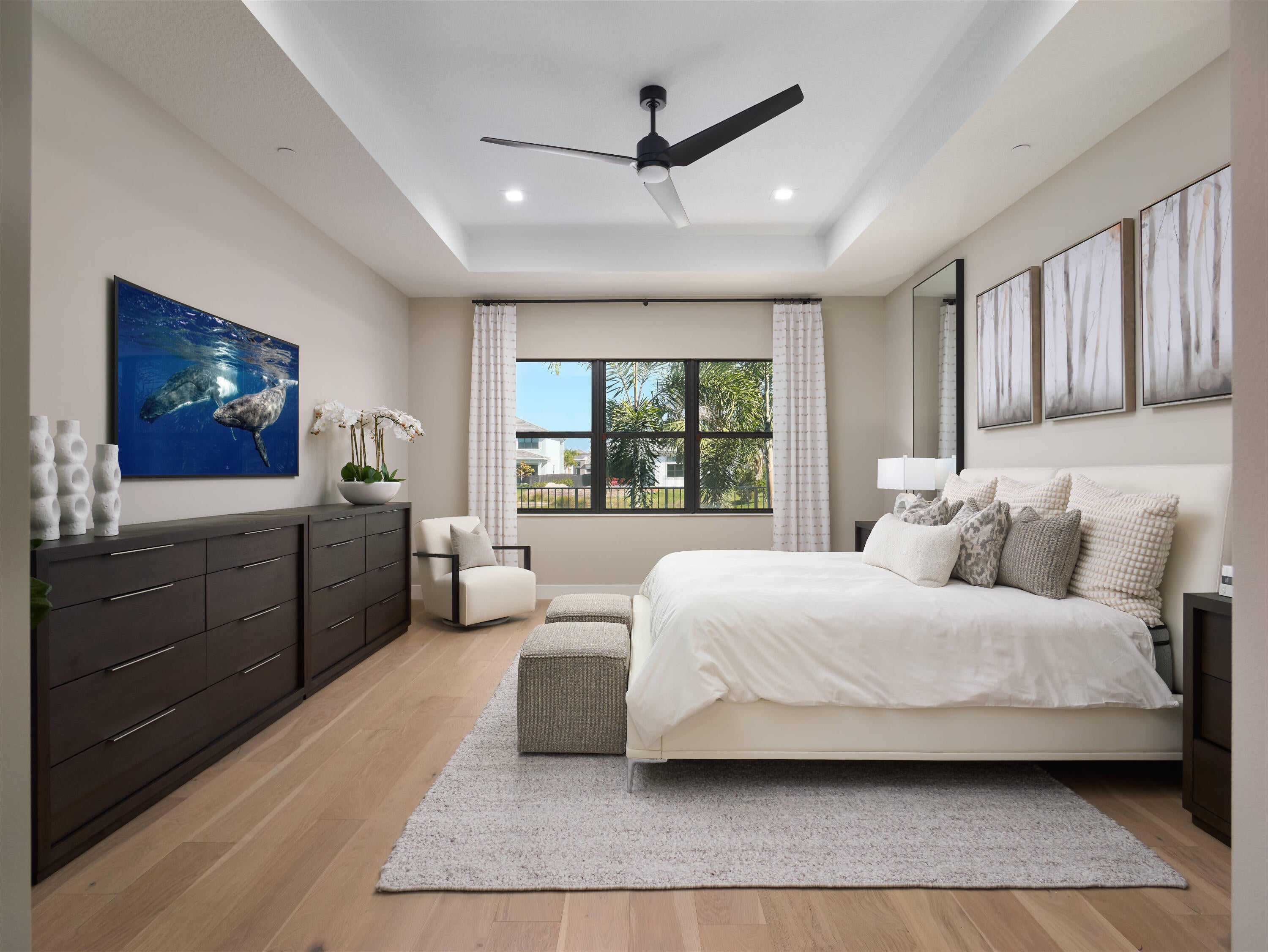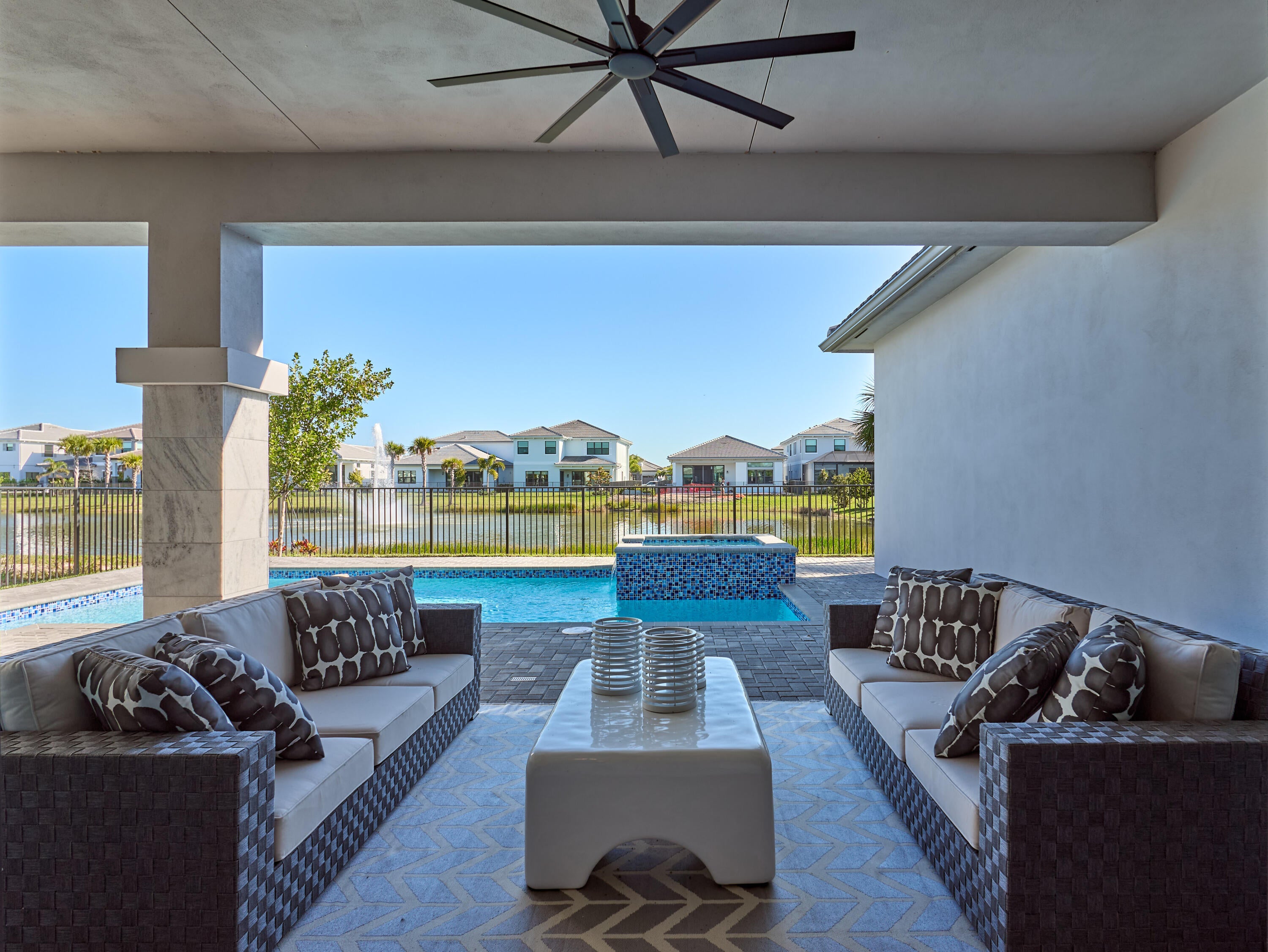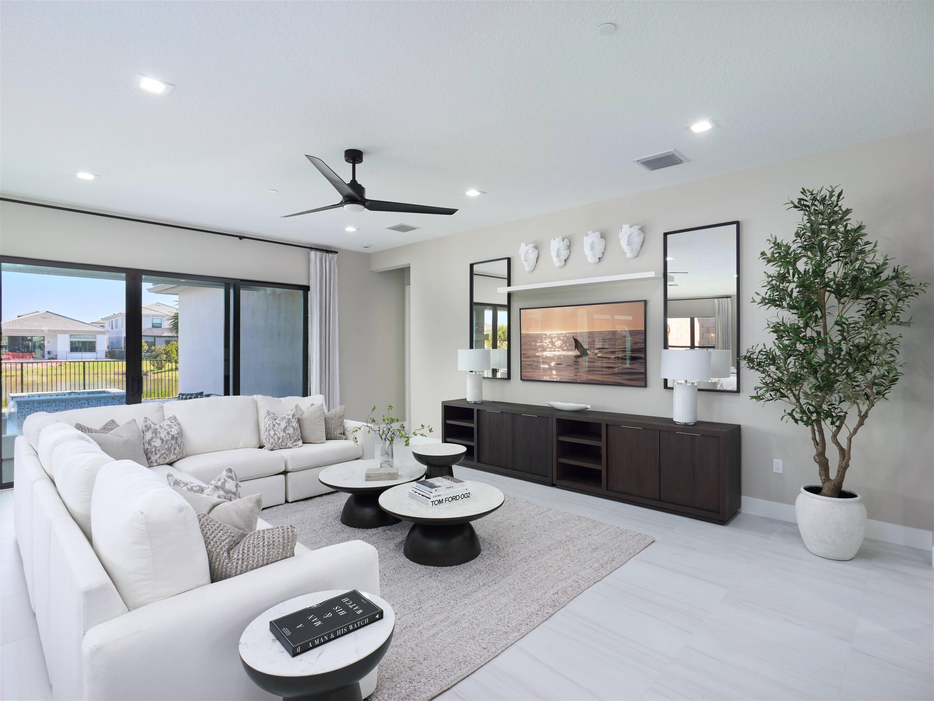 Modern Luxury in Apex at Avenir. Highly desirable Olympus model this 5 Bedrooms, 5.5 Baths, Den, Loft, Media Room, Split 3-car garage estate has all the features you need including a luxurious porcelain floor tile package in key areas, grand staircase, gourmet kitchen featuring upgraded cabinetry and sleek quartz countertops with a flat polished edge, complemented by a full backsplash. This culinary haven is equipped with a GE appliance package, including a gas cooktop, and boasts a spacious kitchen island with seating, making it perfect for both cooking and entertaining. The laundry room offers an upgraded cabinet package with quartz countertops, and a built-in laundry sink for added convenience.Standard manufacturer warranties on all appliances, the air conditioning compressor, and the air handler unit. For modern security and connectivity, the home comes equipped with an in-home wireless alarm system, featuring wireless magnet contacts on all operable windows and doors (excluding exterior garage doors), along with a 7" touchpad and a secondary auxiliary touchpad placed according to the purchaser's specifications. The garage includes 20 AMP dedicated receptacles for a future refrigerator, while a USB/C receptacle is conveniently located in both the kitchen and primary bedroom. An empty conduit from the electric panel to the garage is also in place for future EV charger installation. Exceptional Lifestyle and ideal proximity to all the best parts of Palm Beach County!