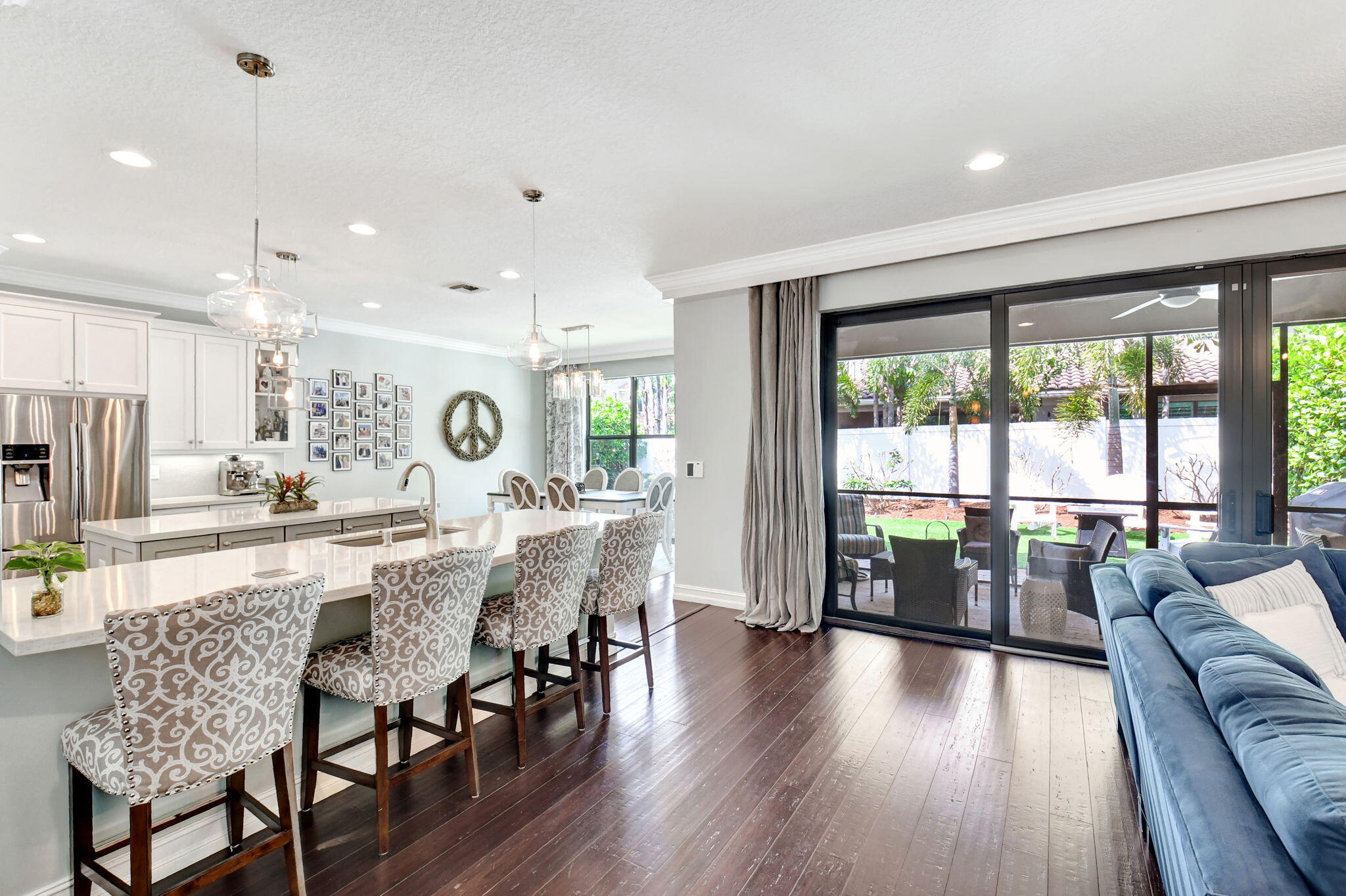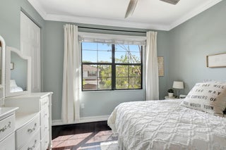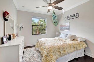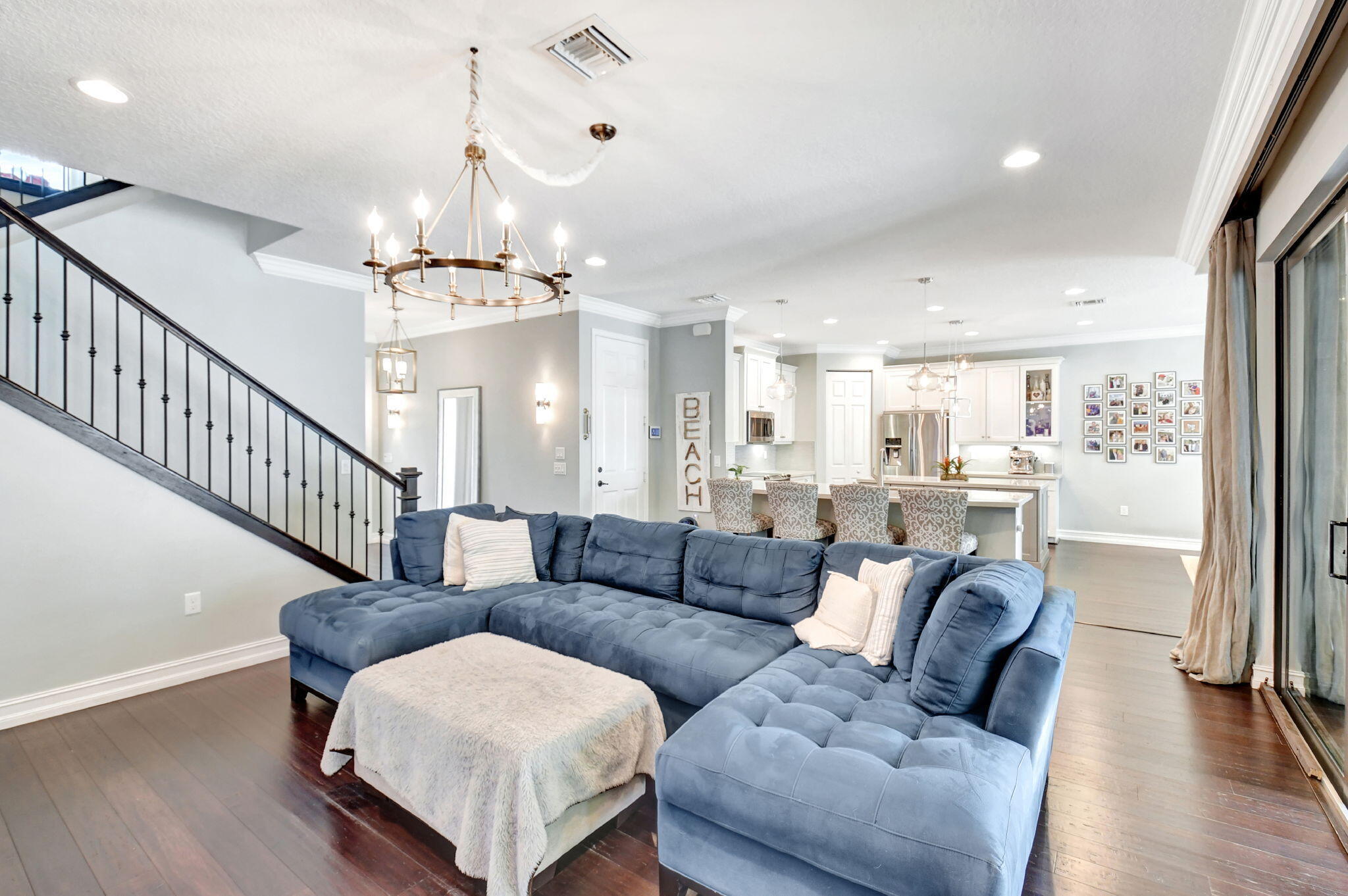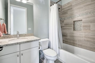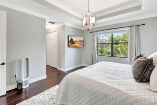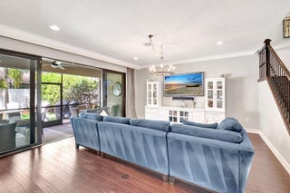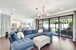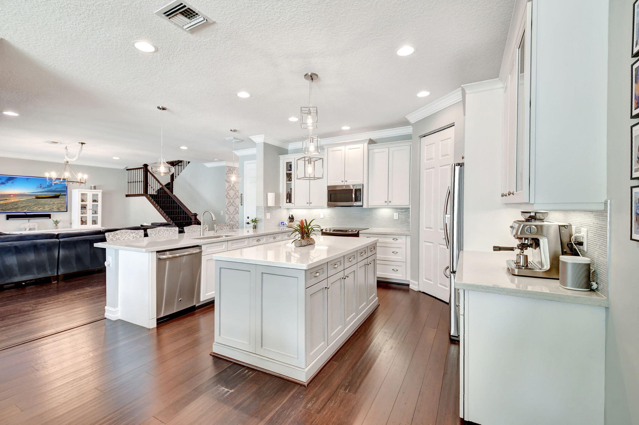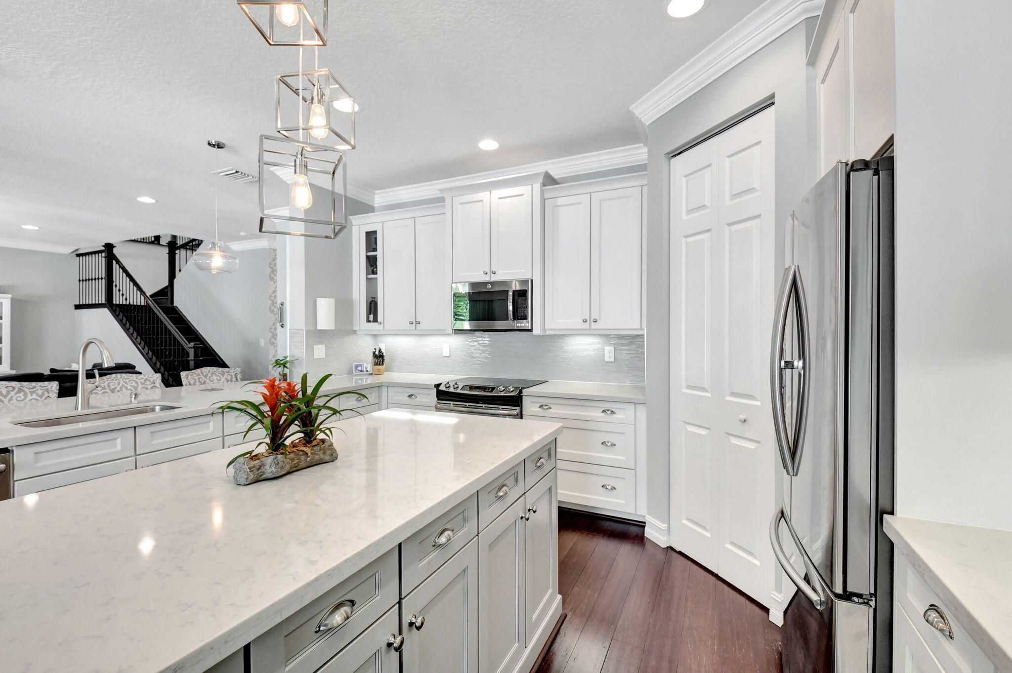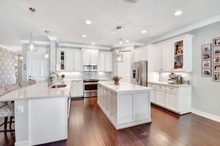This elegant 4-bedroom, 3-bathroom home features a spacious open-concept layout with family, dining, and kitchen areas. One bedroom and full bath are located downstairs, while an expansive loft is upstairs. The chef's kitchen boasts 42'' white soft-close cabinetry, a grey center island, quartz countertops, a glass tile backsplash, and upgraded stainless appliances. The master suite includes a coffered ceiling, built-out closets, and a luxurious bath with dual vanities, a Roman tub, and a shower. Additional features include impact windows, a wrought iron staircase, keyless entry, and espresso bamboo flooring. The extended screened-in patio with pavers and private fenced yard completes this home.
