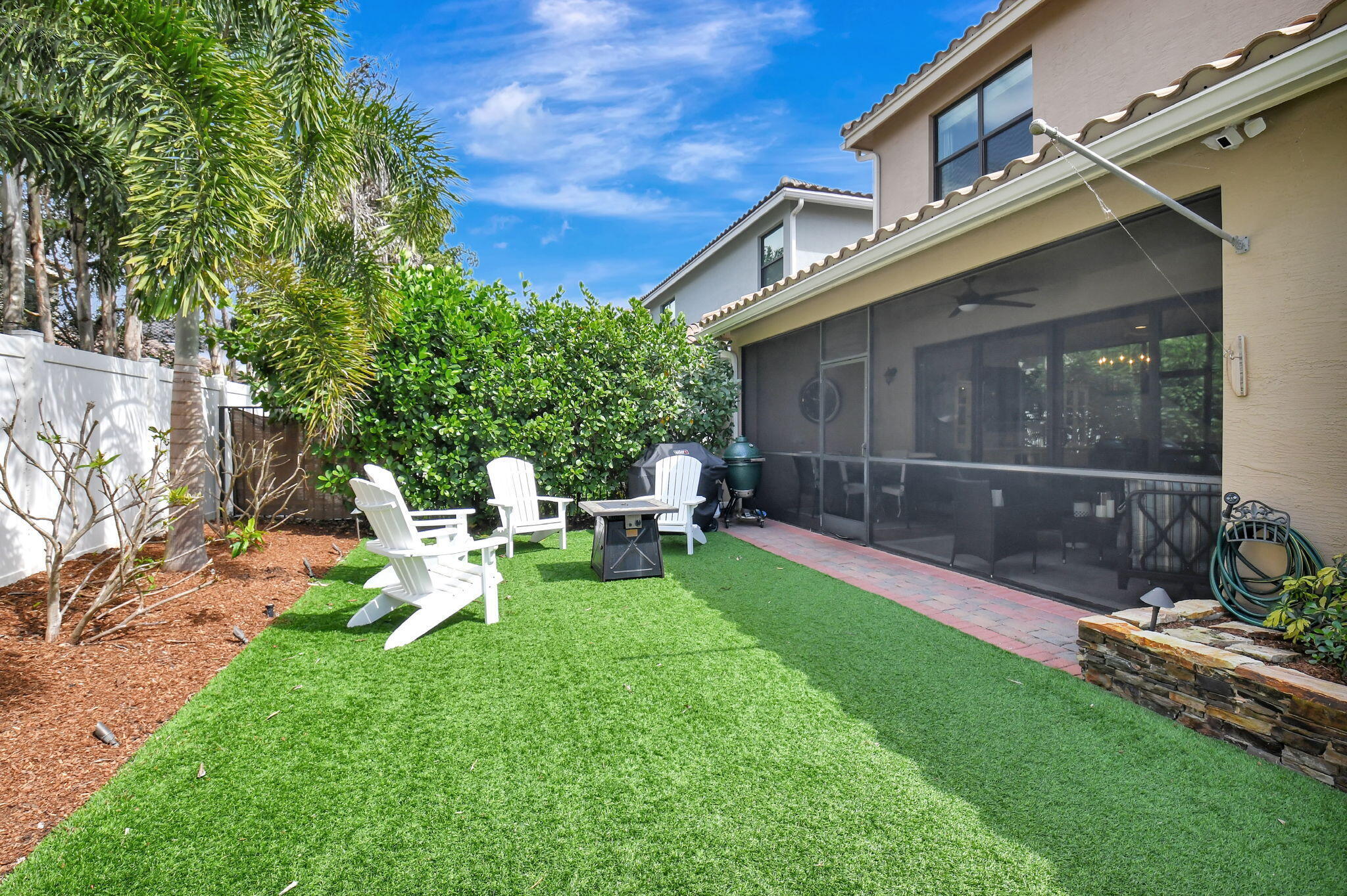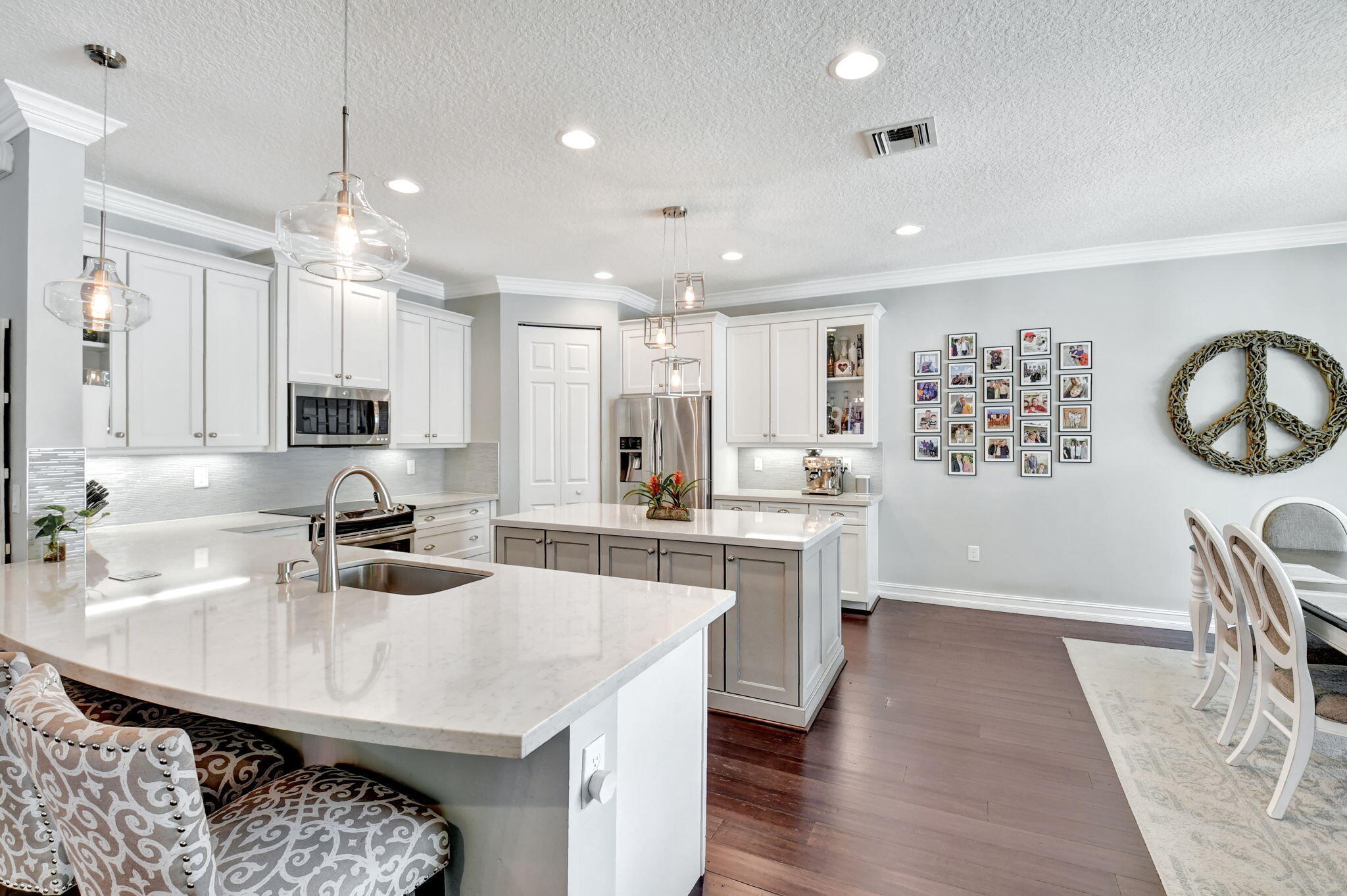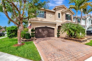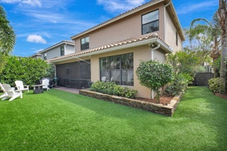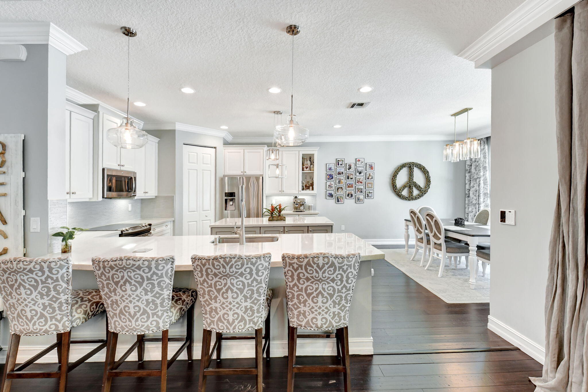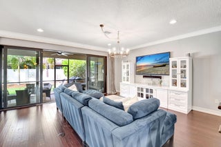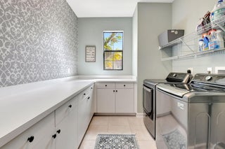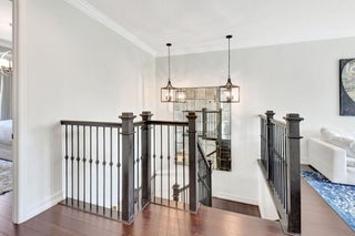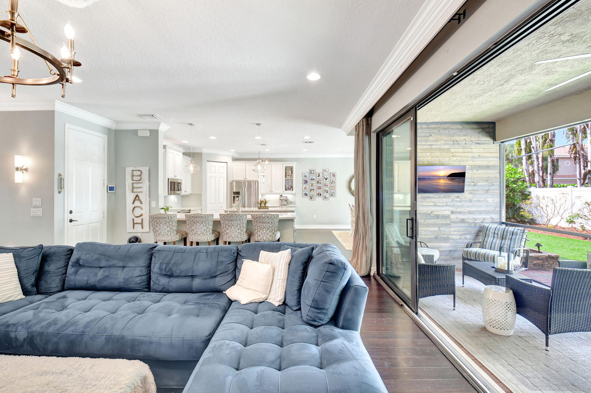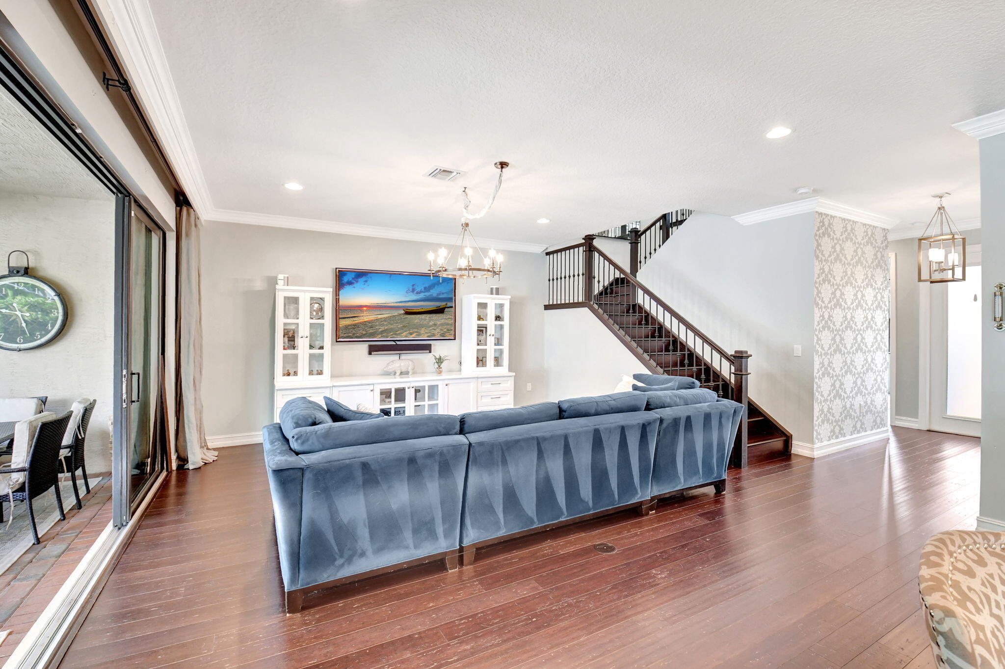 This elegant 4-bedroom, 3-bathroom home features a spacious open-concept layout with family, dining, and kitchen areas. One bedroom and full bath are located downstairs, while an expansive loft is upstairs. The chef's kitchen boasts 42'' white soft-close cabinetry, a grey center island, quartz countertops, a glass tile backsplash, and upgraded stainless appliances. The master suite includes a coffered ceiling, built-out closets, and a luxurious bath with dual vanities, a Roman tub, and a shower. Additional features include impact windows, a wrought iron staircase, keyless entry, and espresso bamboo flooring. The extended screened-in patio with pavers and private fenced yard completes this home.