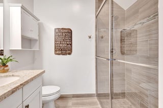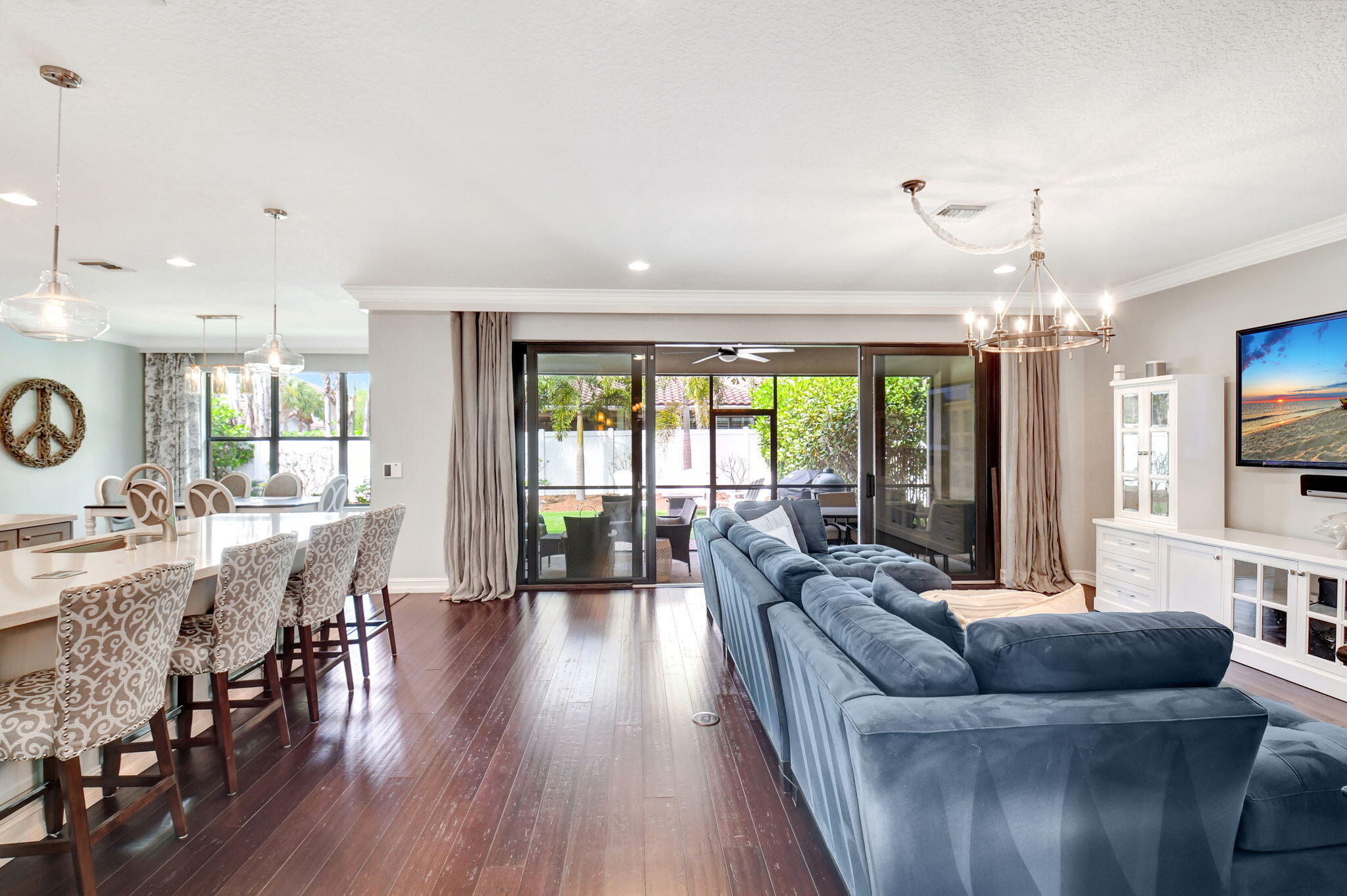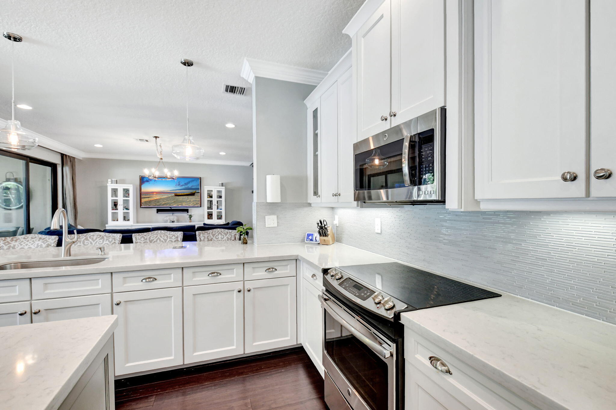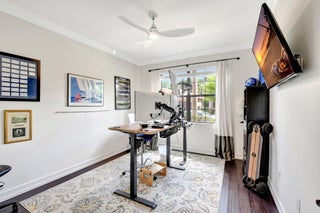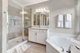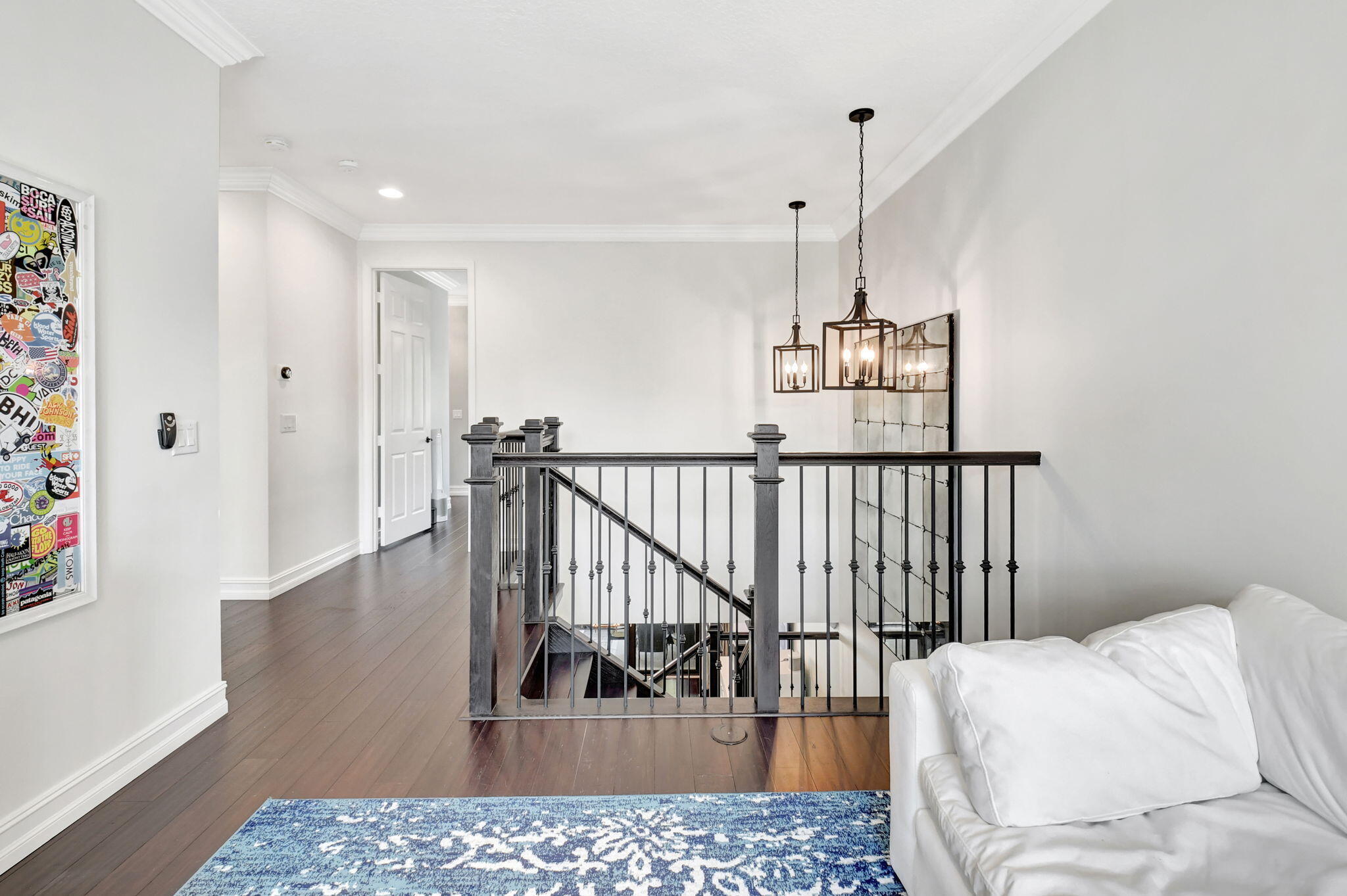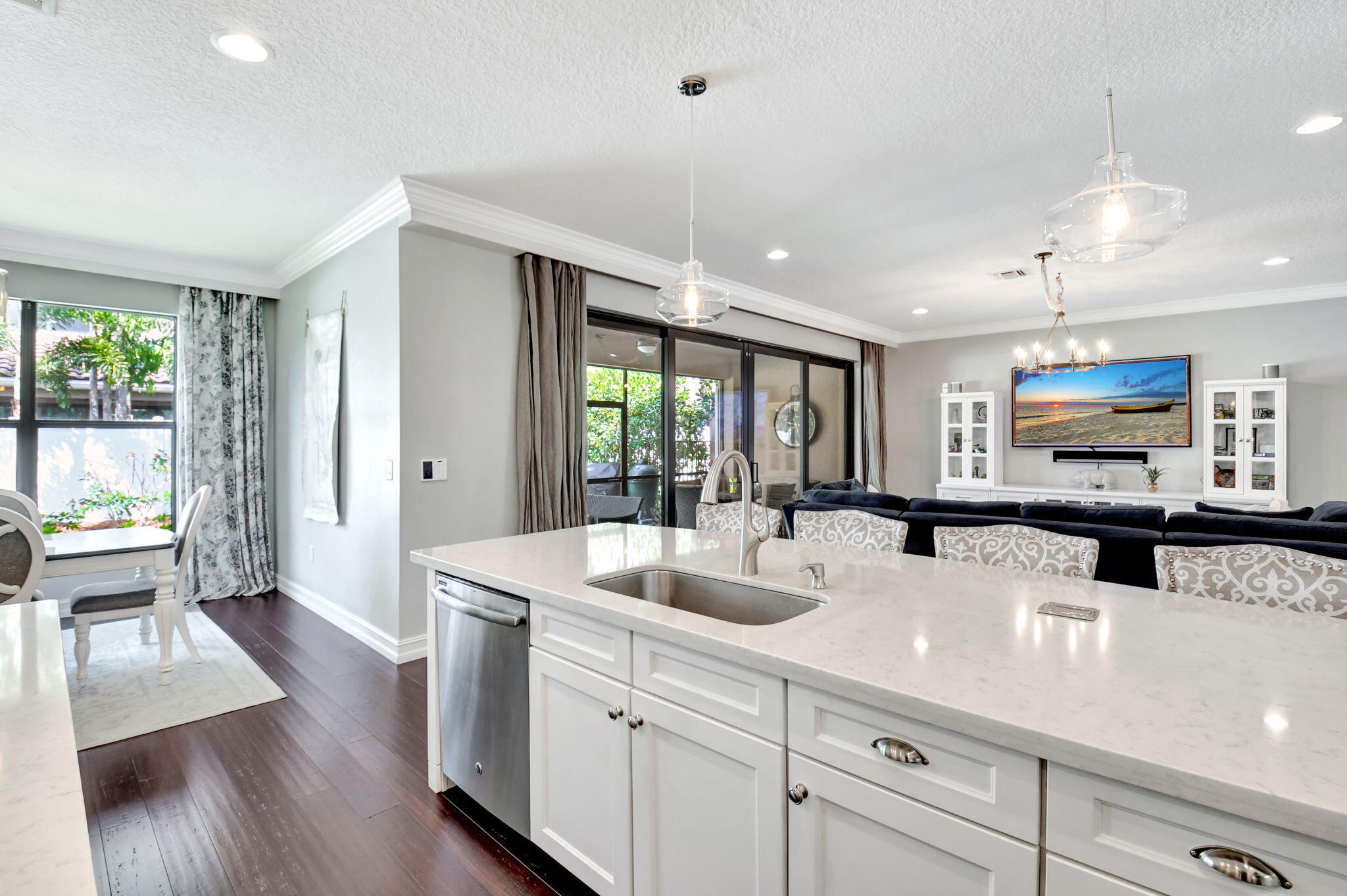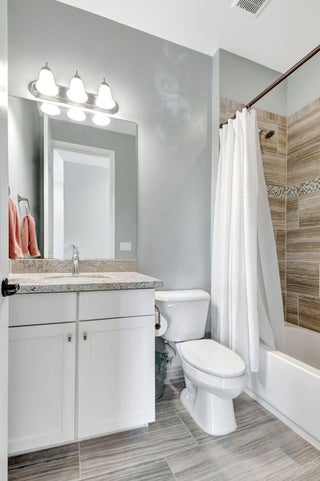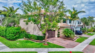 This elegant 4-bedroom, 3-bathroom home features a spacious open-concept layout with family, dining, and kitchen areas. One bedroom and full bath are located downstairs, while an expansive loft is upstairs. The chef's kitchen boasts 42'' white soft-close cabinetry, a grey center island, quartz countertops, a glass tile backsplash, and upgraded stainless appliances. The master suite includes a coffered ceiling, built-out closets, and a luxurious bath with dual vanities, a Roman tub, and a shower. Additional features include impact windows, a wrought iron staircase, keyless entry, and espresso bamboo flooring. The extended screened-in patio with pavers and private fenced yard completes this home.