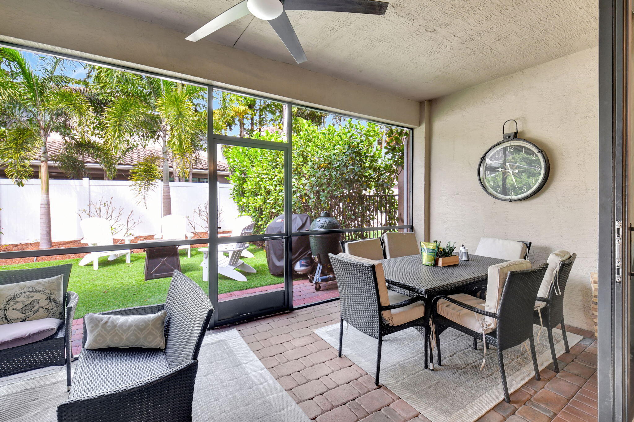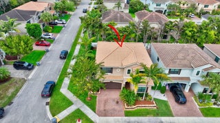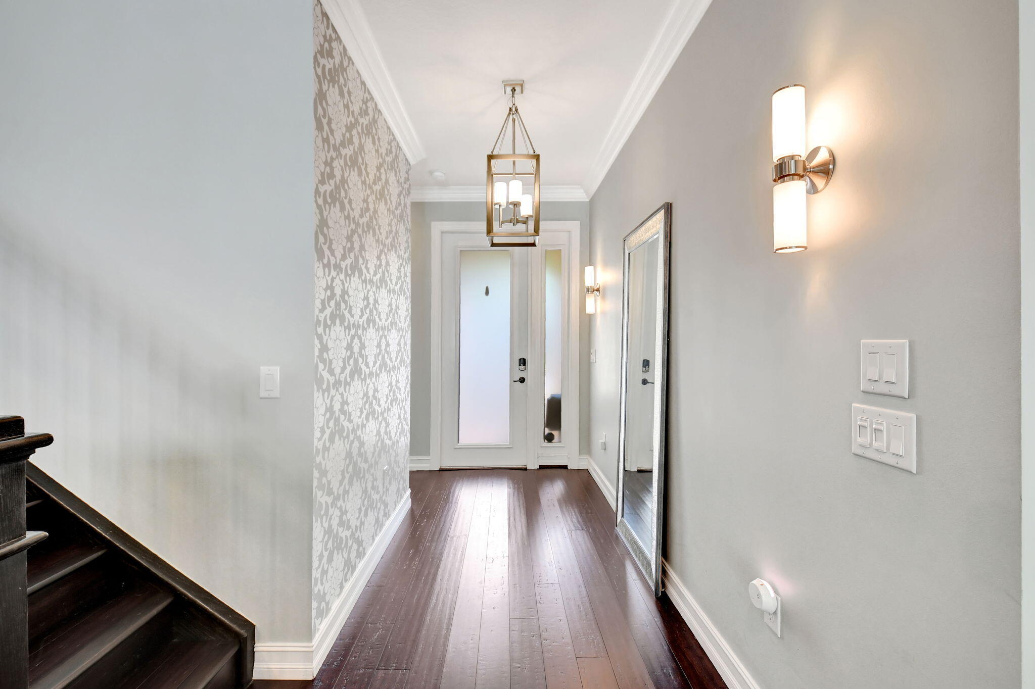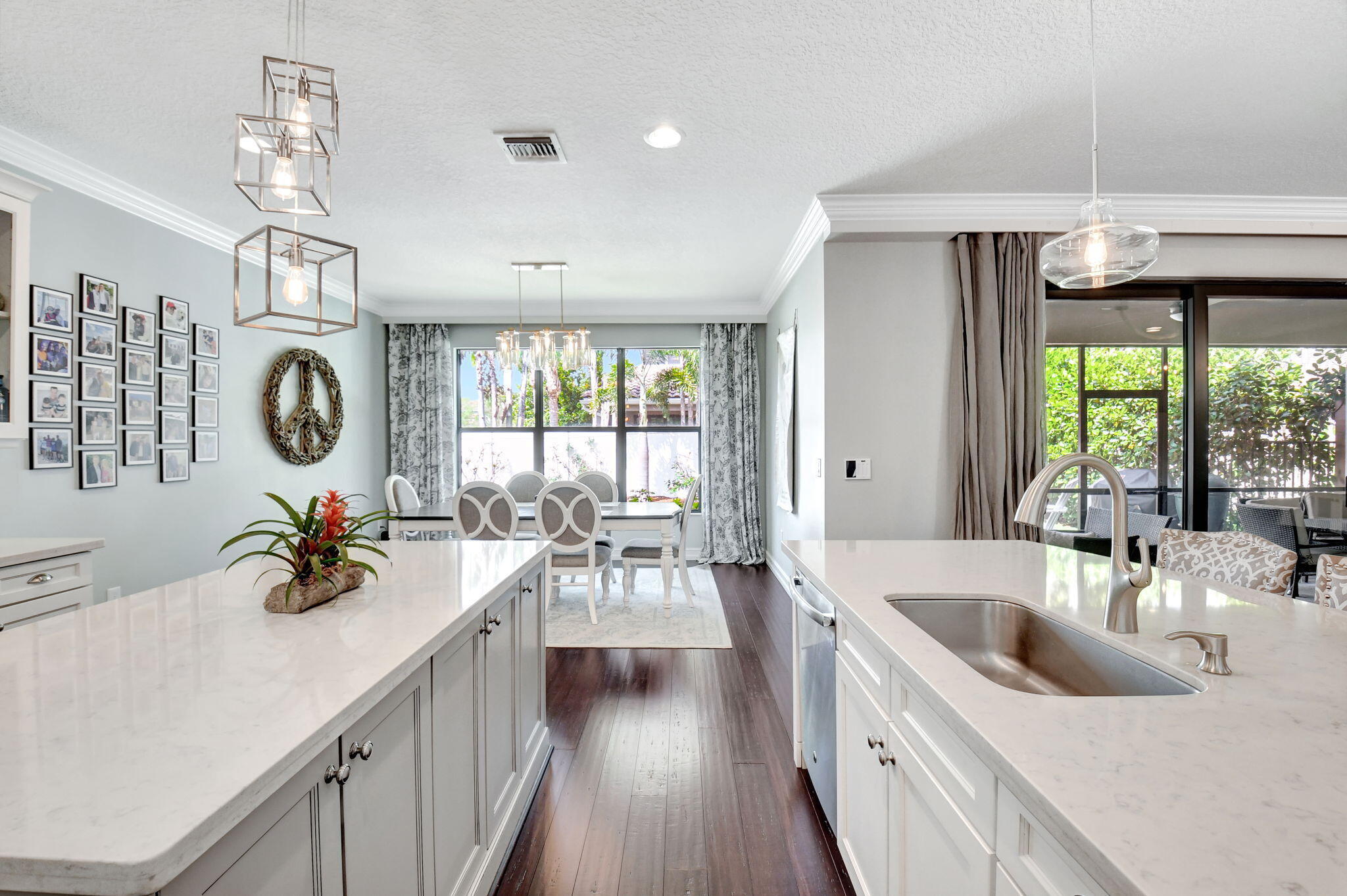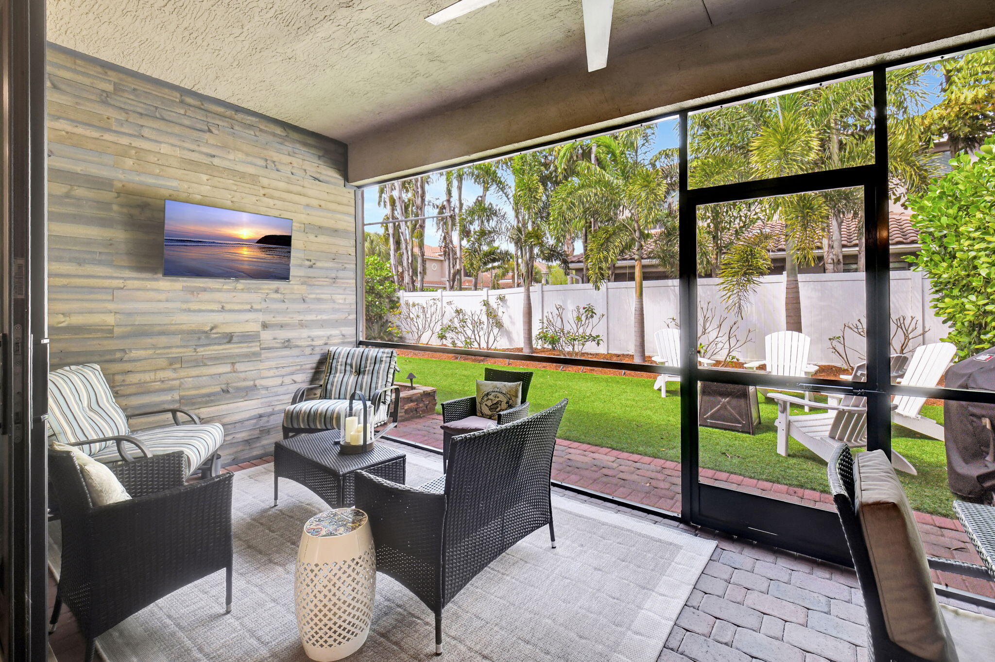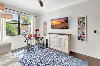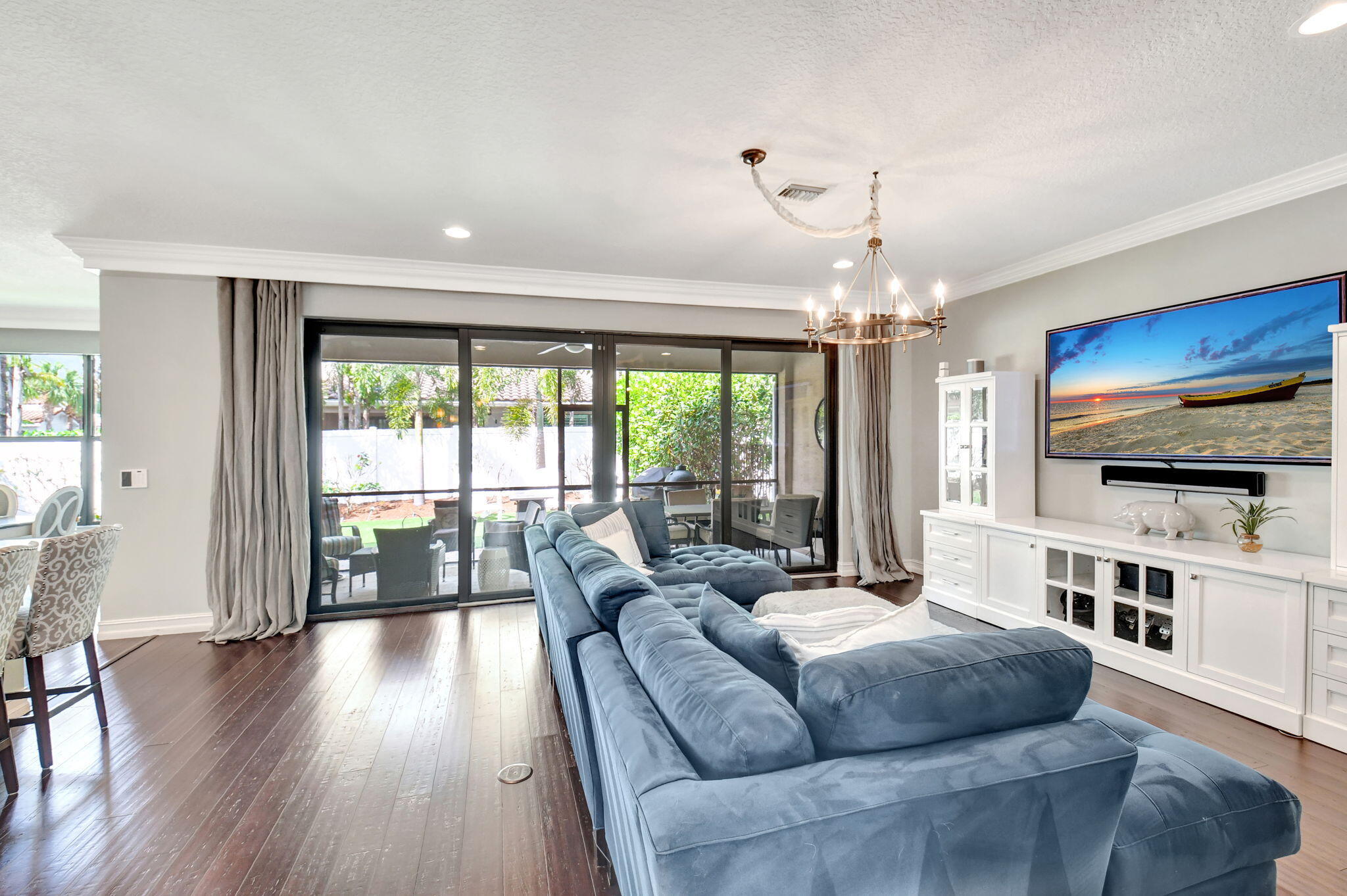 This elegant 4-bedroom, 3-bathroom home features a spacious open-concept layout with family, dining, and kitchen areas. One bedroom and full bath are located downstairs, while an expansive loft is upstairs. The chef's kitchen boasts 42'' white soft-close cabinetry, a grey center island, quartz countertops, a glass tile backsplash, and upgraded stainless appliances. The master suite includes a coffered ceiling, built-out closets, and a luxurious bath with dual vanities, a Roman tub, and a shower. Additional features include impact windows, a wrought iron staircase, keyless entry, and espresso bamboo flooring. The extended screened-in patio with pavers and private fenced yard completes this home.
