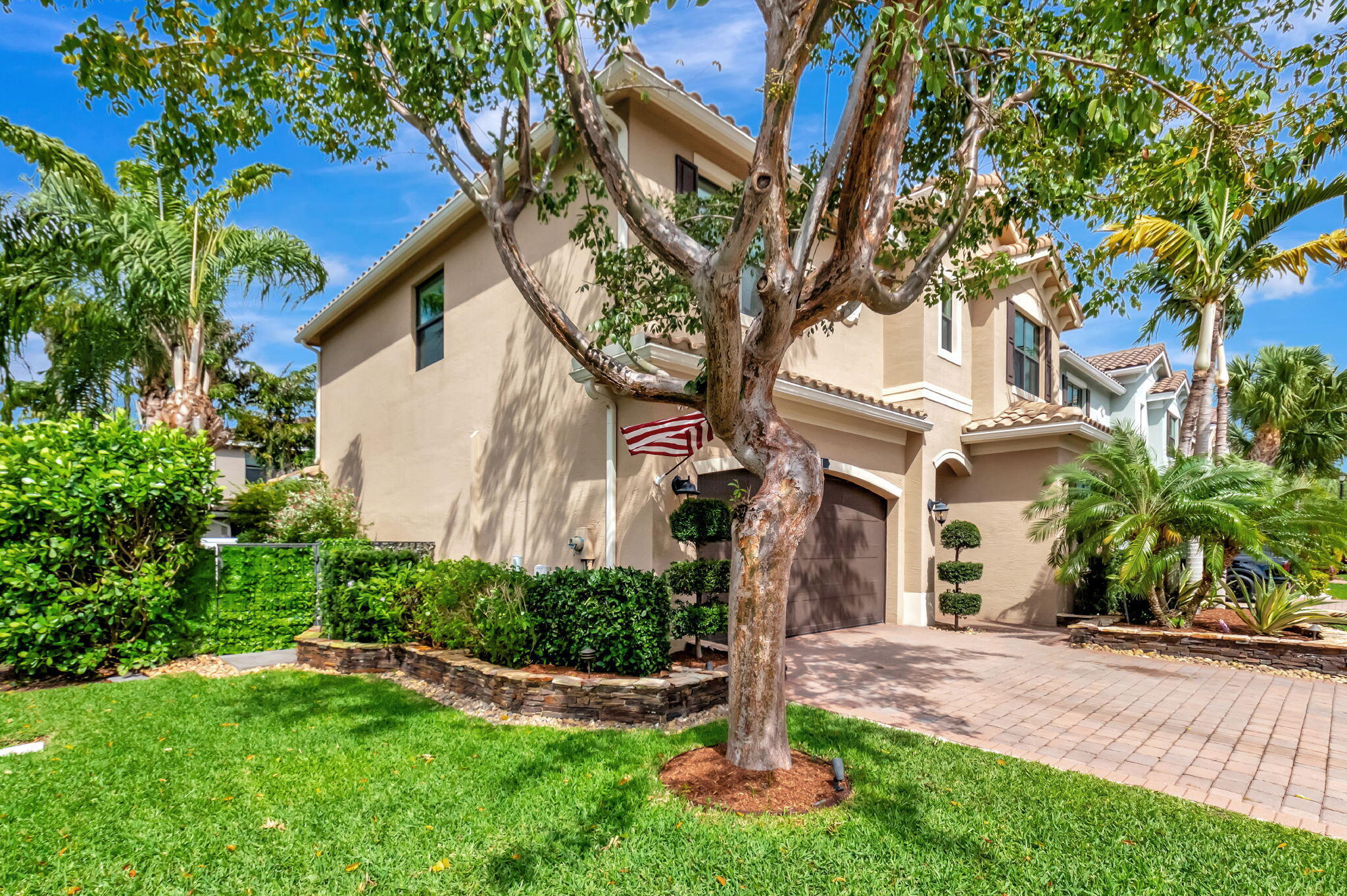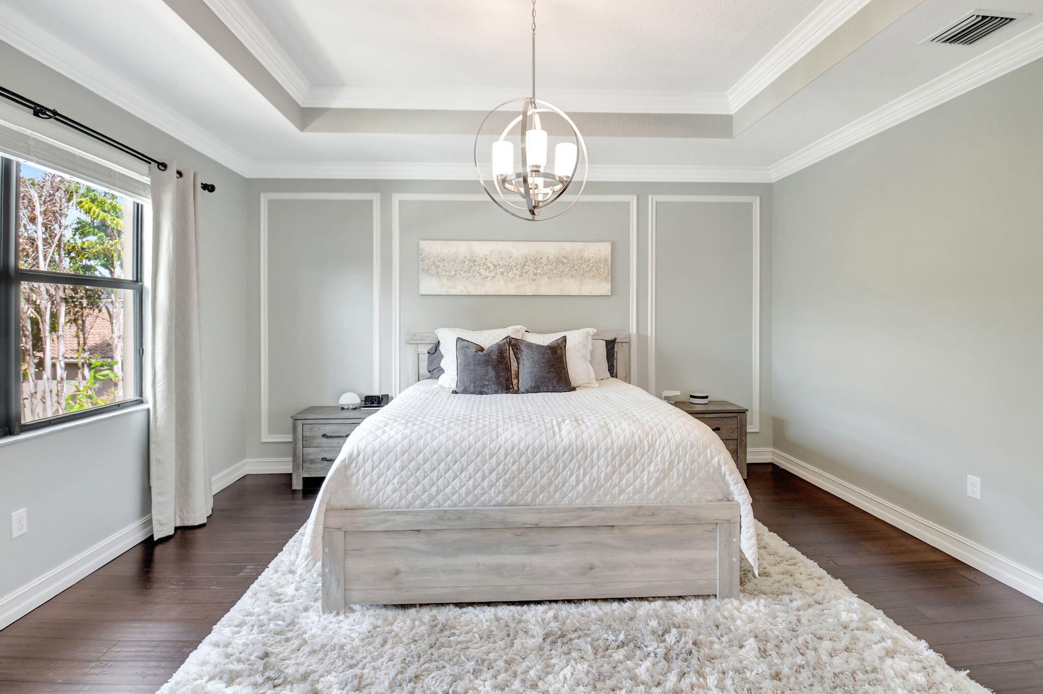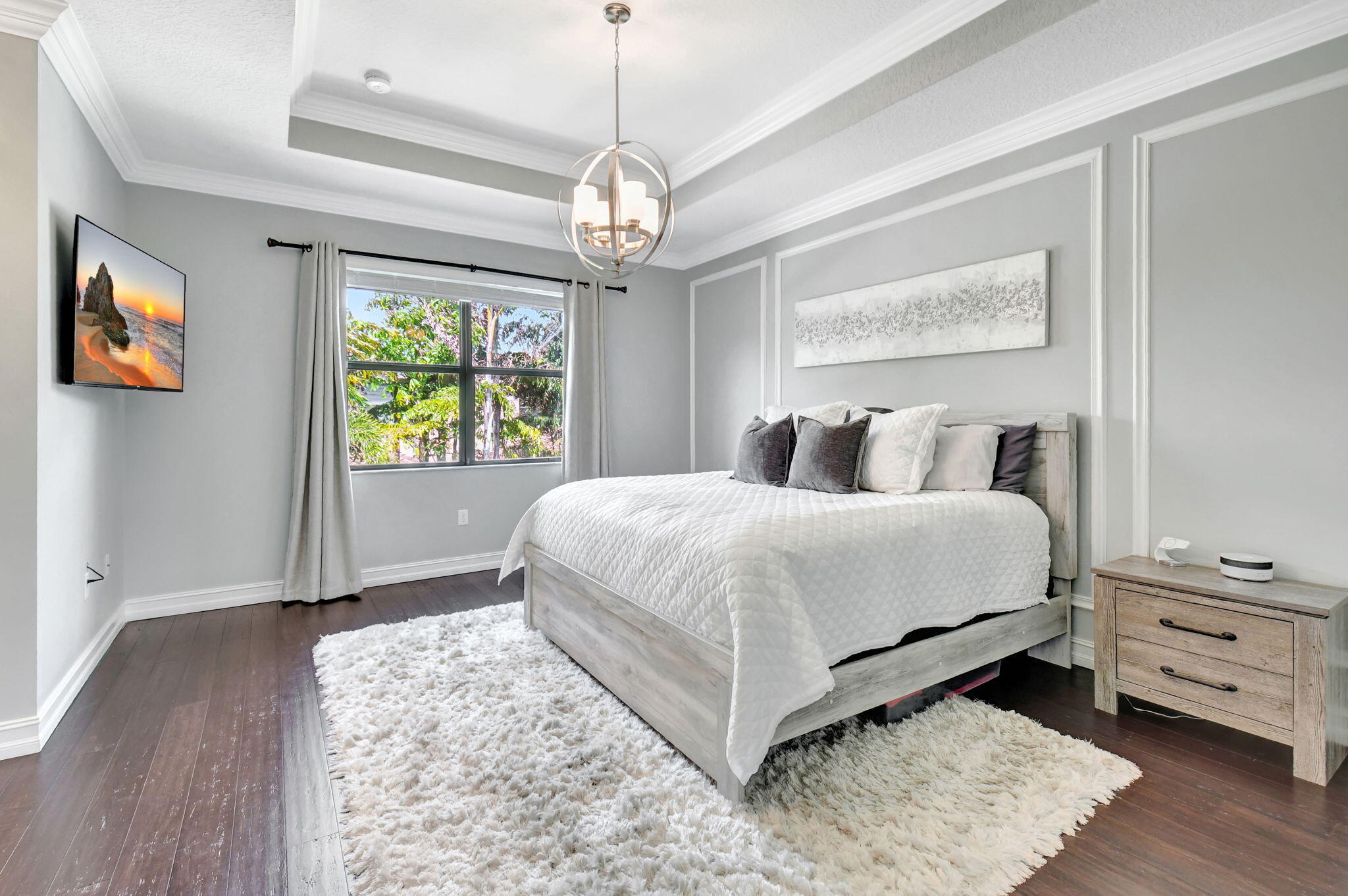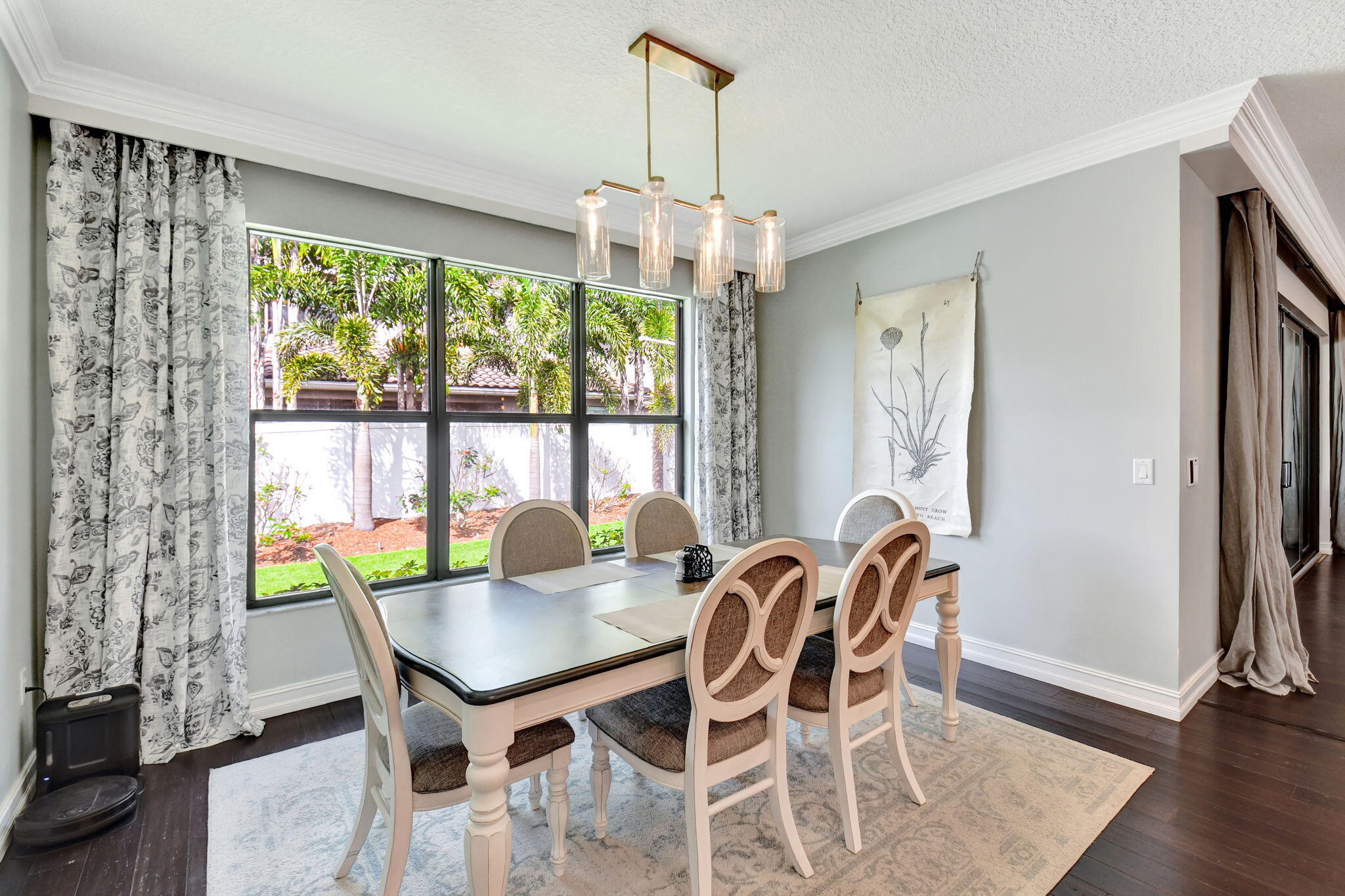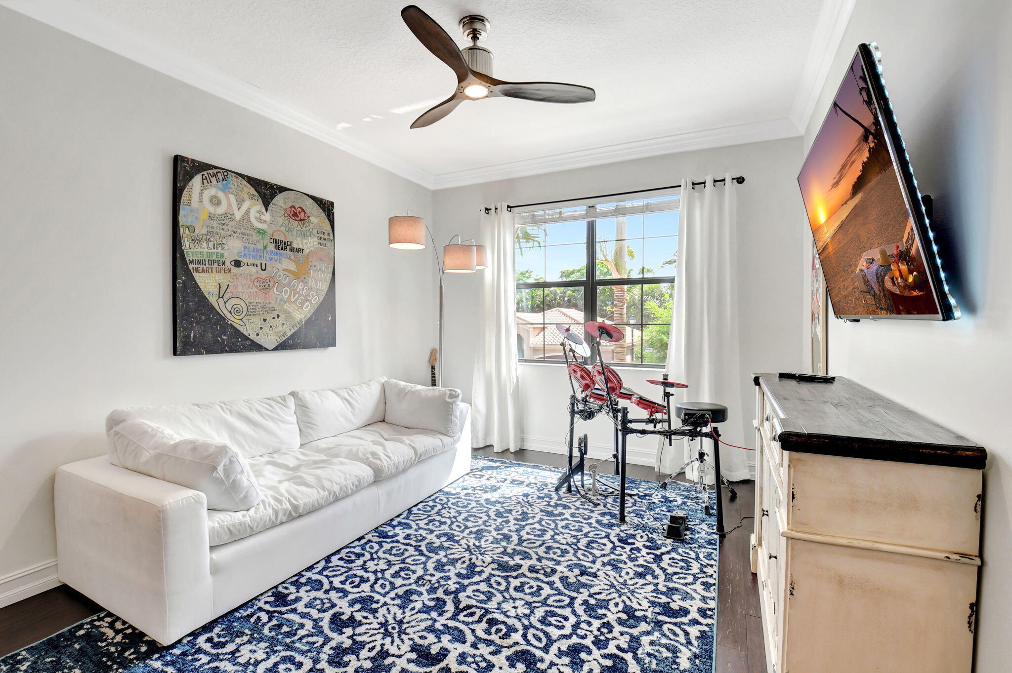 This elegant 4-bedroom, 3-bathroom home features a spacious open-concept layout with family, dining, and kitchen areas. One bedroom and full bath are located downstairs, while an expansive loft is upstairs. The chef's kitchen boasts 42'' white soft-close cabinetry, a grey center island, quartz countertops, a glass tile backsplash, and upgraded stainless appliances. The master suite includes a coffered ceiling, built-out closets, and a luxurious bath with dual vanities, a Roman tub, and a shower. Additional features include impact windows, a wrought iron staircase, keyless entry, and espresso bamboo flooring. The extended screened-in patio with pavers and private fenced yard completes this home.