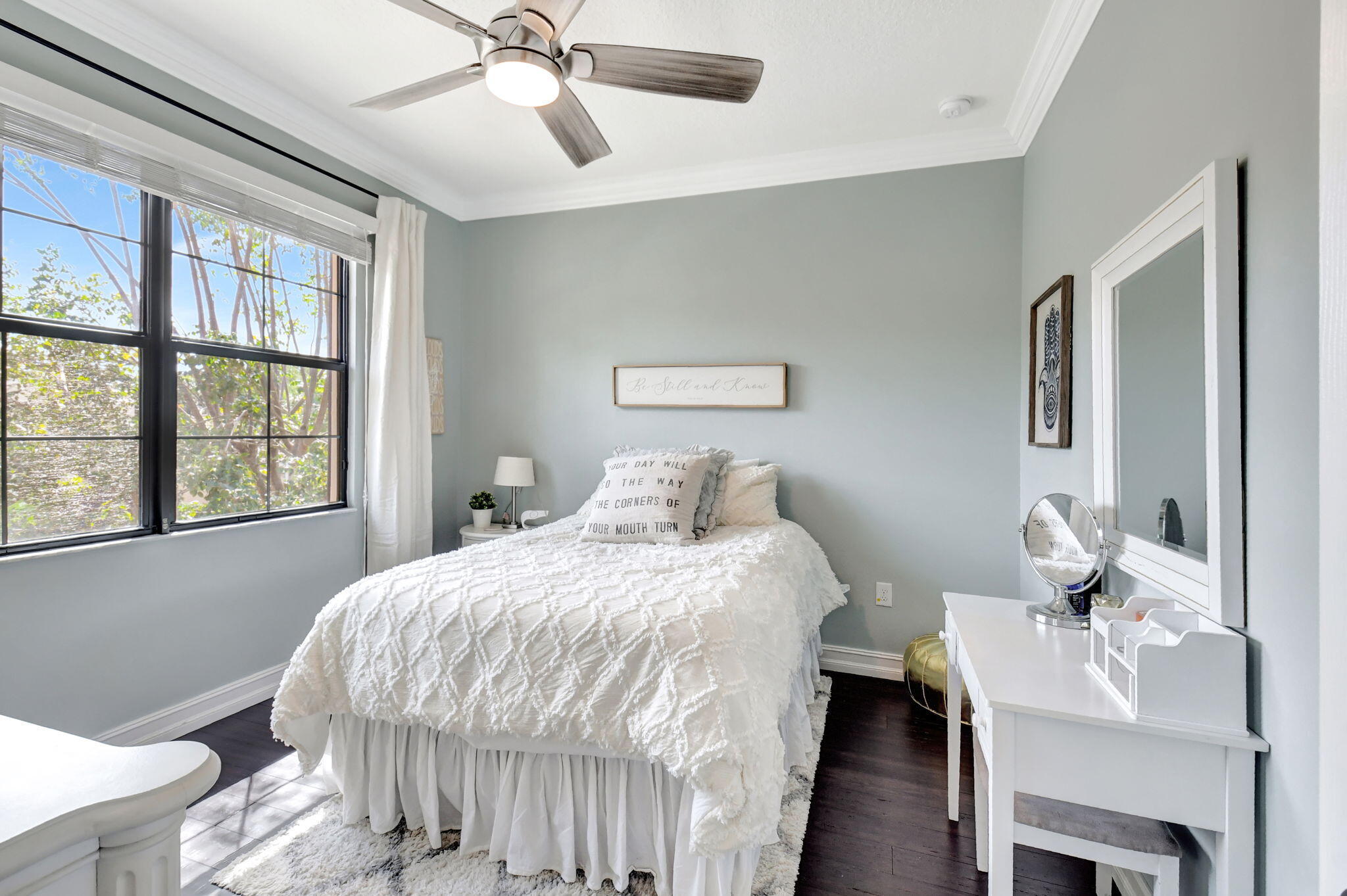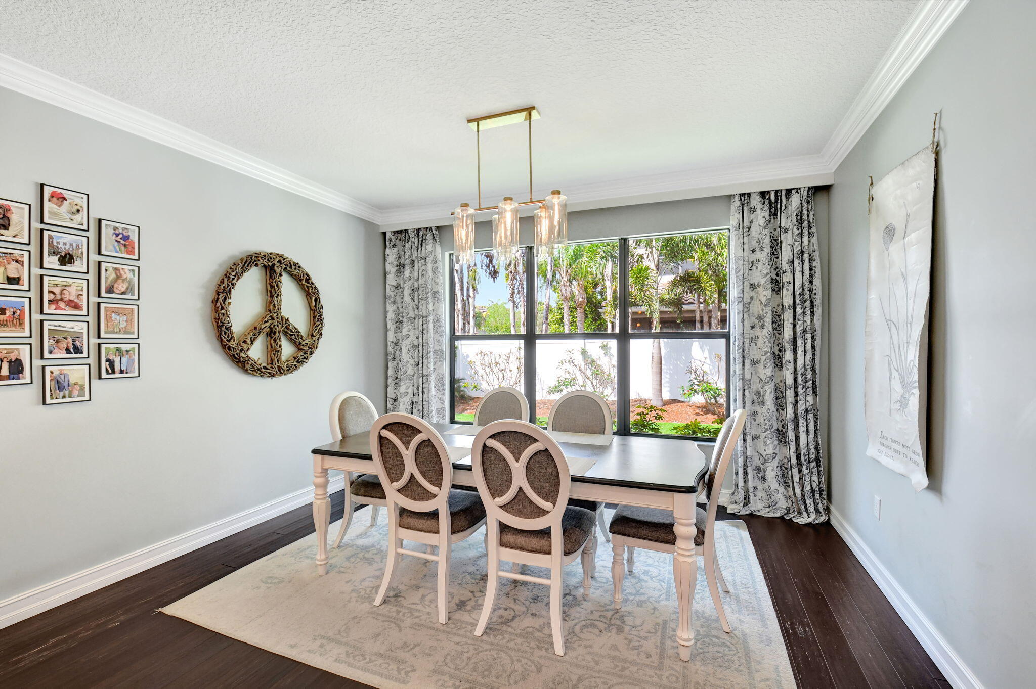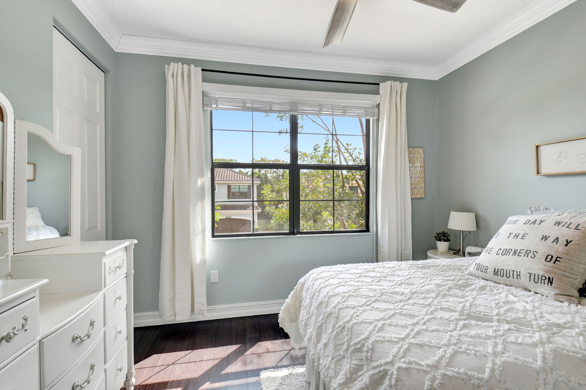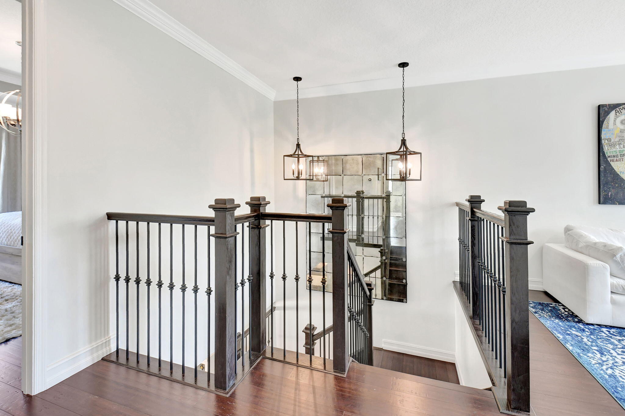 This elegant 4-bedroom, 3-bathroom home features a spacious open-concept layout with family, dining, and kitchen areas. One bedroom and full bath are located downstairs, while an expansive loft is upstairs. The chef's kitchen boasts 42'' white soft-close cabinetry, a grey center island, quartz countertops, a glass tile backsplash, and upgraded stainless appliances. The master suite includes a coffered ceiling, built-out closets, and a luxurious bath with dual vanities, a Roman tub, and a shower. Additional features include impact windows, a wrought iron staircase, keyless entry, and espresso bamboo flooring. The extended screened-in patio with pavers and private fenced yard completes this home.