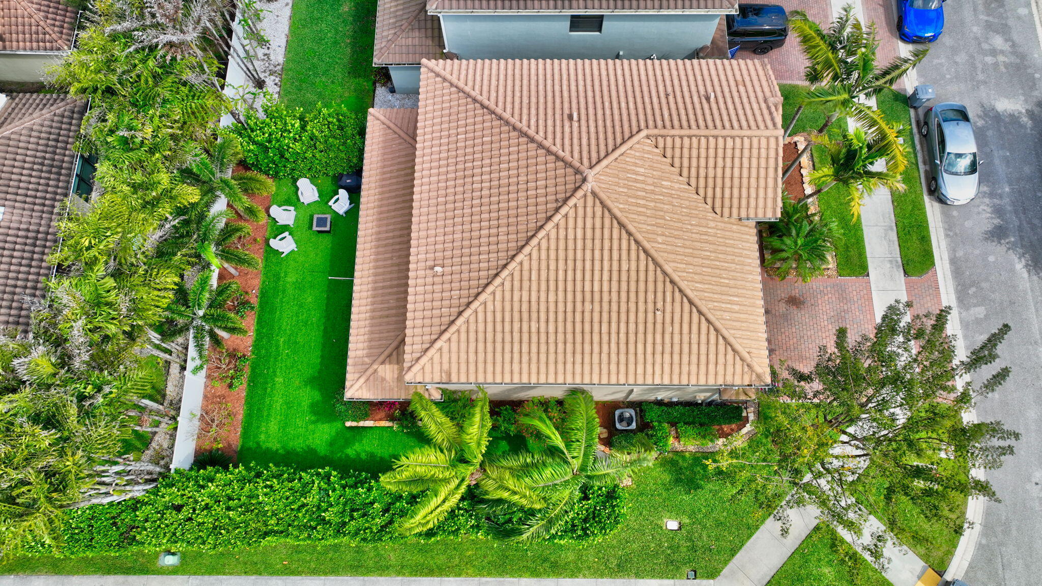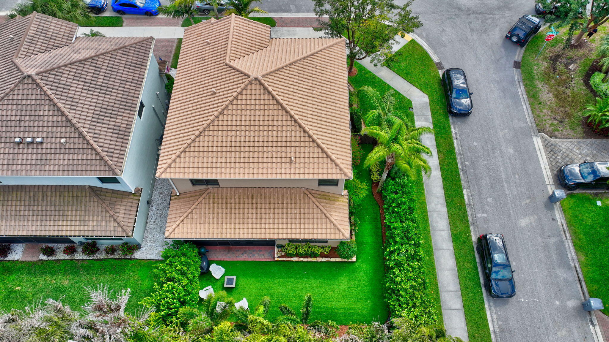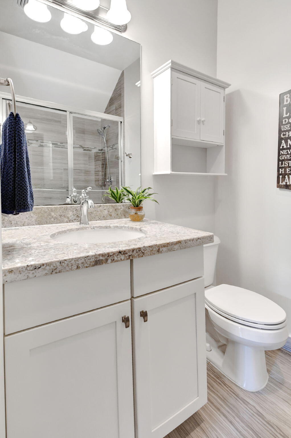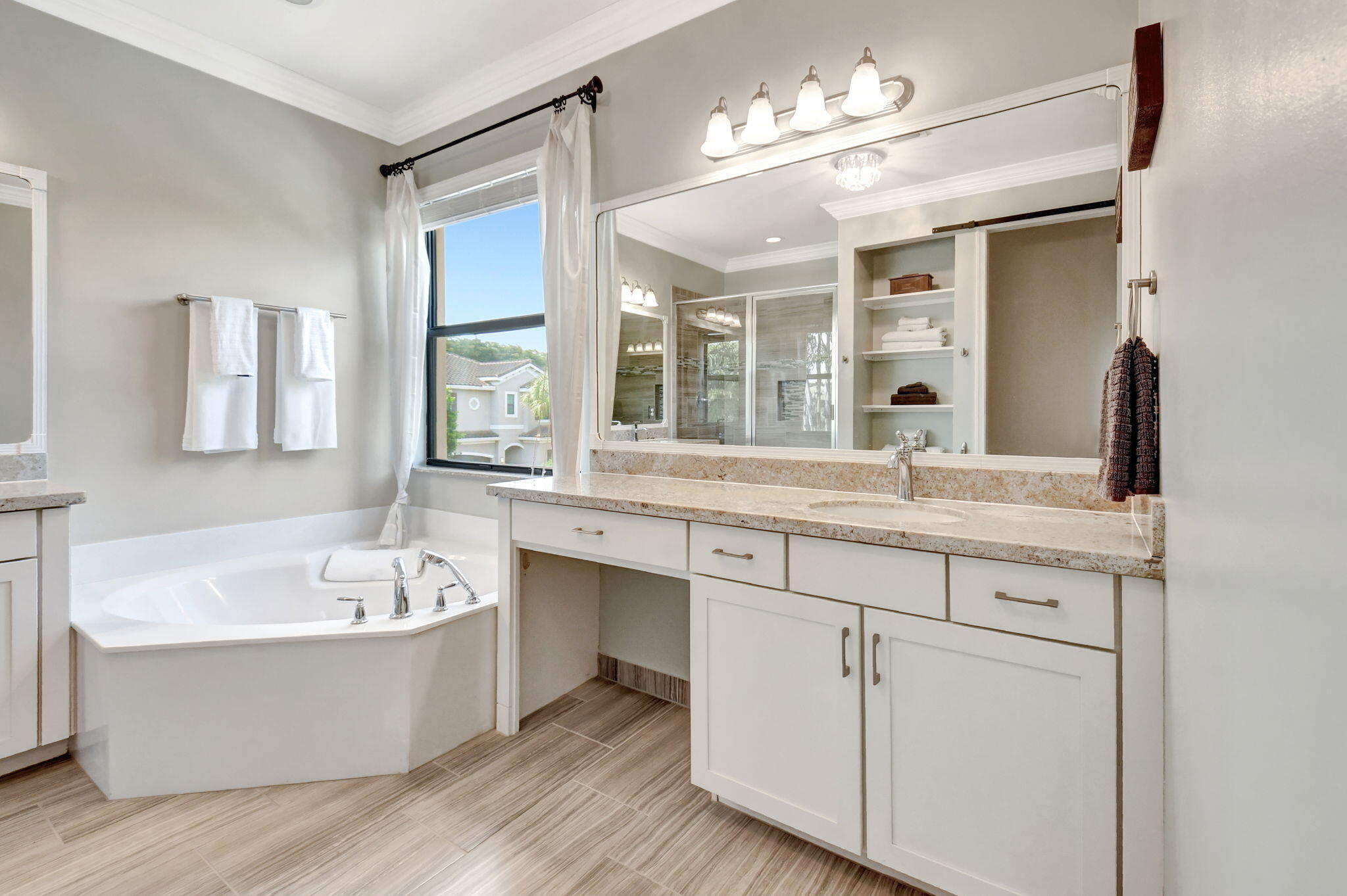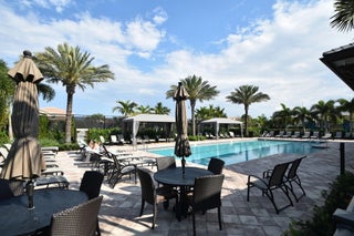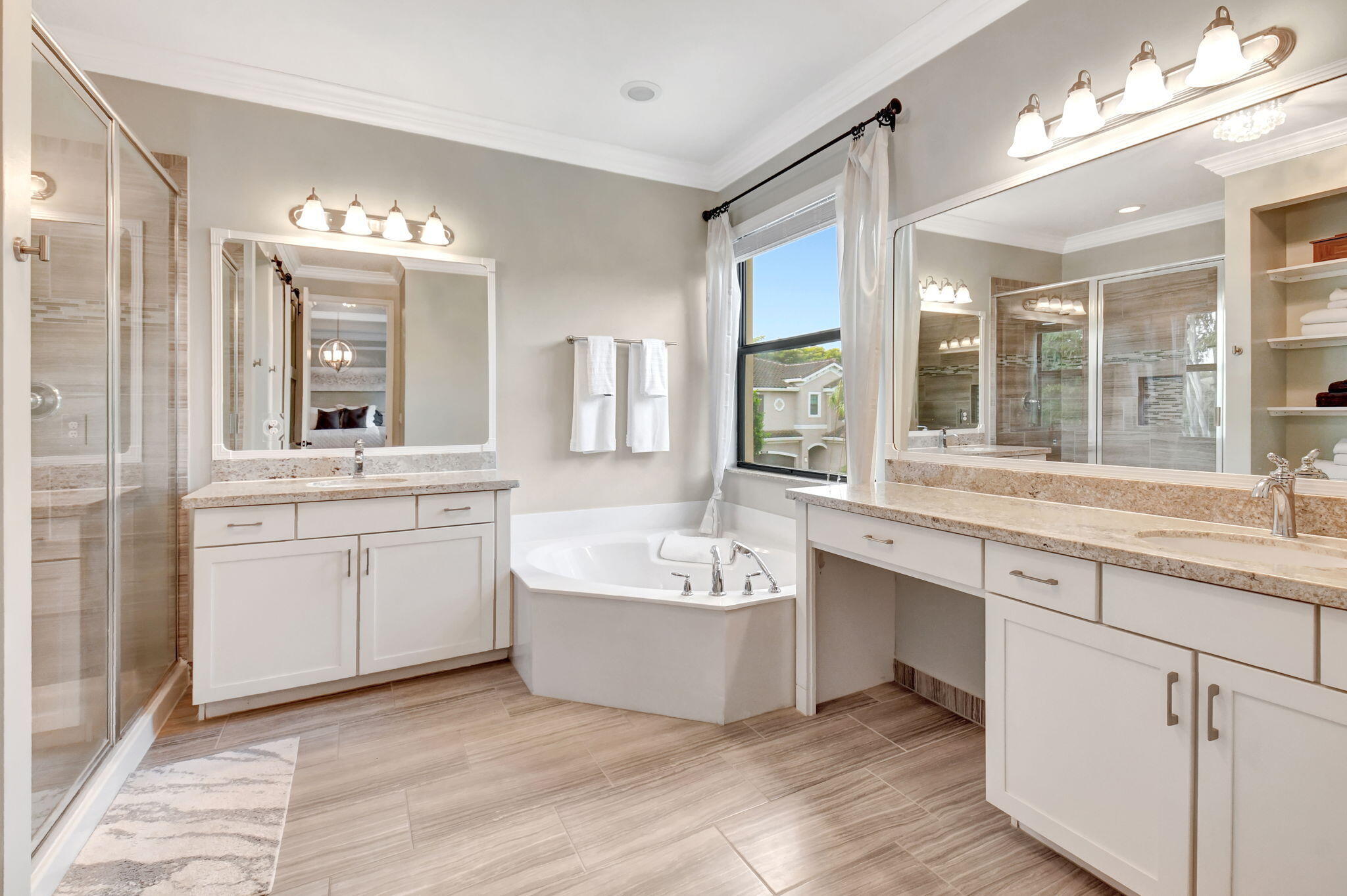 This elegant 4-bedroom, 3-bathroom home features a spacious open-concept layout with family, dining, and kitchen areas. One bedroom and full bath are located downstairs, while an expansive loft is upstairs. The chef's kitchen boasts 42'' white soft-close cabinetry, a grey center island, quartz countertops, a glass tile backsplash, and upgraded stainless appliances. The master suite includes a coffered ceiling, built-out closets, and a luxurious bath with dual vanities, a Roman tub, and a shower. Additional features include impact windows, a wrought iron staircase, keyless entry, and espresso bamboo flooring. The extended screened-in patio with pavers and private fenced yard completes this home.