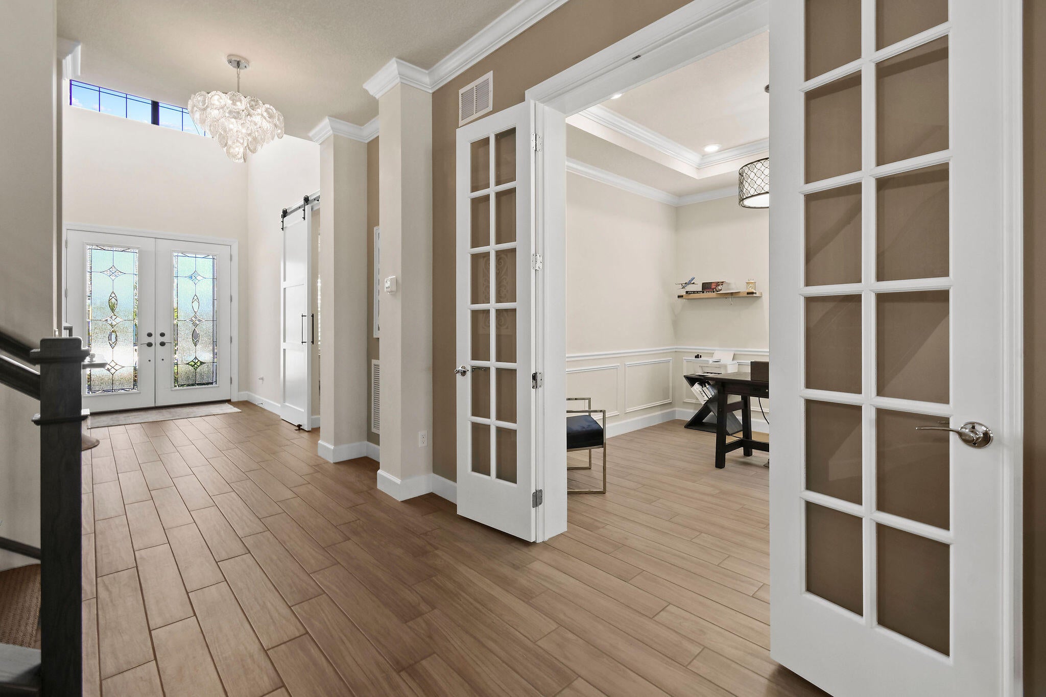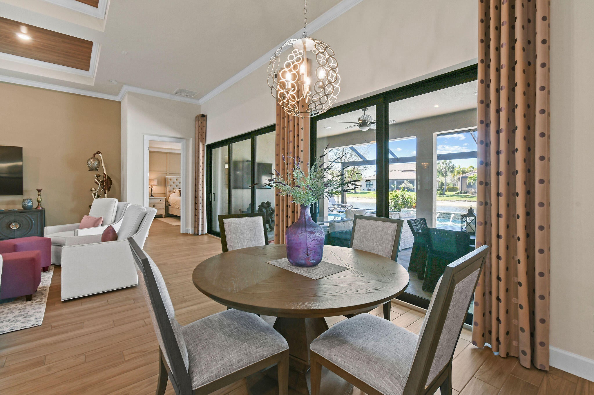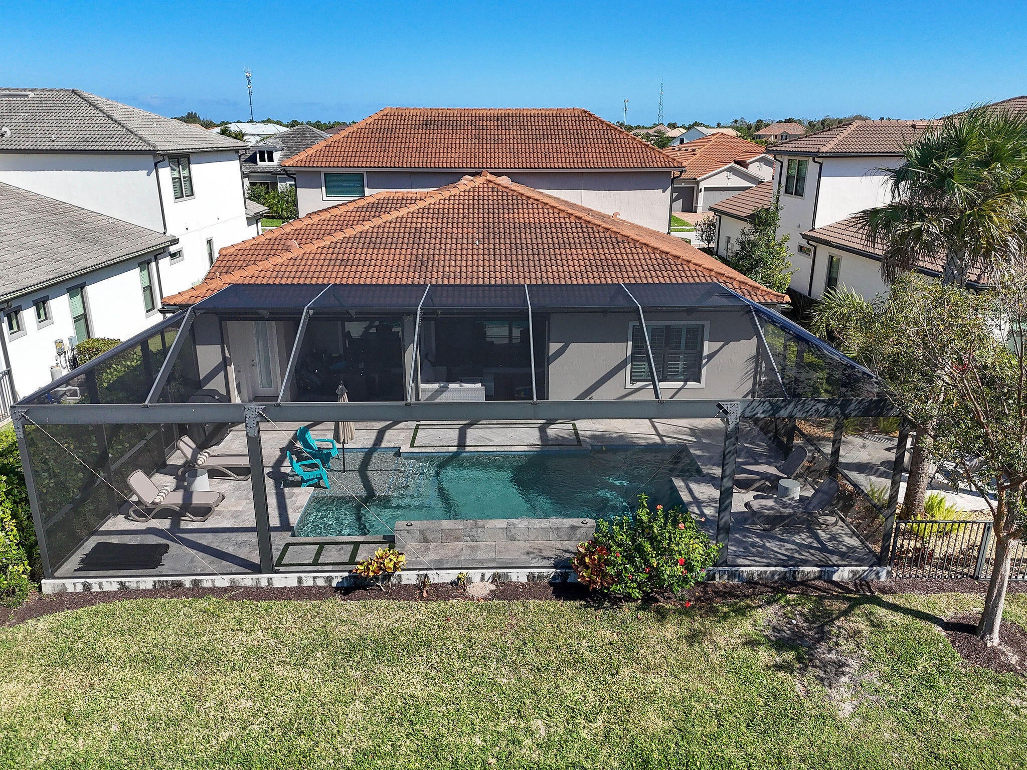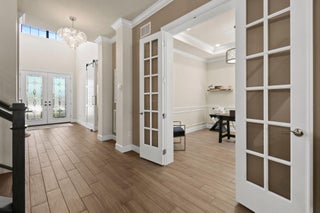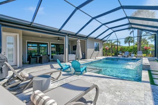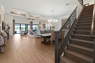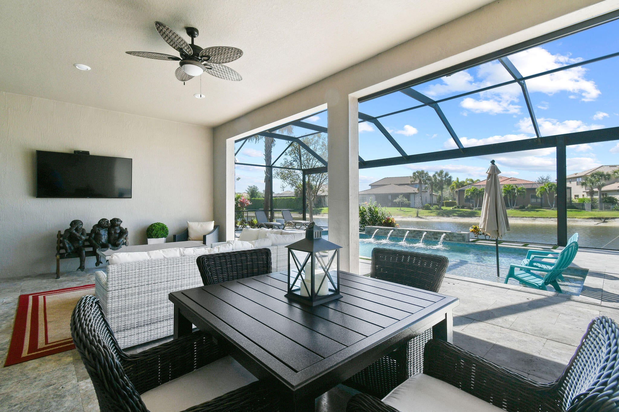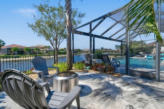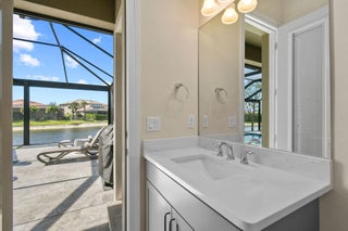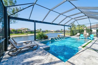 This stunning Stonewater Model in Sonoma Isles offers 4 Bedrooms, 4.5 baths, a private den/office, and a spacious loft with wet bar, offering the ideal layout for both relaxation and entertainment. Enjoy peaceful lake views from your premium lot, along with a new custom screened-in pool with waterfall and cabana bath for year-round living. The open floor plan has upgrade tile flooring on the first level, and plush carpeting in the loft area. The gourmet kitchen features quartz countertops, tile backsplashes, stainless appliances and high-end finishes. There are Impact windows and doors and a house generator. The master suite, office and 2 guest bedrooms are on the 1st floor, while the 4th guest bedroom suite with bath is tucked away off the loft. A 3-car garage provides ample storage.Sonoma Isles is a gated community with top-tier amenities that include a clubhouse with fitness center, game room, resort style pool, tennis and pickle ball courts