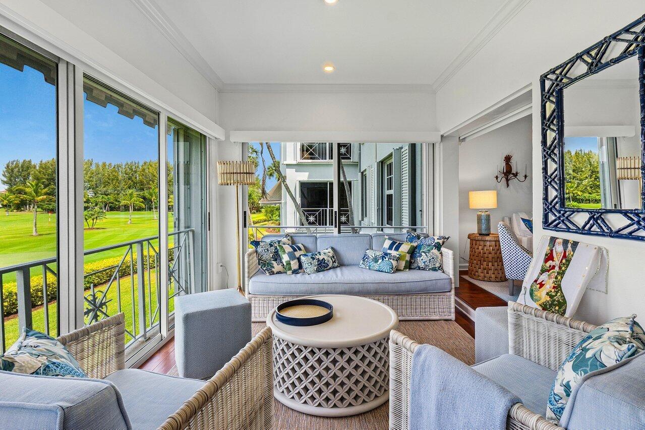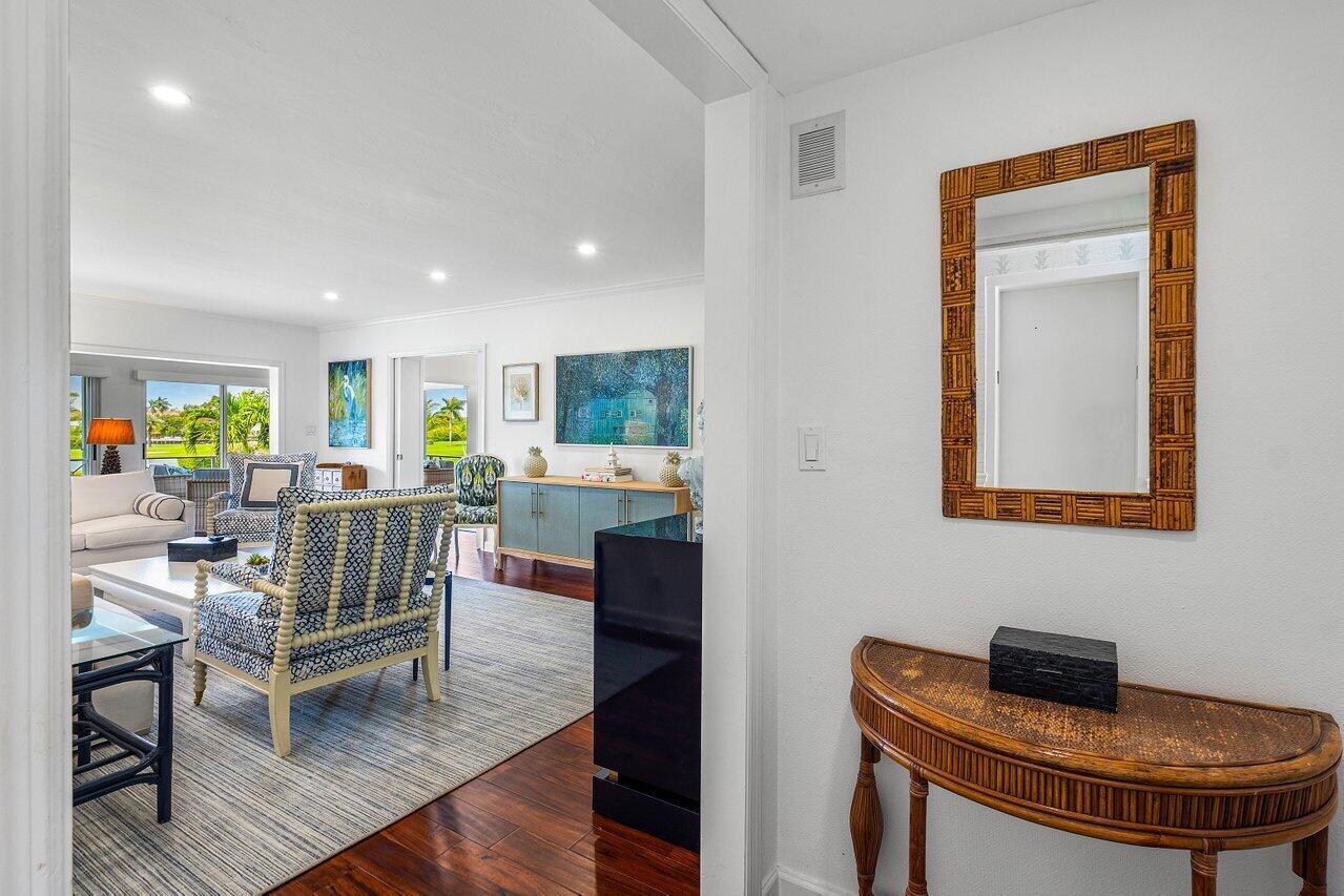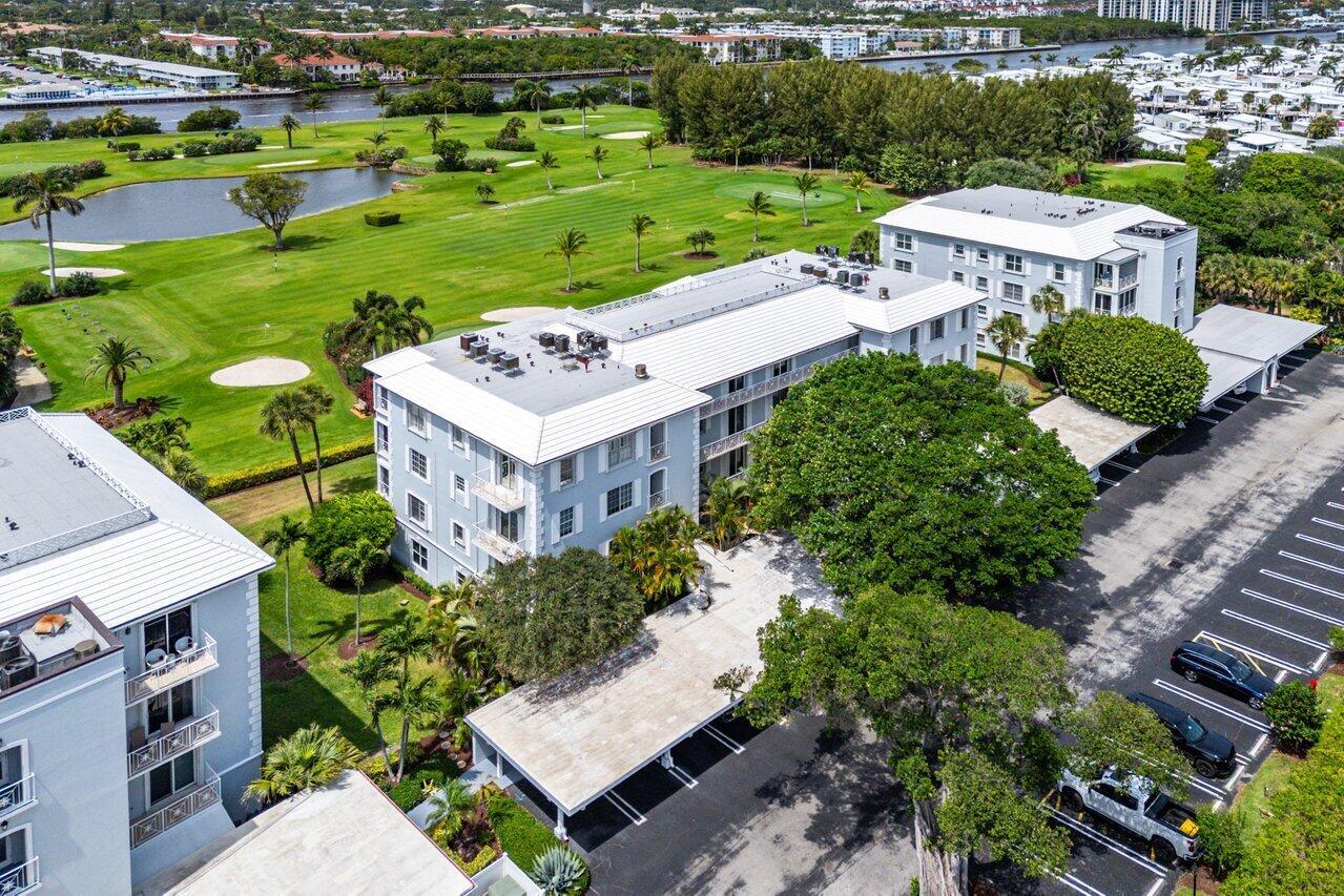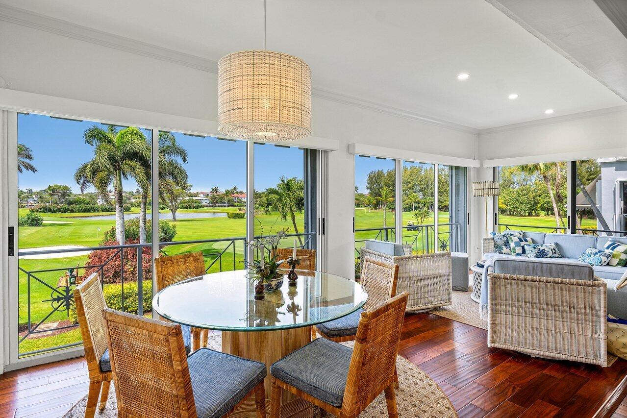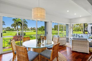 Sweeping views of the St. Andrews golf course, the ponds and the intracoastal waterway, this fully renovated 2/2 apartment with a den boasts spacious living areas perfect for relaxation and entertaining. The residence features built-ins throughout, exceptional woodworking, a separate bar, a modern kitchen, separate laundry room, impact windows, covered parking, gracious entry, and a large storage closet.Situated in the sought-after St. Andrews community, this apartment provides a unique blend of luxury and convenience, with its new West Club house, golf, course, fitness center, croquet, tennis and the beautiful beach and pool.