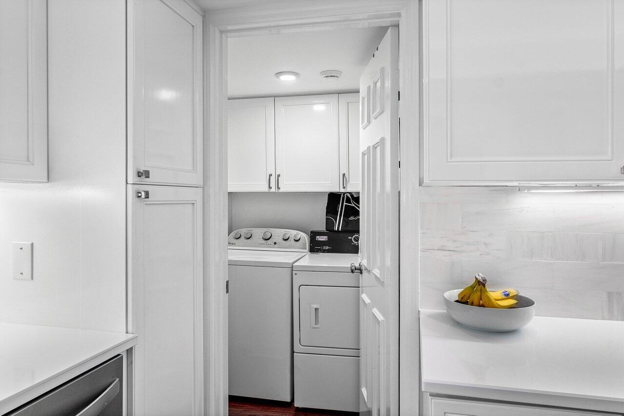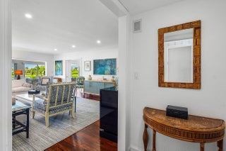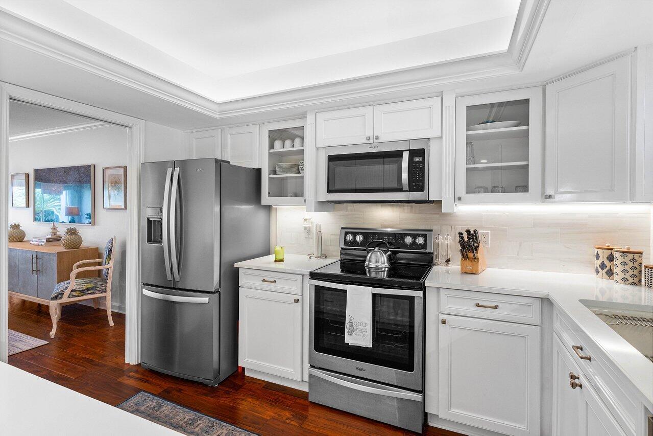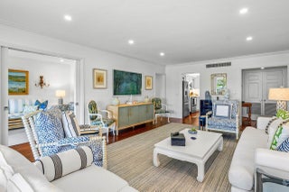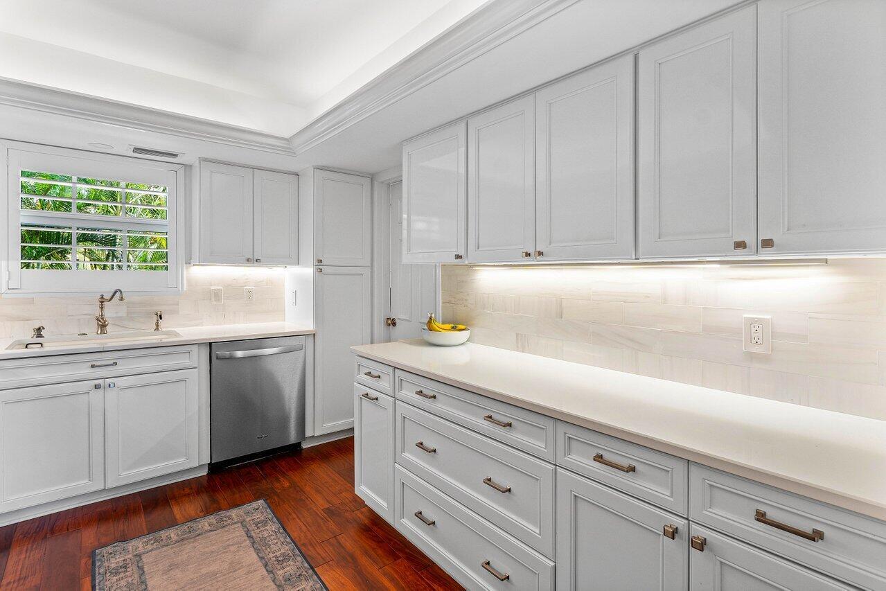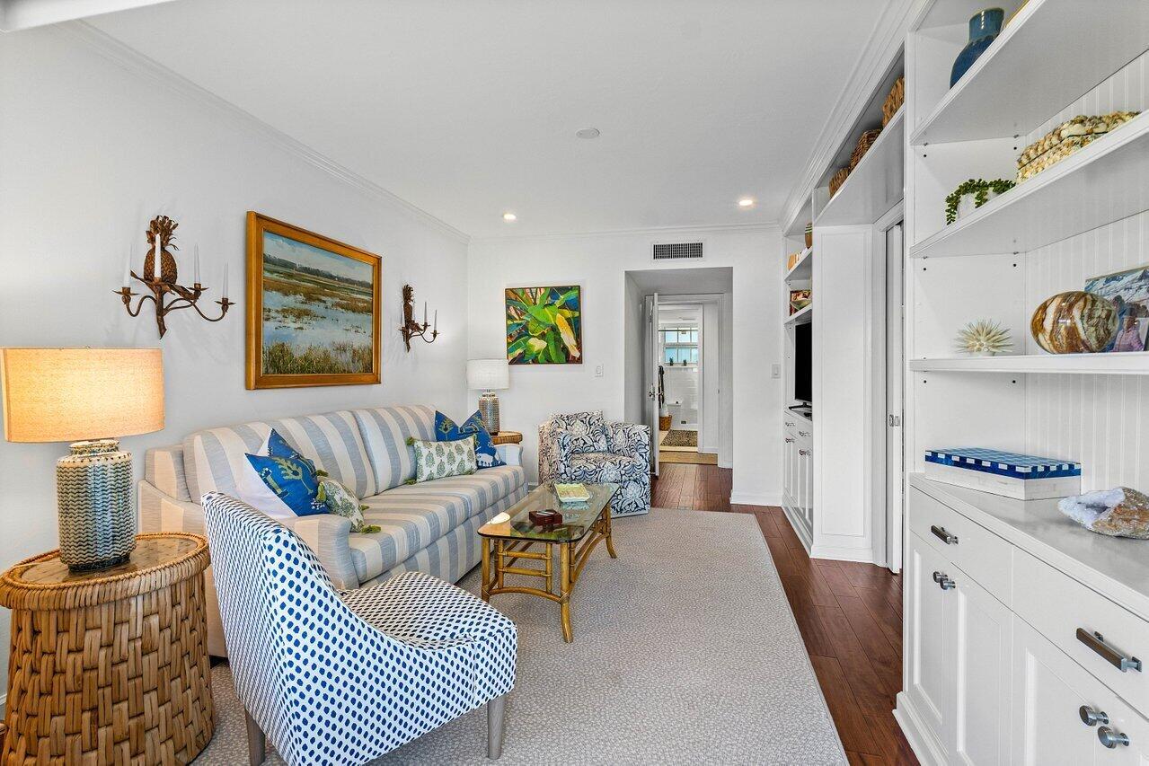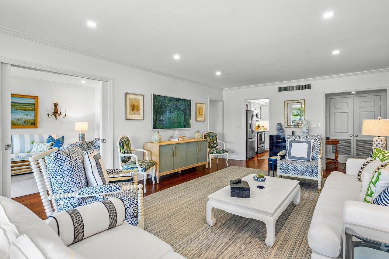 Sweeping views of the St. Andrews golf course, the ponds and the intracoastal waterway, this fully renovated 2/2 apartment with a den boasts spacious living areas perfect for relaxation and entertaining. The residence features built-ins throughout, exceptional woodworking, a separate bar, a modern kitchen, separate laundry room, impact windows, covered parking, gracious entry, and a large storage closet.Situated in the sought-after St. Andrews community, this apartment provides a unique blend of luxury and convenience, with its new West Club house, golf, course, fitness center, croquet, tennis and the beautiful beach and pool.