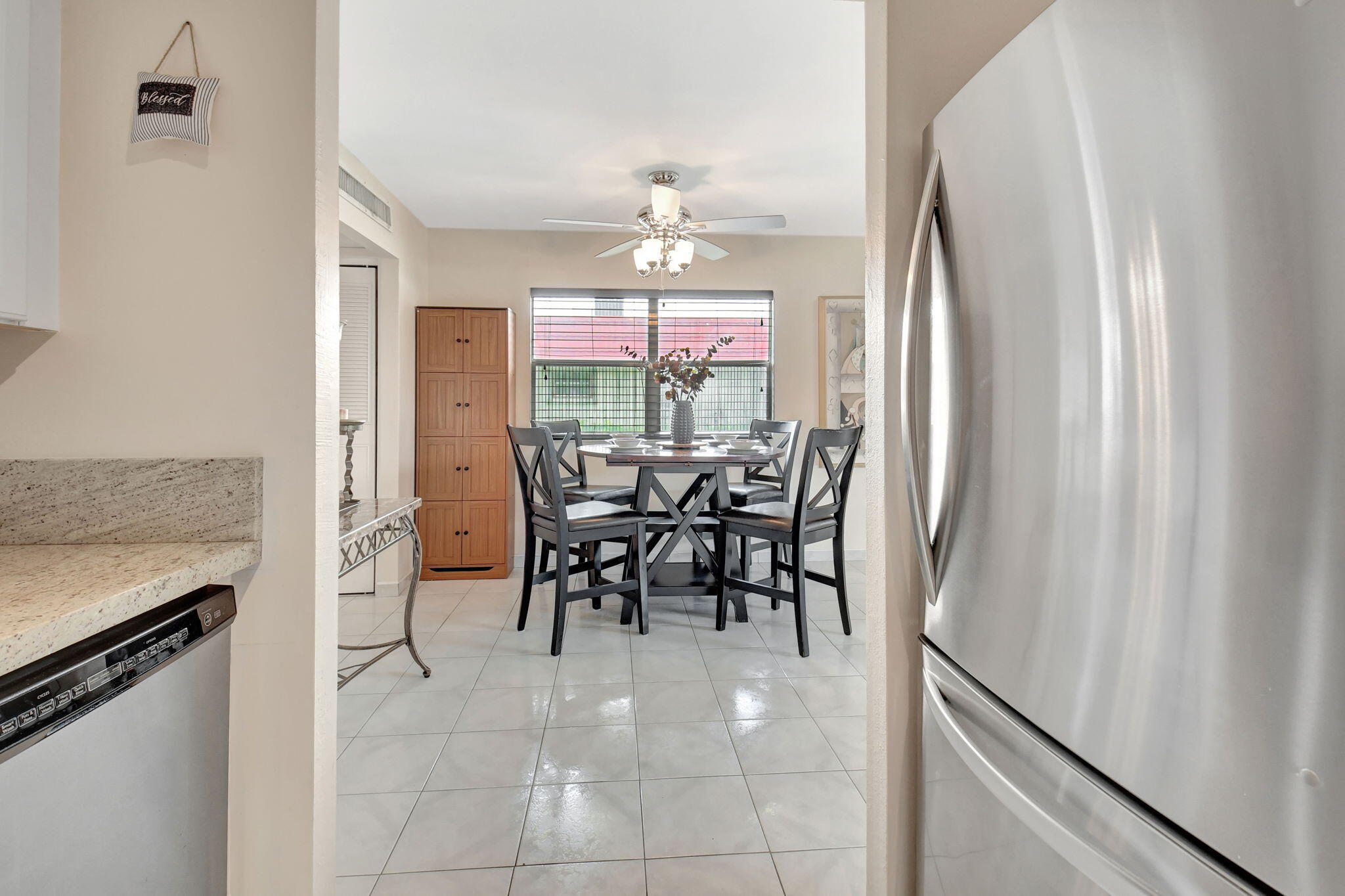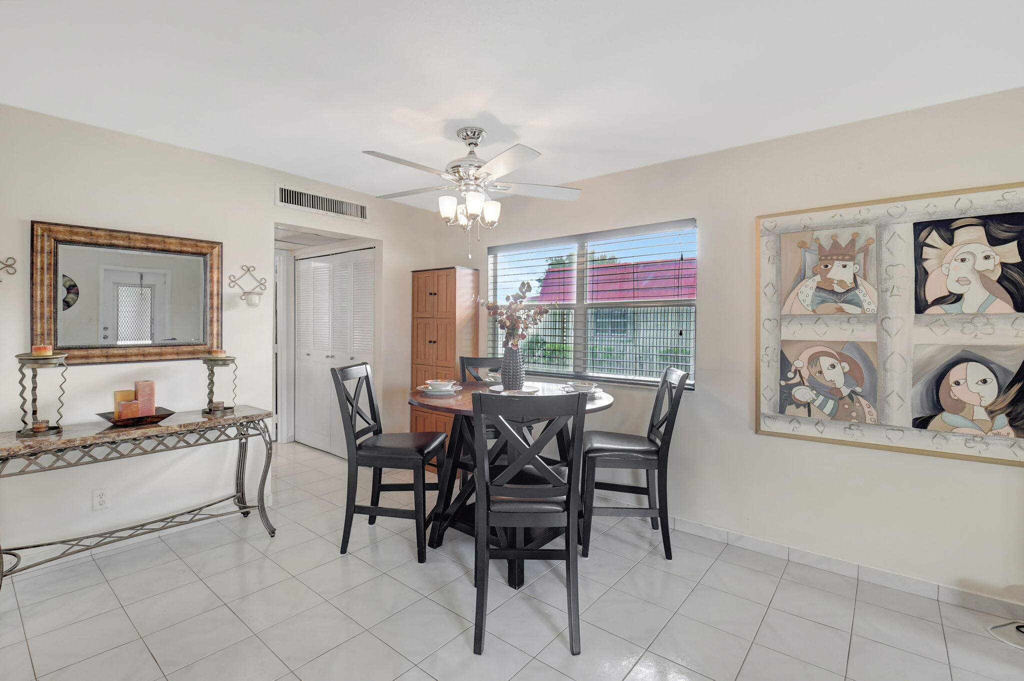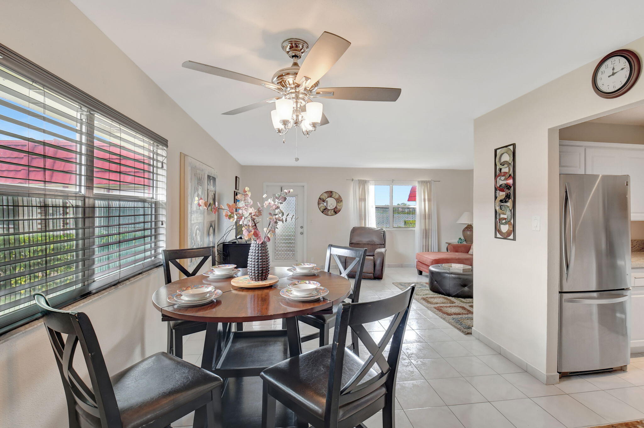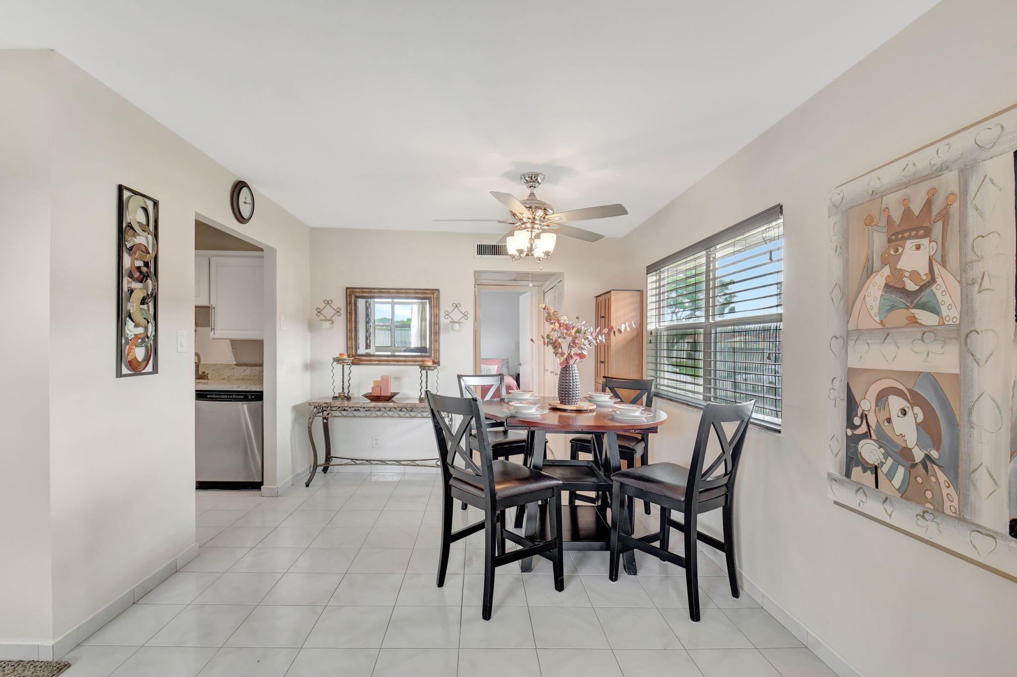 This Charming 1 bedroom, 1.5 bath home has a updated kitchen and both bathrooms. Title throughout the home. Impact windows on the patio with an A/C to relax. Cool furniture and artwork in the living and dining rooms give a modern vibe. Kitchen has SS appliances and granite countertops and tons of cabinets. Lake views from the living room and grass area to walk to the lake. Oversized primary bedroom with on-suite bathroom with walk in shower. Wall to wall closets with the washer and dryer conveniently located inside. Kings Point in Delray Beach is a short distance to downtown Delray, shopping and the beach. This 55+ gated community offers an array of amenities to peak everyone's interest. Check out the clubhouse after you check out this adorable villa. Priced to sell quick.MOTIVATED SELLER. ALL OFFERS WILL BE CONSIDERED. BONUS $500.00 TO BUYER'S AGENT AT CLOSING.